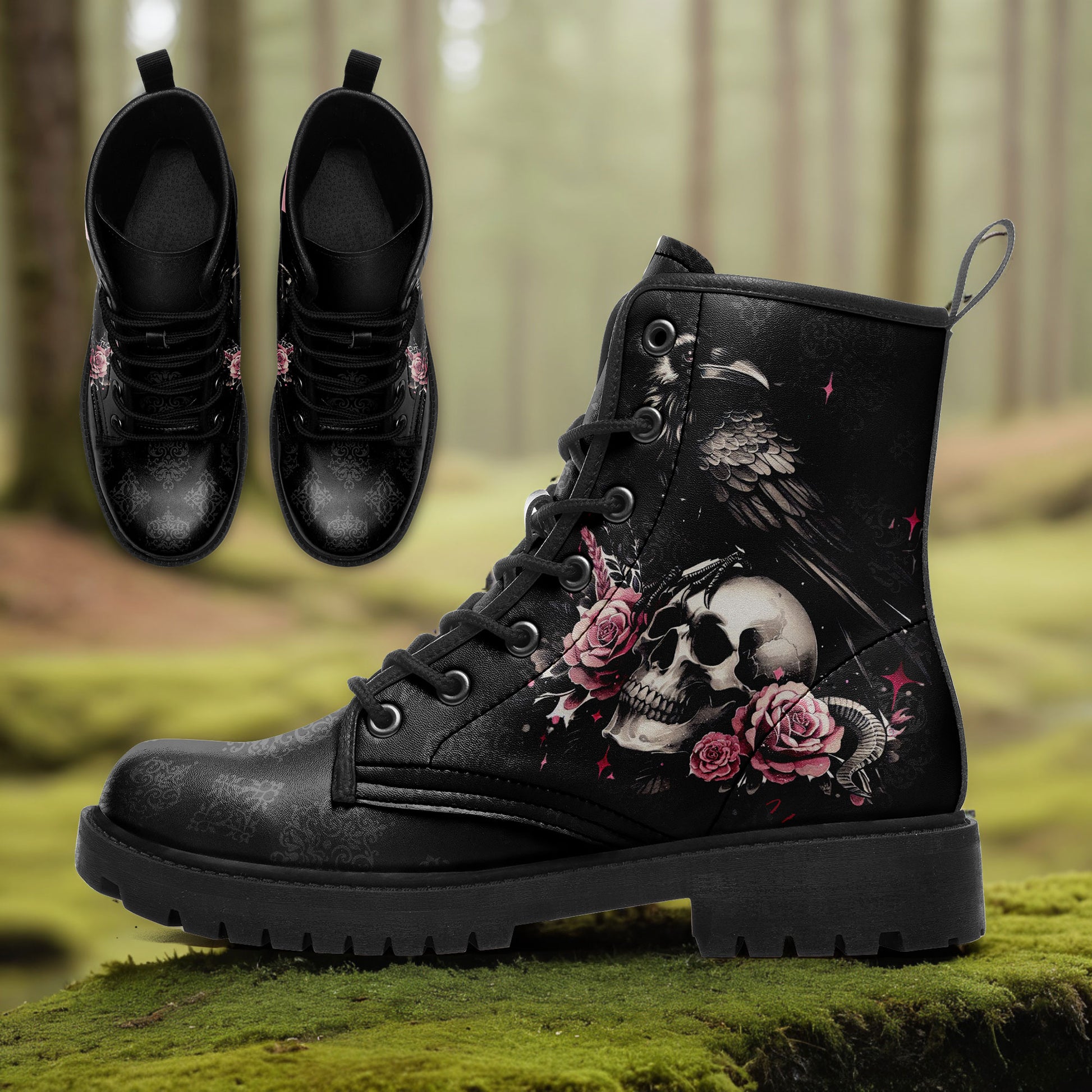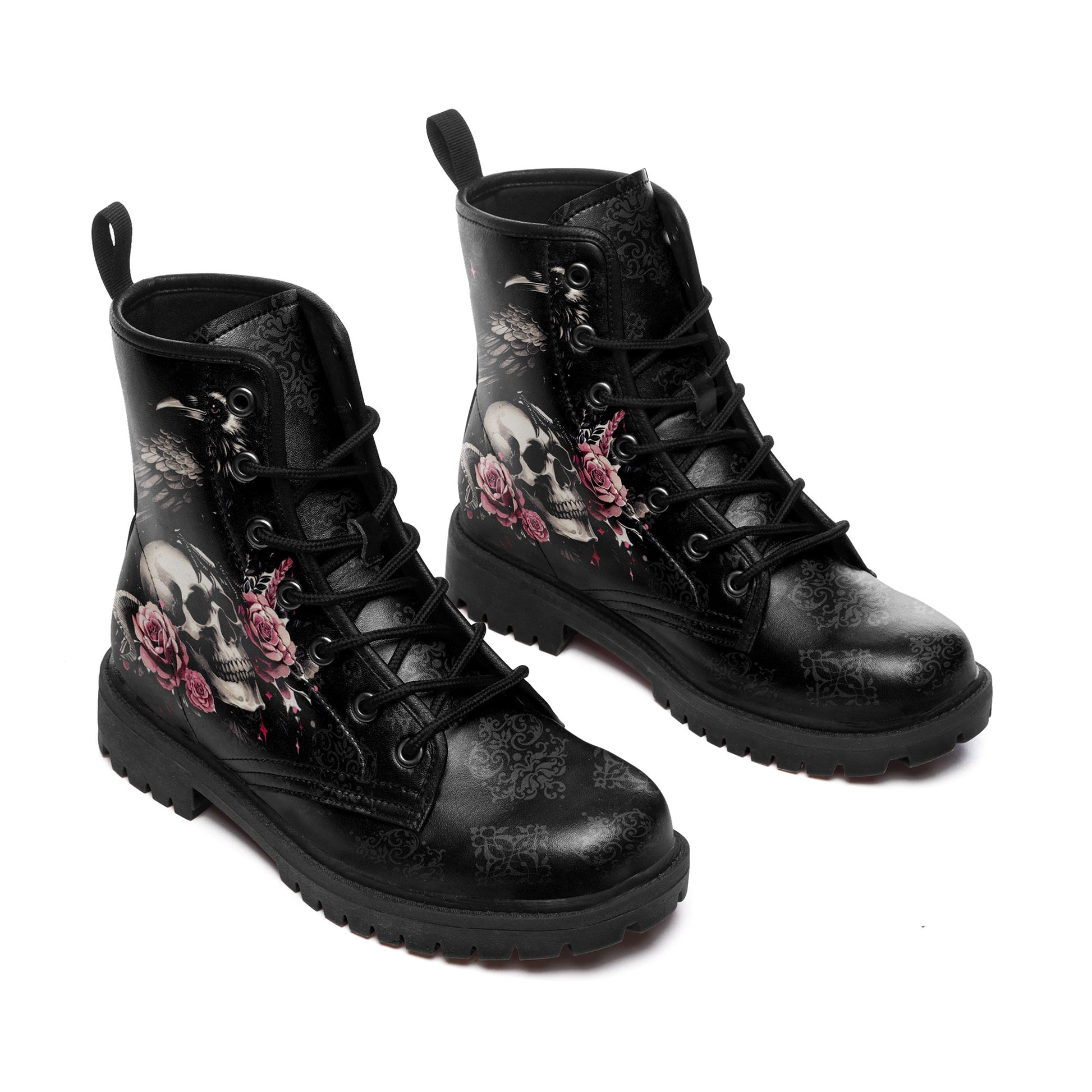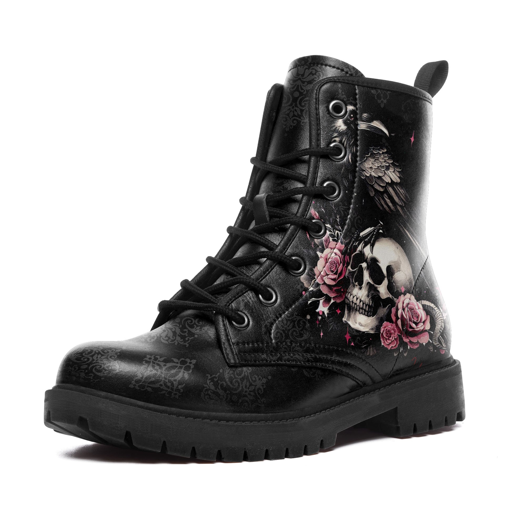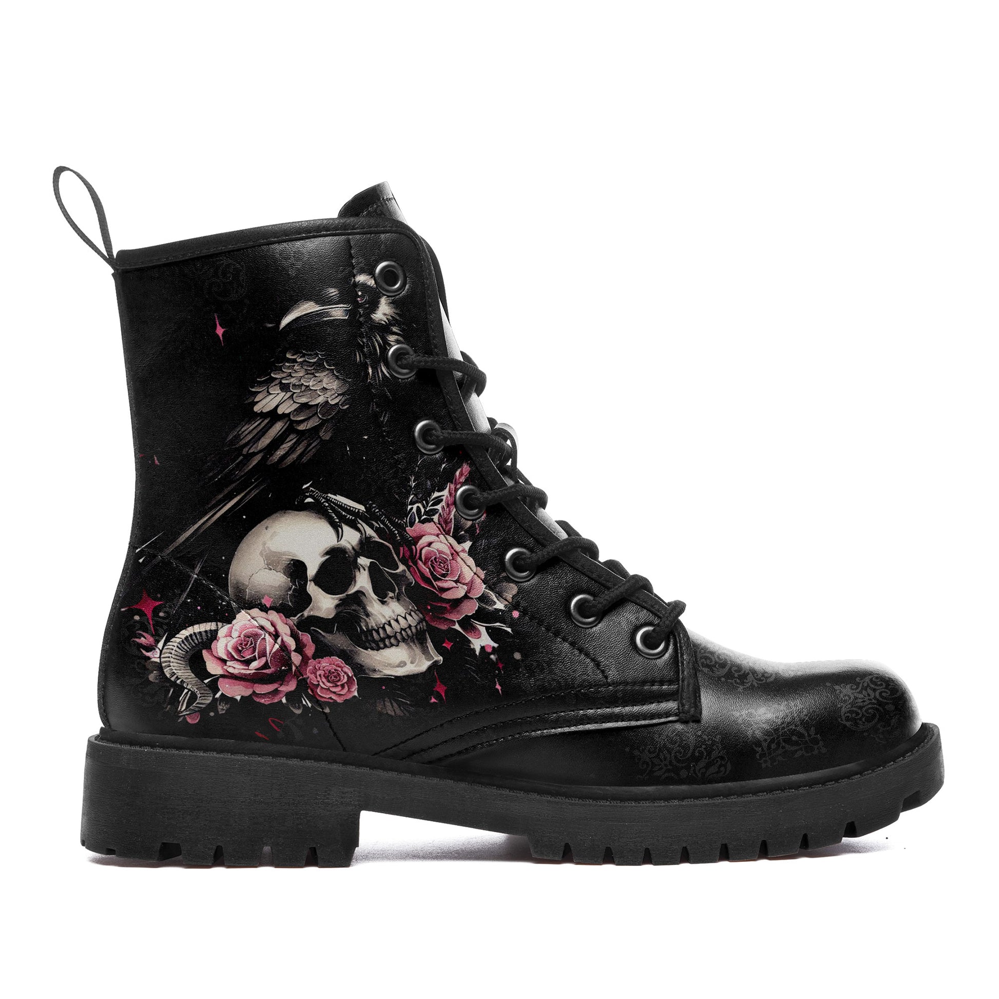"Quoth the Raven, Nevermore." Step into a world of dark romance and ancient mysteries. These stunning combat boots feature a majestic **black raven perched upon a skull**, surrounded by blooming **pink roses**.