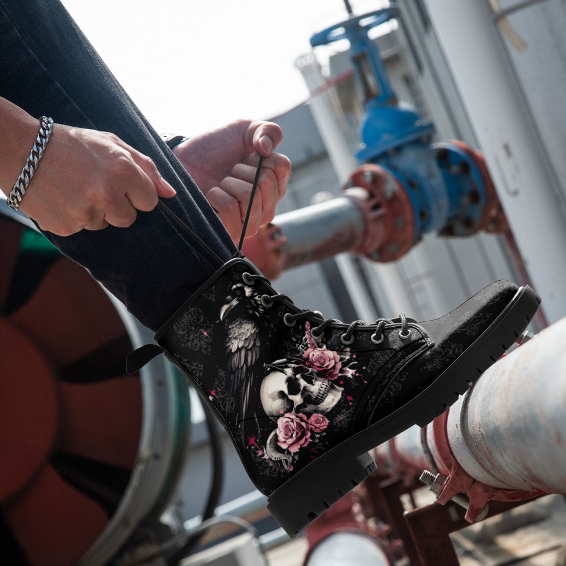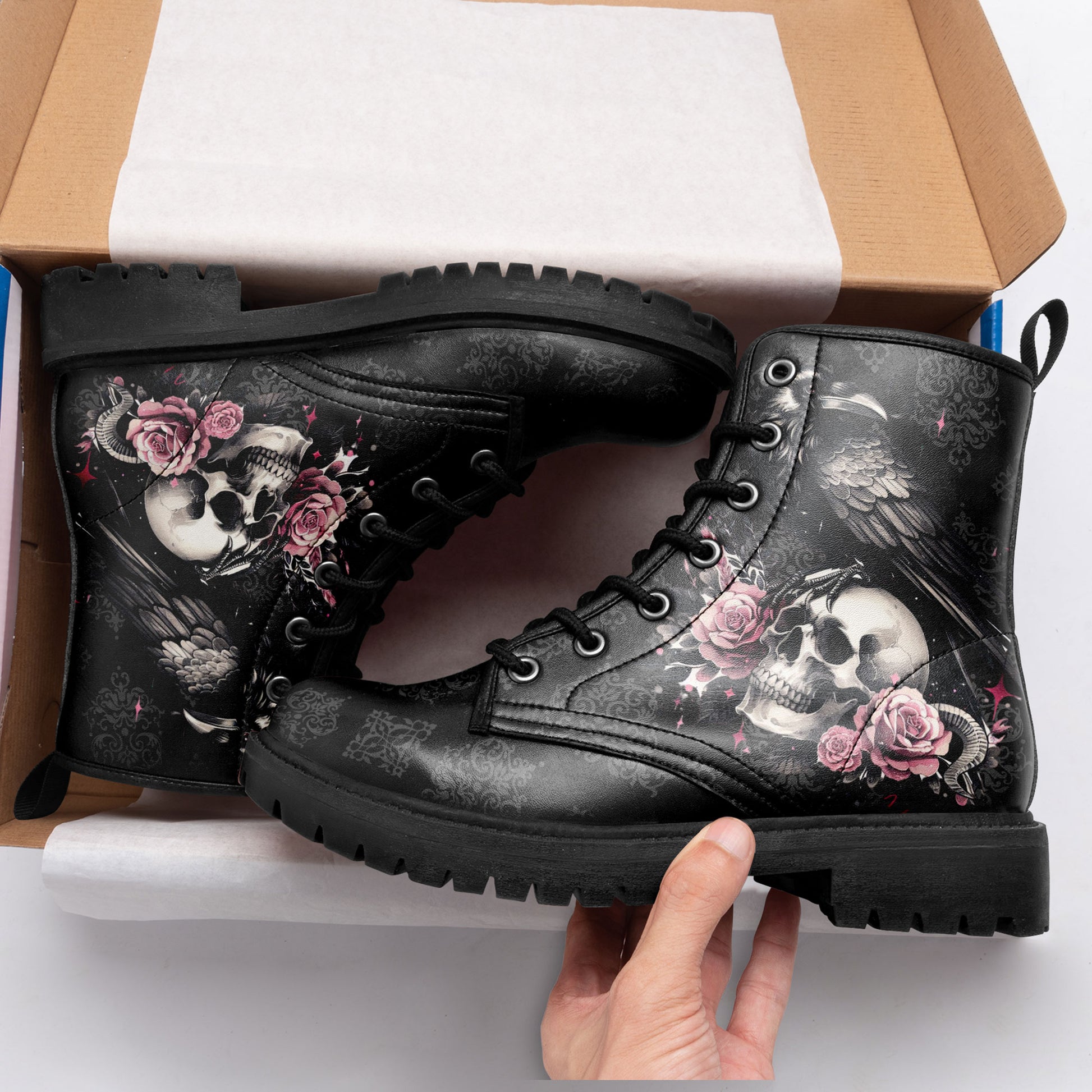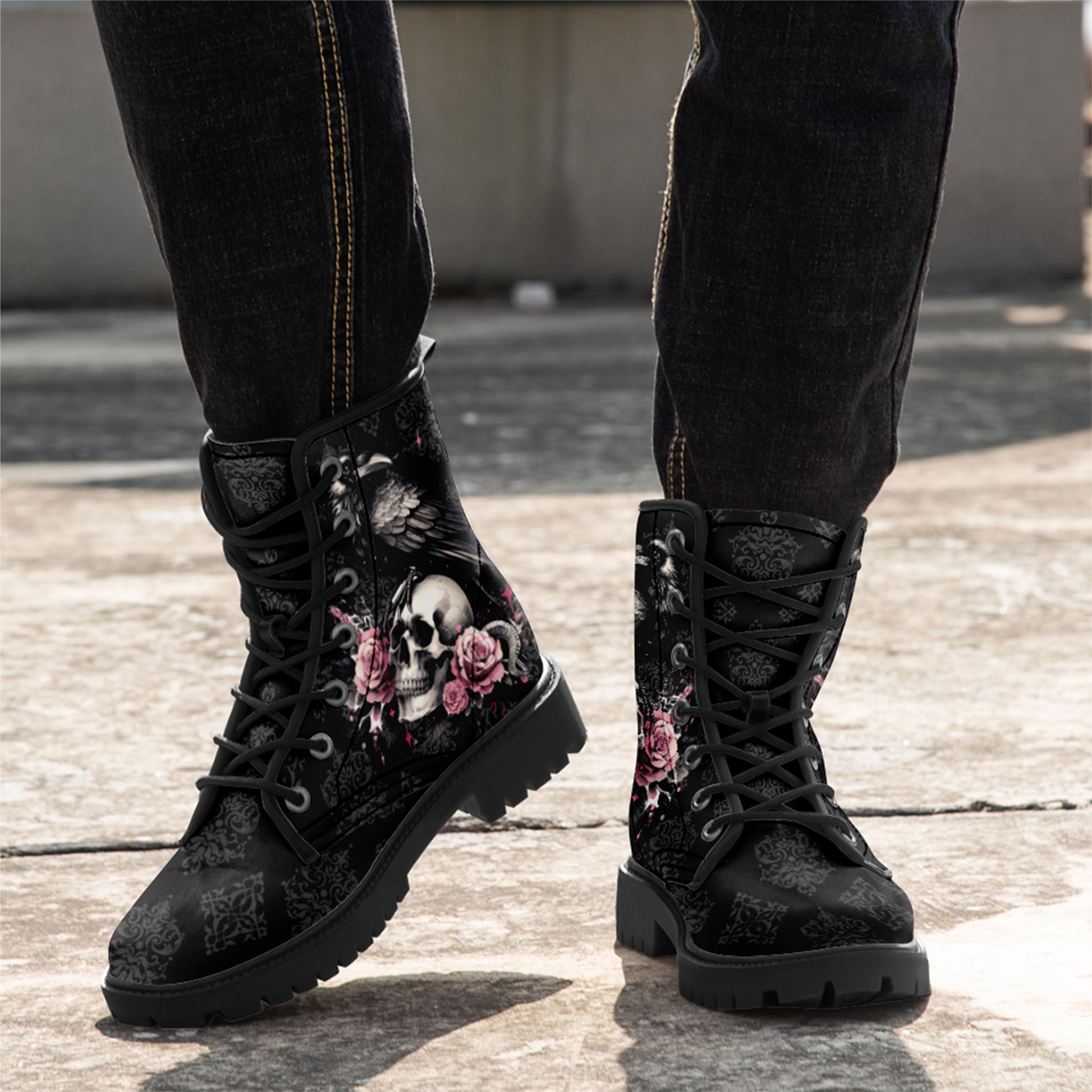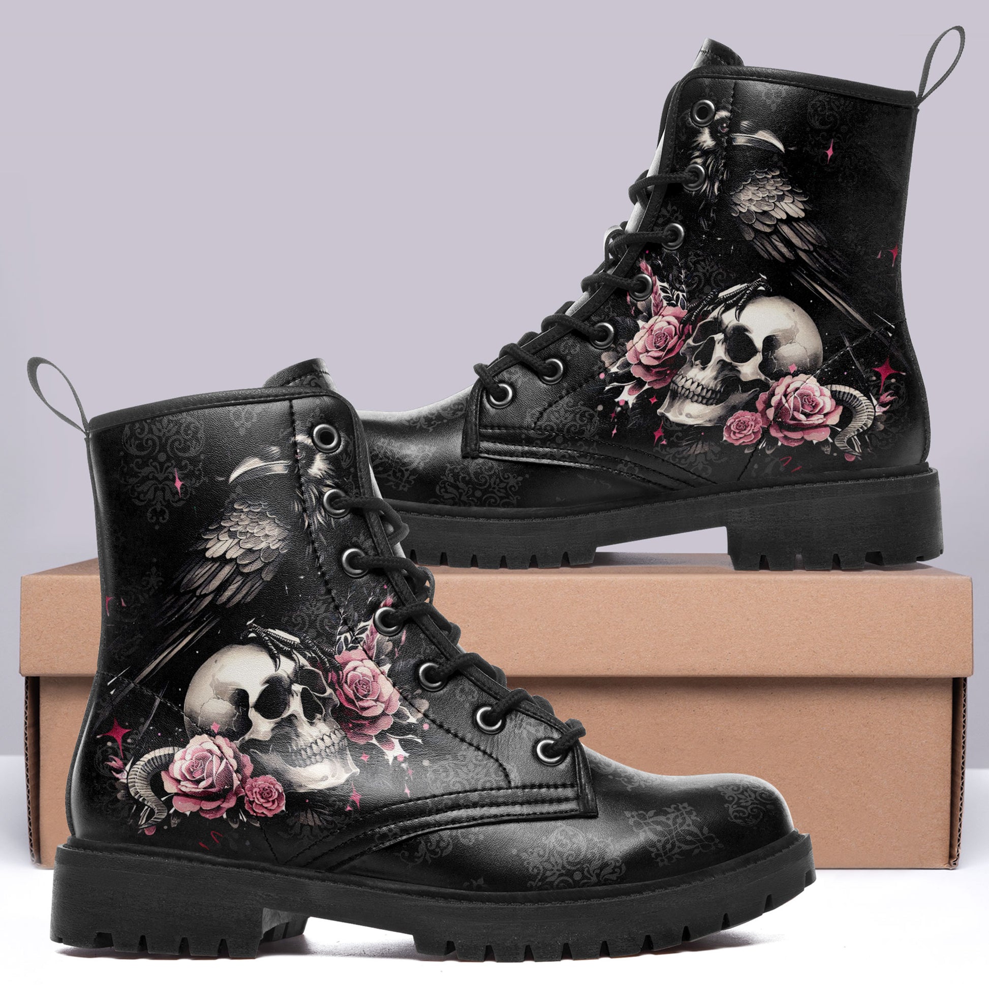 "Quoth the Raven, Nevermore." Step into a world of dark romance and ancient mysteries. These stunning combat boots feature a majestic **black raven perched upon a skull**, surrounded by blooming **pink roses**.