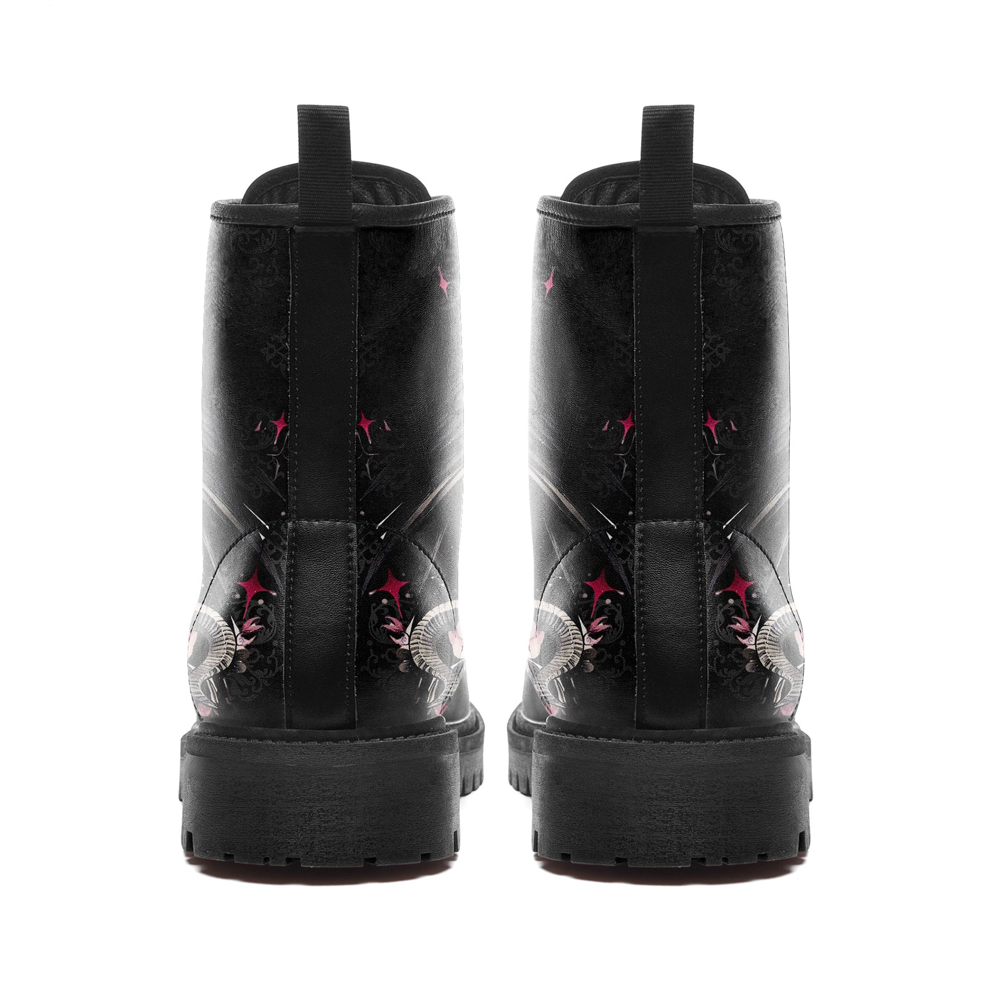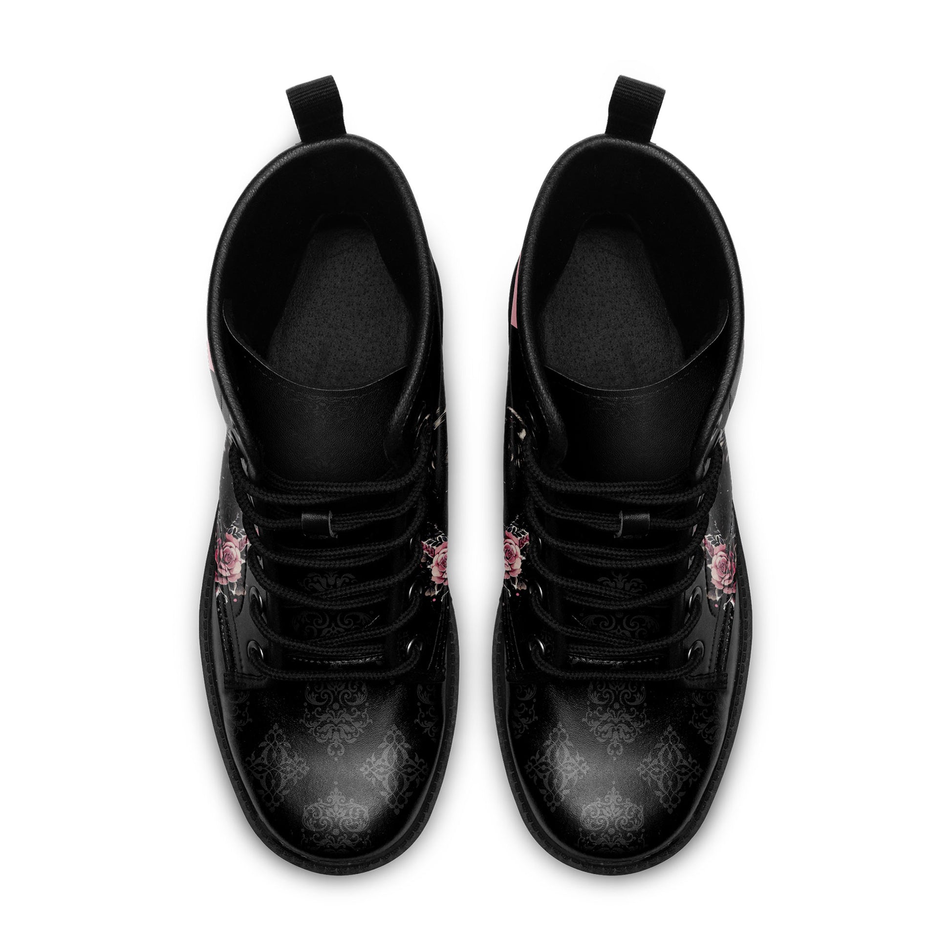 What sets this design apart is the detail: look closely to see a subtle, elegant **baroque damask pattern** etched into the black background, giving the boots a luxurious, textured finish. Itโs a tribute to gothic literature, magic, and the beauty of the night.