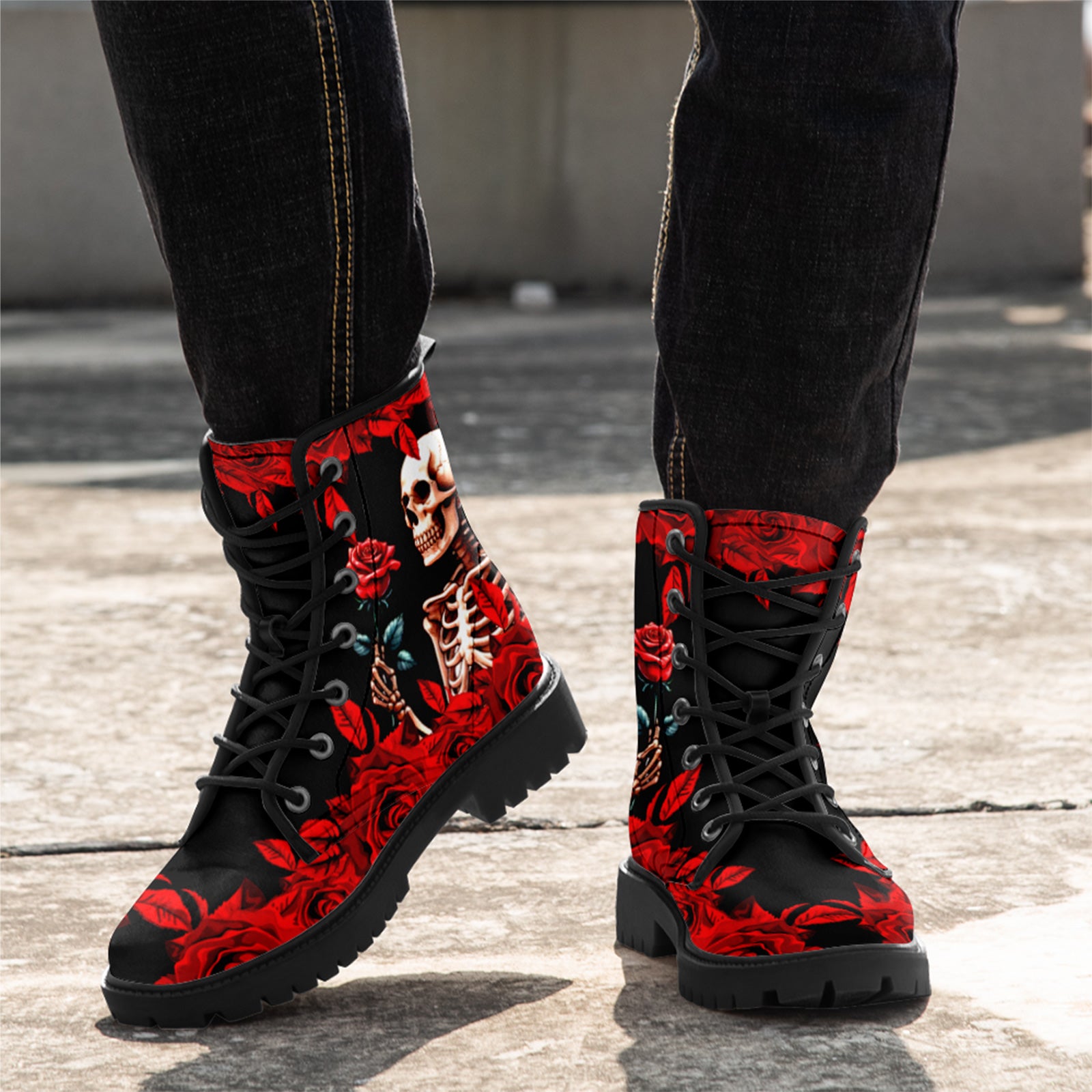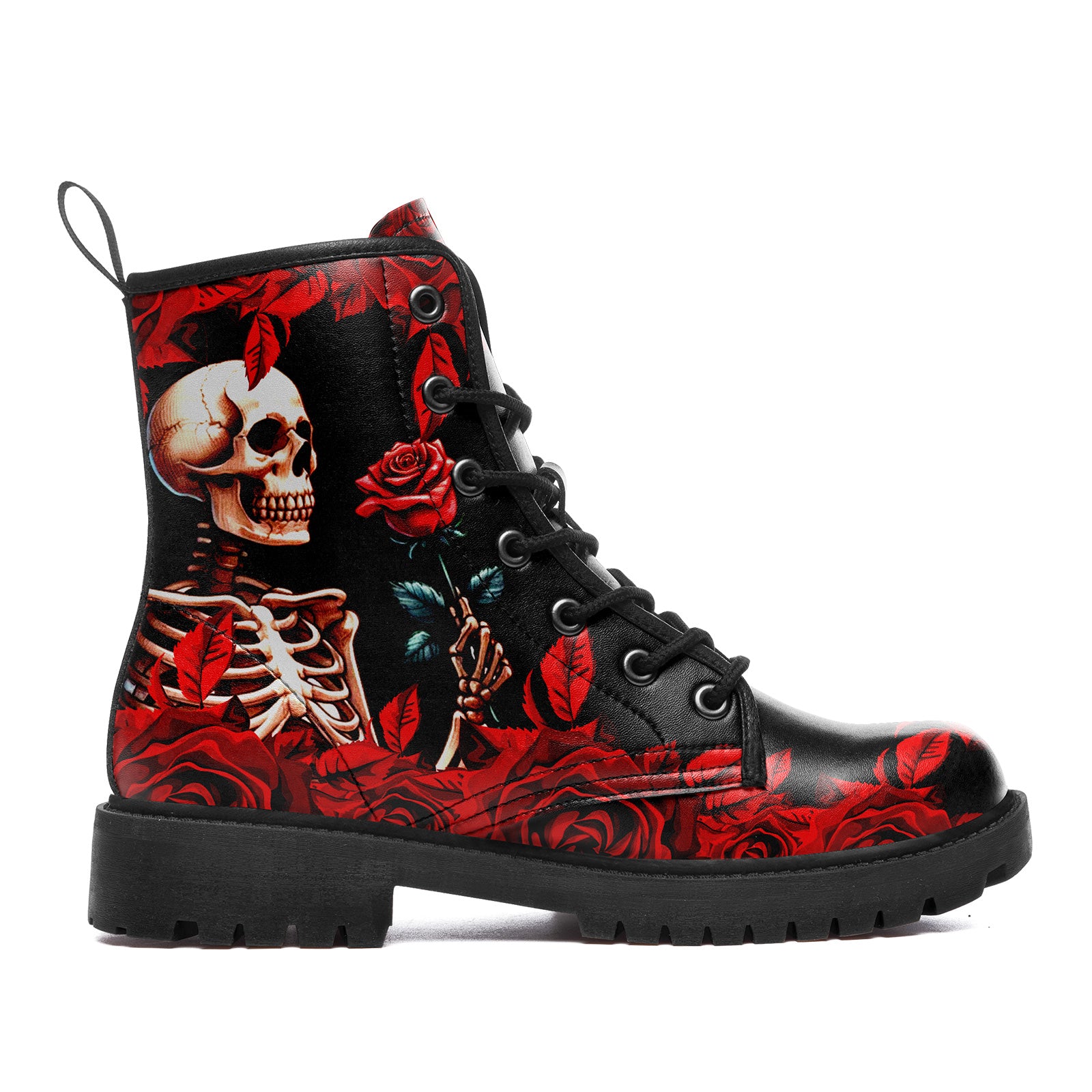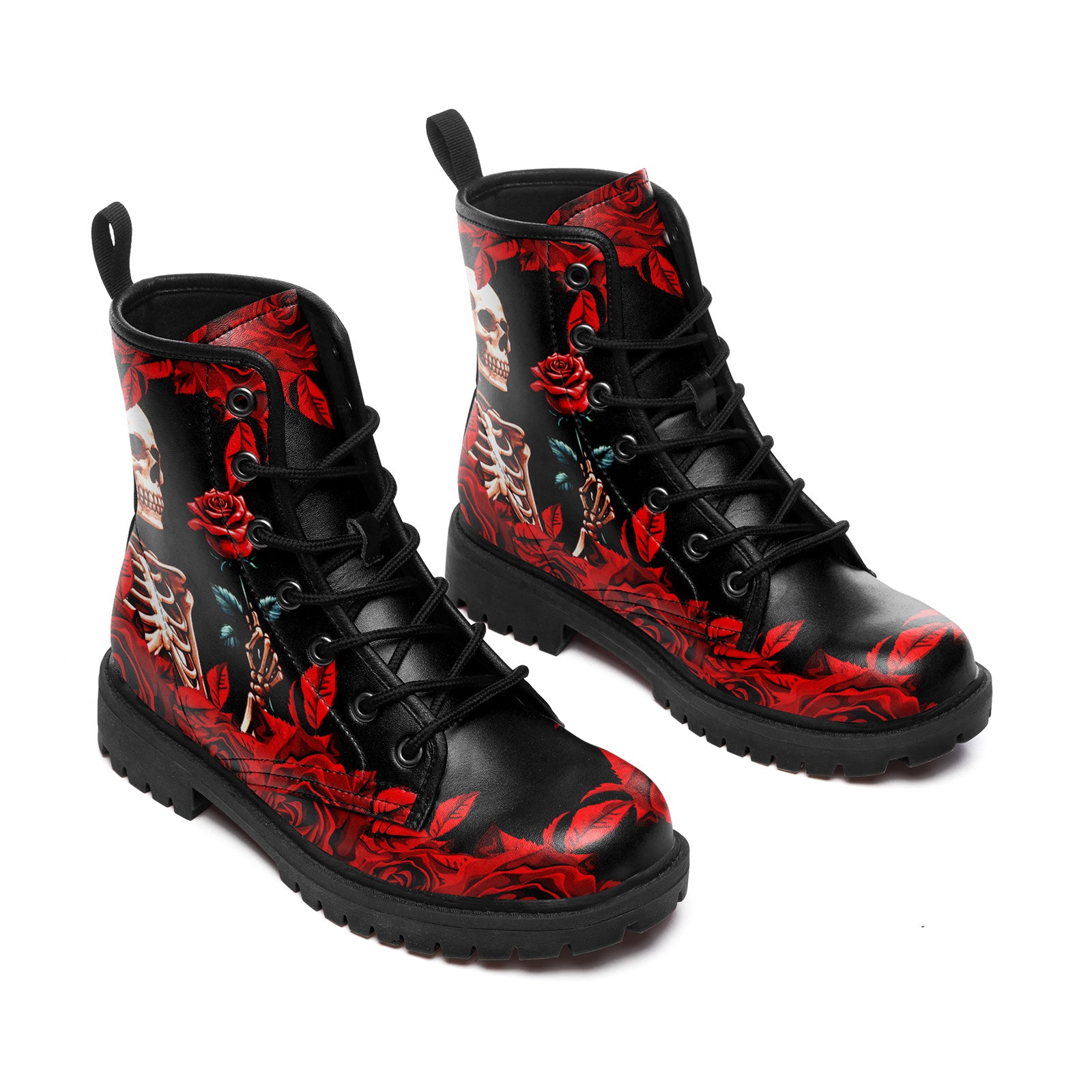 Gothic Skeleton Holding Red Rose Combat Boots - Dark Romance Floral Shoes BOOTS-24023007-5