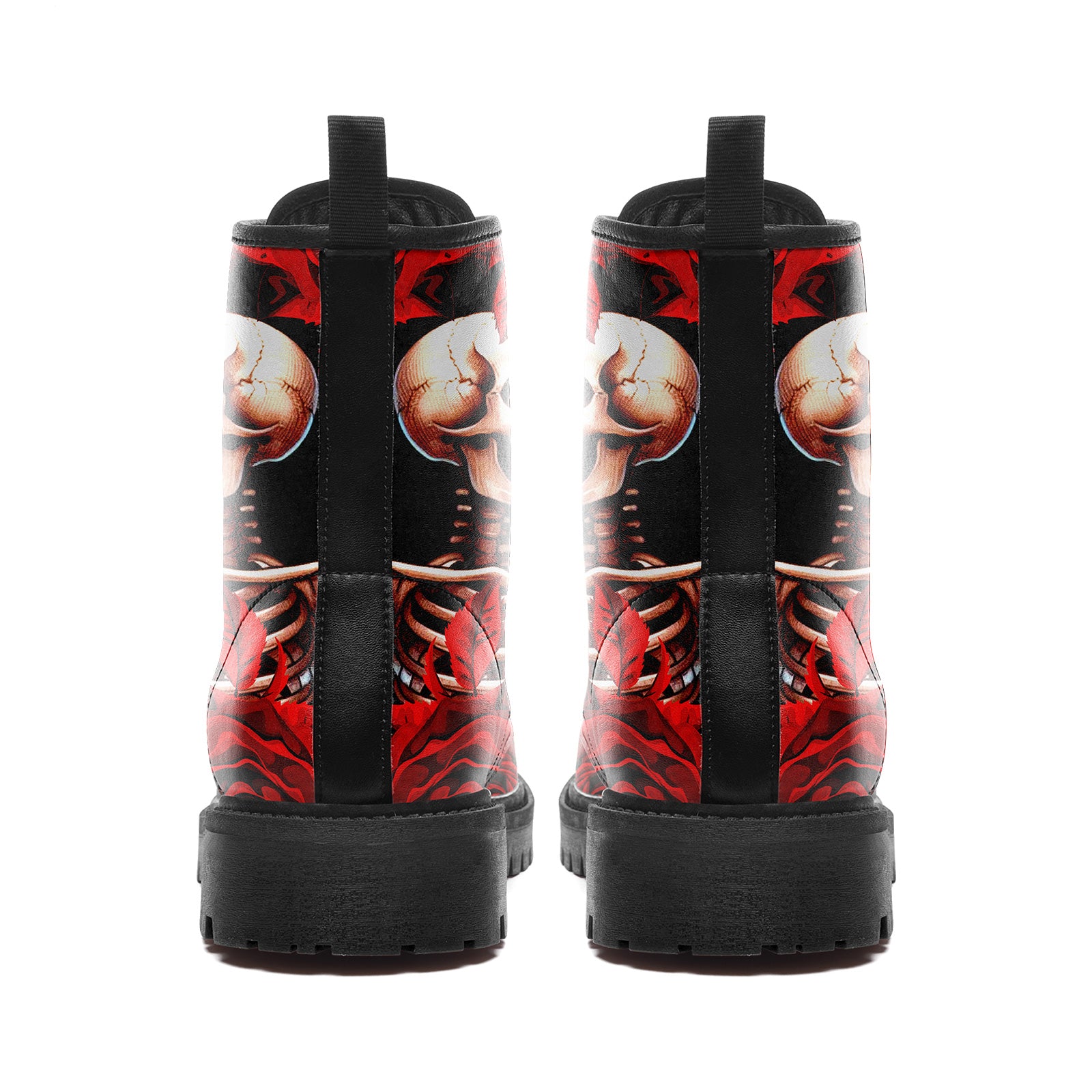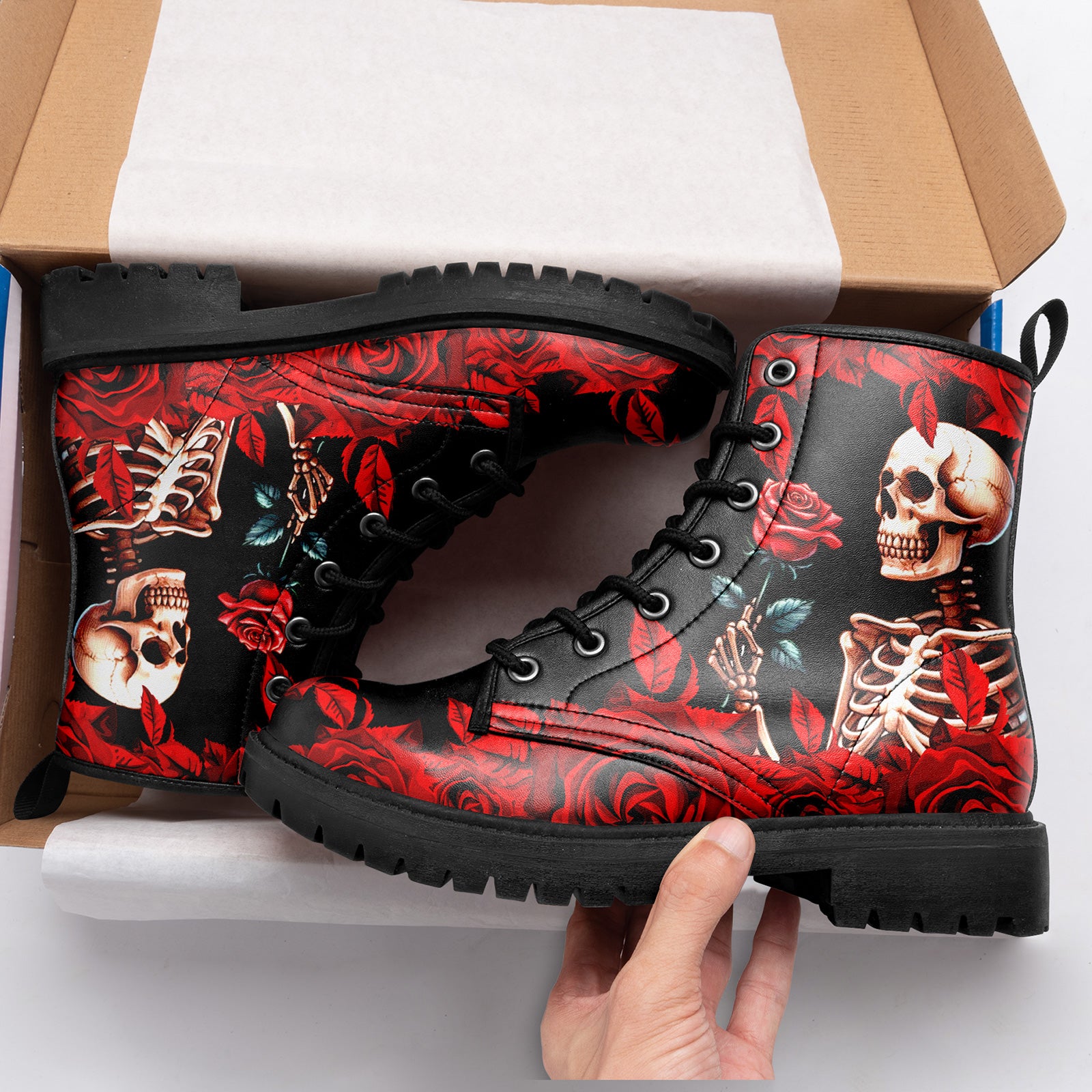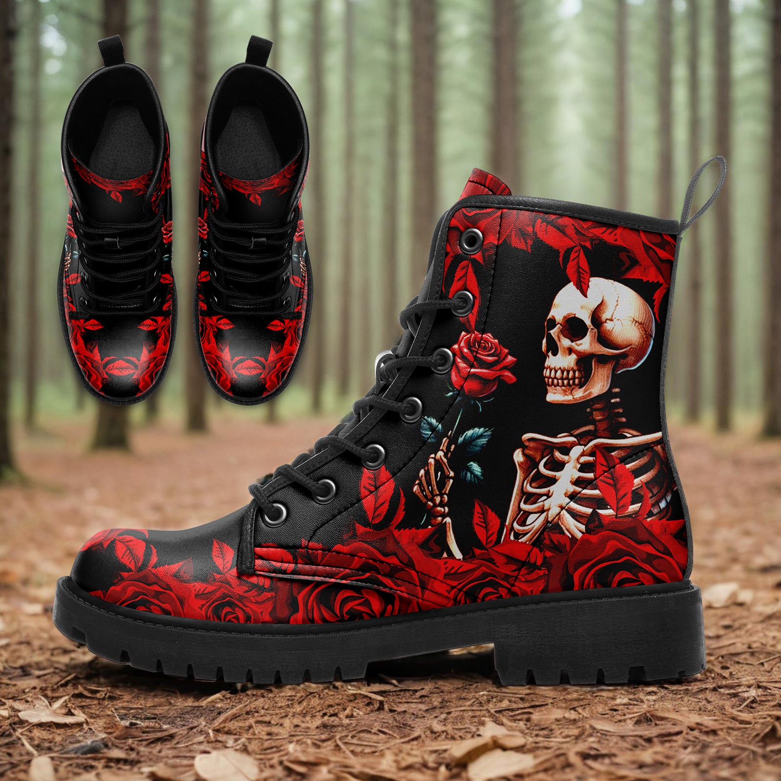 Gothic Skeleton Holding Red Rose Combat Boots - Dark Romance Floral Shoes BOOTS-24023007-5