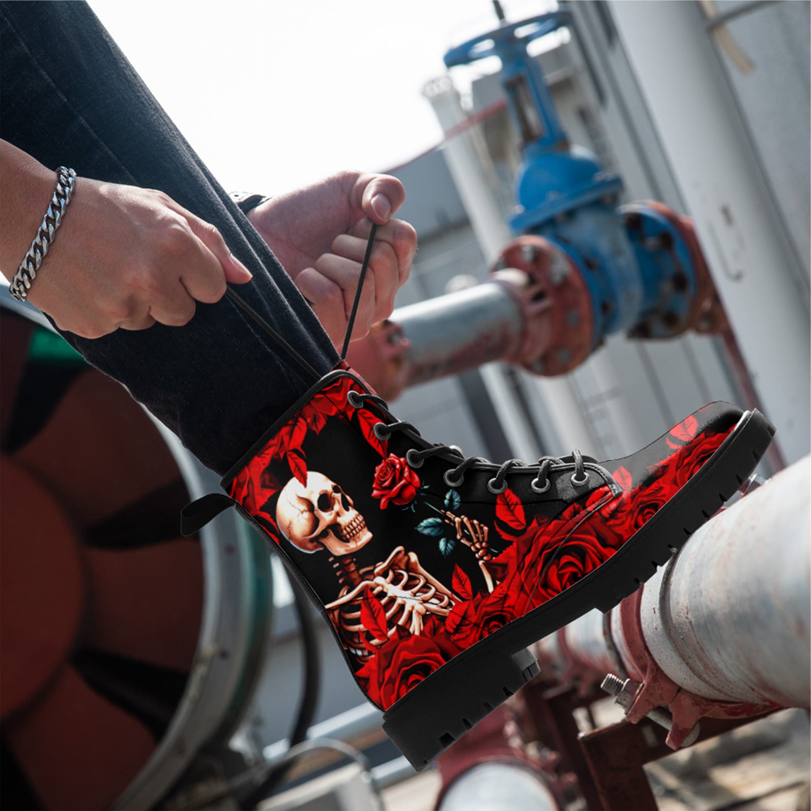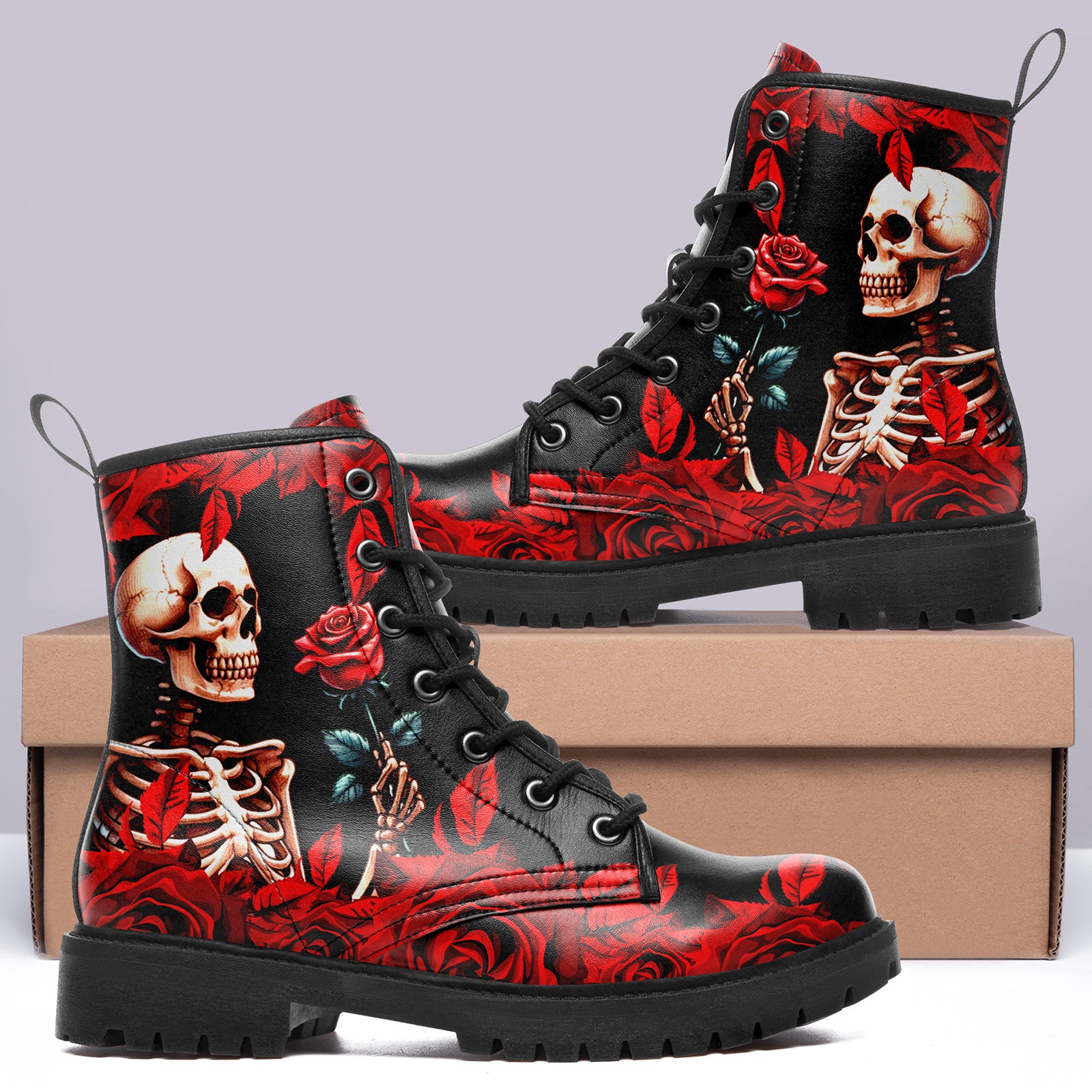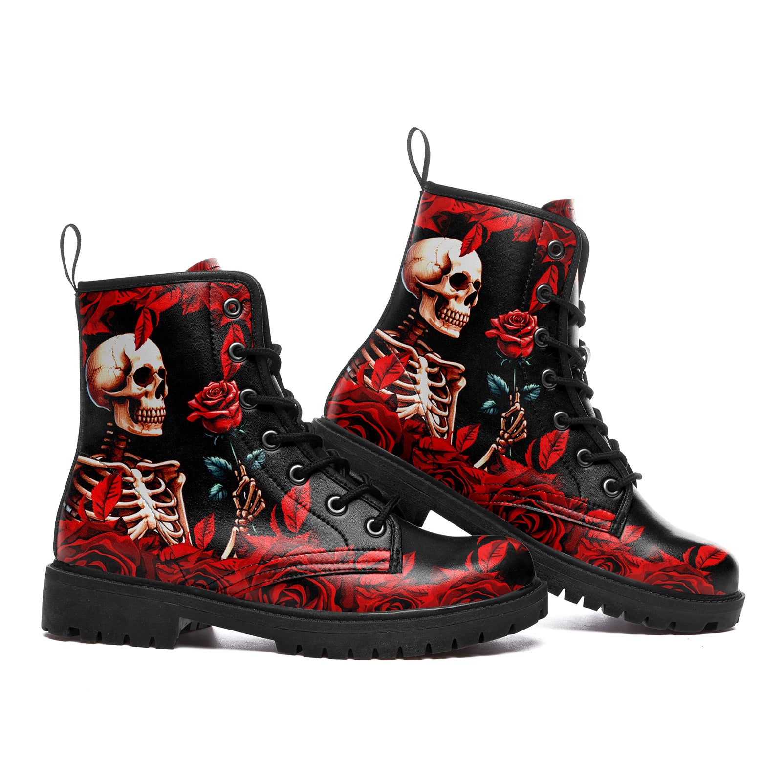 A gesture that lasts forever. These stunning combat boots capture a moment of eternal devotion. Featuring a detailed illustration of a **skeleton tenderly offering a red rose**, surrounded by falling petals, this design is the epitome of dark romance.