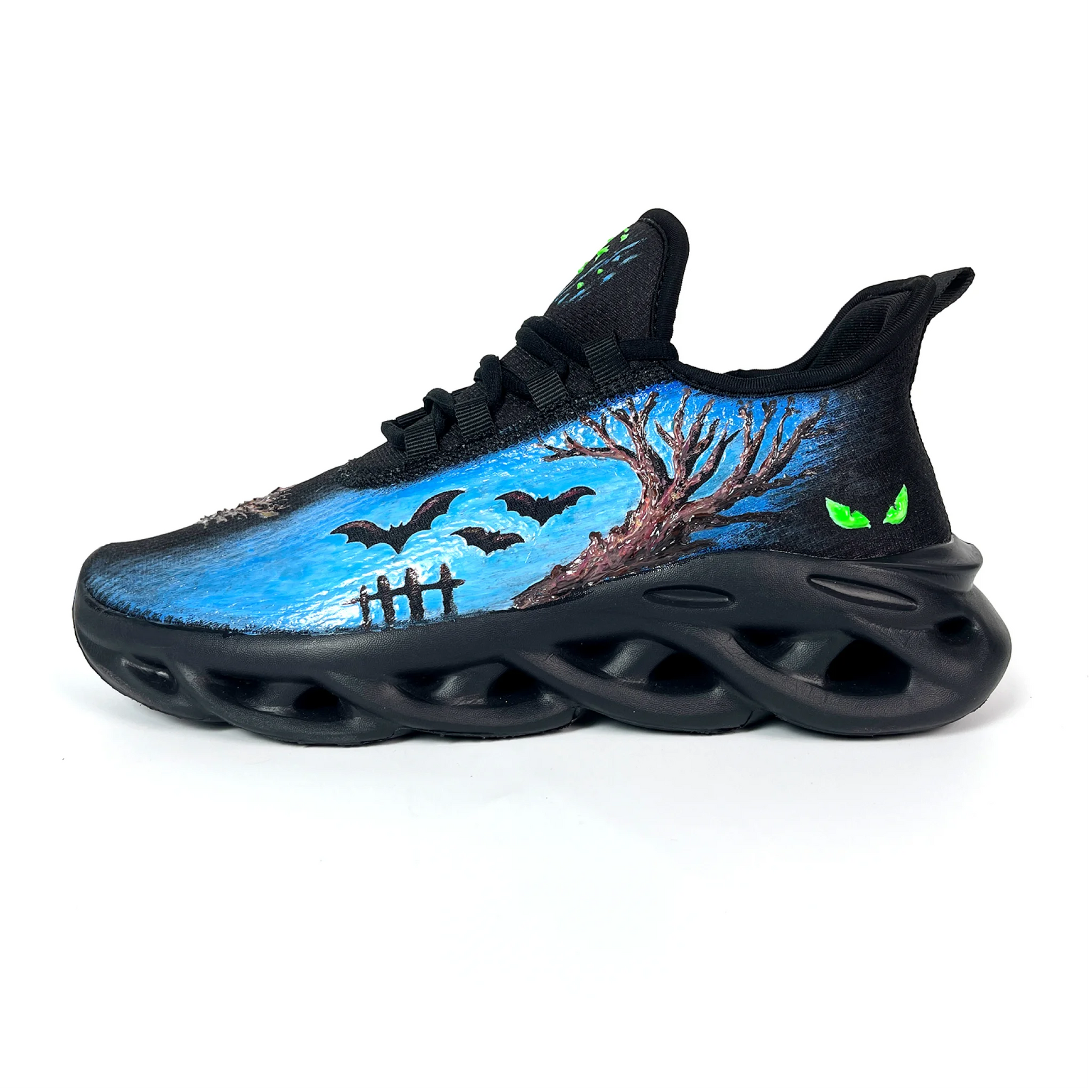 Unleash the spirits of Halloween night! These sneakers feature a haunted scene with spooky trees and bats taking flight. But the real magic happens when the lights go out—fluorescent eyes and details blaze to life, glowing ominously in the dark. Built on a modern, cushioned sole, they are the ultimate way to make a haunting statement this season.