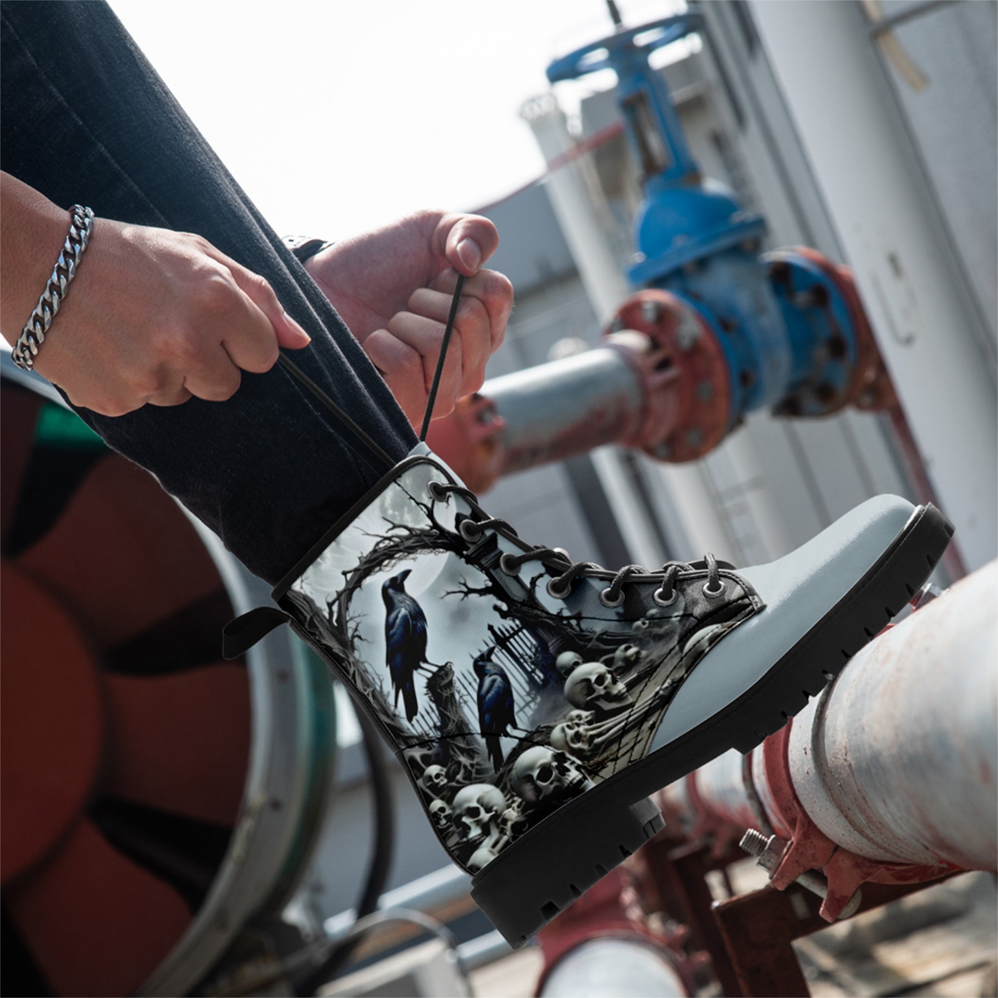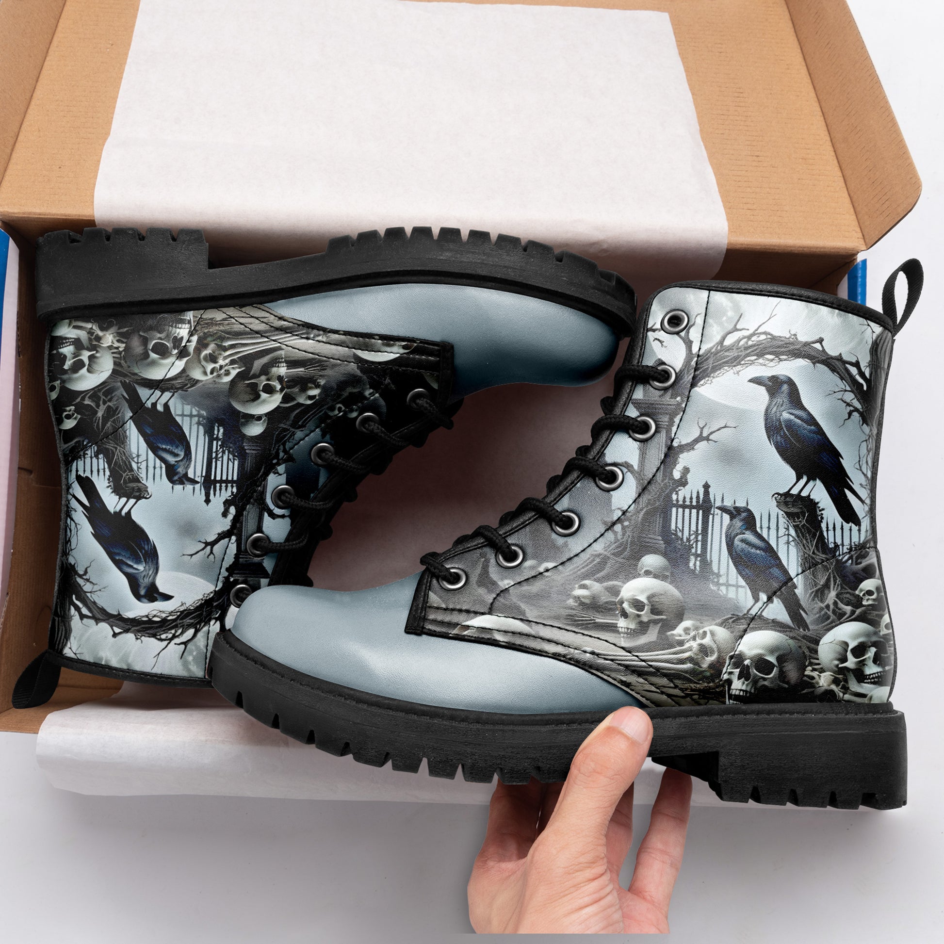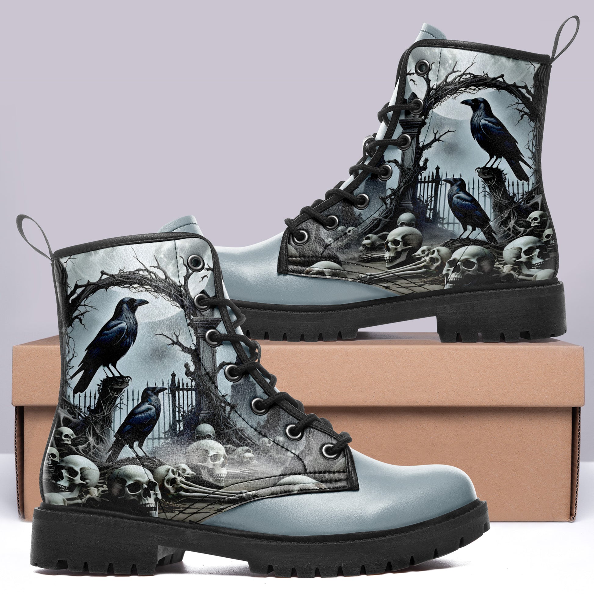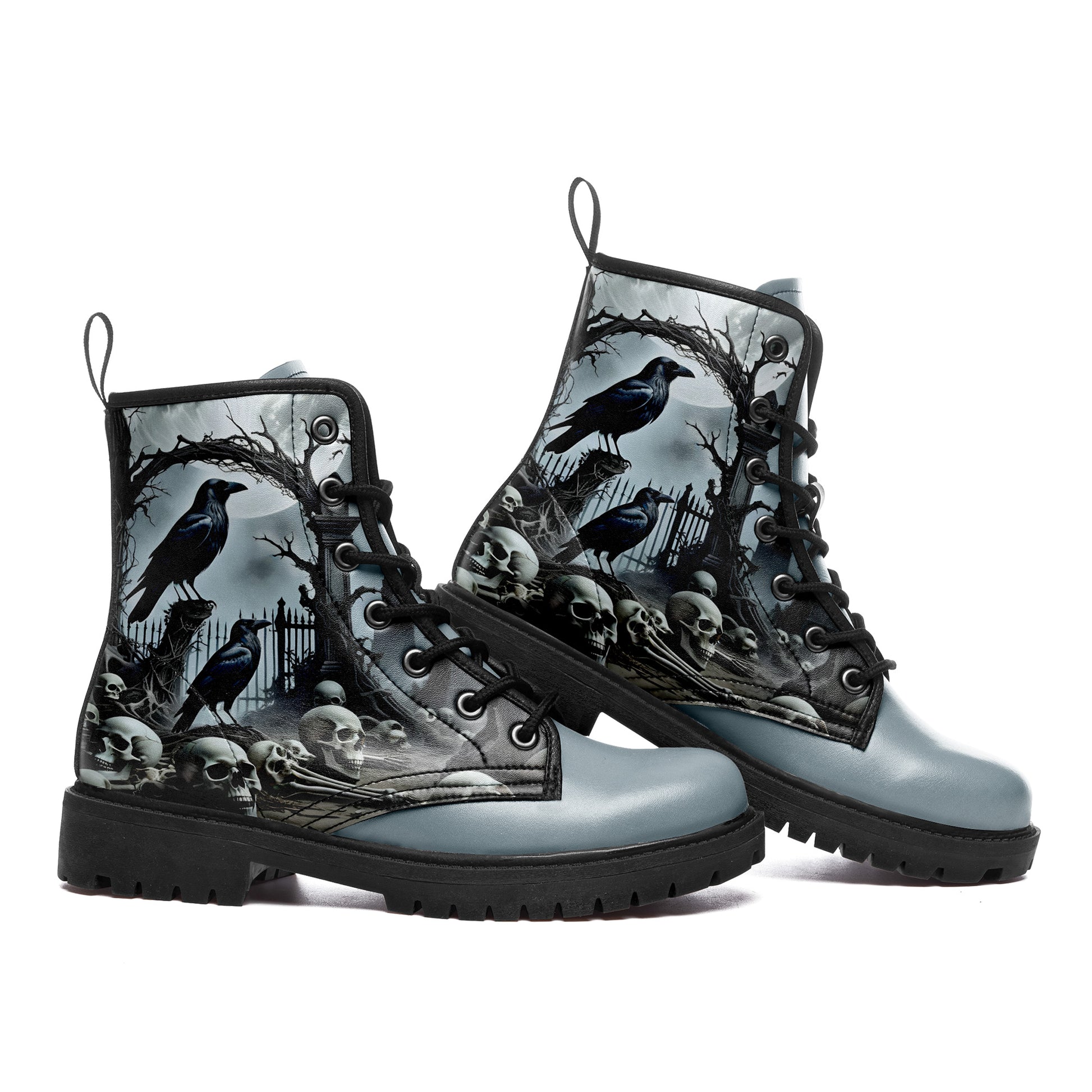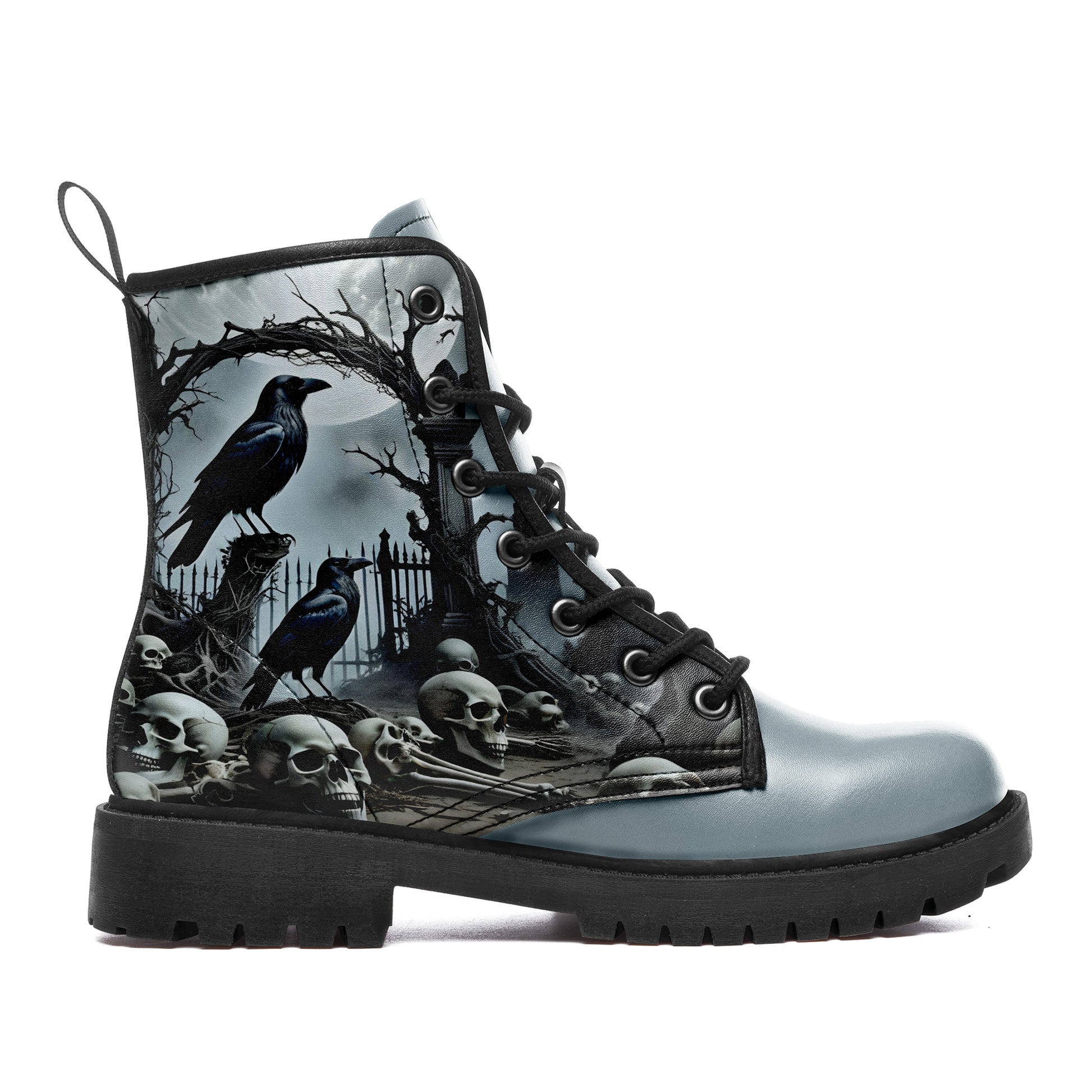 Step into the mist. These combat boots capture the chilling beauty of a **haunted cemetery** under the pale moonlight. A murder of **ravens** keeps watch over a pile of **forgotten skulls** and bones, set against a backdrop of twisted iron gates and fog.