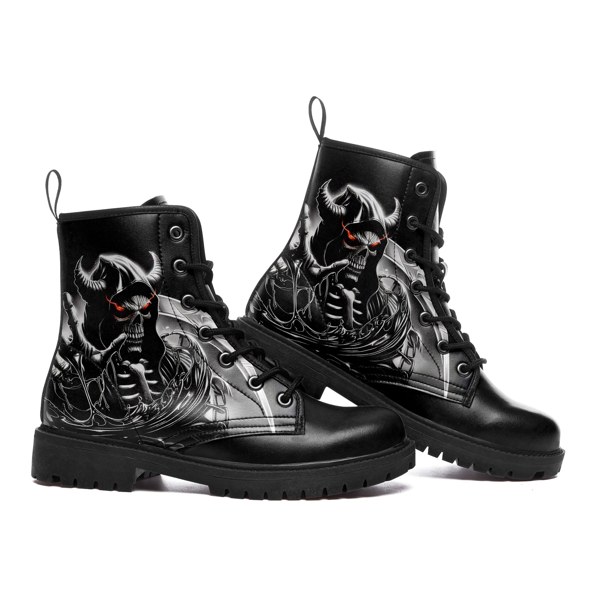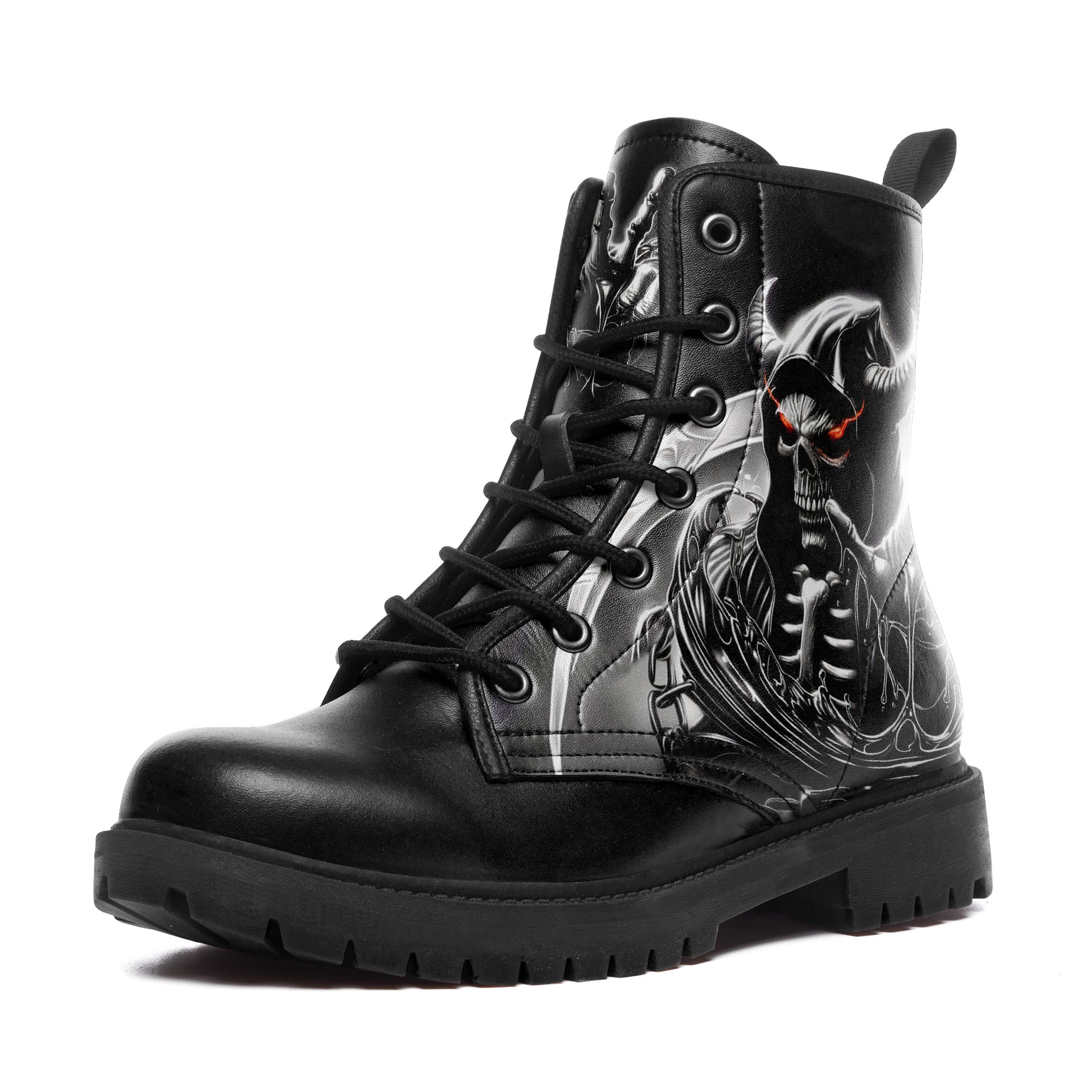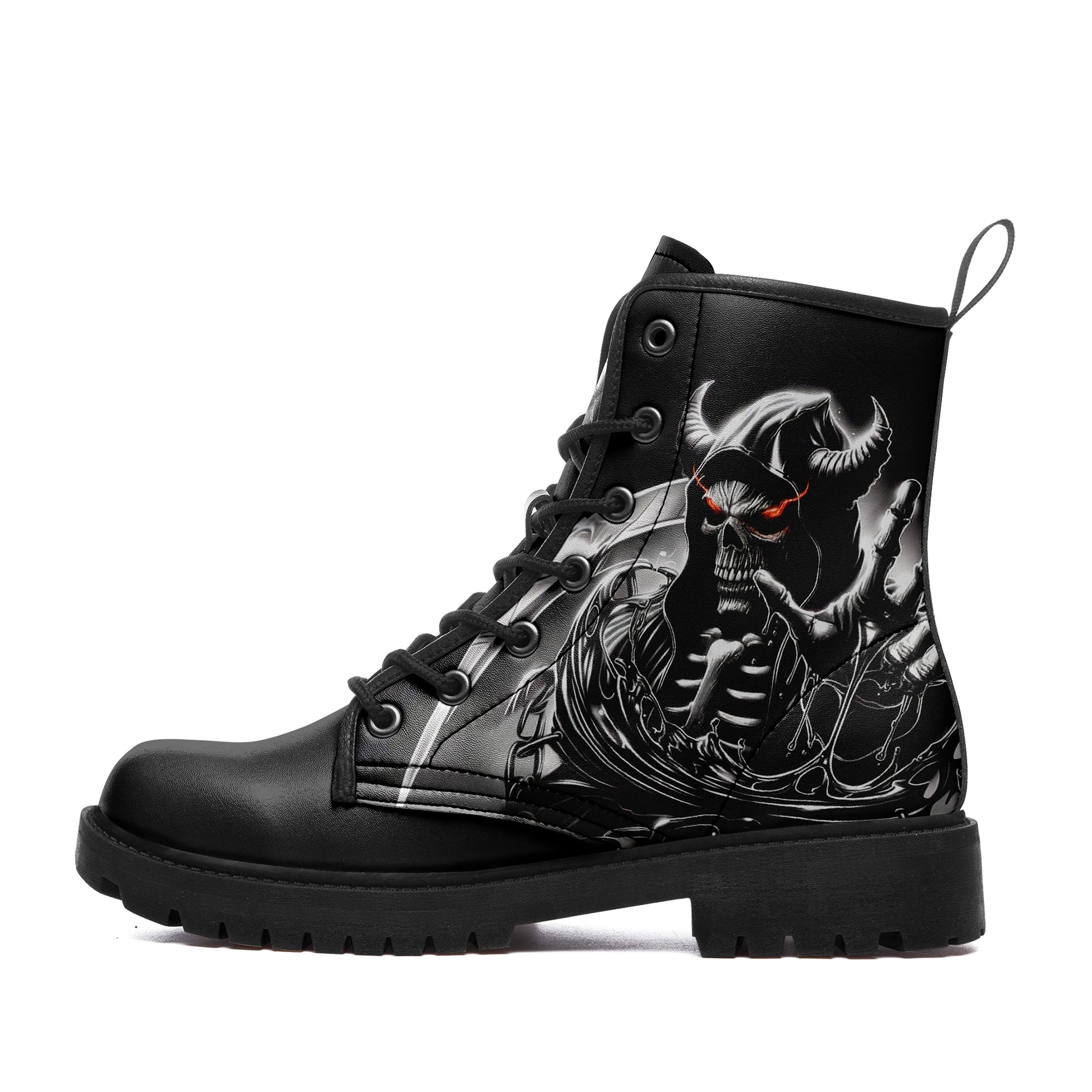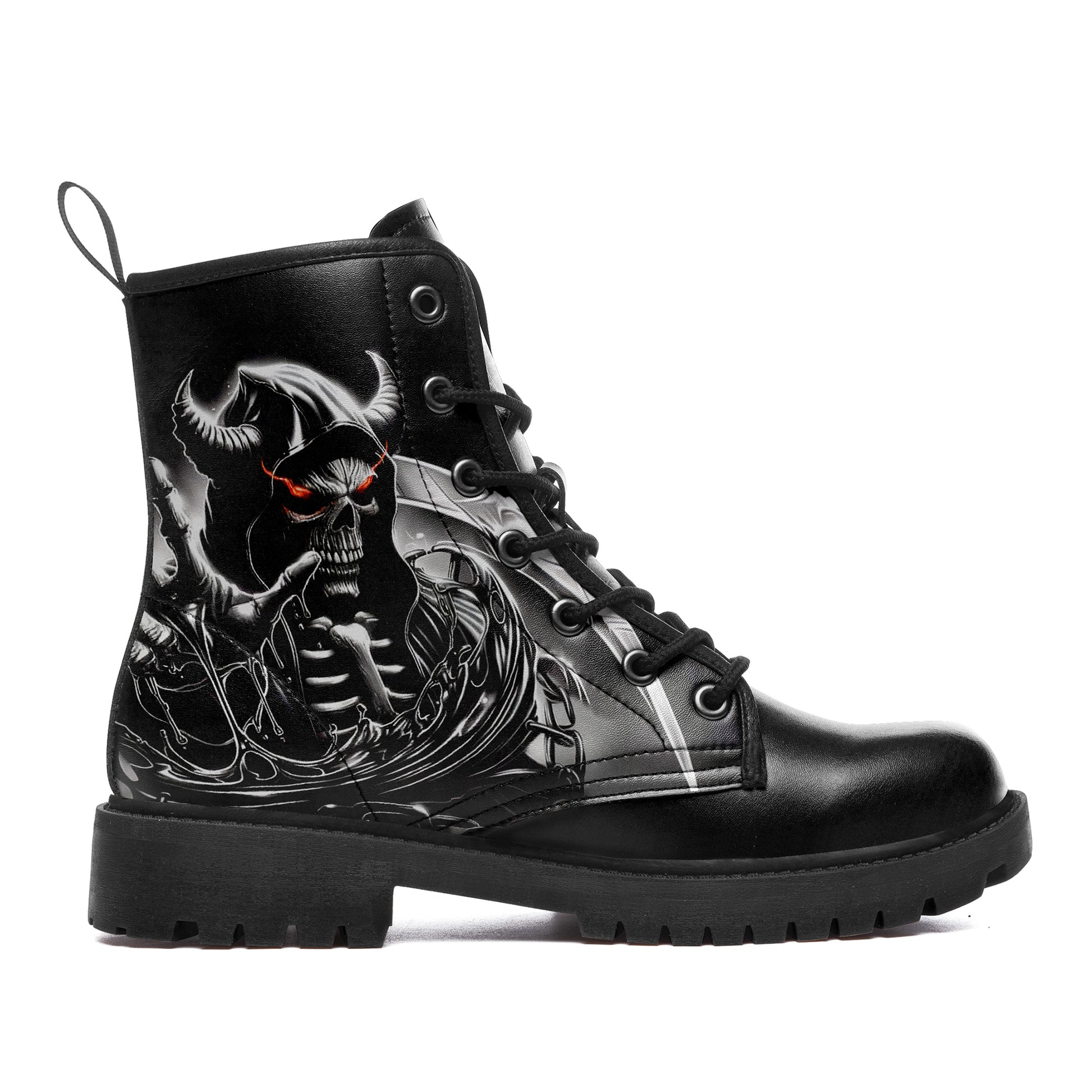 Dominate the battlefield. These combat boots feature a terrifying vision of the underworld: a **horned skeletal reaper** wielding a massive scythe, ready to harvest souls.