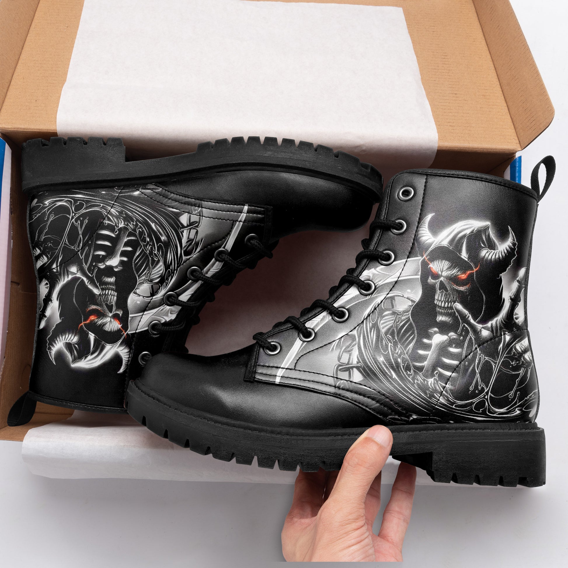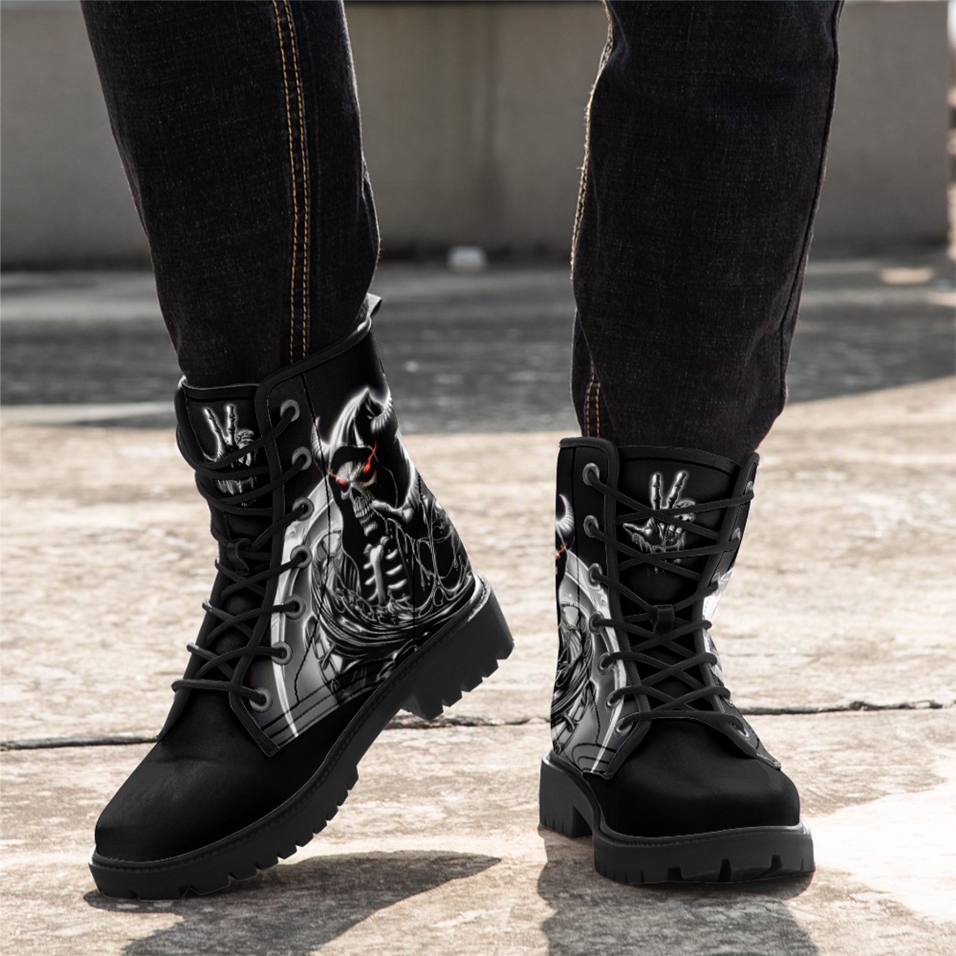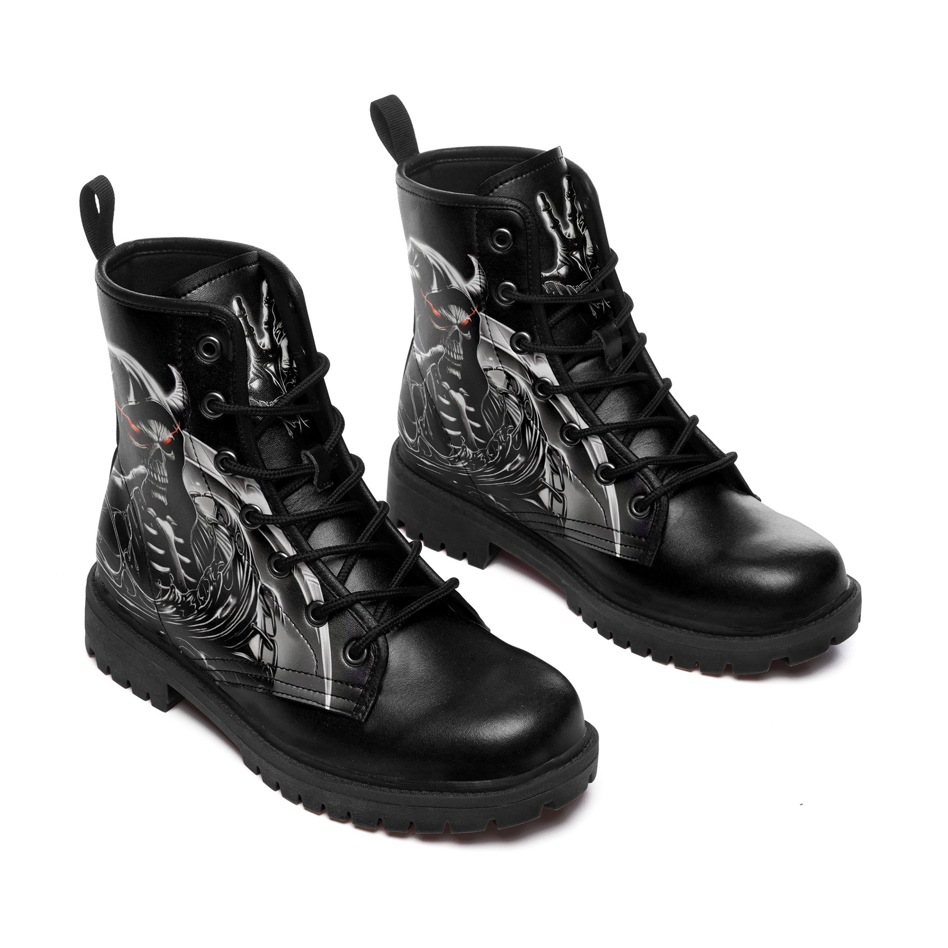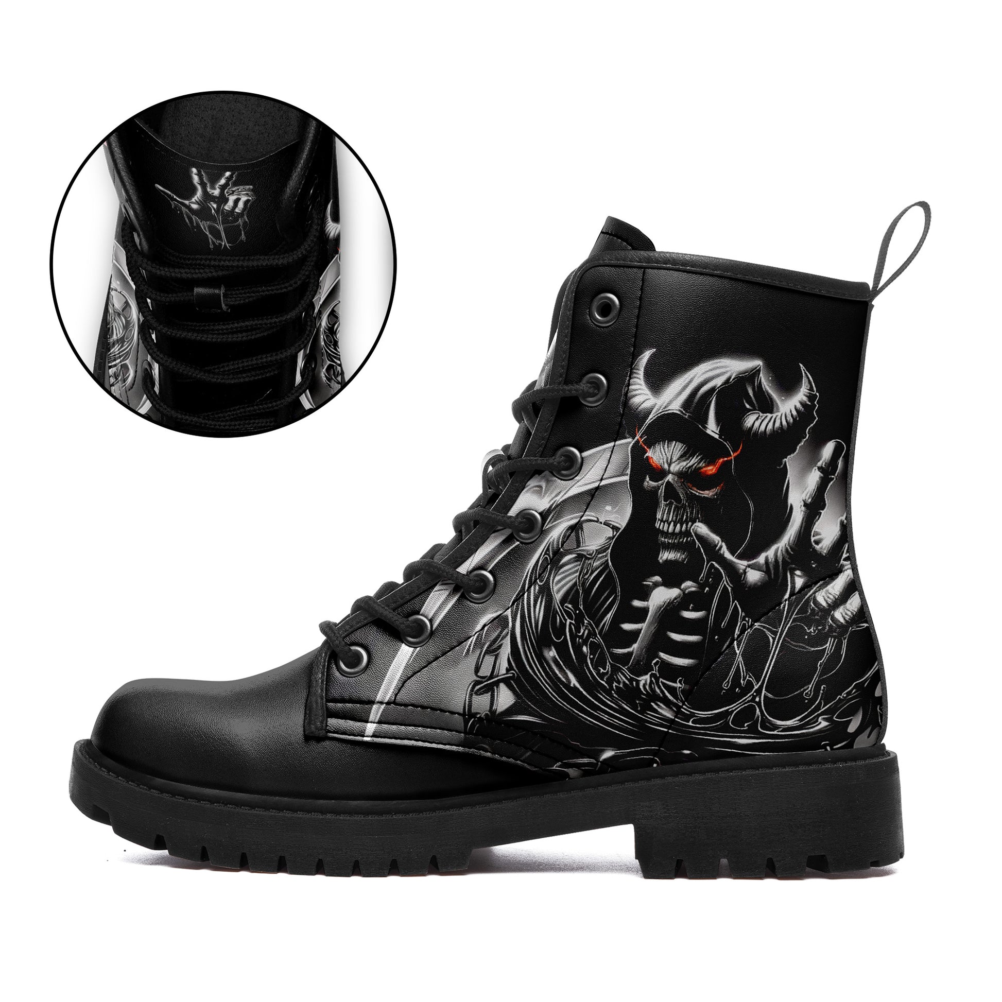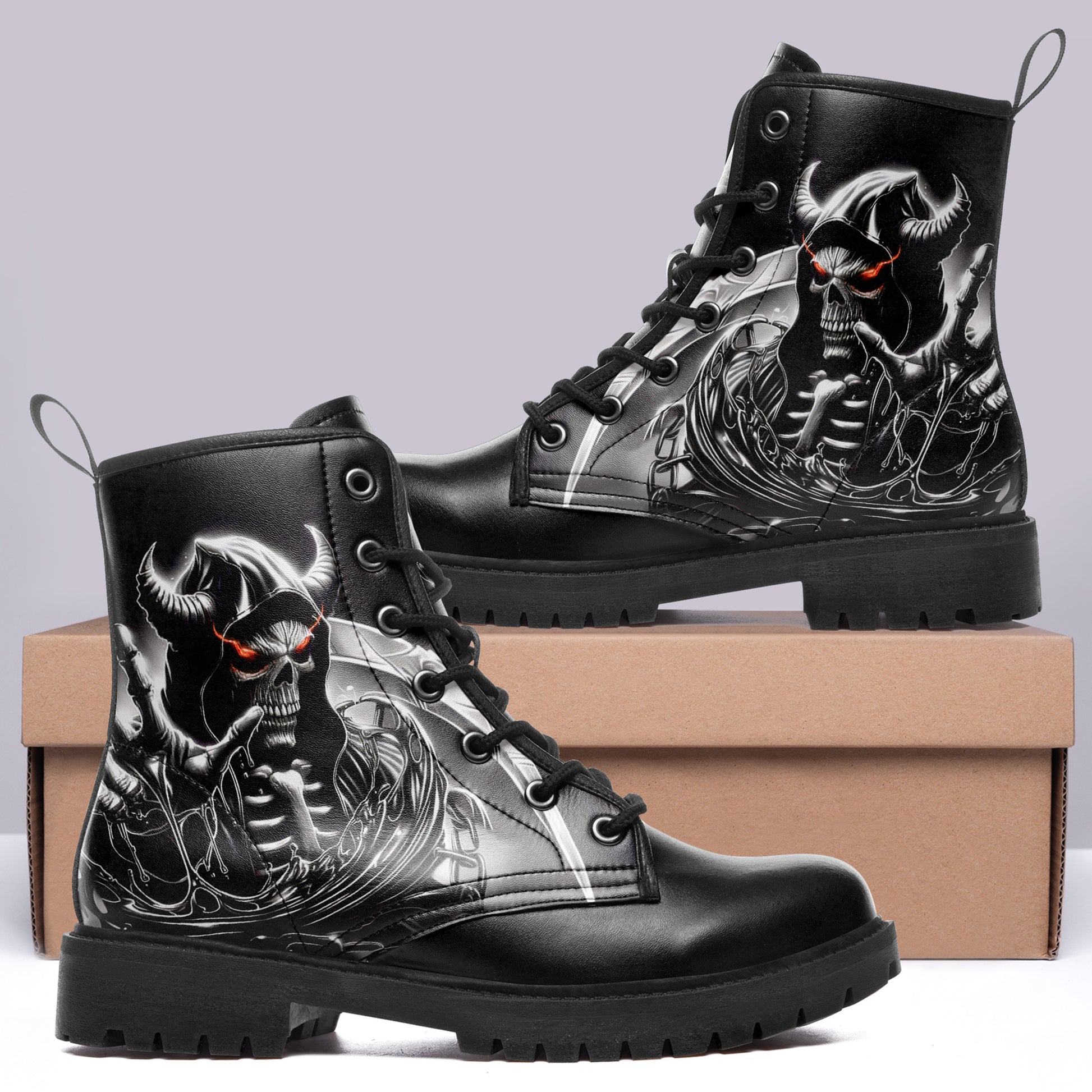 Dominate the battlefield. These combat boots feature a terrifying vision of the underworld: a **horned skeletal reaper** wielding a massive scythe, ready to harvest souls.