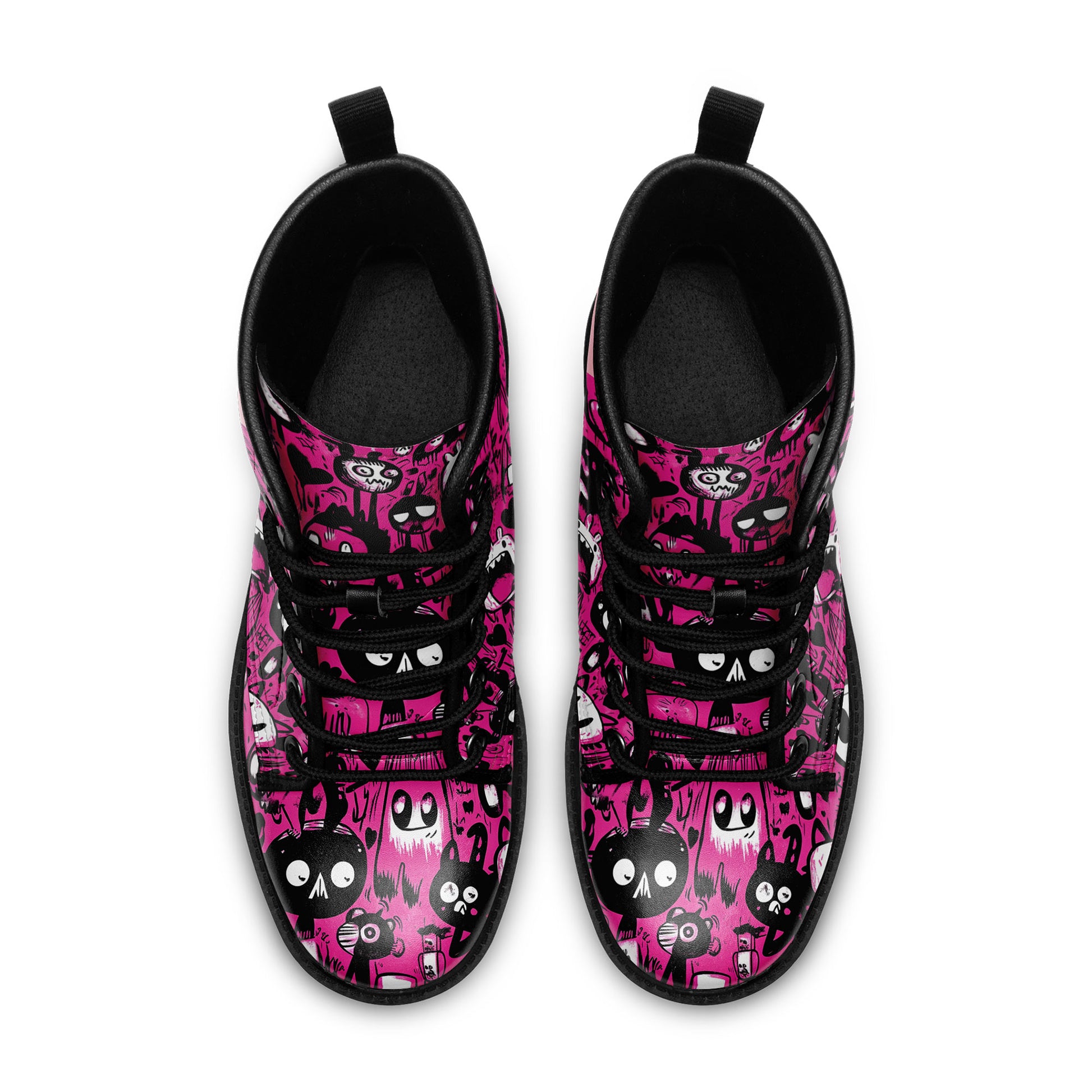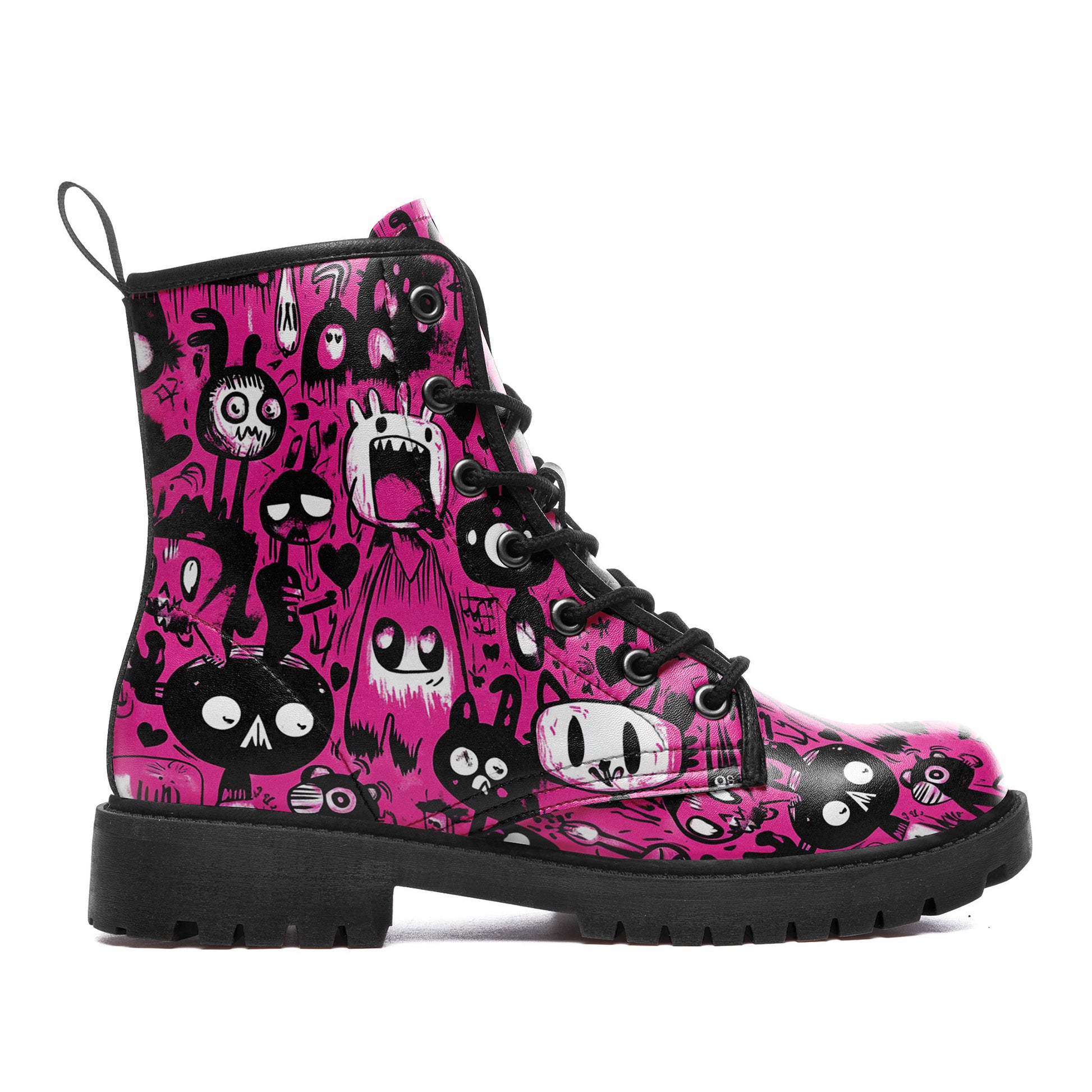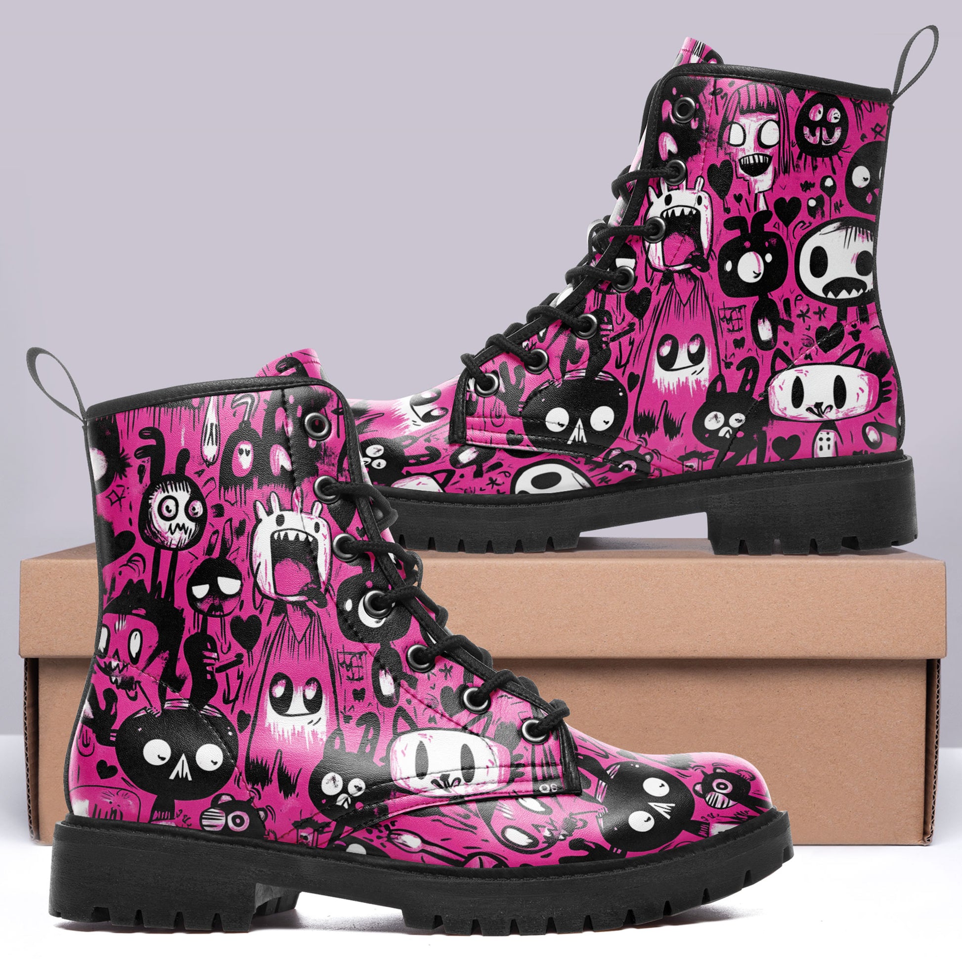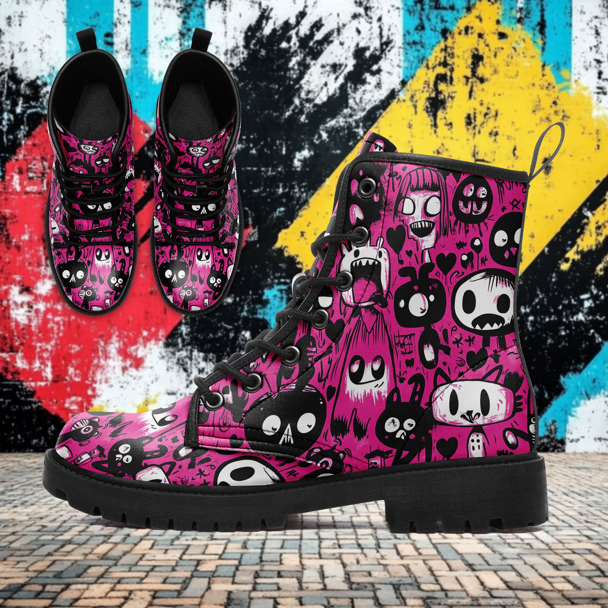 Unleash your inner weirdo. These combat boots are a chaotic explosion of creativity, featuring a **hot pink canvas covered in quirky doodle monsters**.