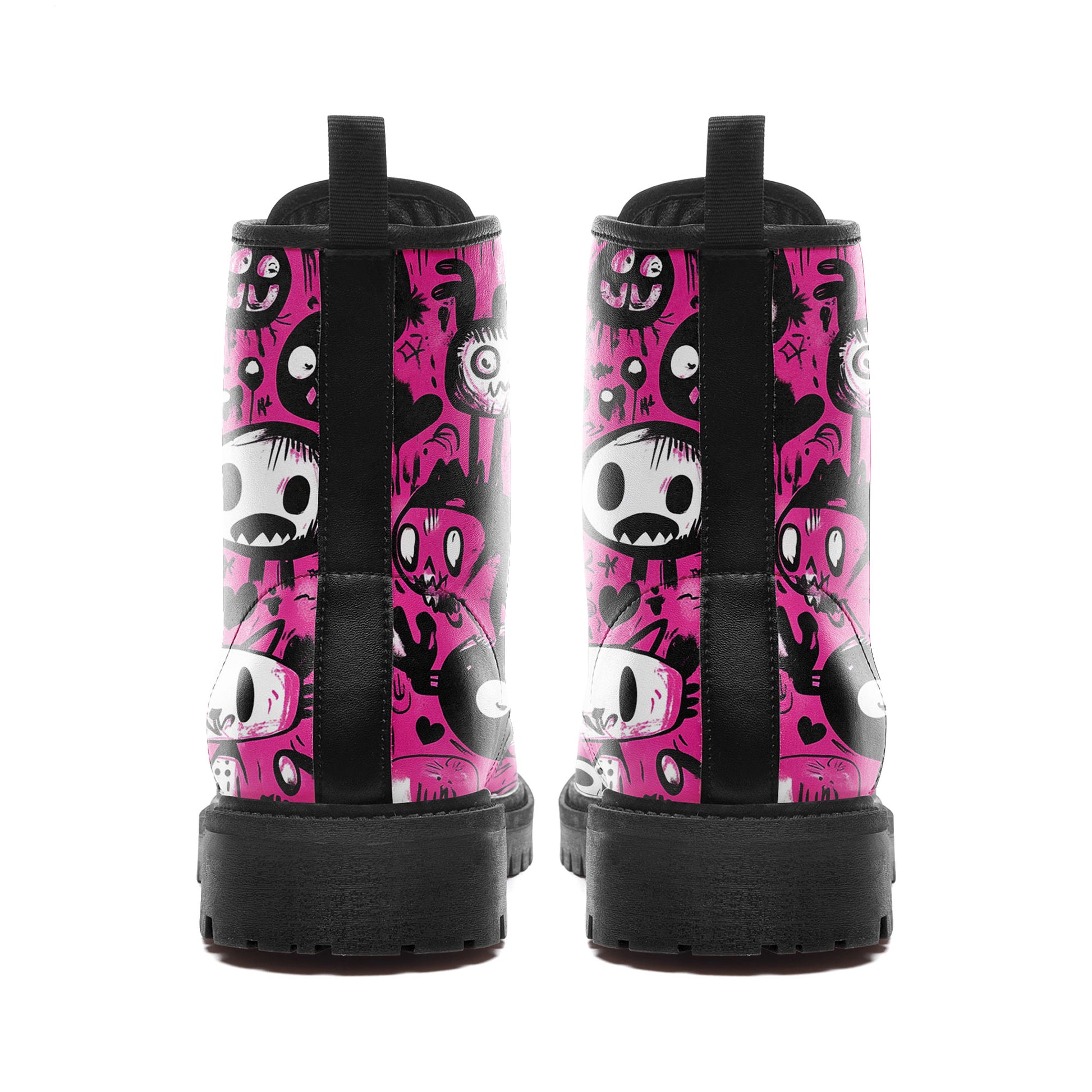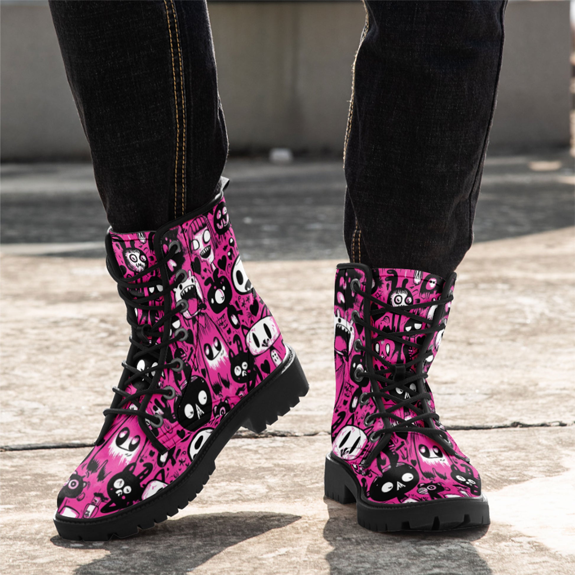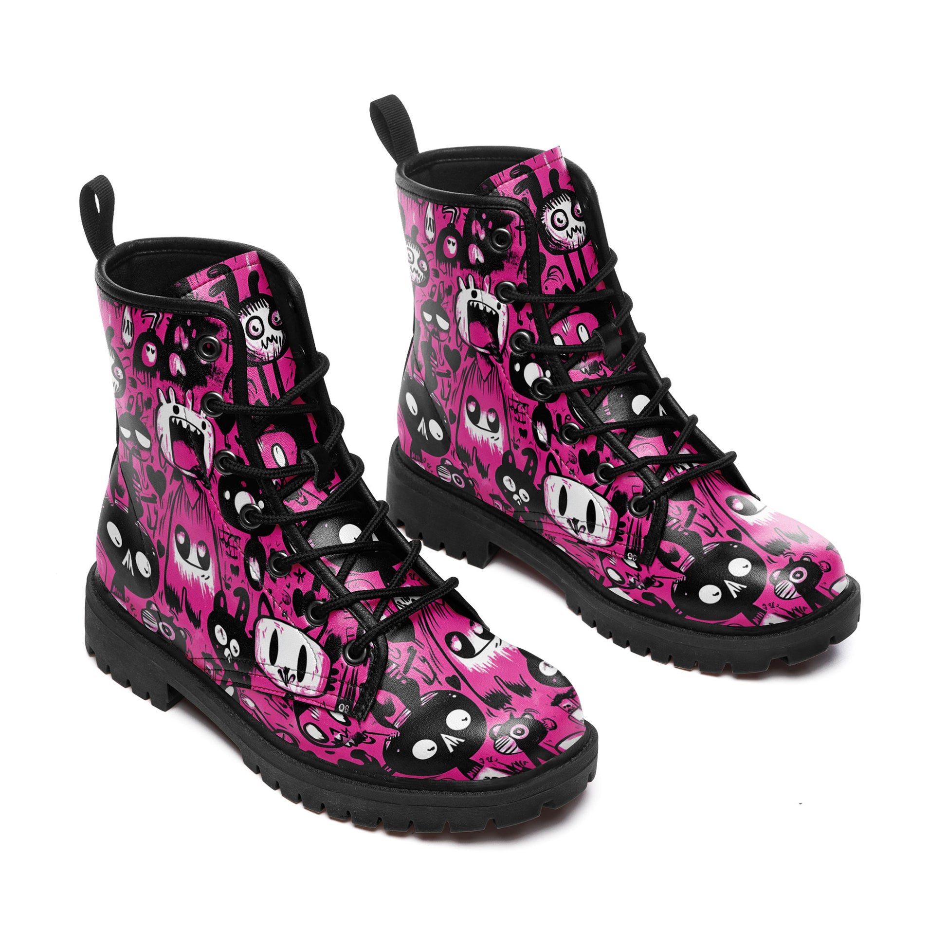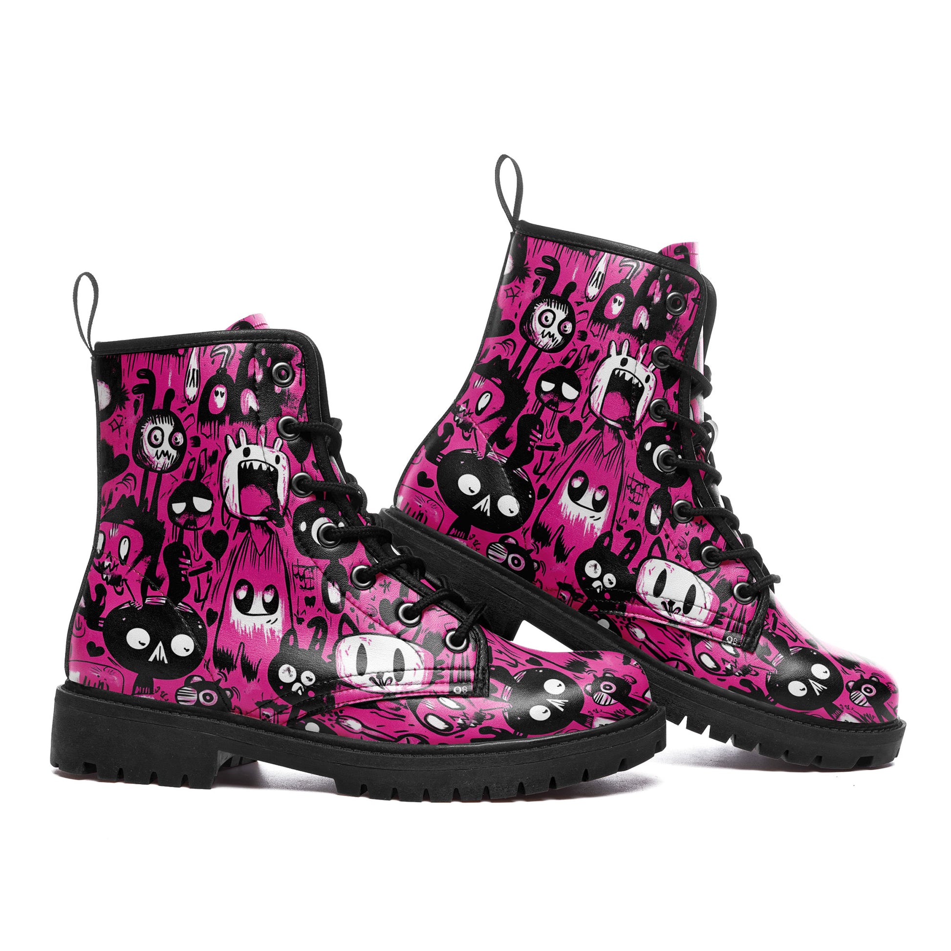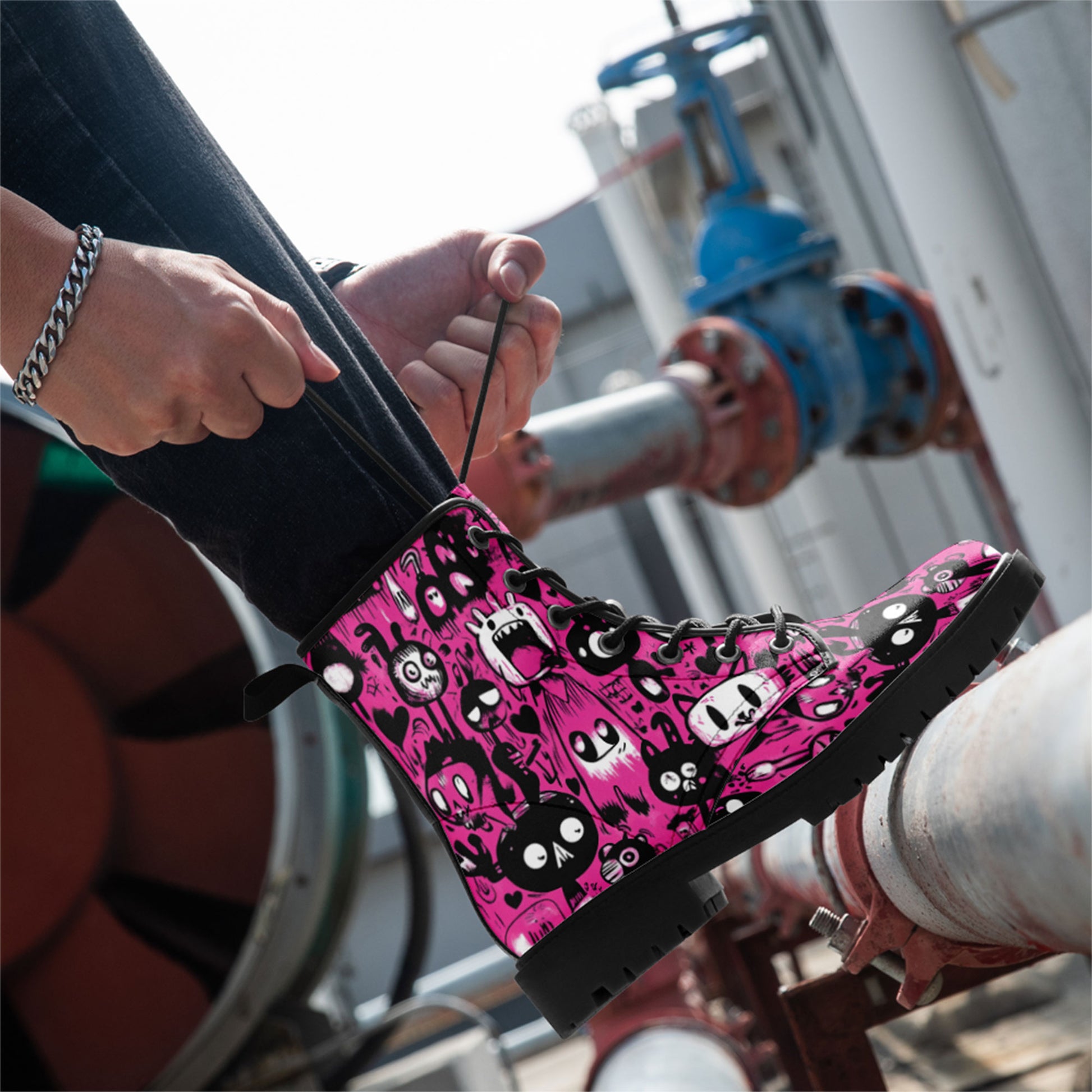 Unleash your inner weirdo. These combat boots are a chaotic explosion of creativity, featuring a **hot pink canvas covered in quirky doodle monsters**.