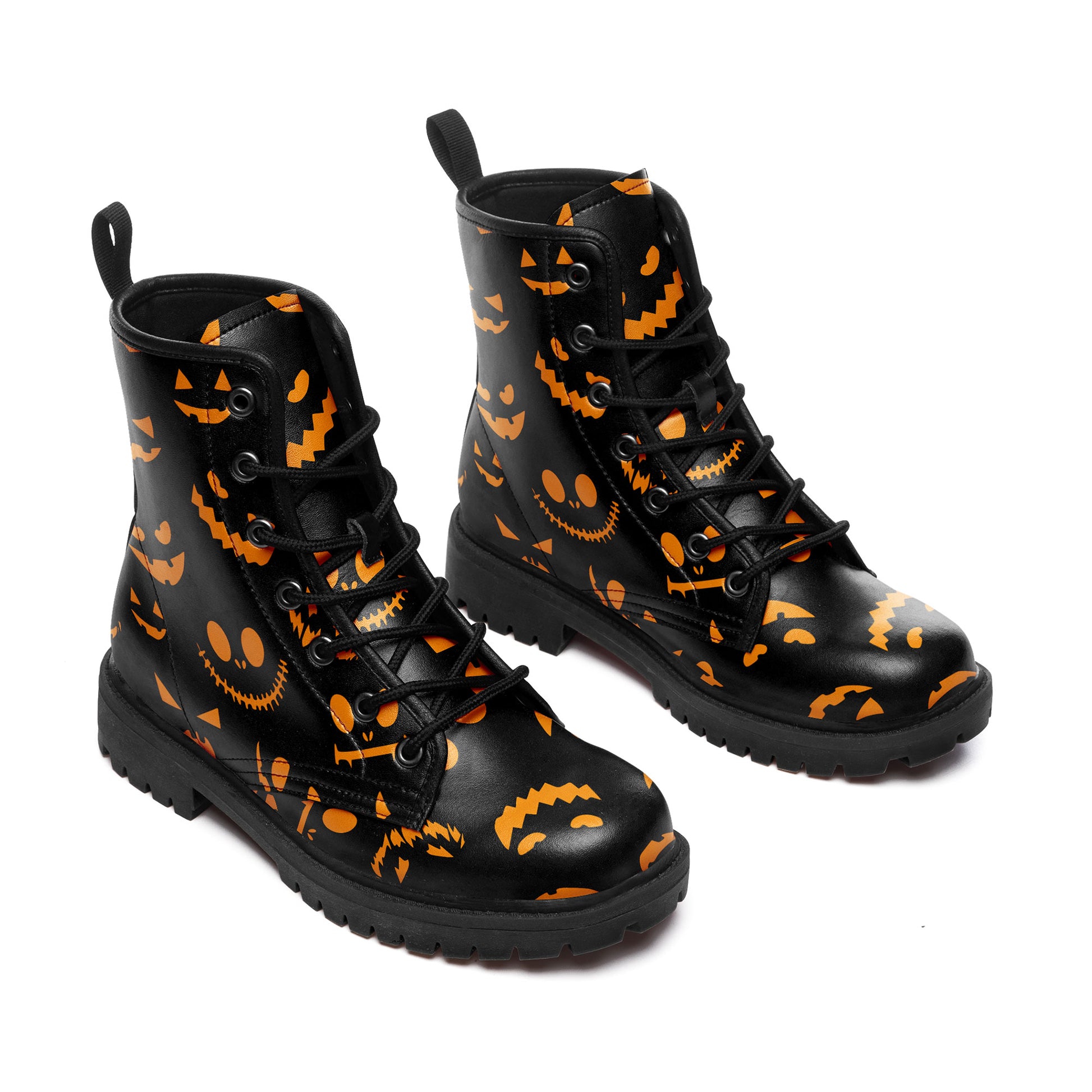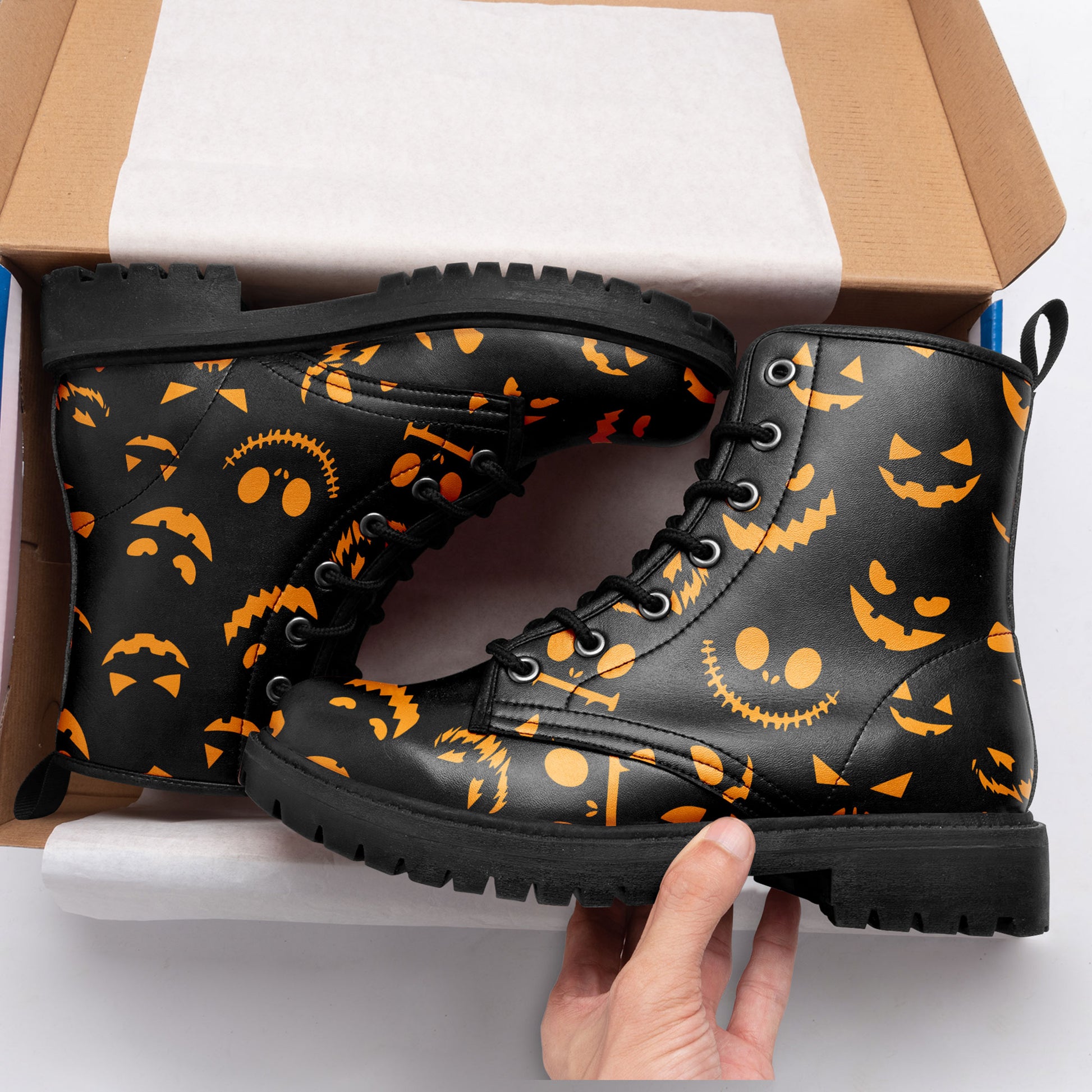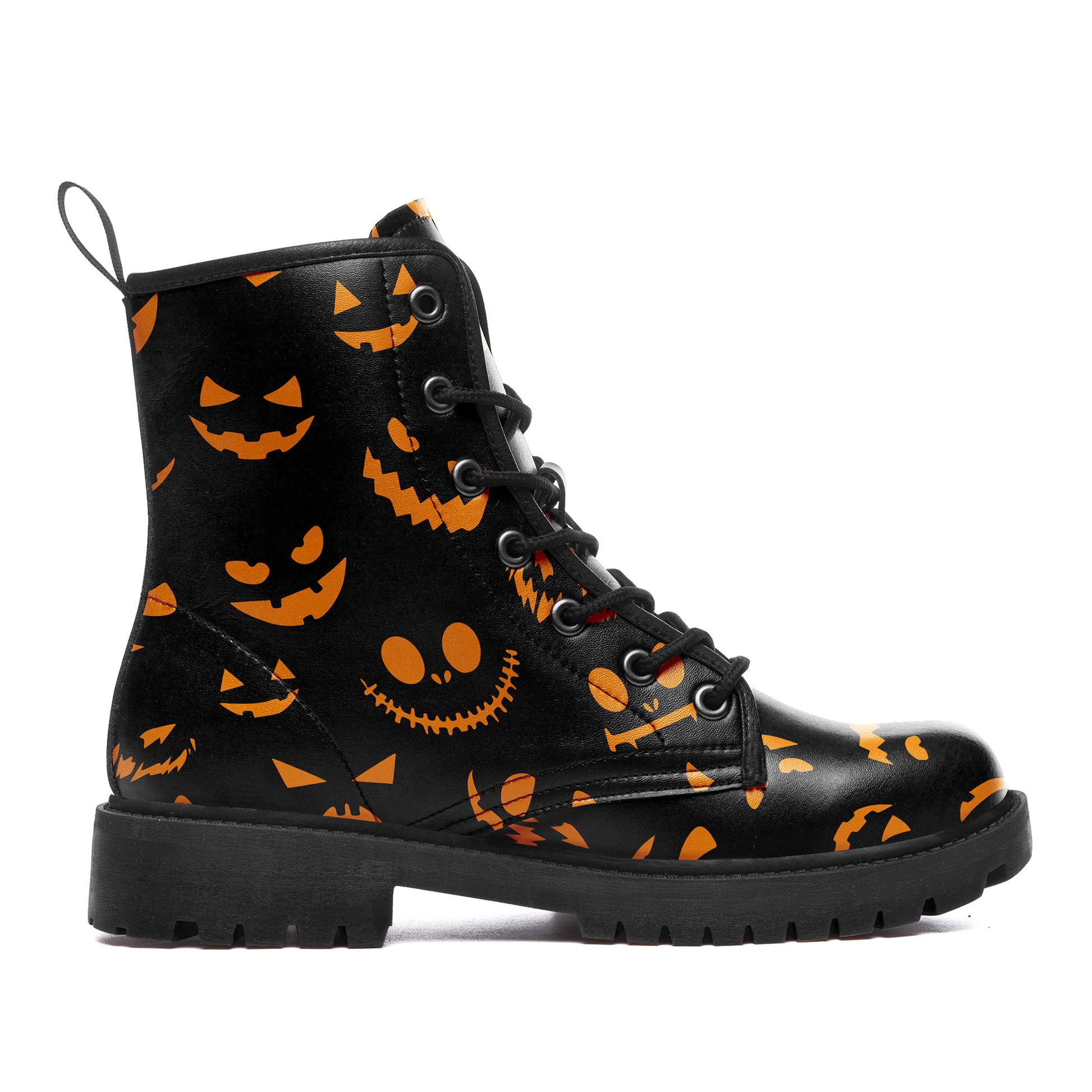 Jack-o'-Lantern Faces Pattern Combat Boots - Classic Halloween Print Shoes BOOTS-24025002-7