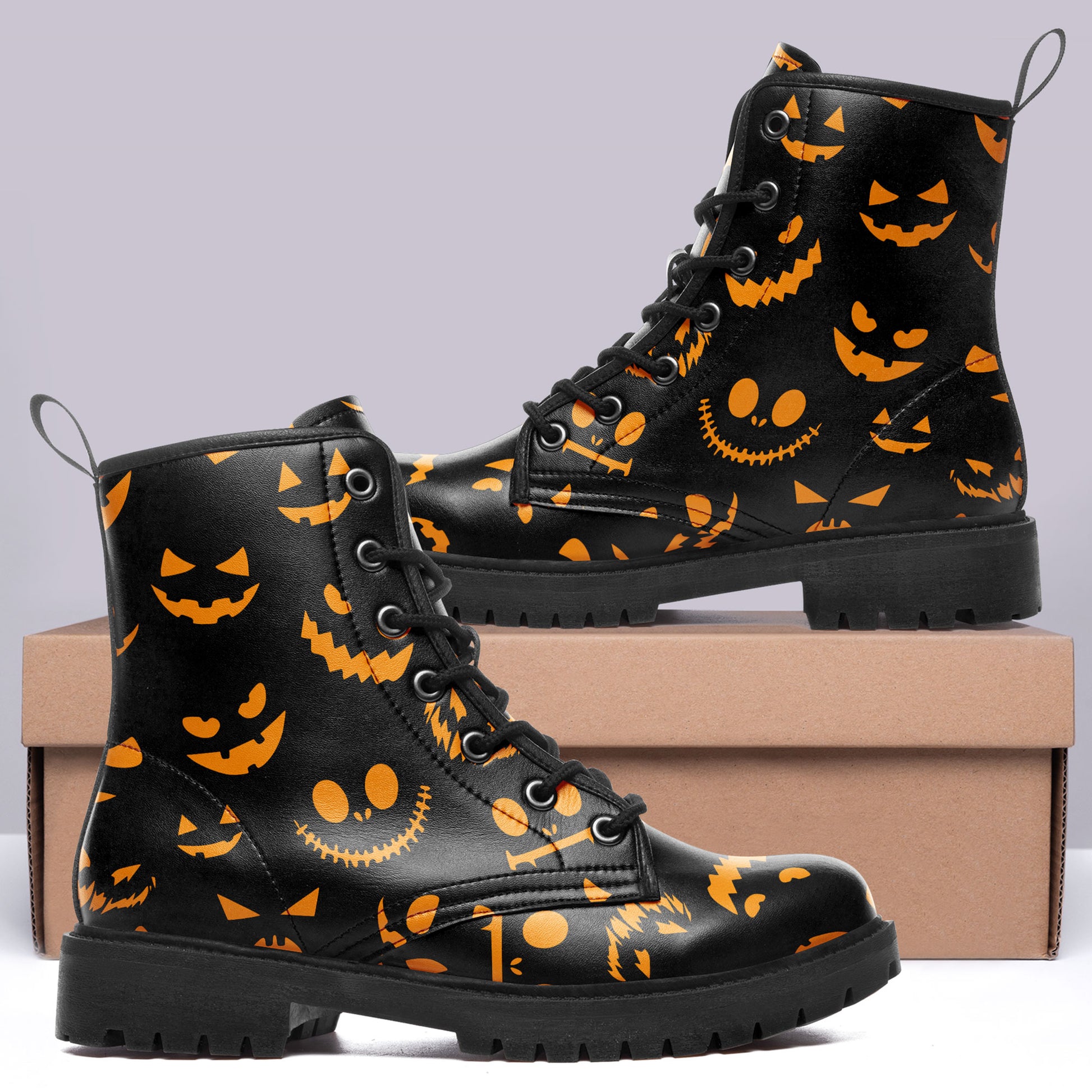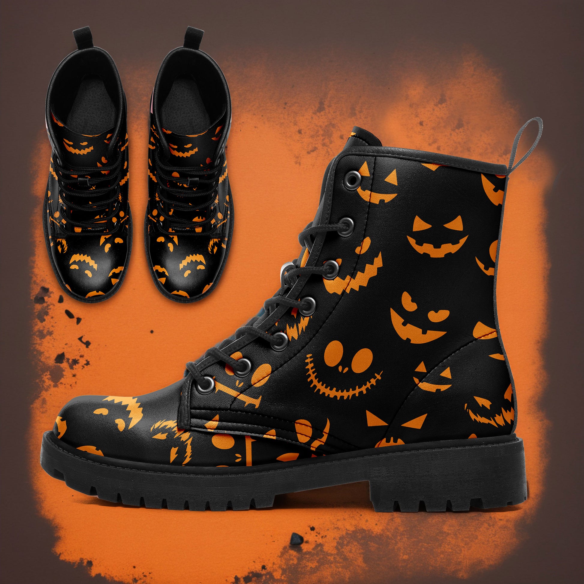 Get ready for some serious **trick-or-treating** or your next **Halloween bash** with these incredibly festive **Jack-o'-Lantern Faces Pattern Combat Boots**! Covered in a joyful (and sometimes spooky!) array of classic pumpkin grins, these boots are an absolute must-have for the season.