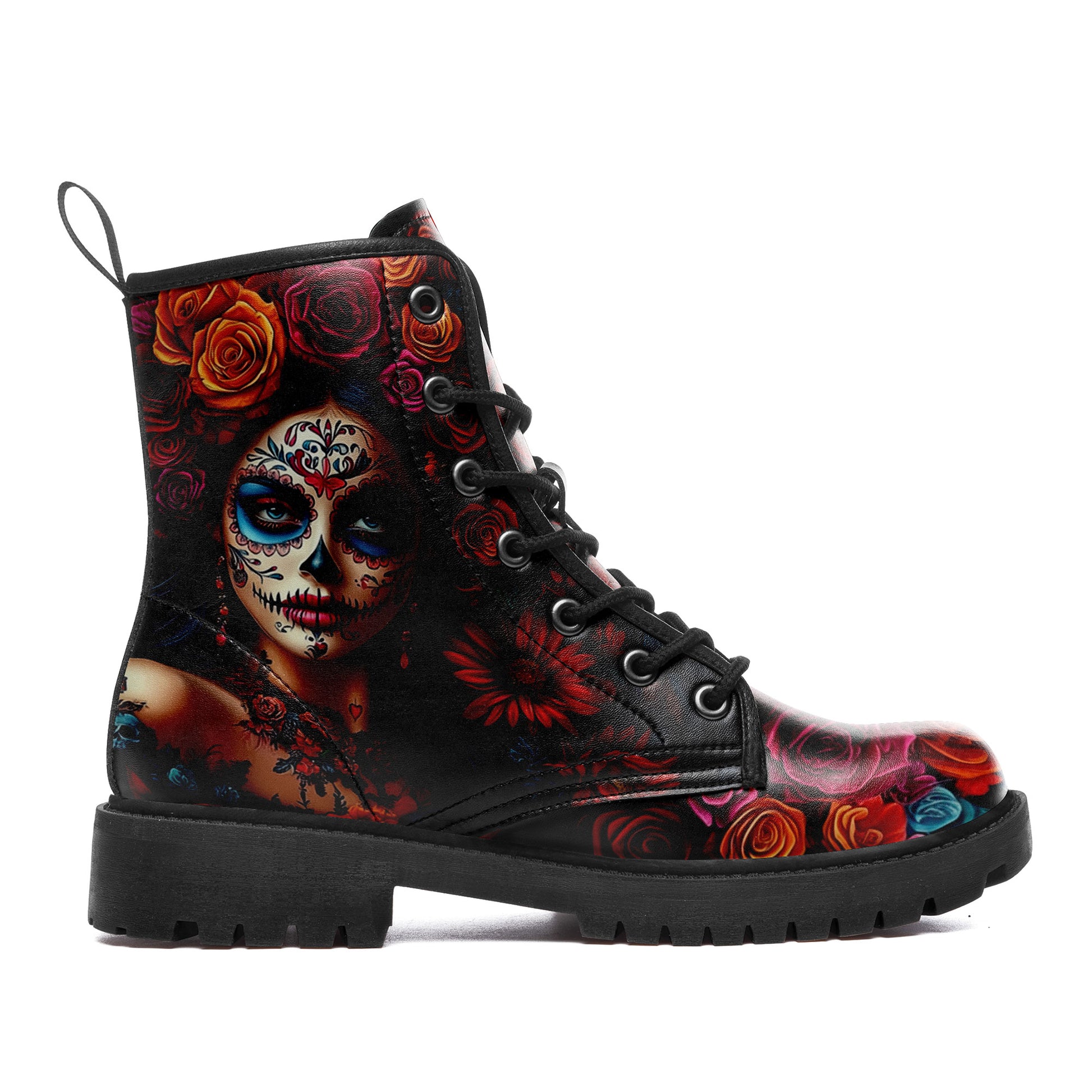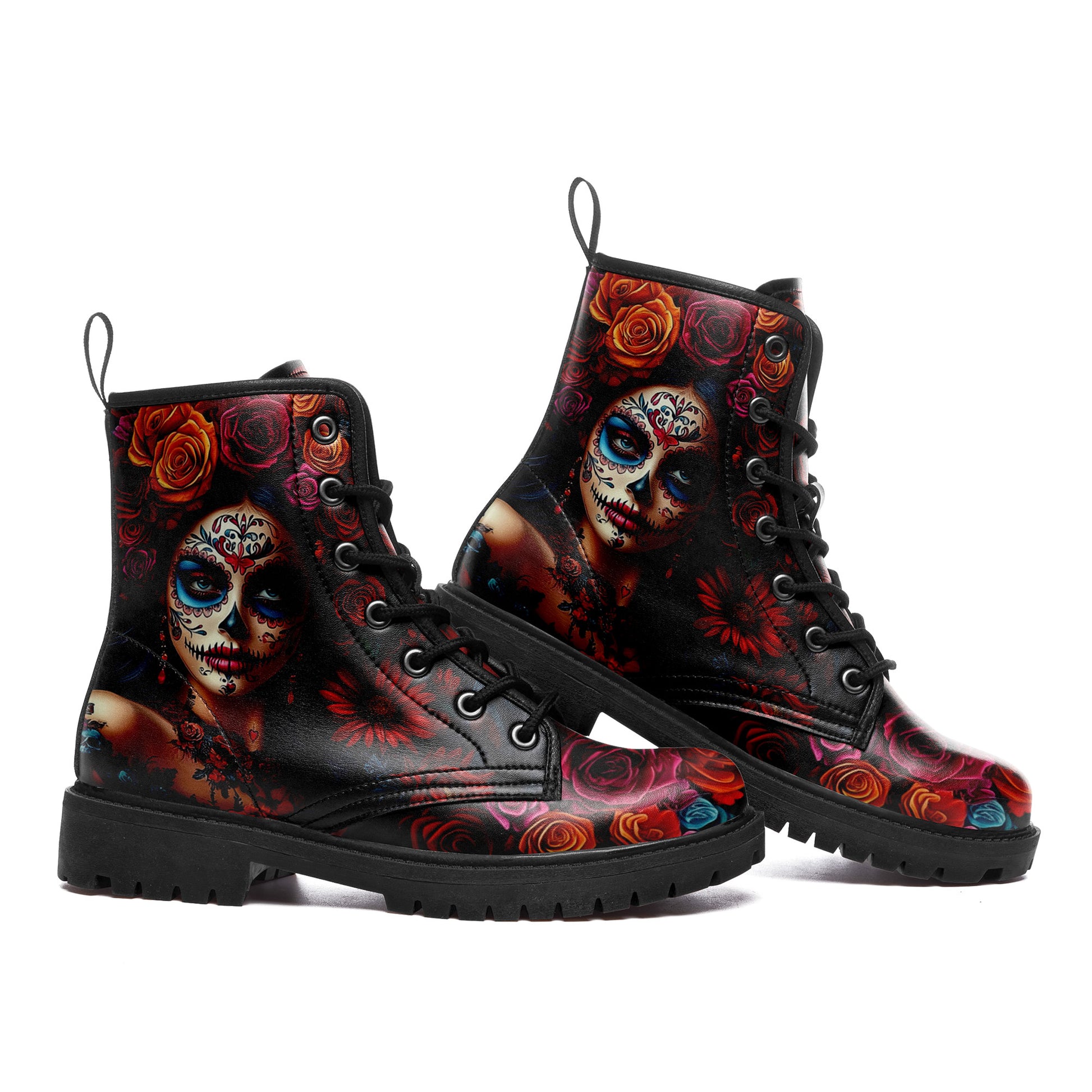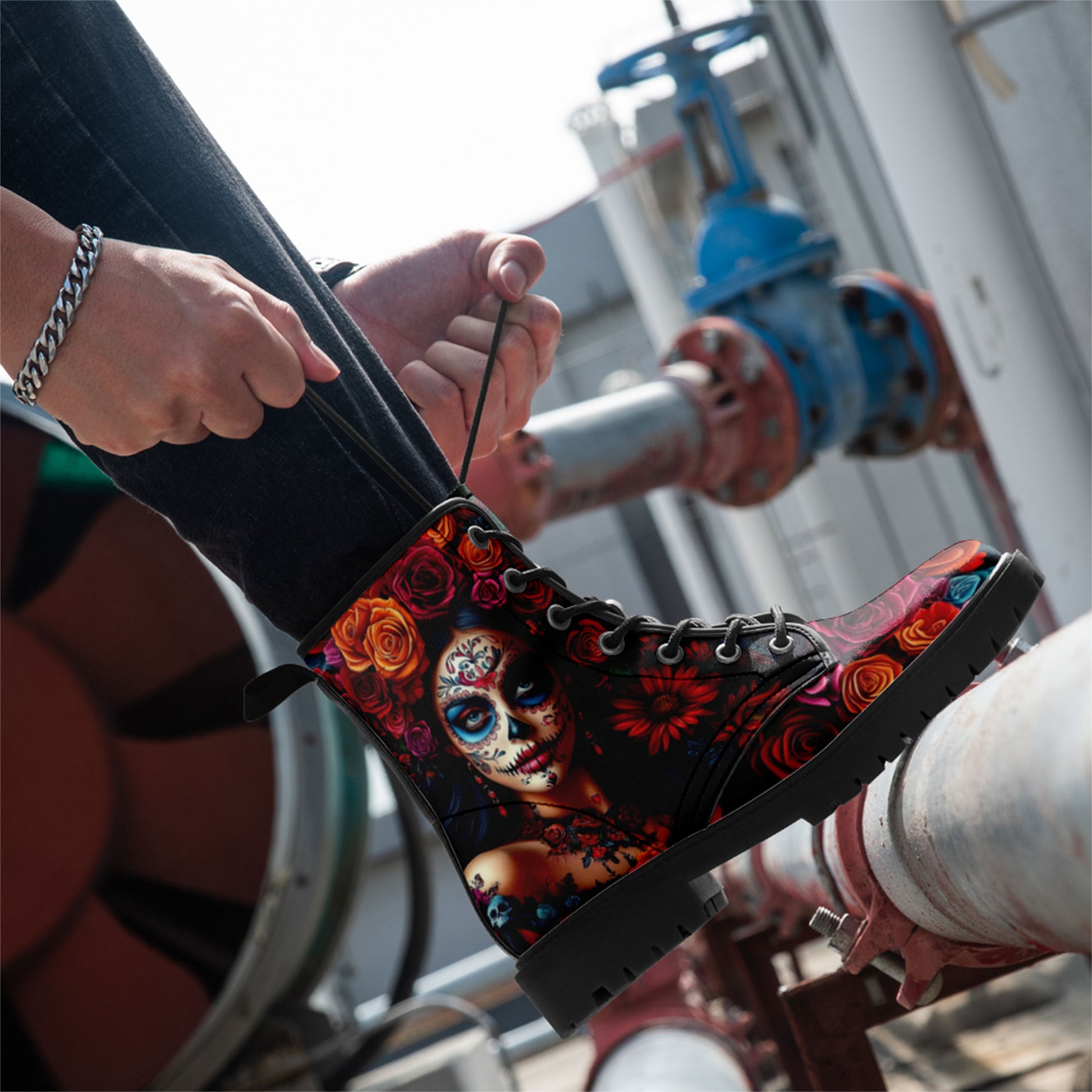 Captivate the room with a look that lasts forever. These stunning combat boots feature a mesmerizing portrait of **La Catrina**, the queen of the Day of the Dead.