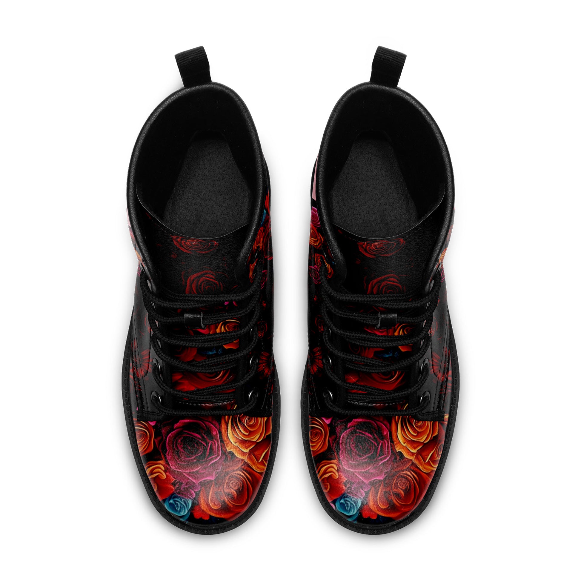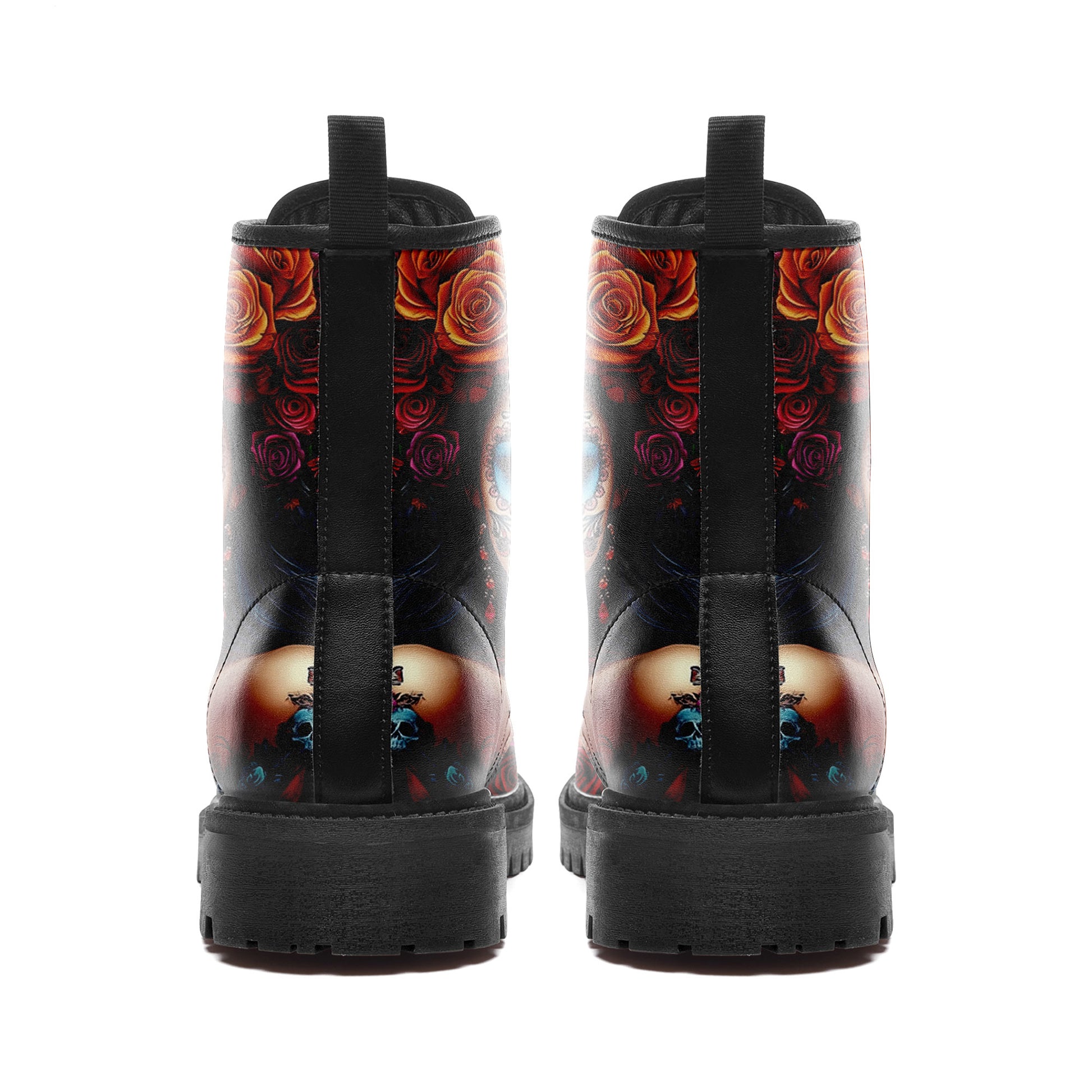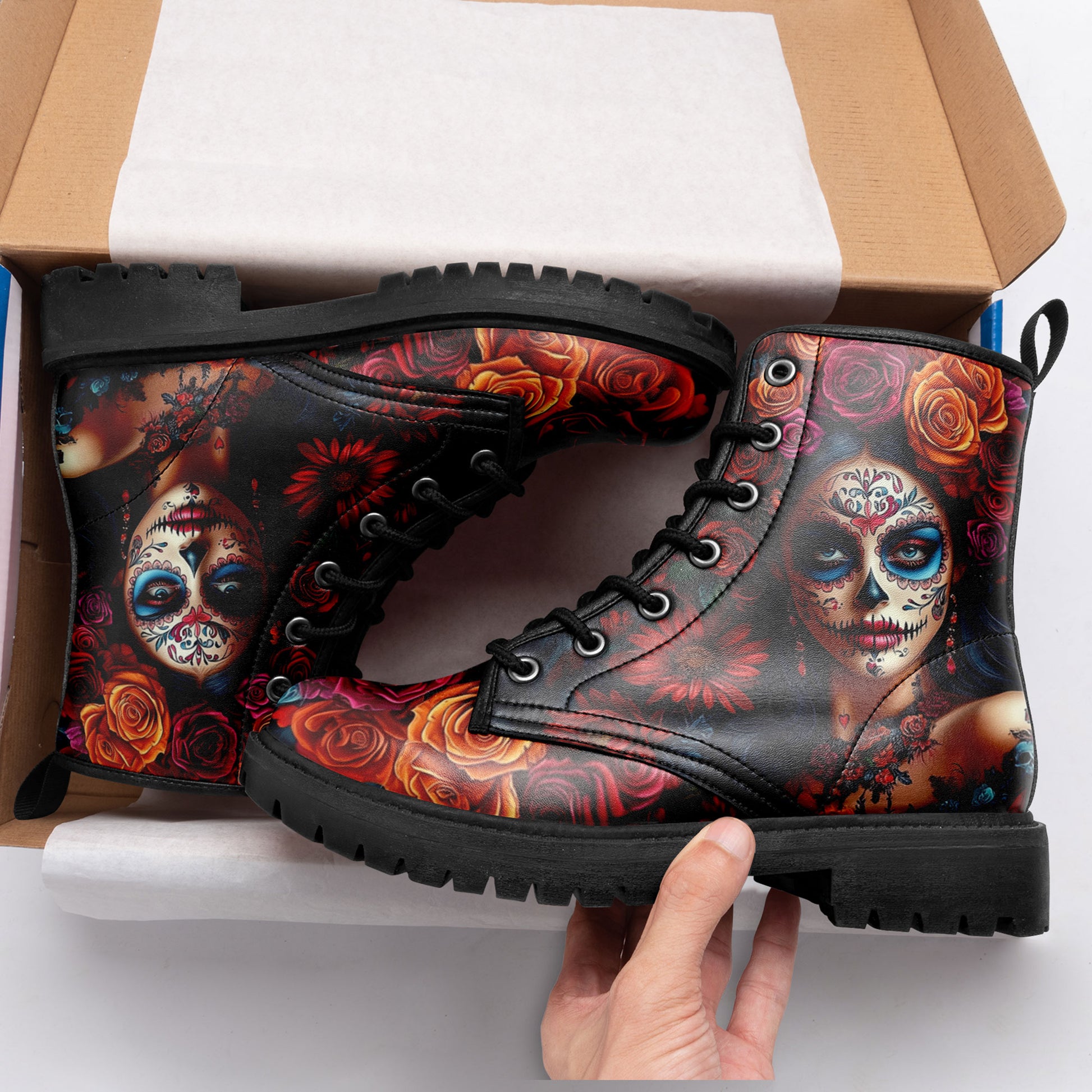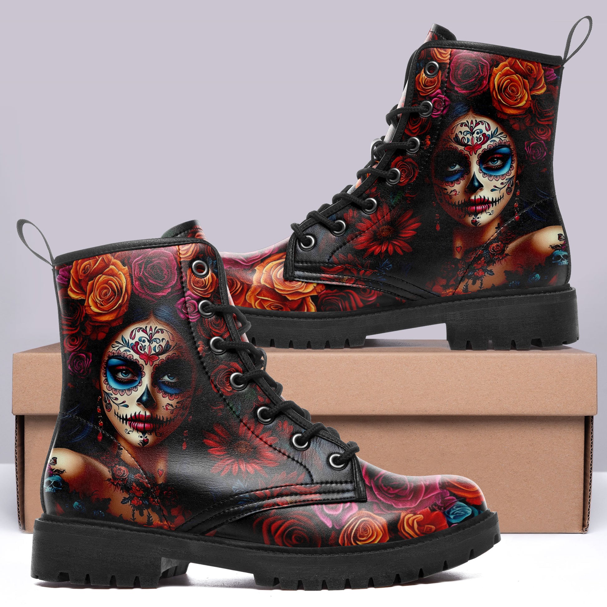 Captivate the room with a look that lasts forever. These stunning combat boots feature a mesmerizing portrait of **La Catrina**, the queen of the Day of the Dead.