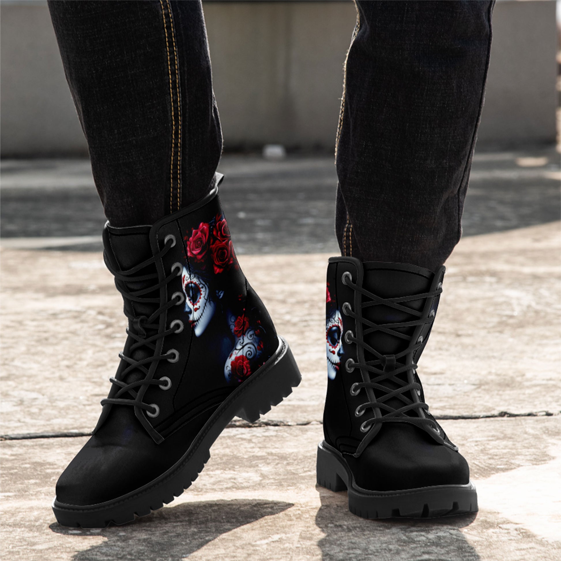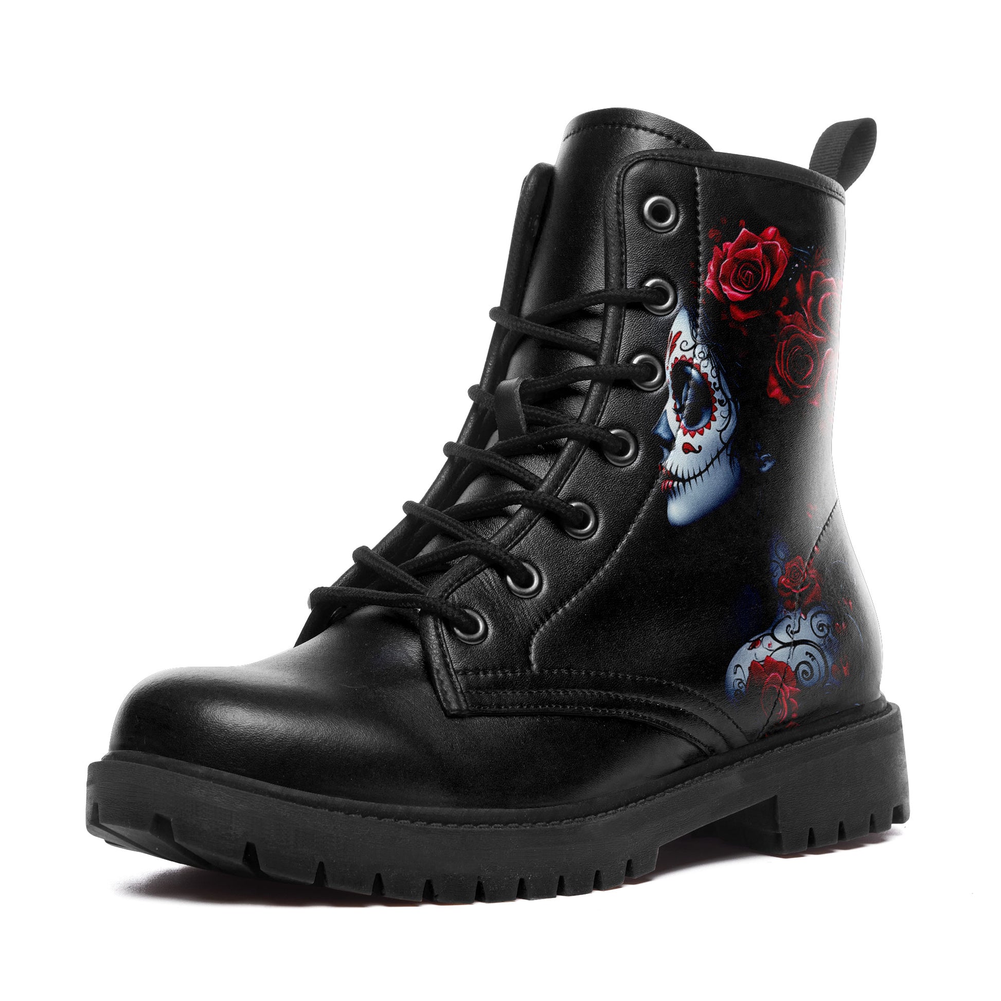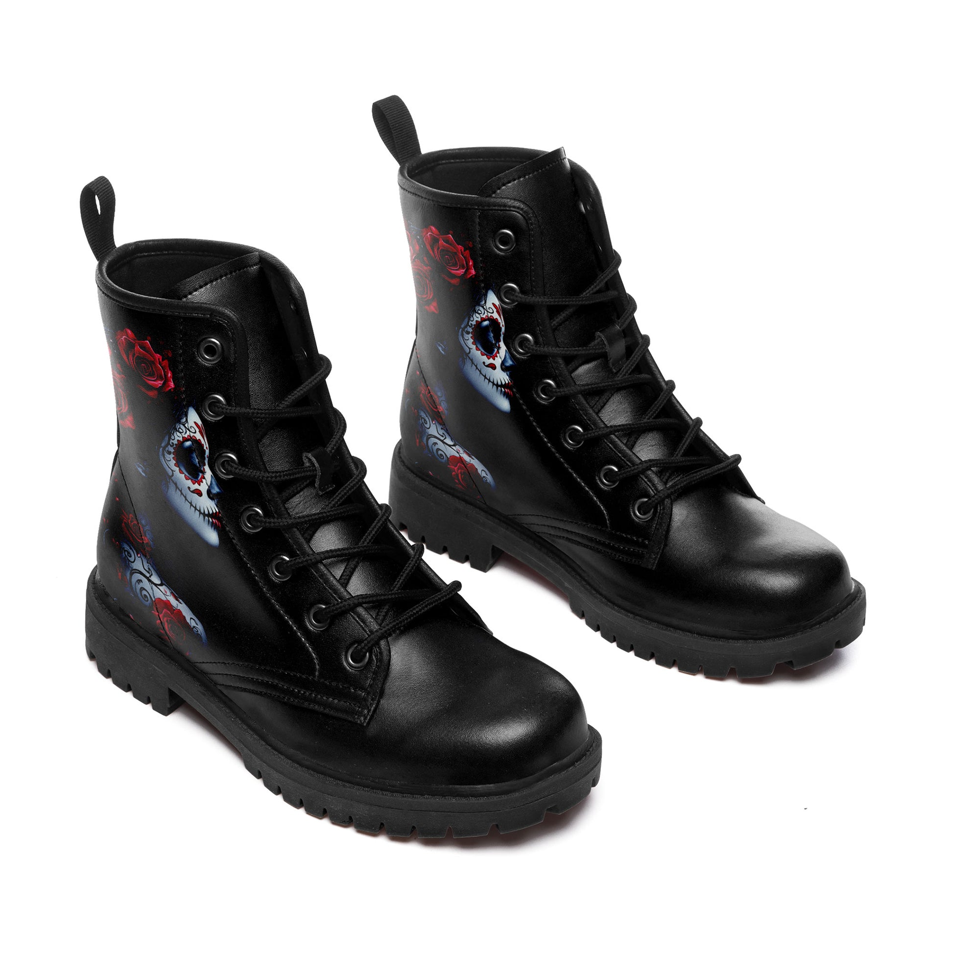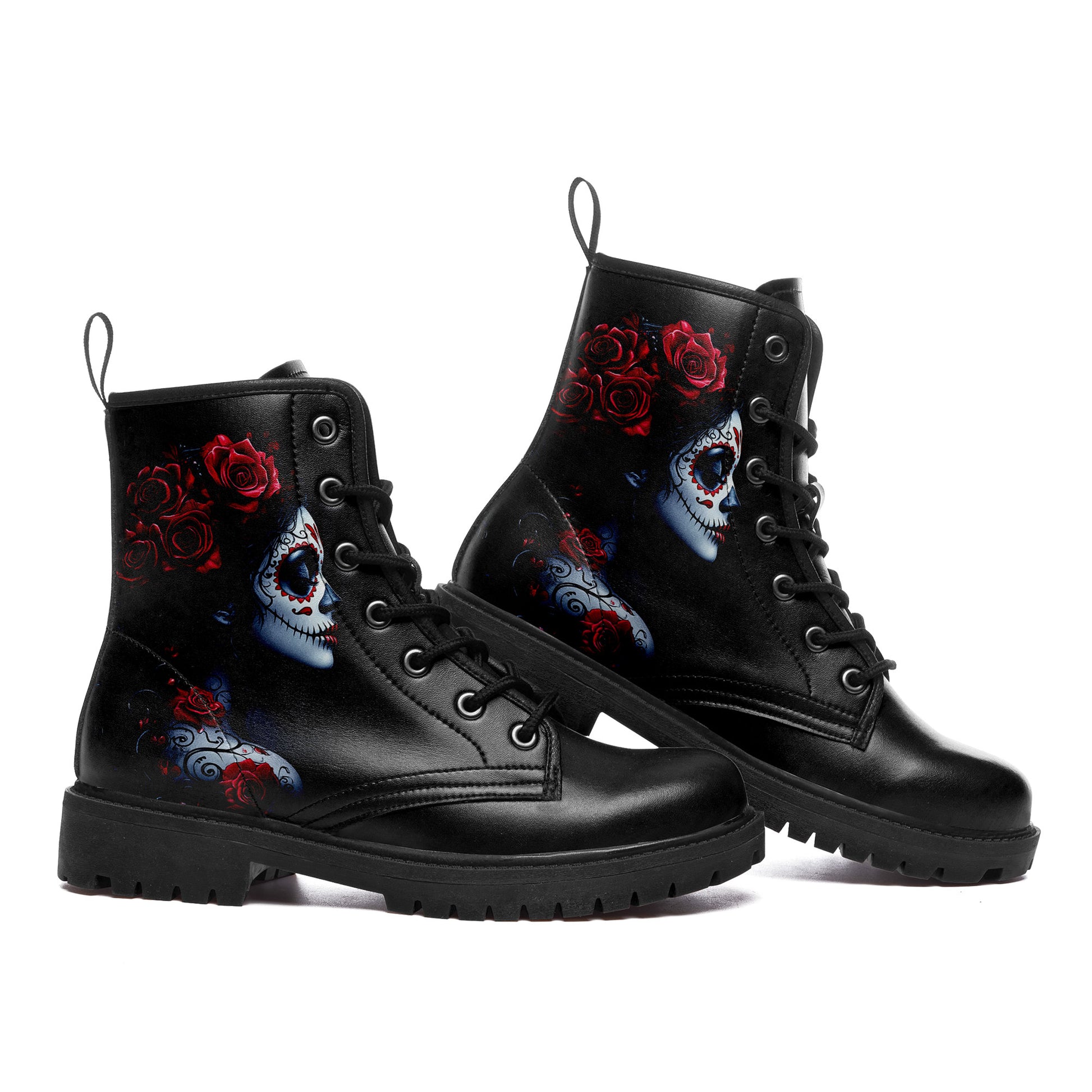 La Catrina Sugar Skull Portrait Combat Boots - Red Rose Tattoo Art Shoes 058-6-25009040-6