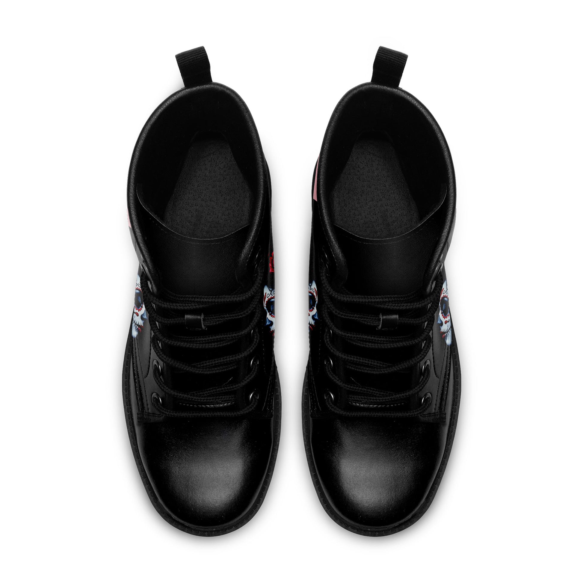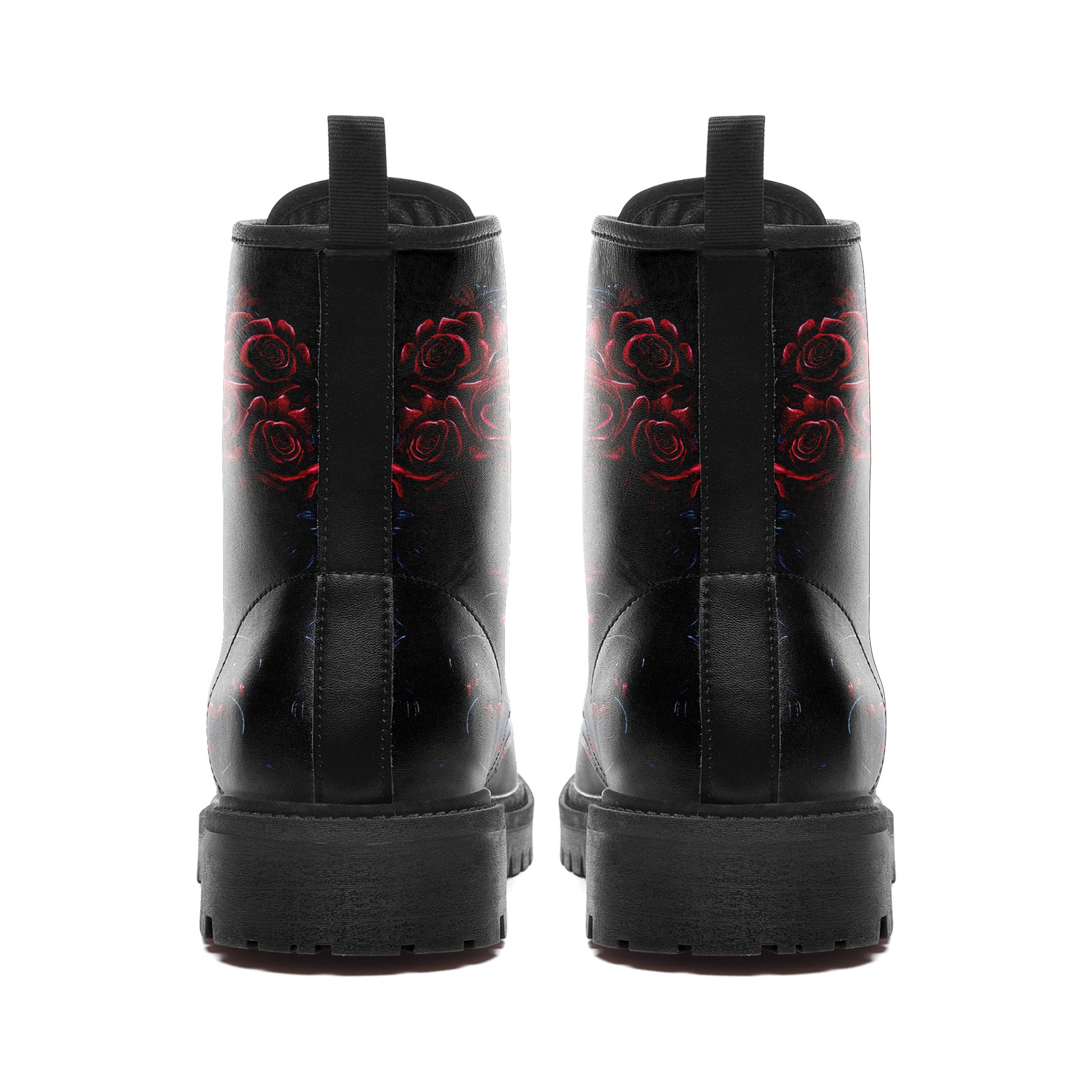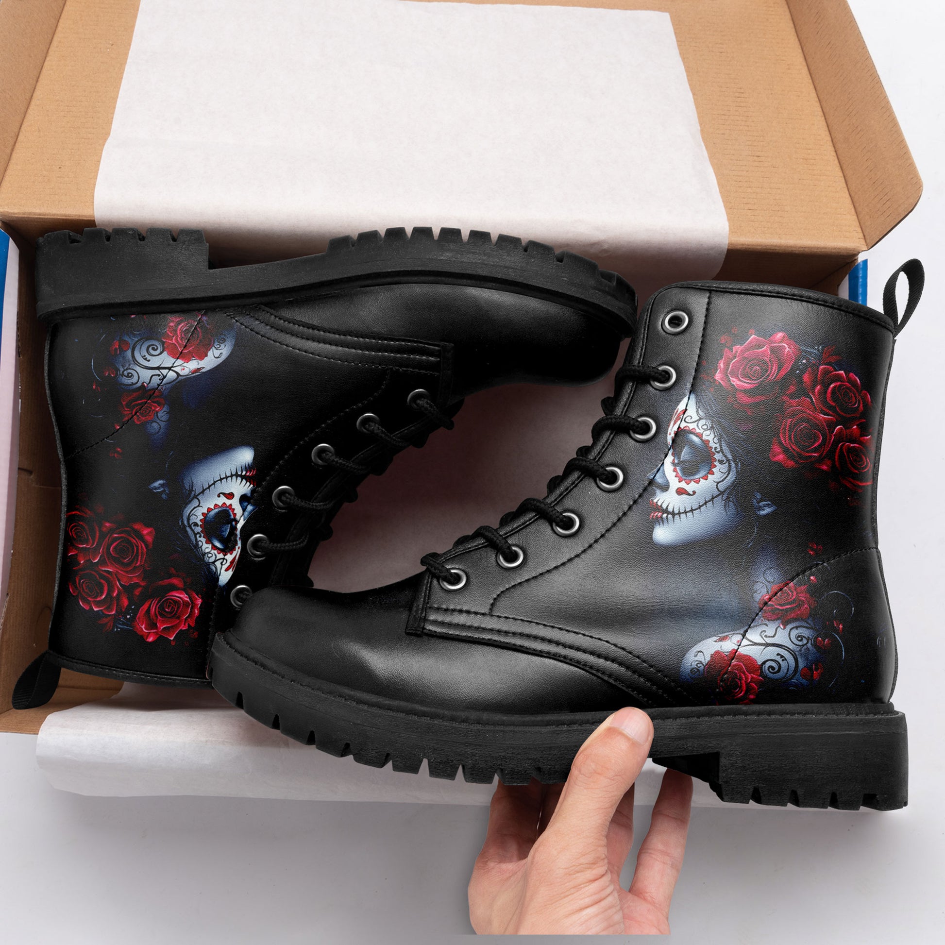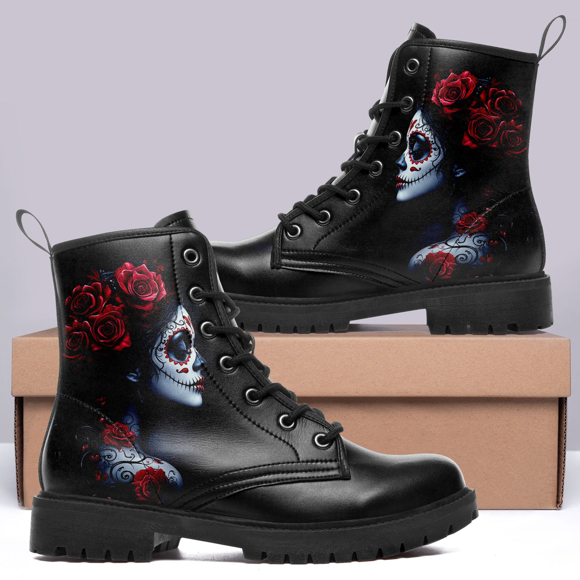 La Catrina Sugar Skull Portrait Combat Boots - Red Rose Tattoo Art Shoes 058-6-25009040-6