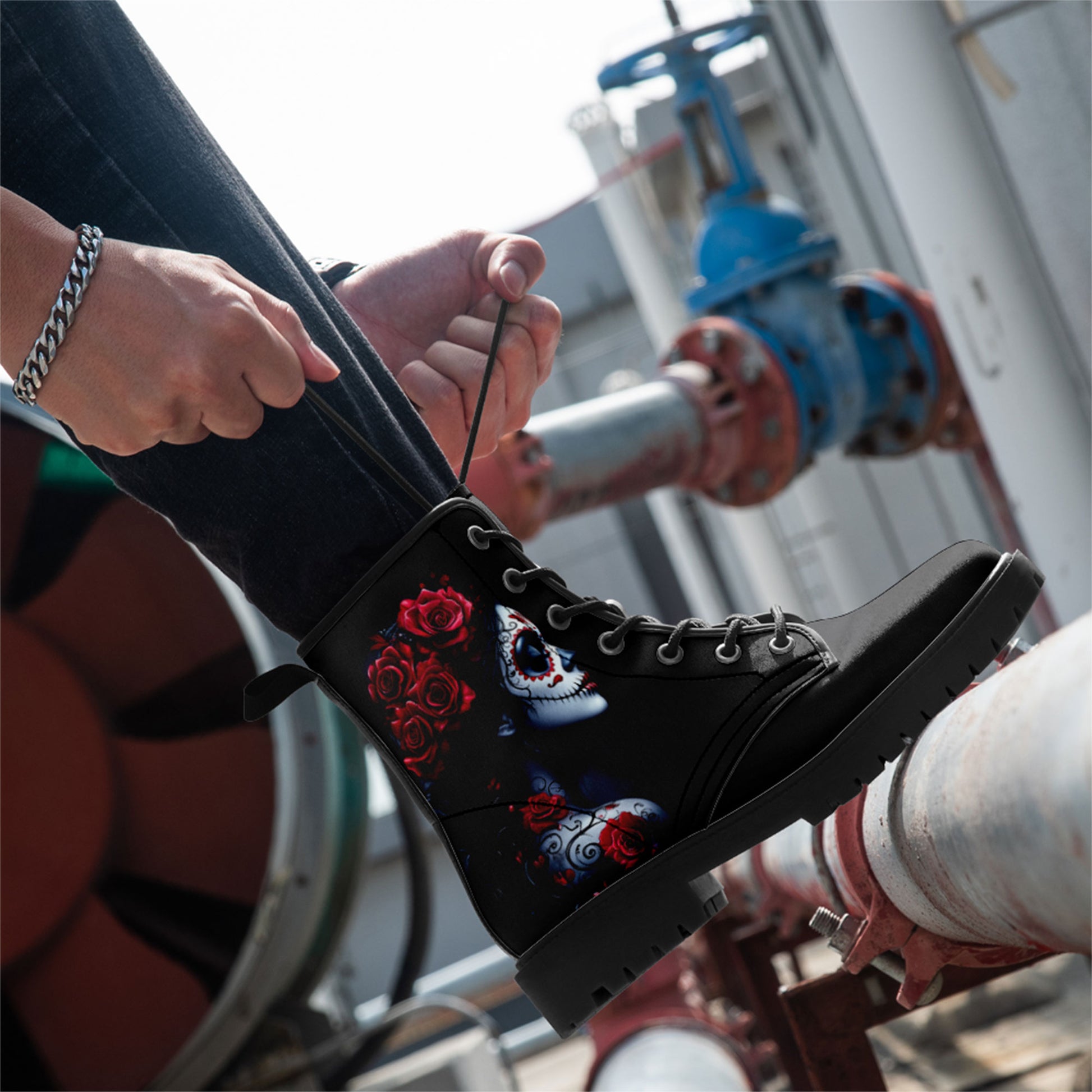 Beauty, mystery, and memory intertwined. These exquisite combat boots feature a breathtaking portrait of **La Catrina**, the icon of the Day of the Dead.