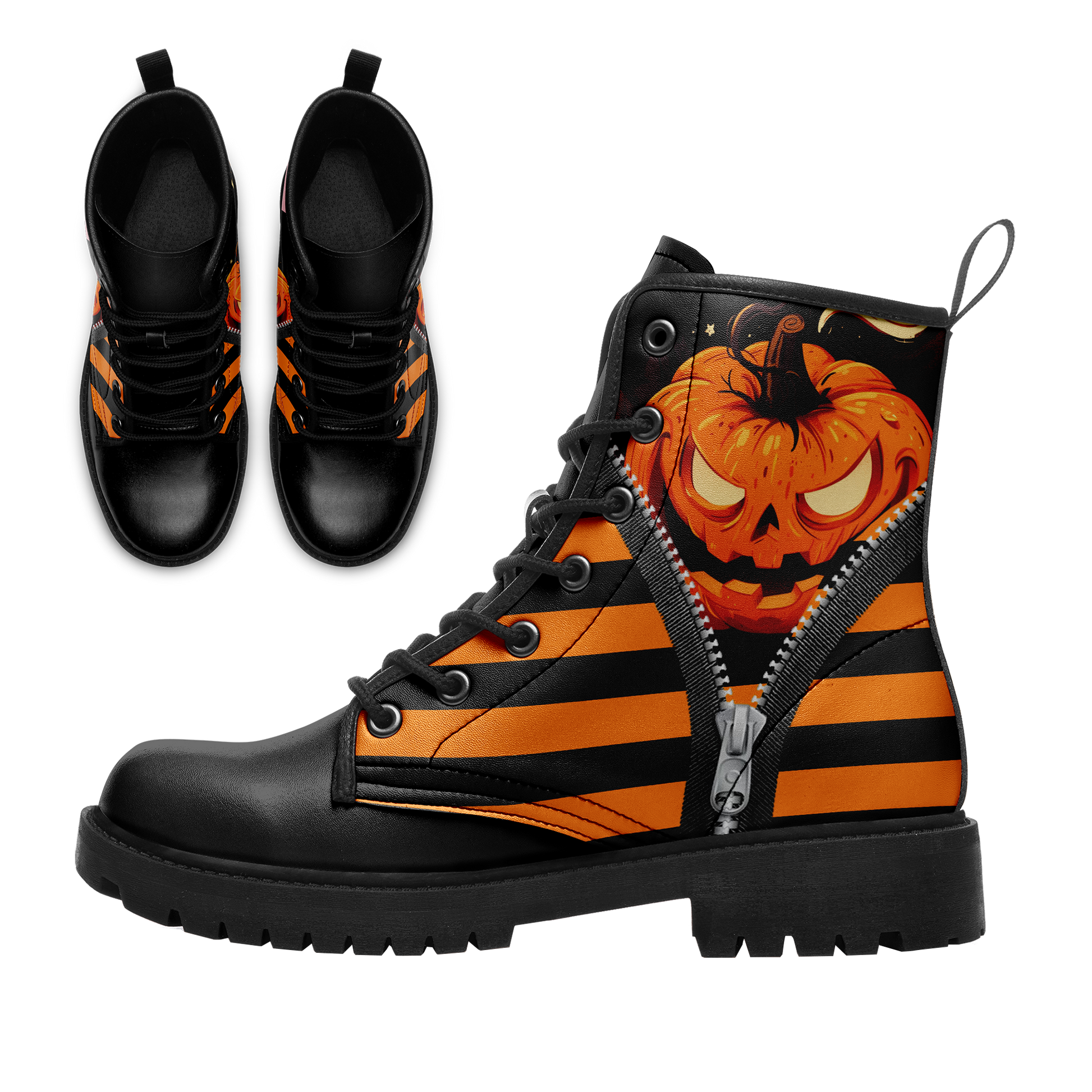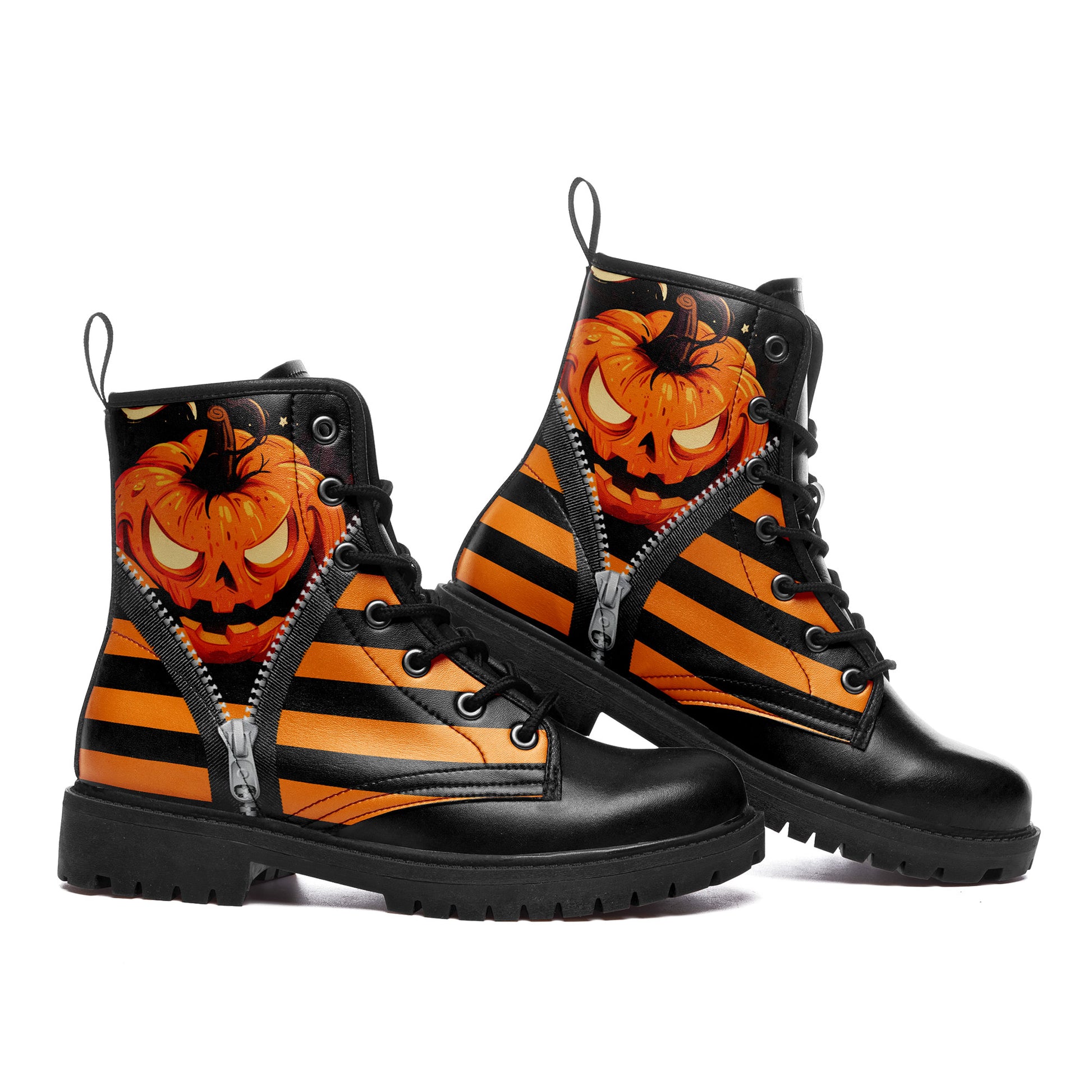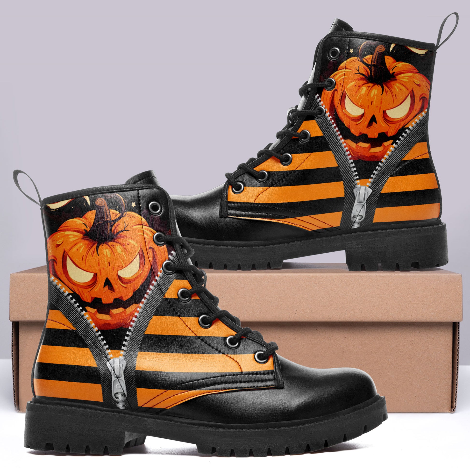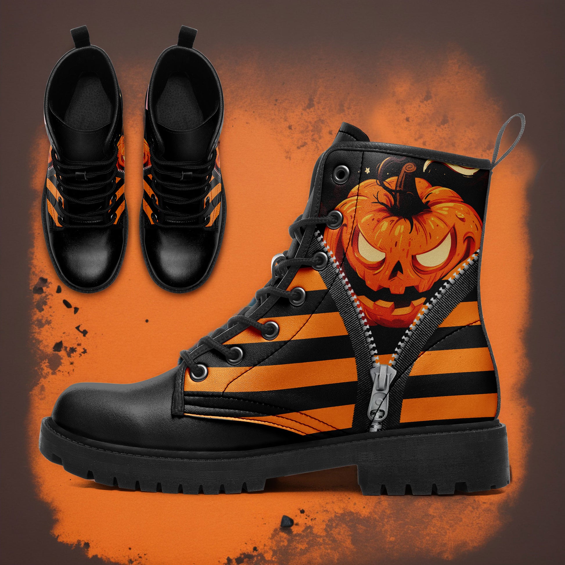 Unleash your inner spirit of Halloween every day of the year! These **Spooky Pumpkin Zipper Illusion Combat Boots** are the ultimate statement piece for those who live for the eerie and the extraordinary.