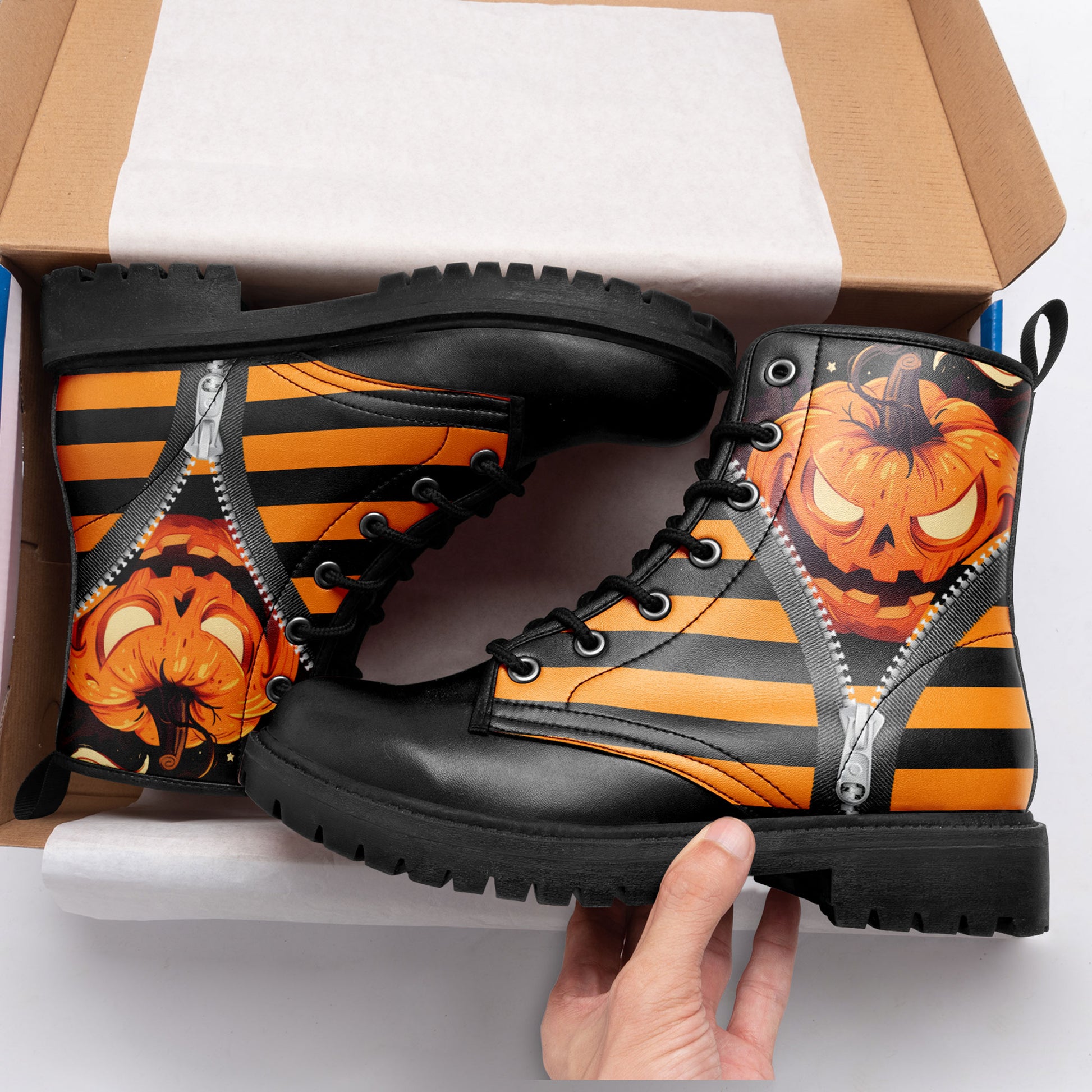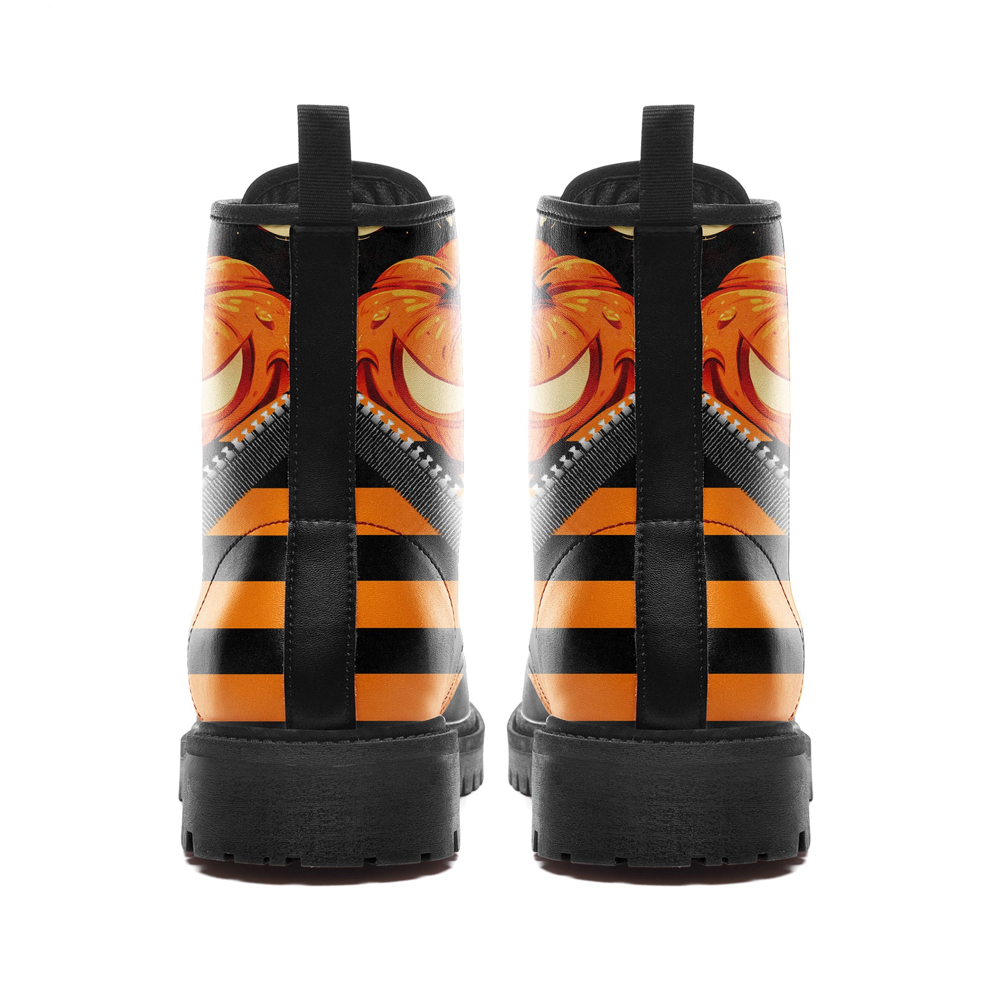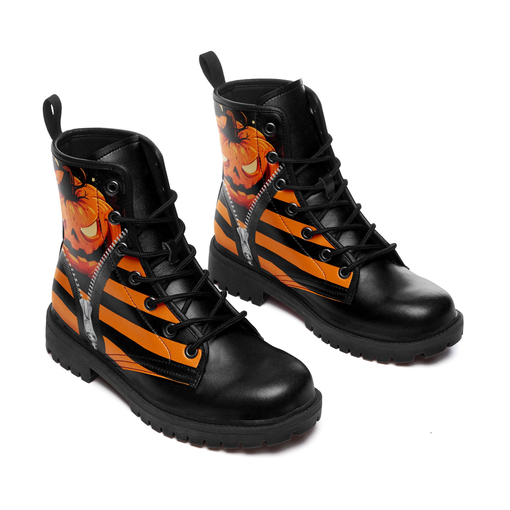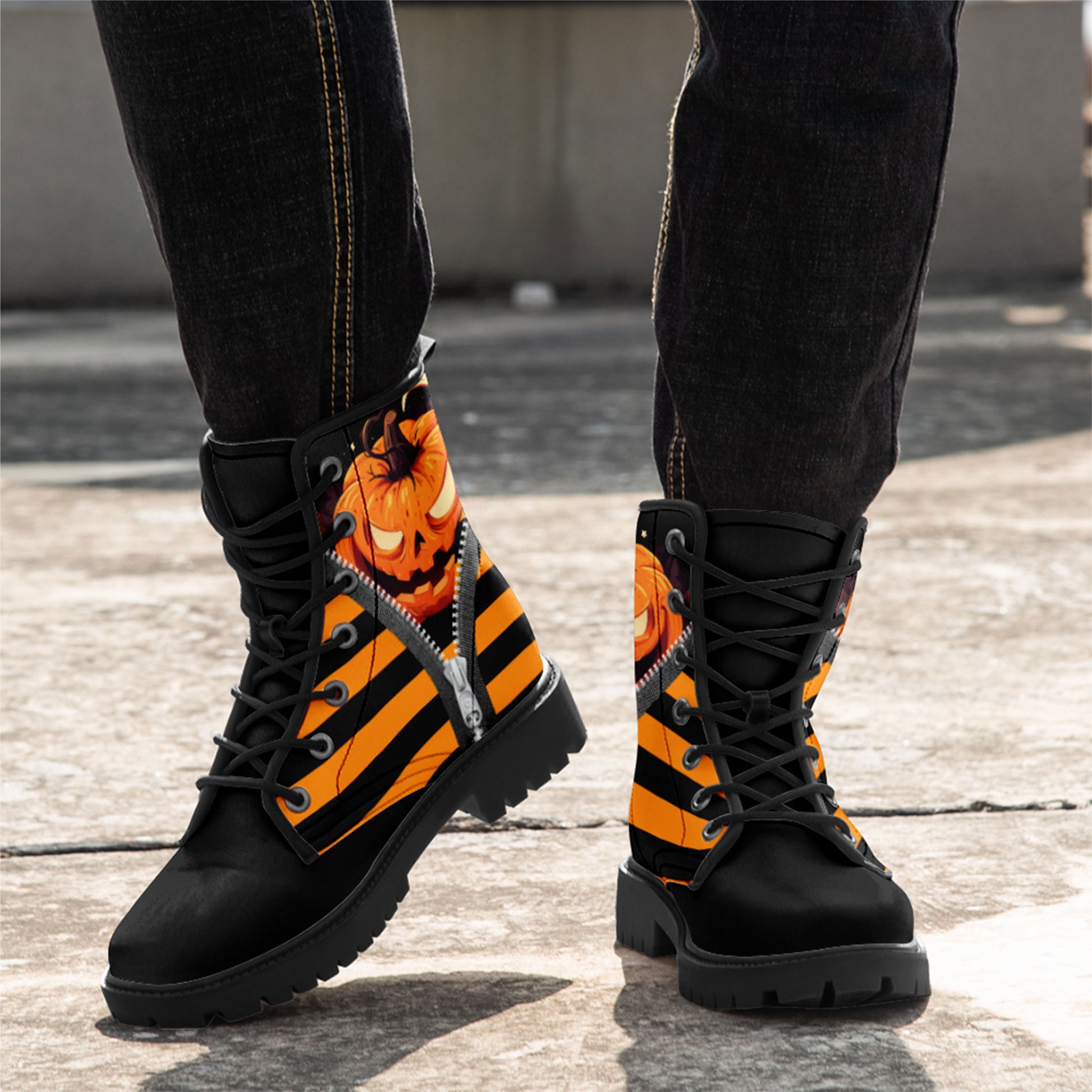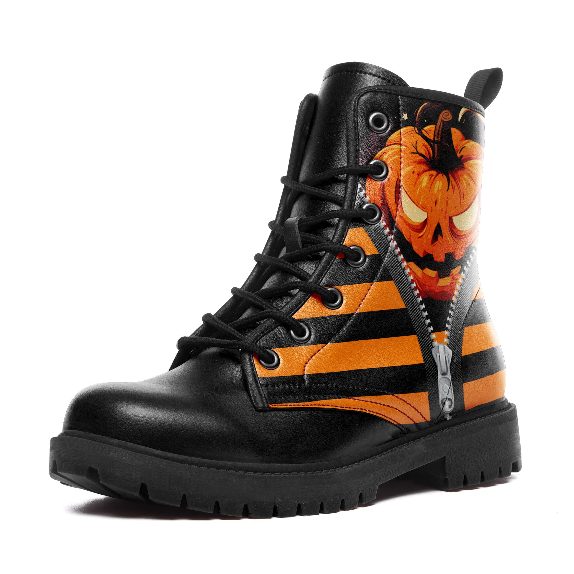 Unleash your inner spirit of Halloween every day of the year! These **Spooky Pumpkin Zipper Illusion Combat Boots** are the ultimate statement piece for those who live for the eerie and the extraordinary.