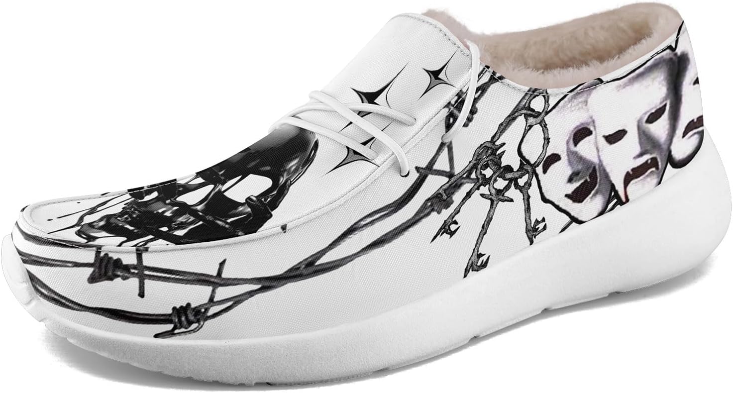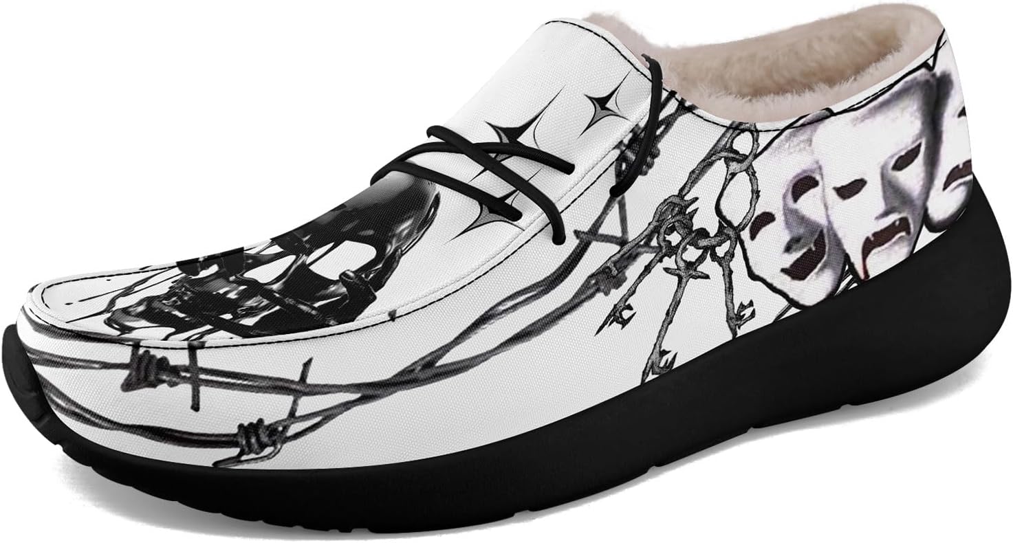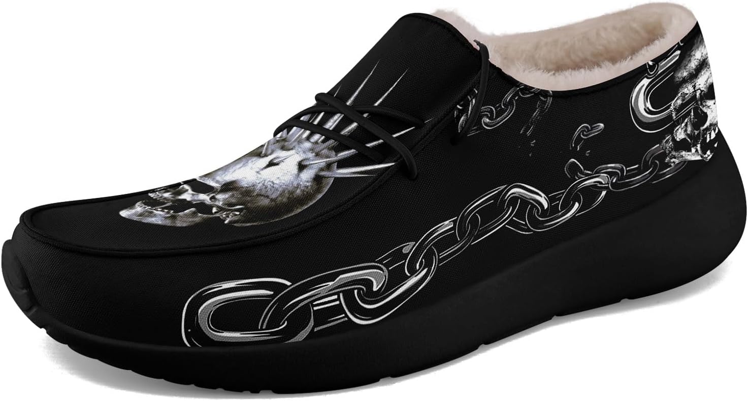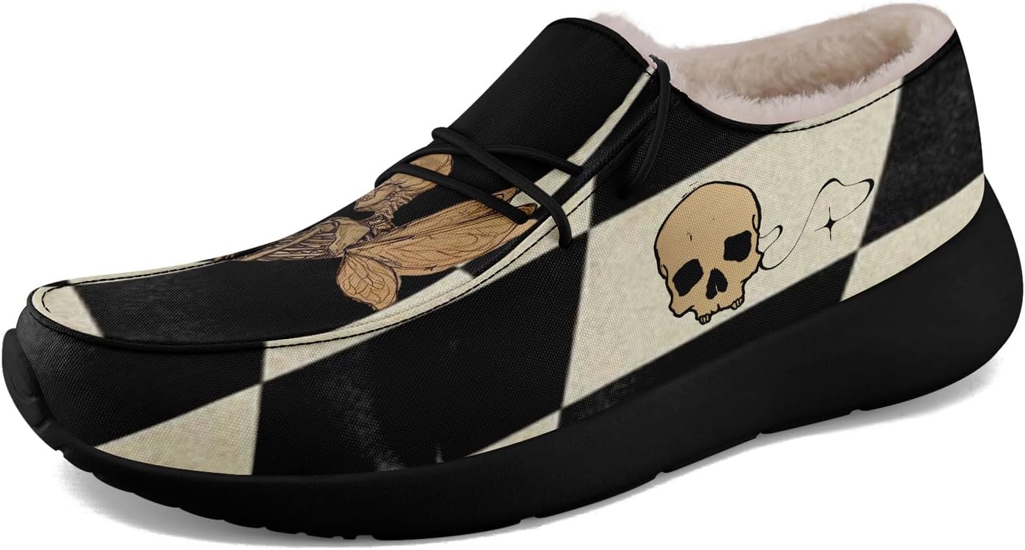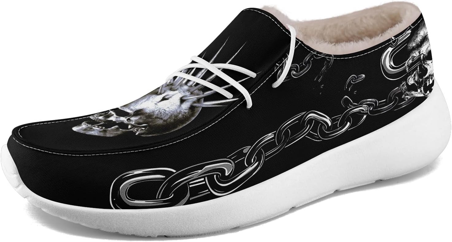Men's Gothic Casual Loafers, Skull Canvas Fur Lined Slip On Shoes Moccasins Confortable Lace Up Warm Winter Shoes for Women