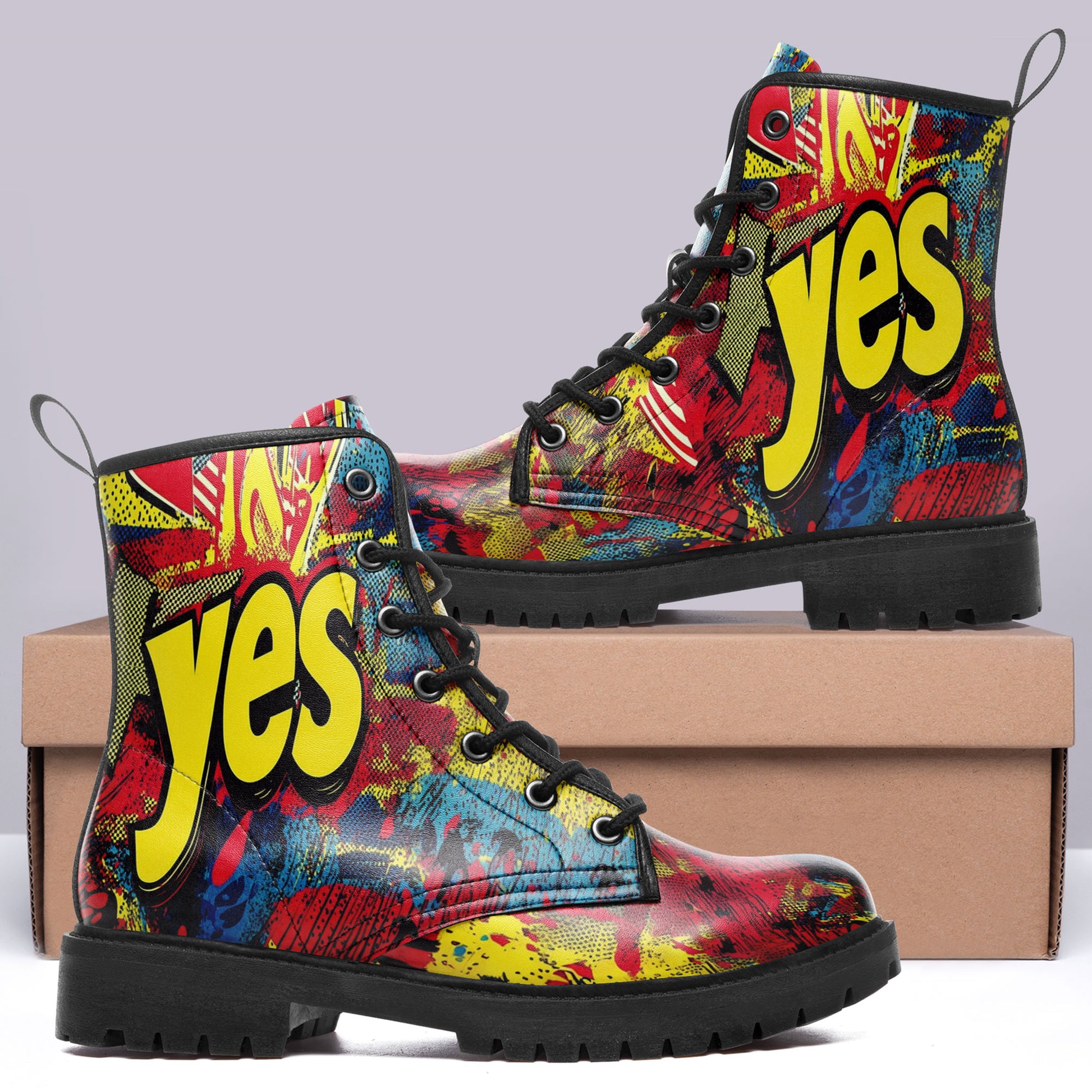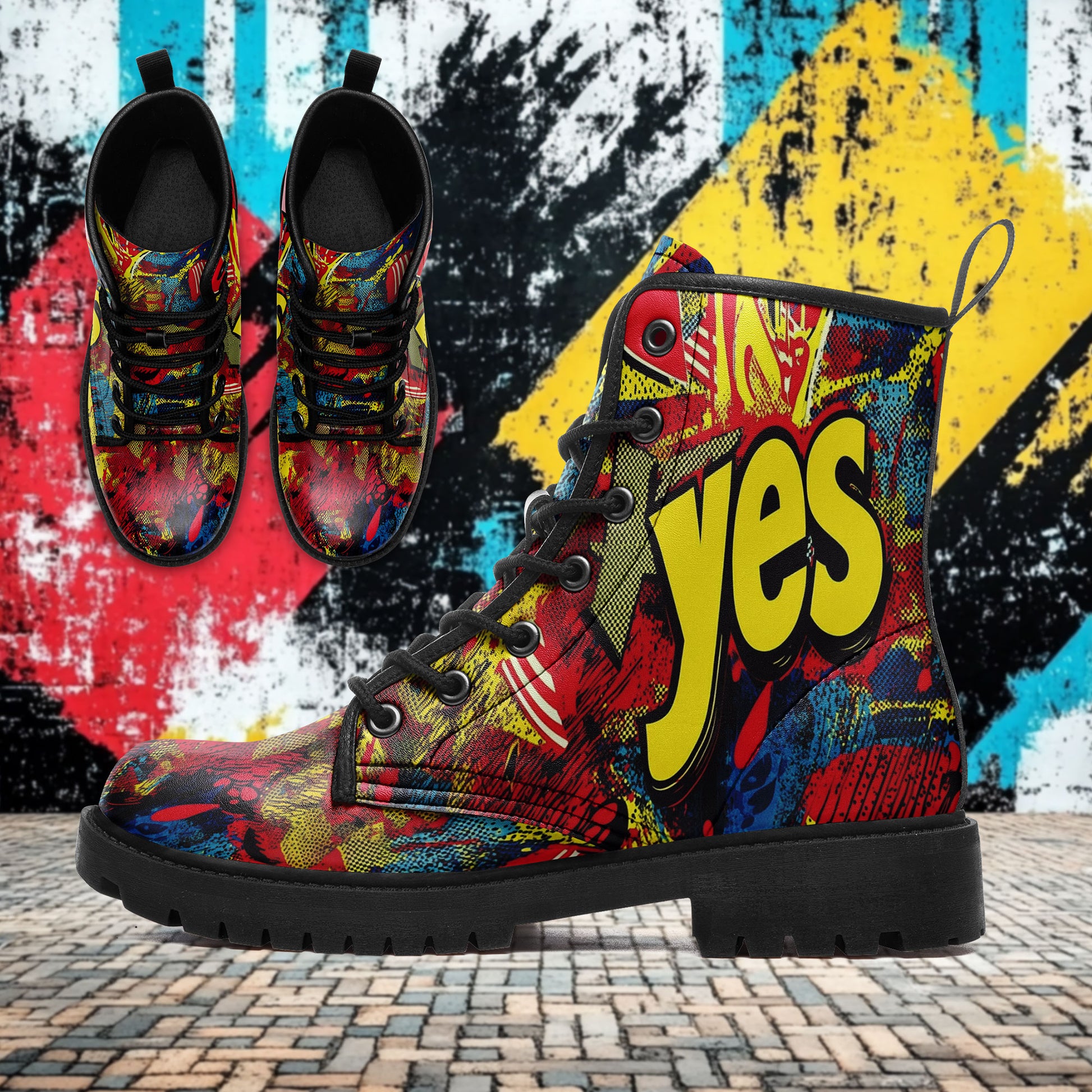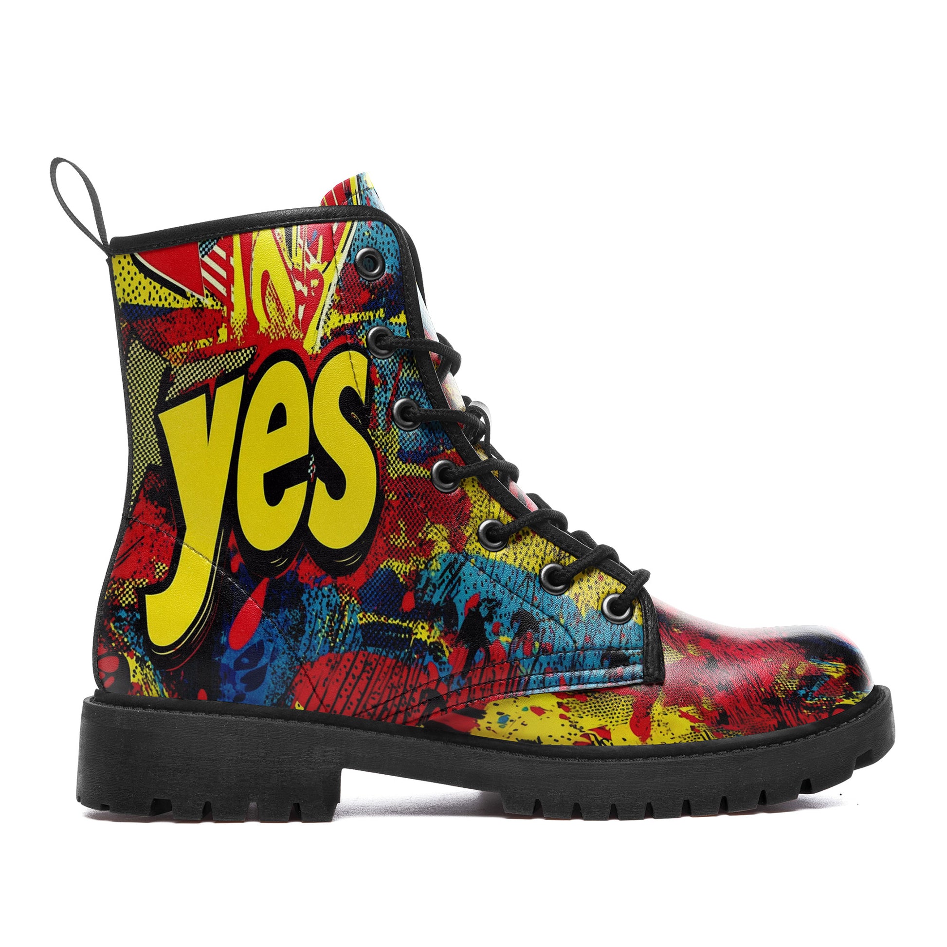 Make a statement without saying a word. These combat boots are a vibrant explosion of **retro comic book style**, featuring a bold **"YES"** graphic that leaps off the leather.