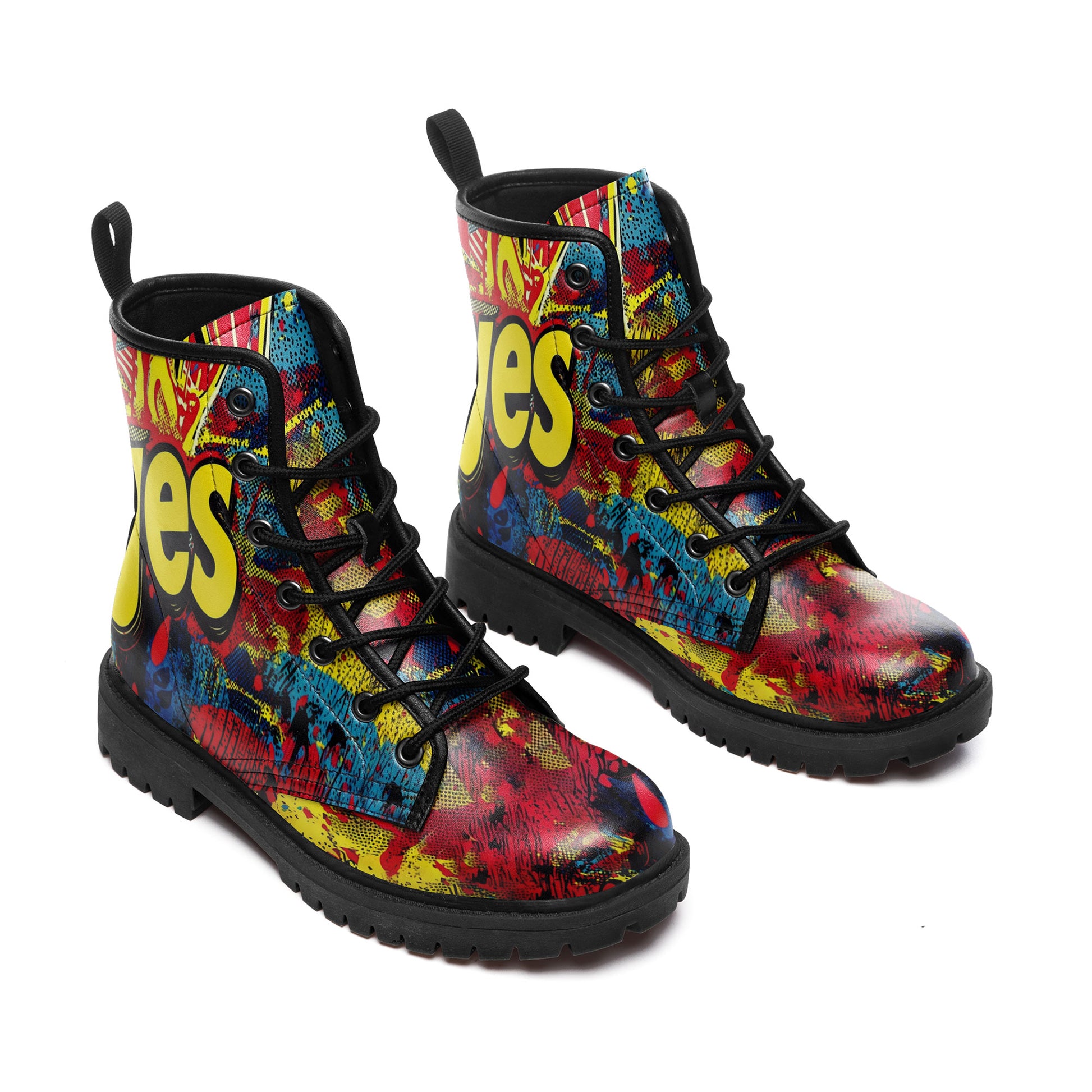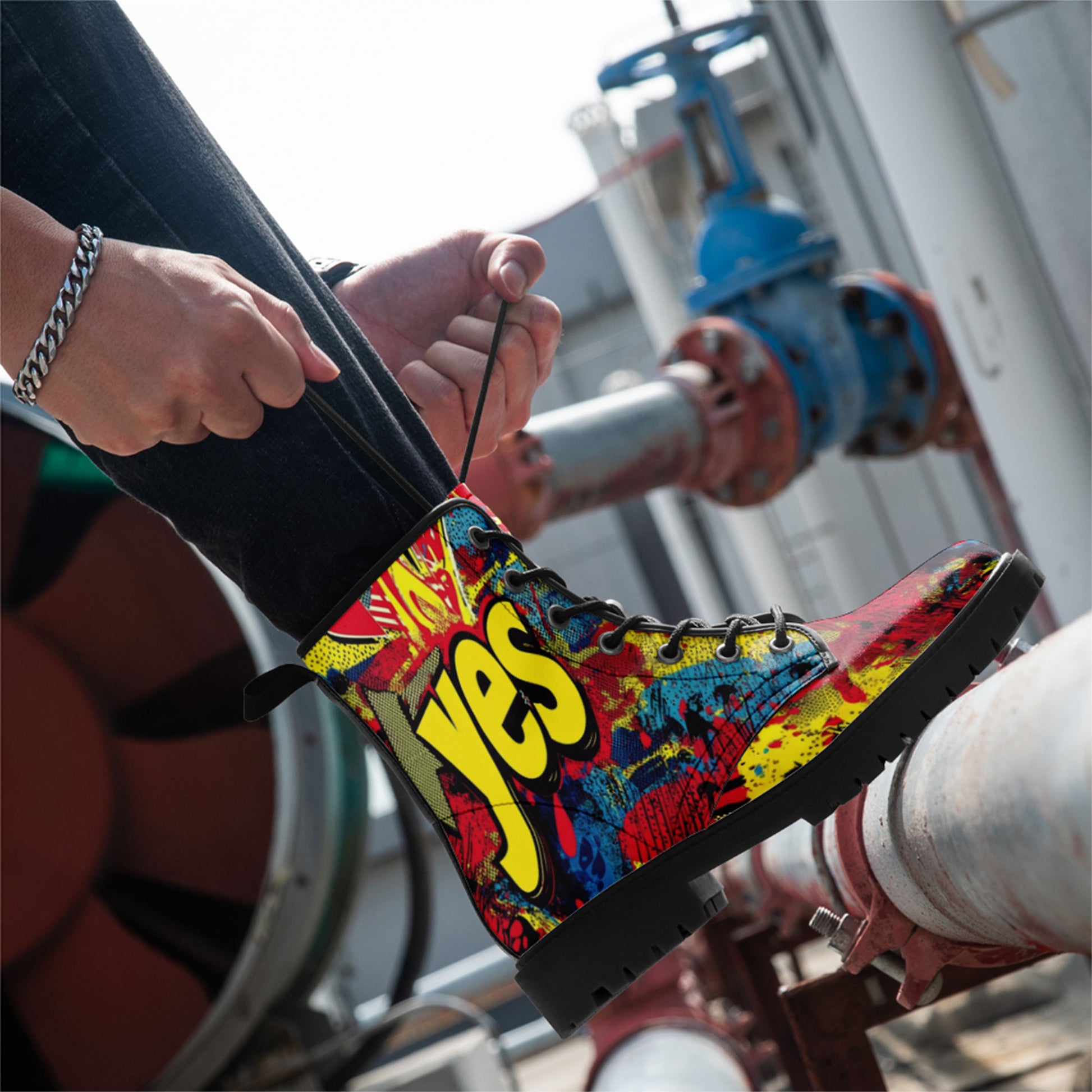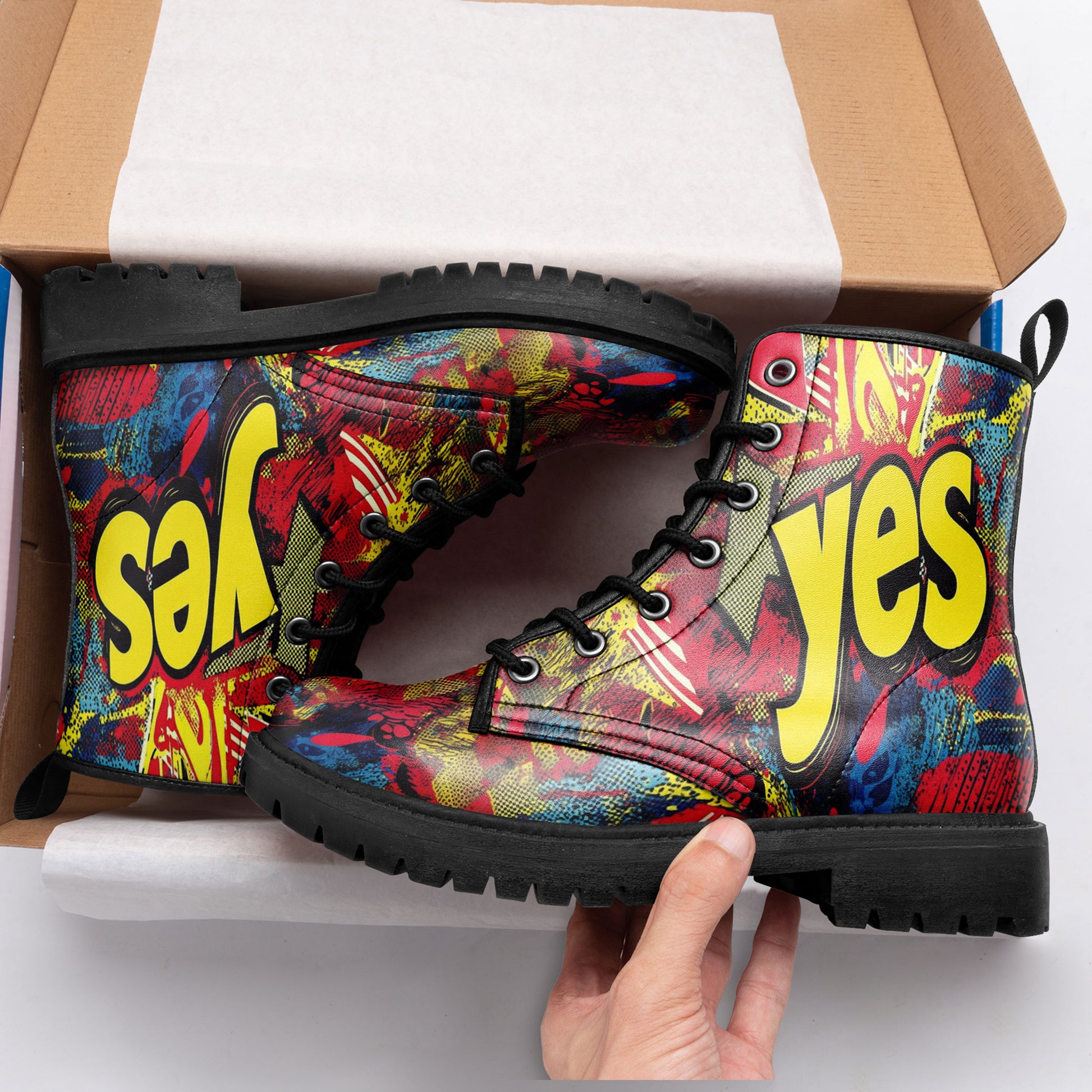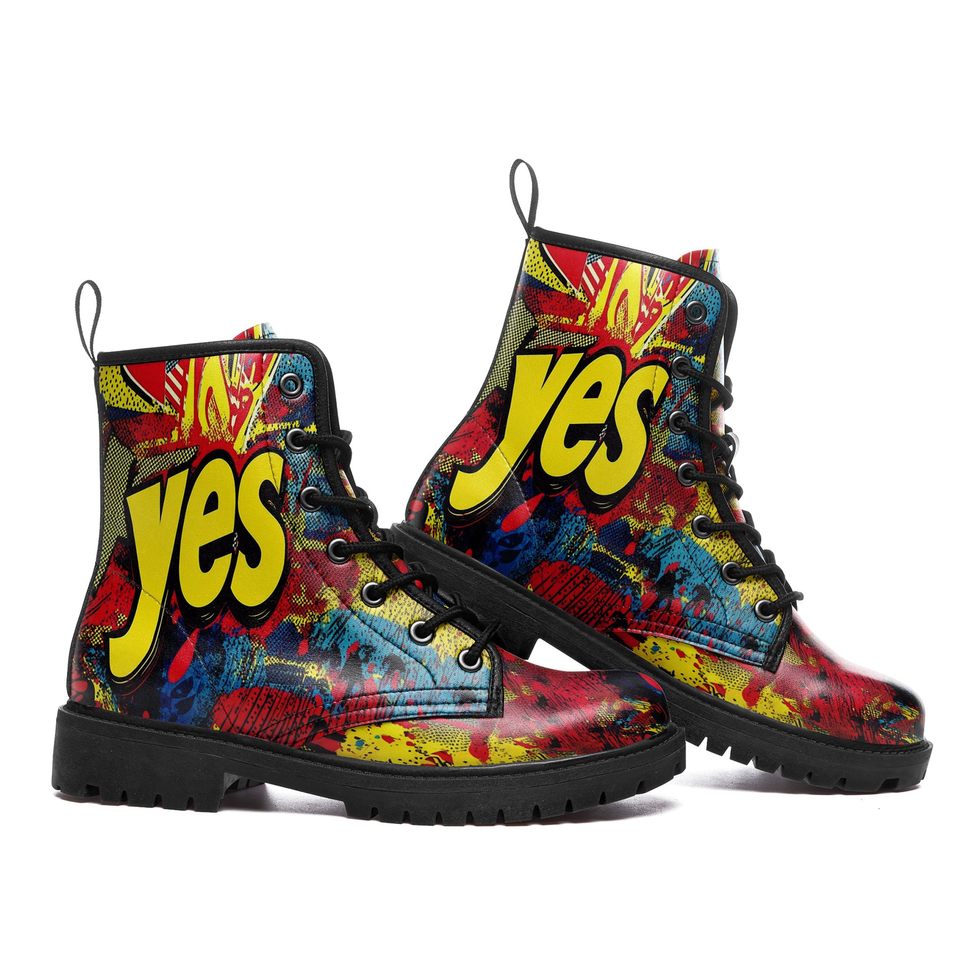 Make a statement without saying a word. These combat boots are a vibrant explosion of **retro comic book style**, featuring a bold **"YES"** graphic that leaps off the leather.