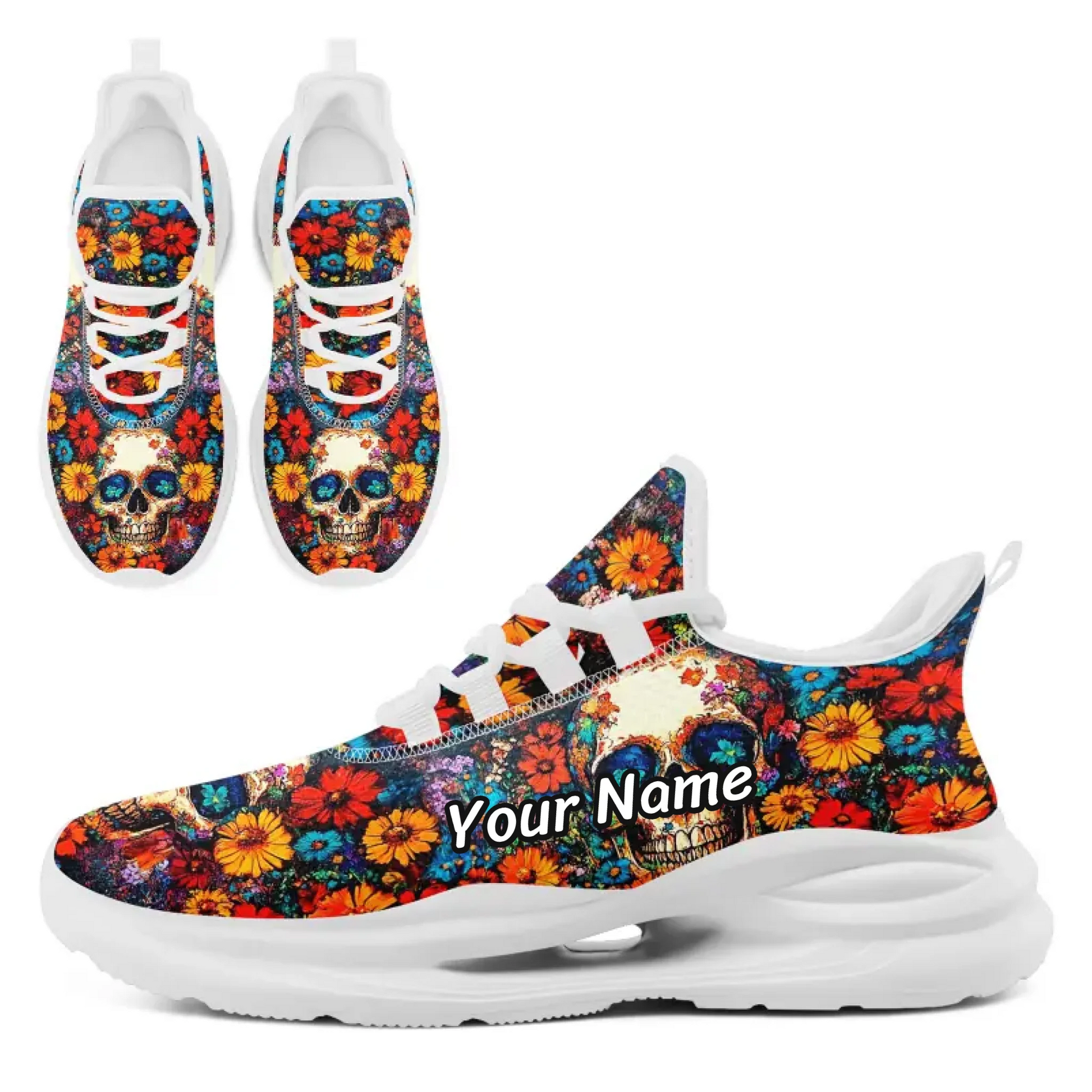 Psychedelic Floral Skull Athletic Sneakers, Vibrant Trippy Gothic Style Festival Trainers FN079-25020185