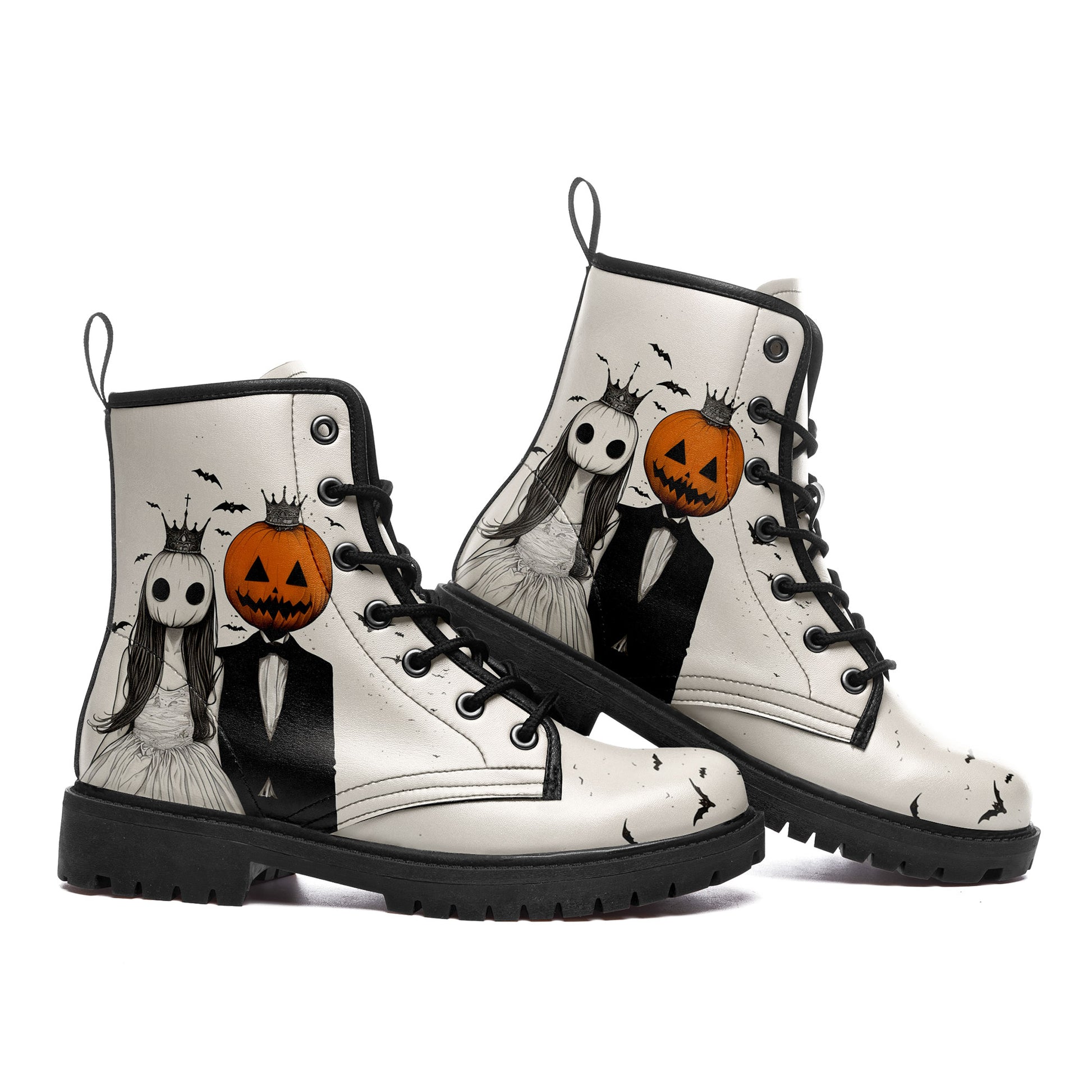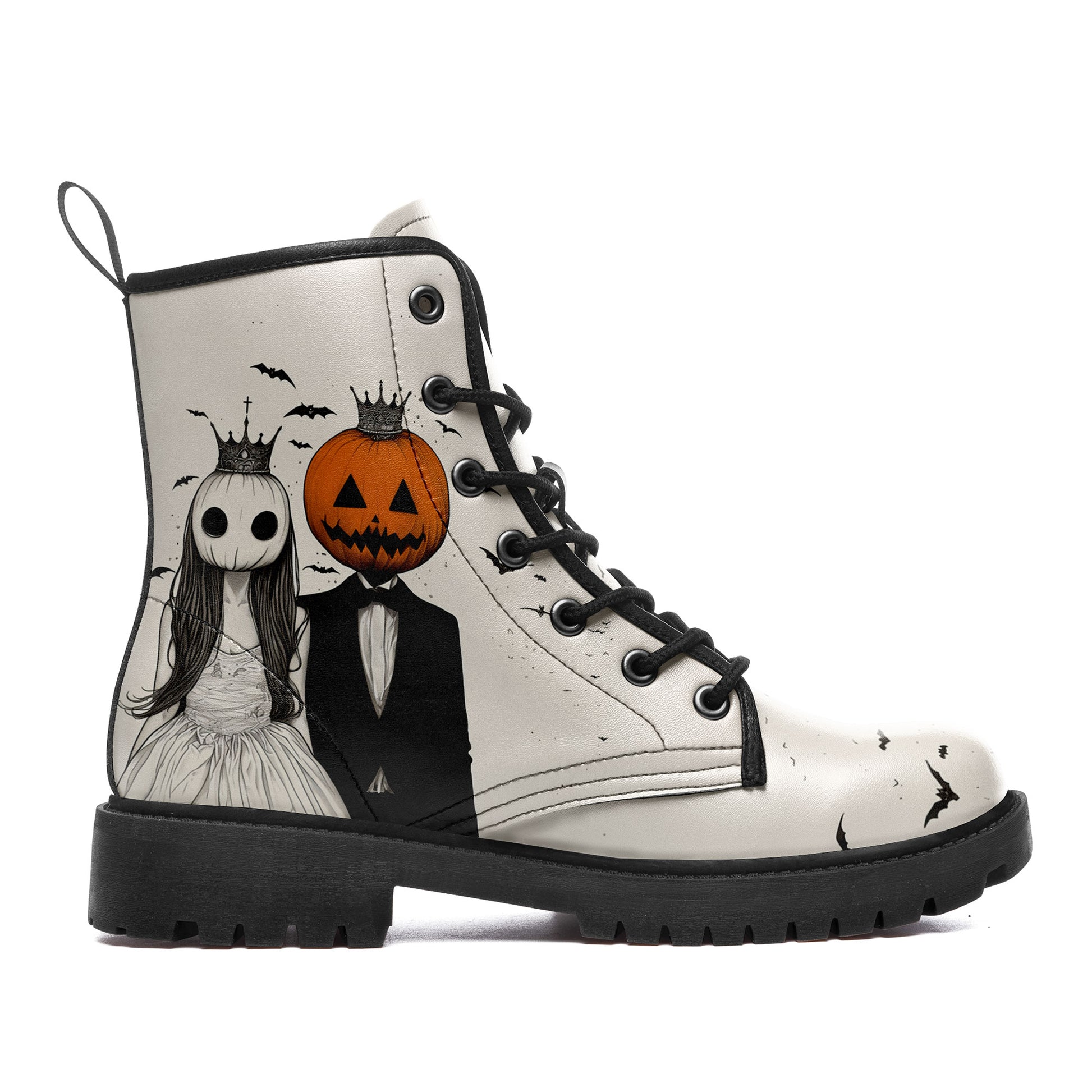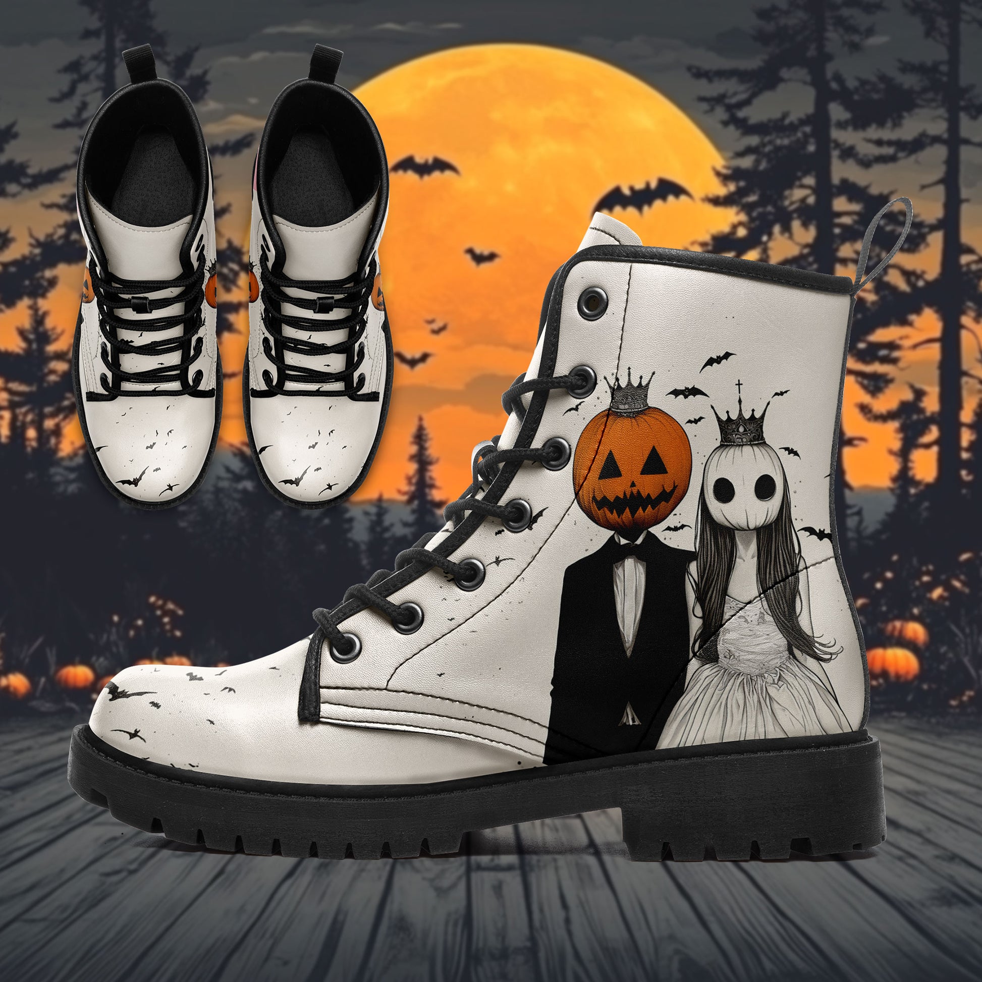 Hail to the King and Queen of the Pumpkin Patch! These enchanting white combat boots tell a story of romance from beyond the grave. Featuring a dapper **Jack-o'-lantern groom** and his ethereal **ghost bride**, this design is a match made in Halloween heaven.