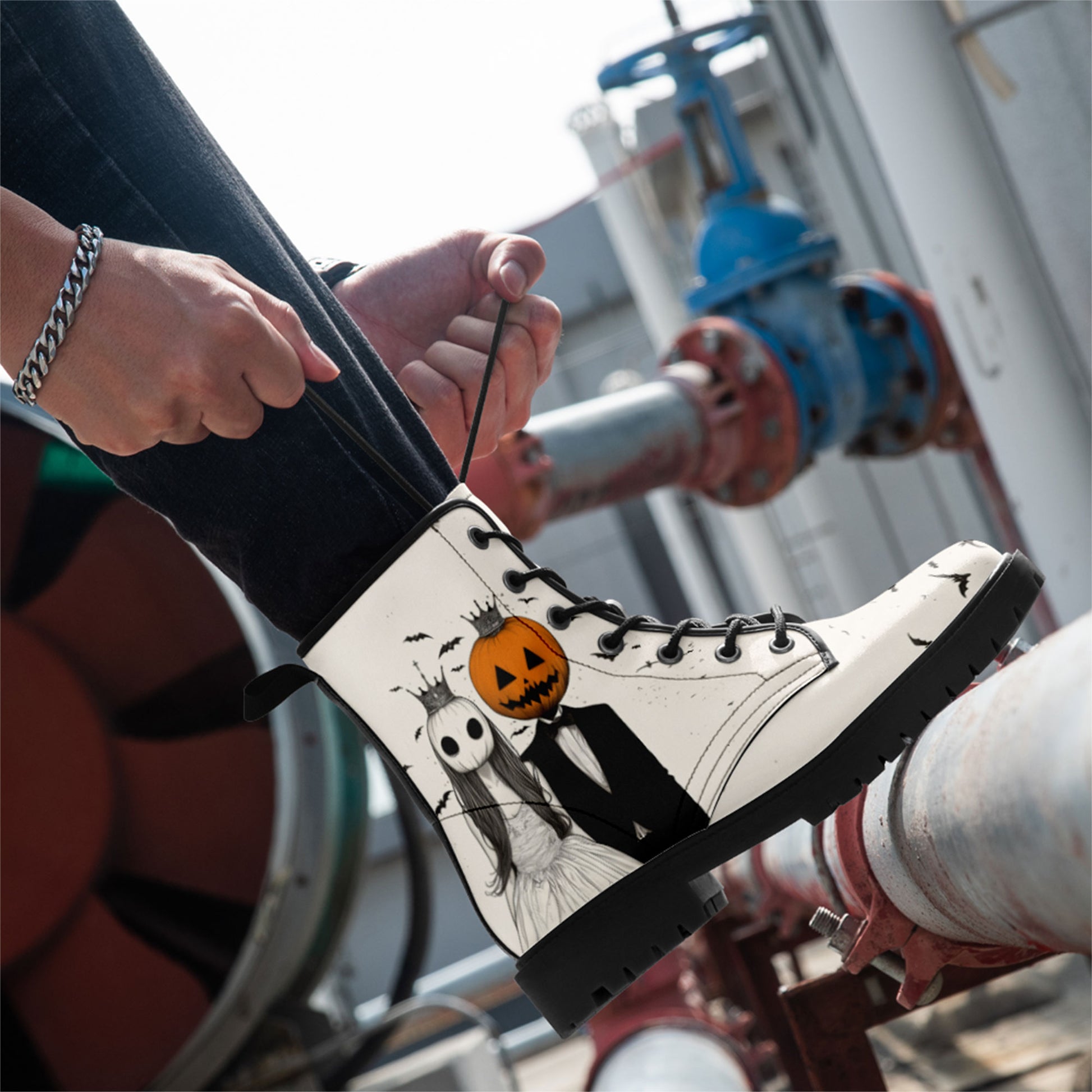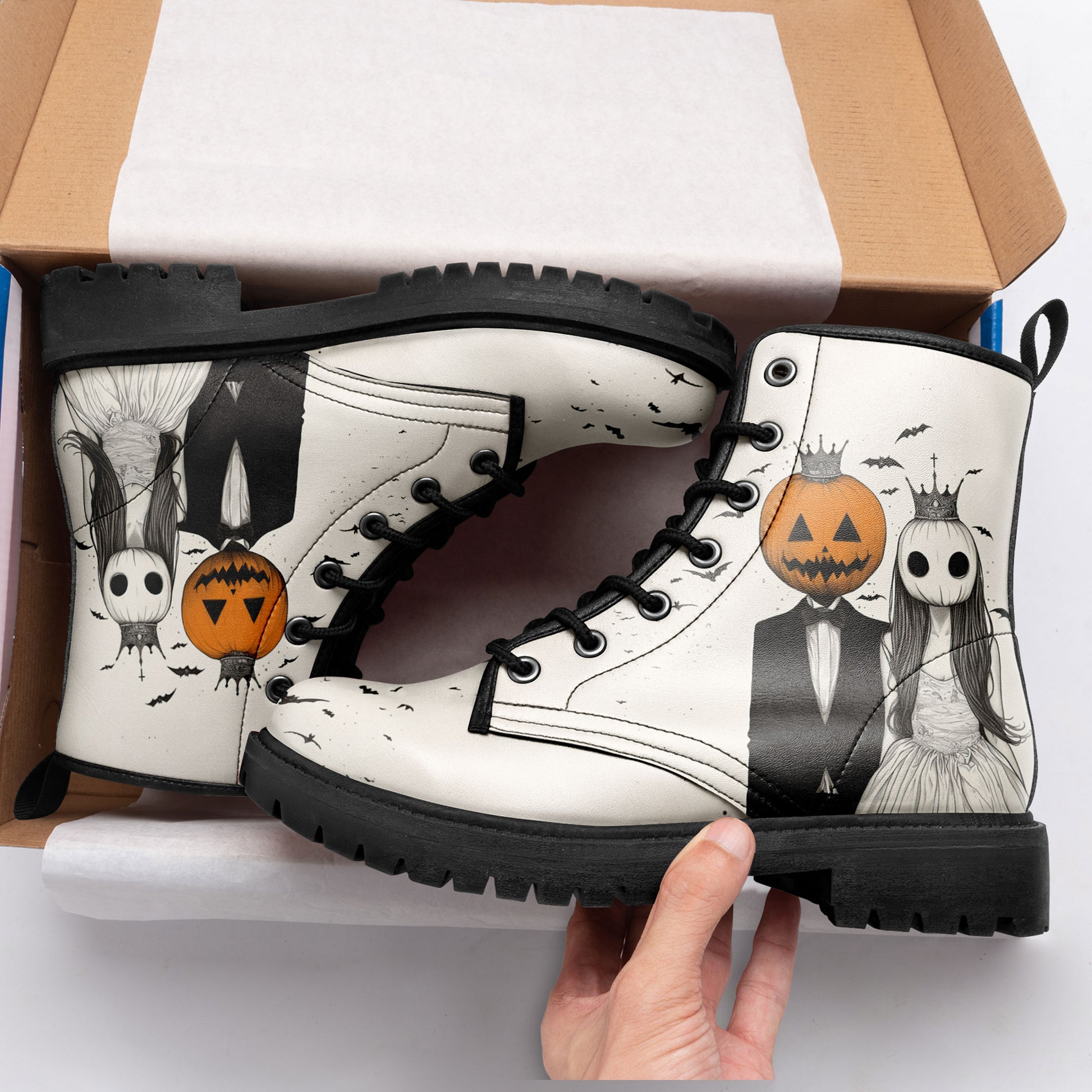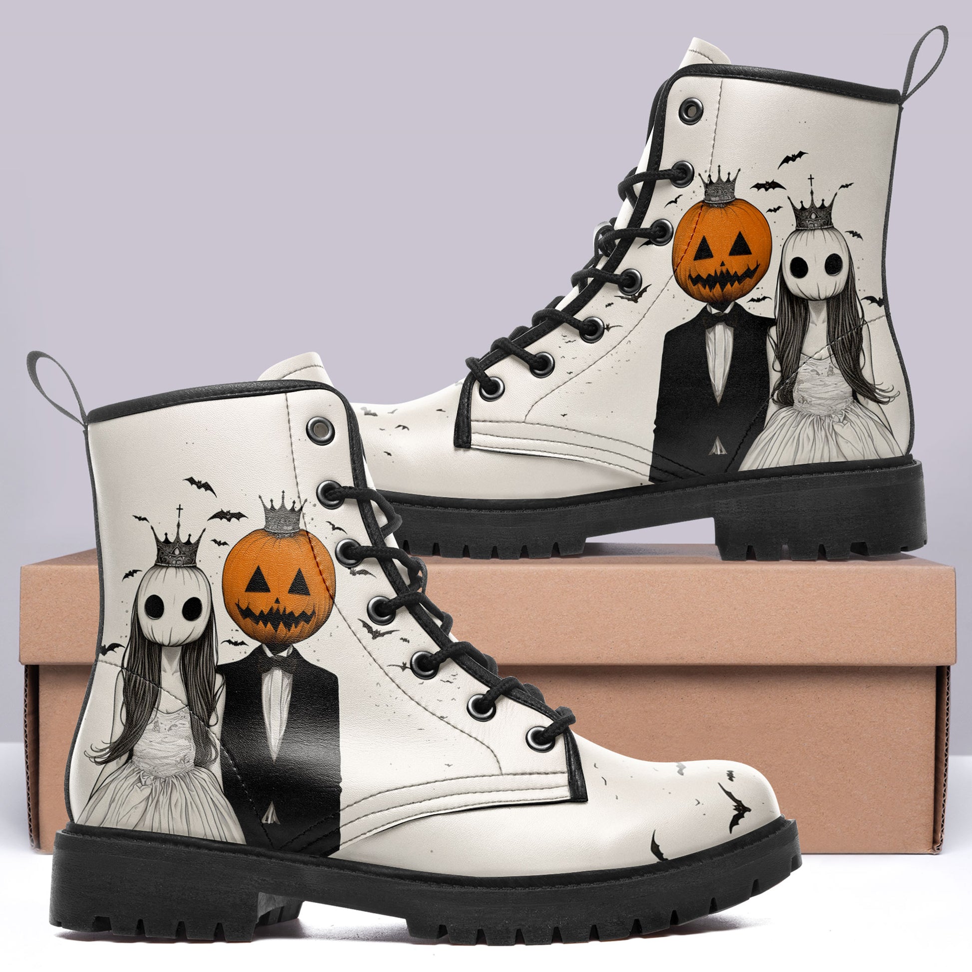 Hail to the King and Queen of the Pumpkin Patch! These enchanting white combat boots tell a story of romance from beyond the grave. Featuring a dapper **Jack-o'-lantern groom** and his ethereal **ghost bride**, this design is a match made in Halloween heaven.