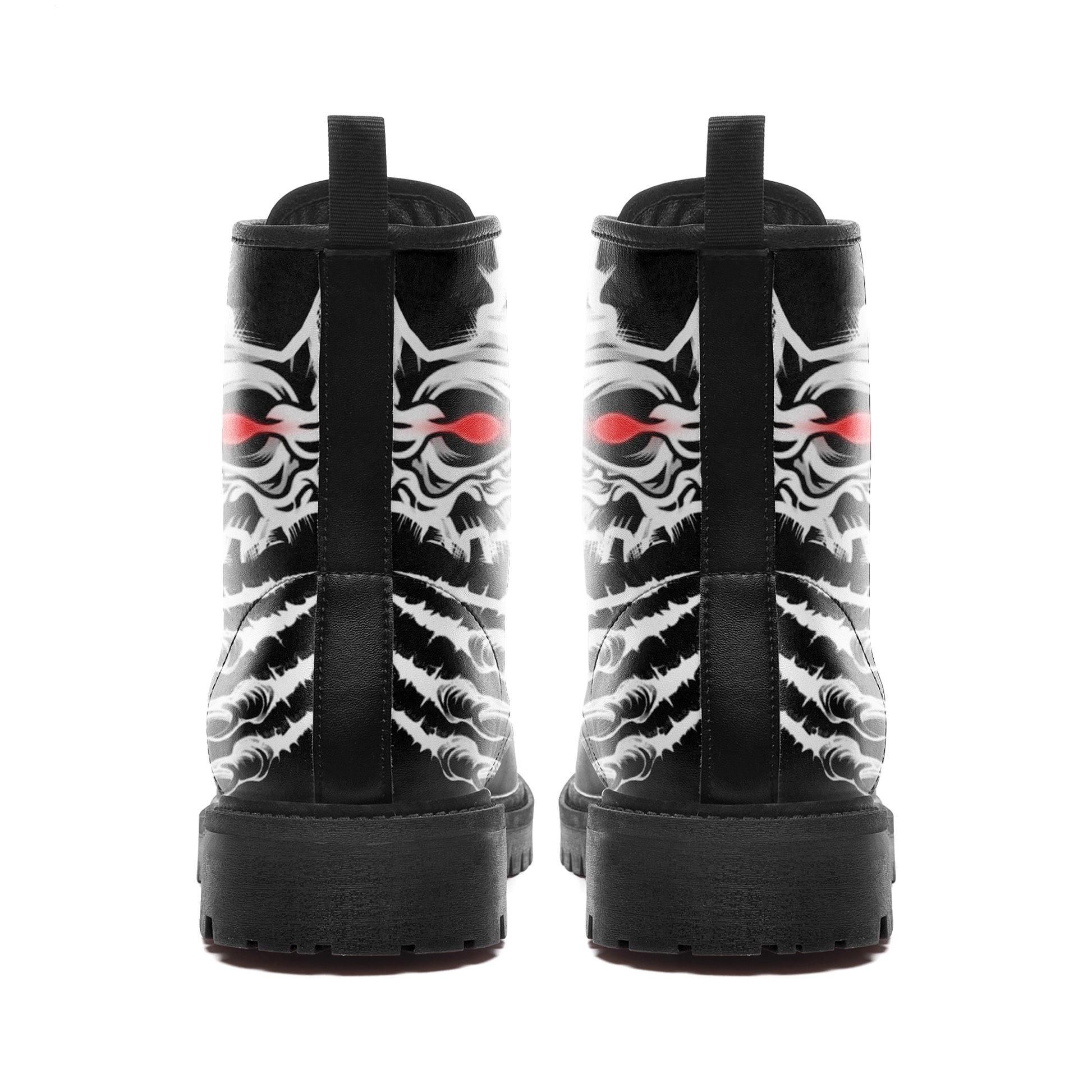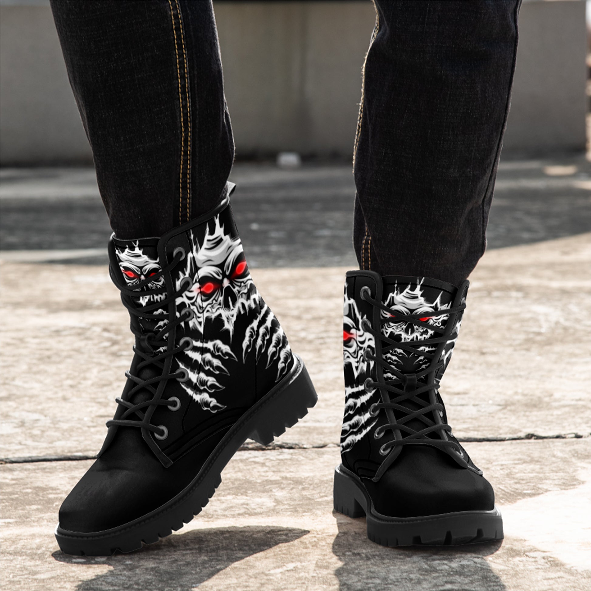 Unleash the monster. These combat boots are pure adrenaline, featuring a terrifying **demon wolf** tearing its way out of the shadows. With **glowing red eyes** and razor-sharp skeletal claws, this design captures the raw fury of the beast.