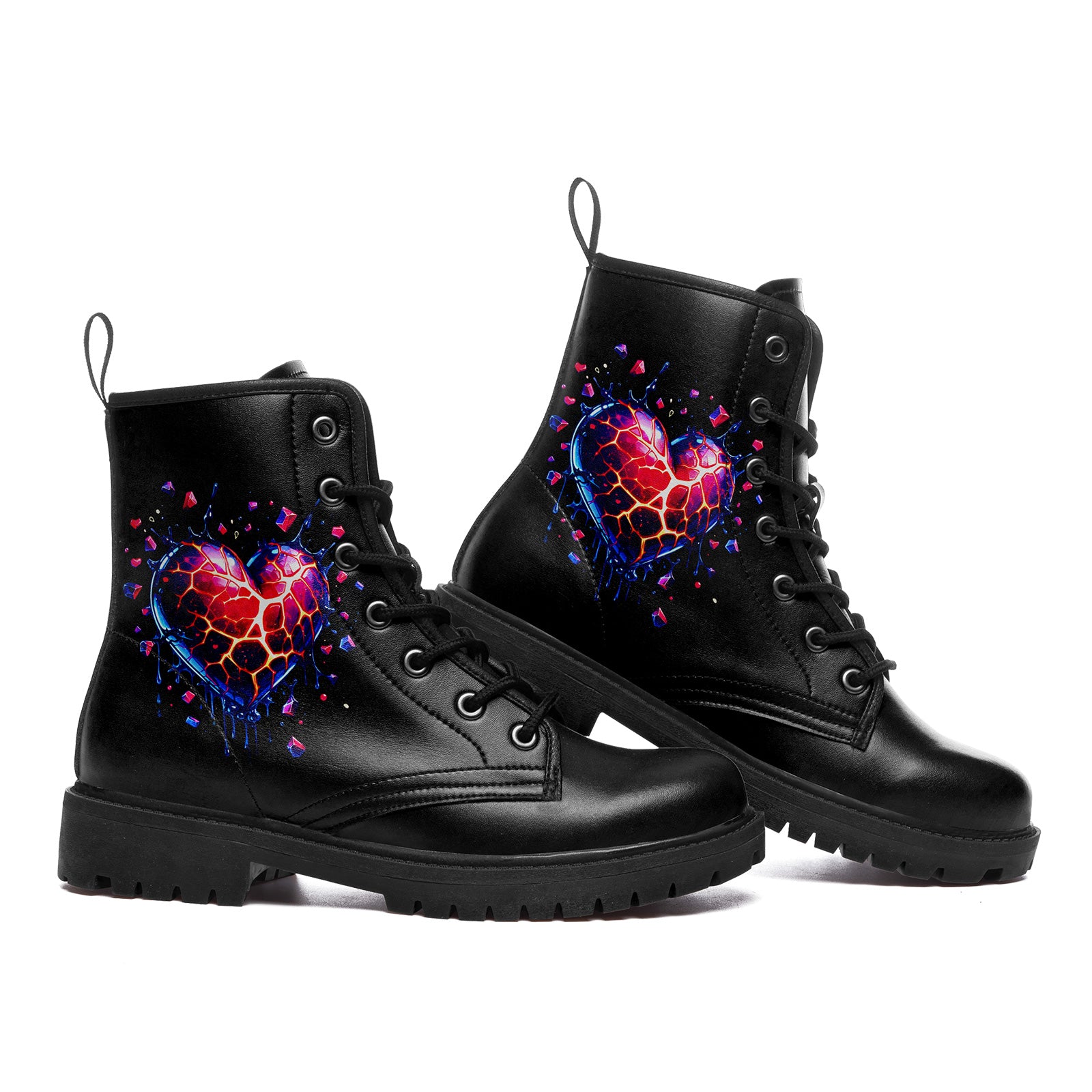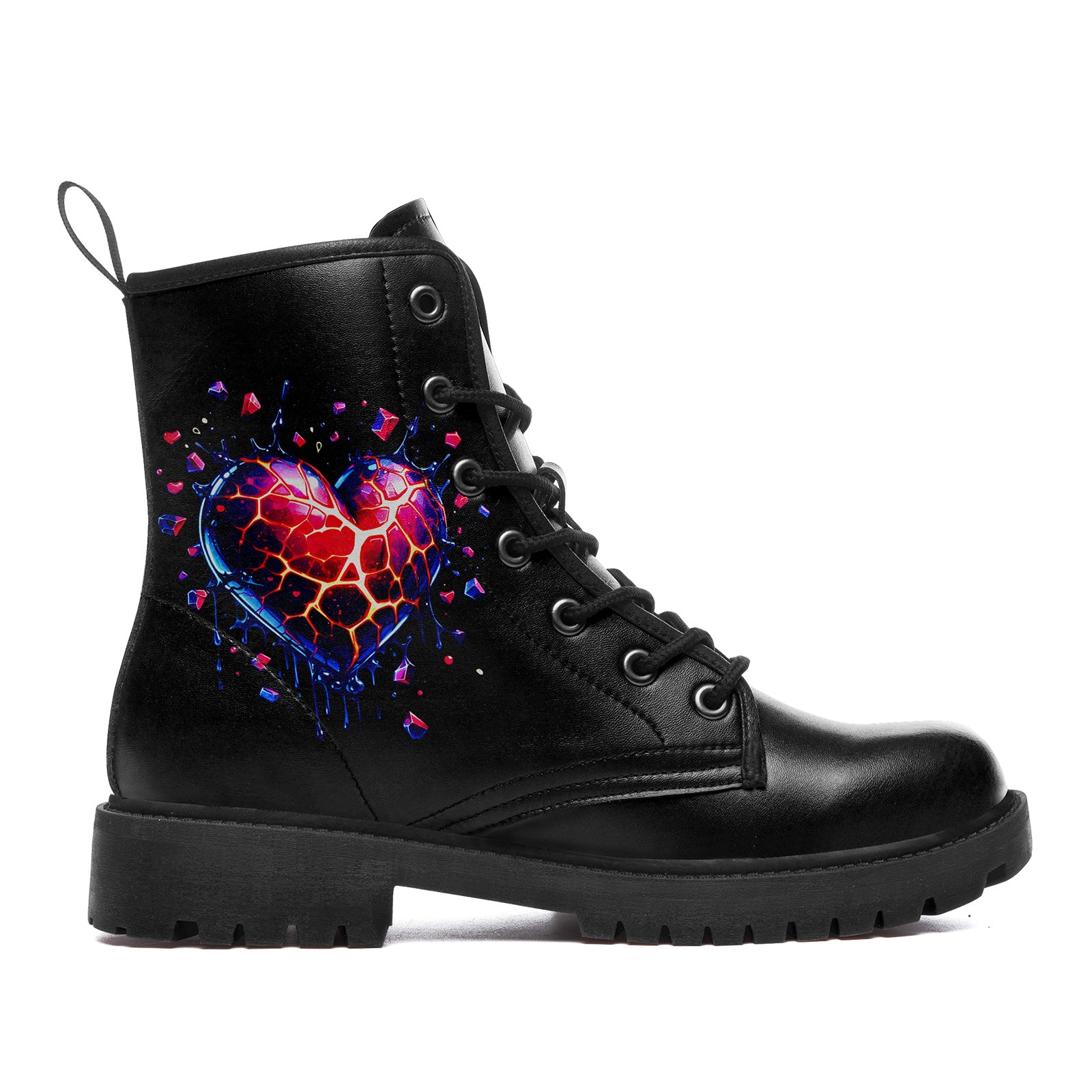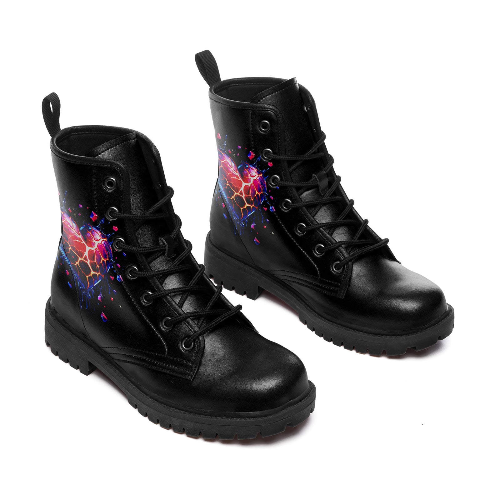 There is beauty in the breakdown. These stunning combat boots feature a mesmerizing digital art piece of a **shattered crystal heart**, glowing with inner fire. Fragments of neon red, purple, and blue explode outward, capturing the dynamic energy of transformation.