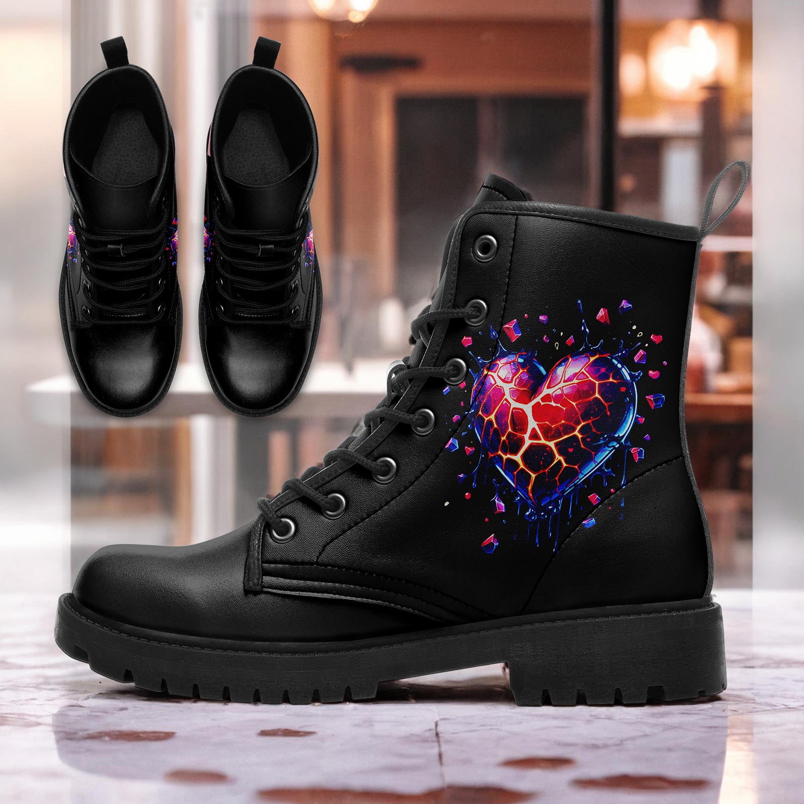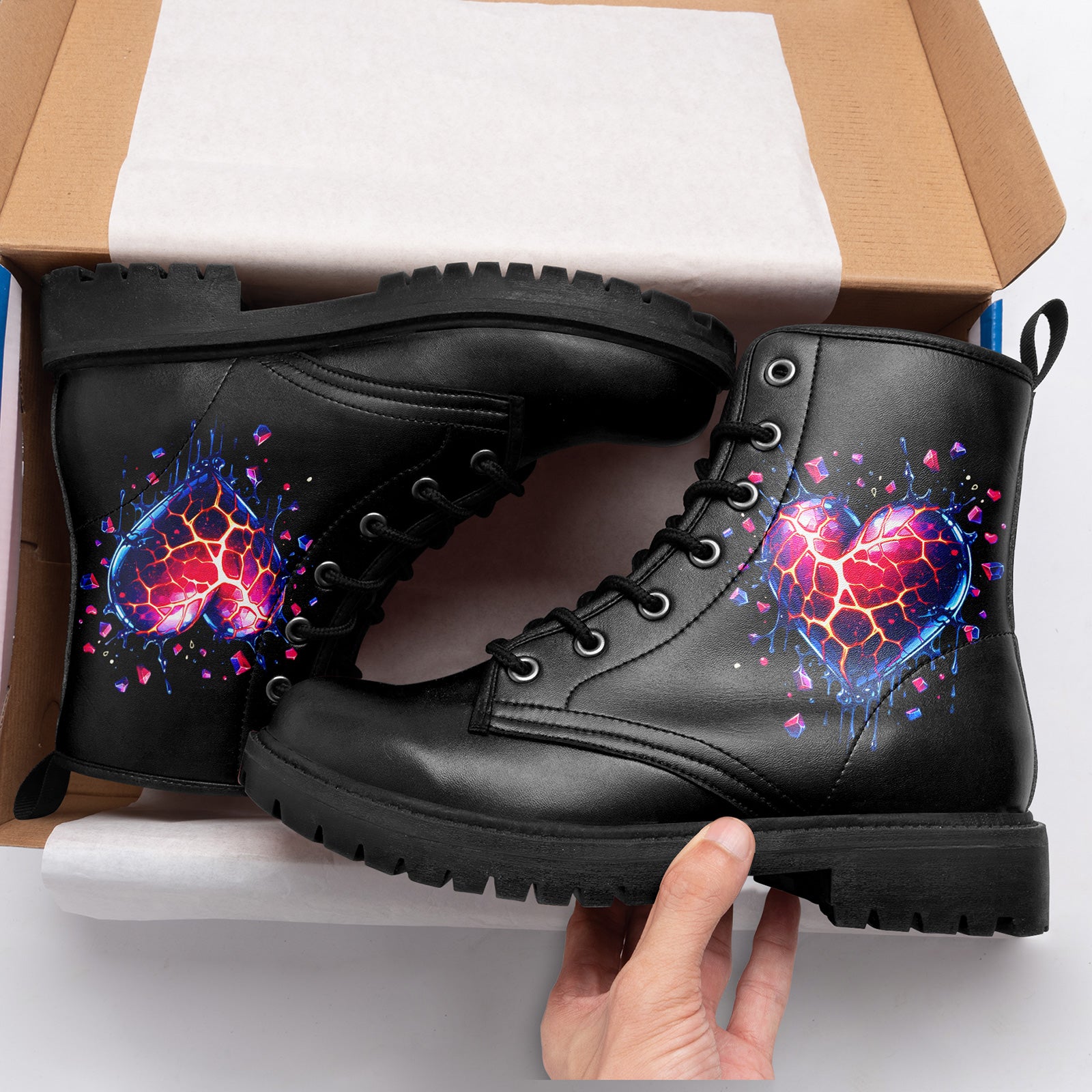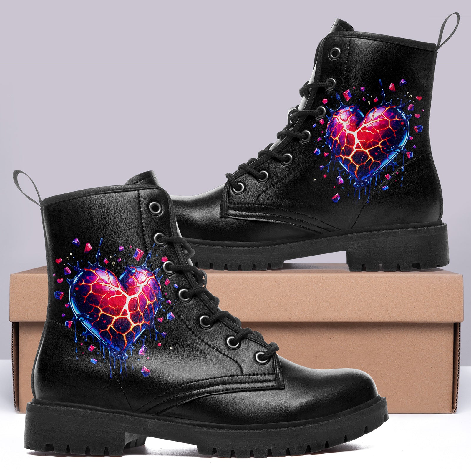 There is beauty in the breakdown. These stunning combat boots feature a mesmerizing digital art piece of a **shattered crystal heart**, glowing with inner fire. Fragments of neon red, purple, and blue explode outward, capturing the dynamic energy of transformation.