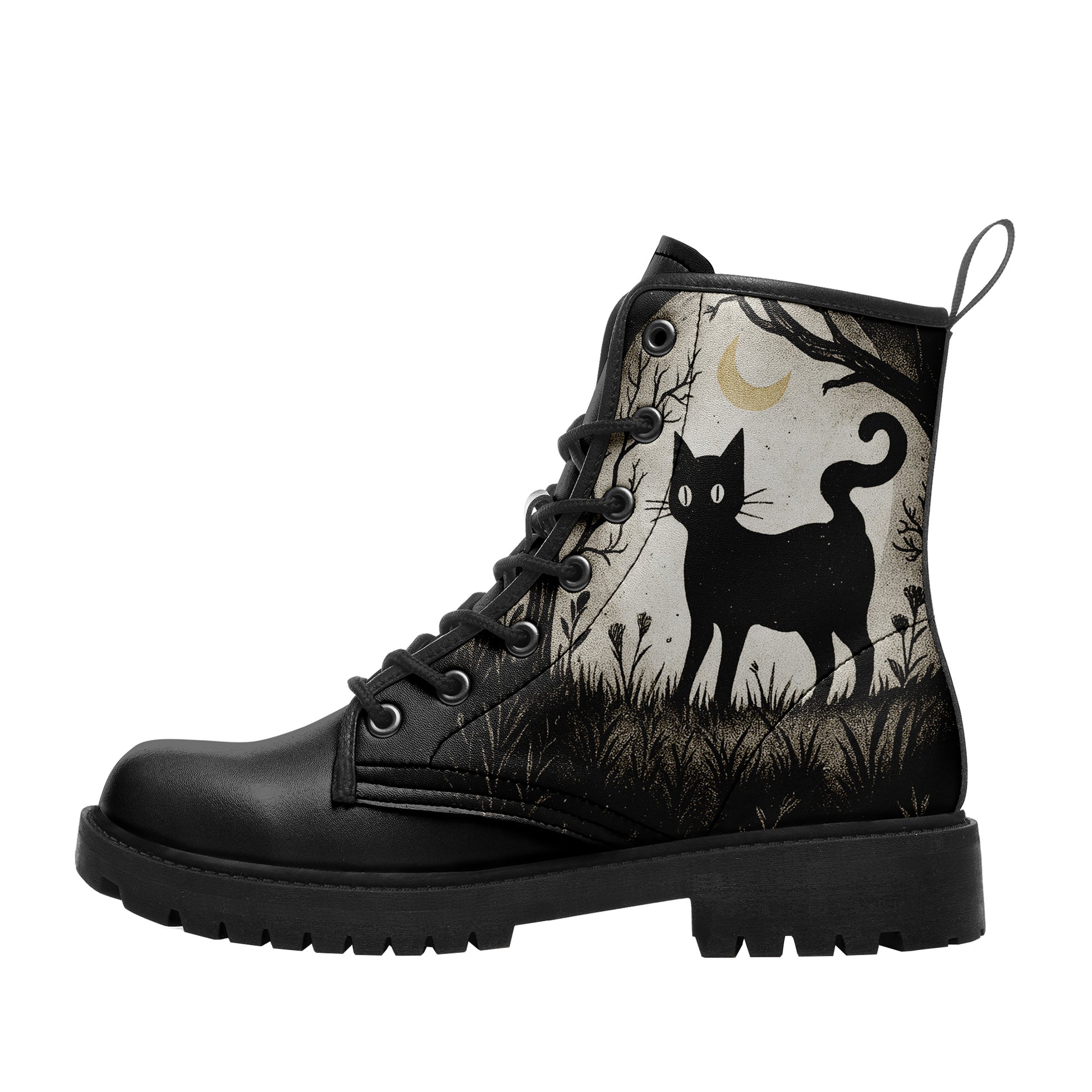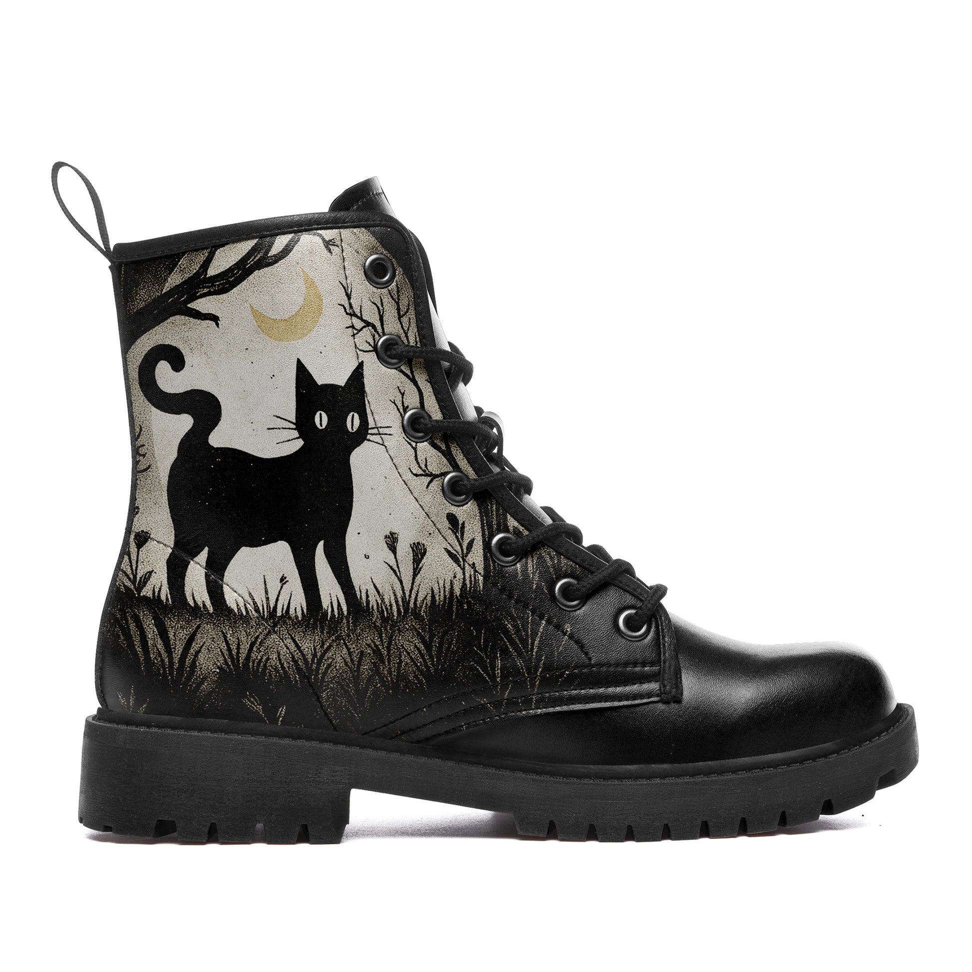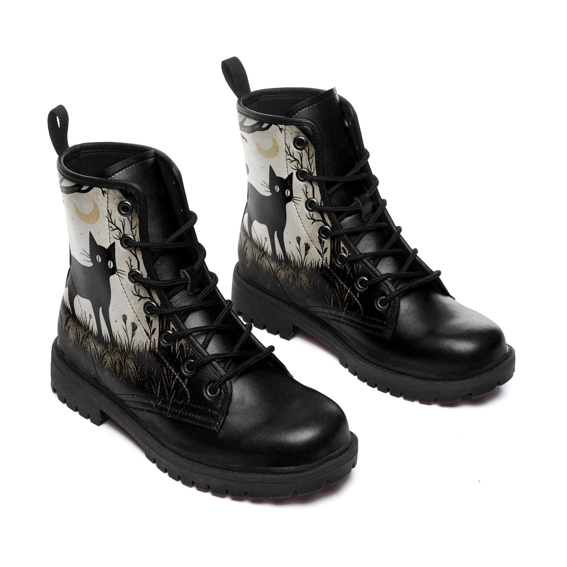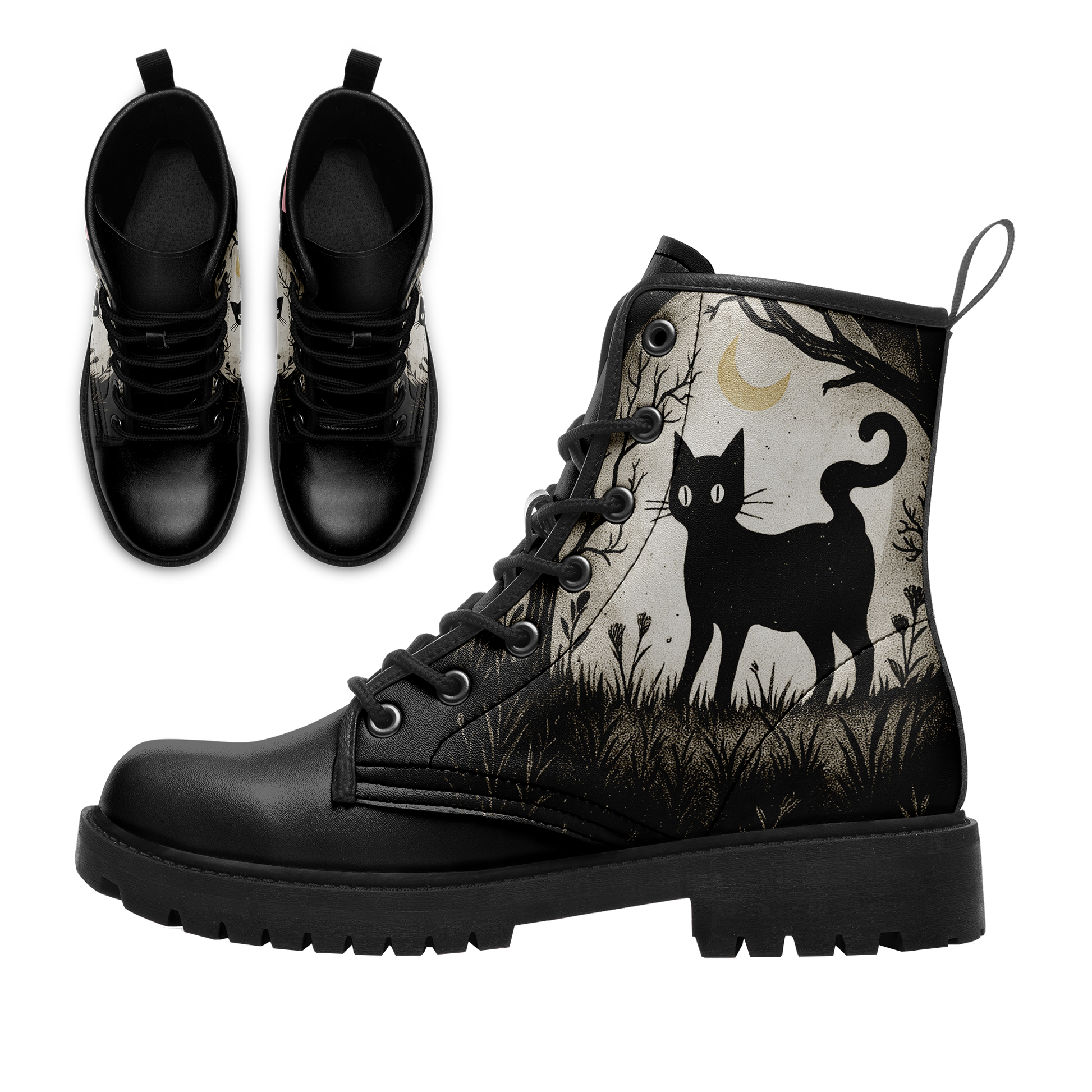 Once upon a time, under a sliver of a moon... These combat boots bring the magic of classic storytelling to life. Featuring a charming **silhouette illustration** of a curious black cat wandering through tall grass, the design feels like a lost page from a vintage fairytale.