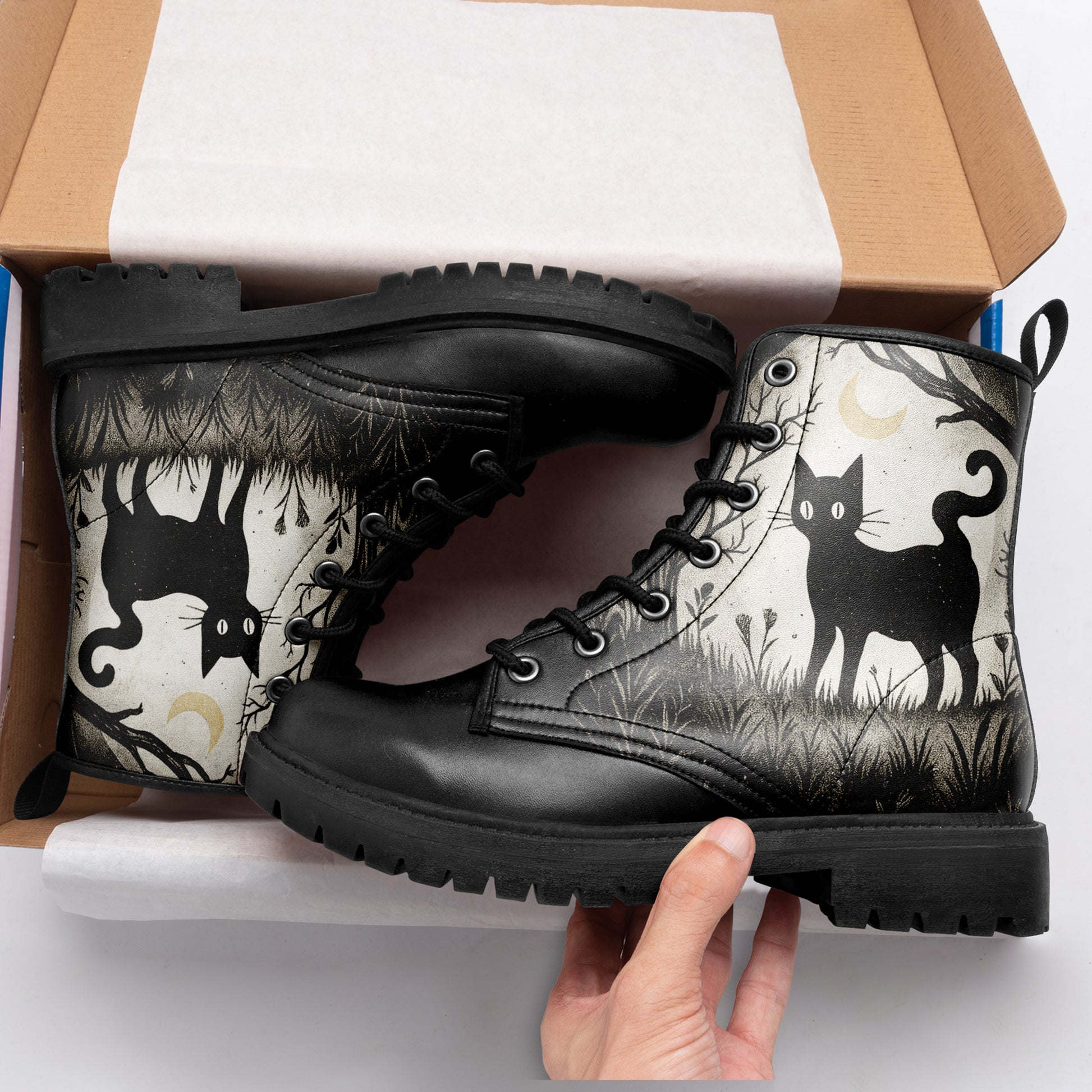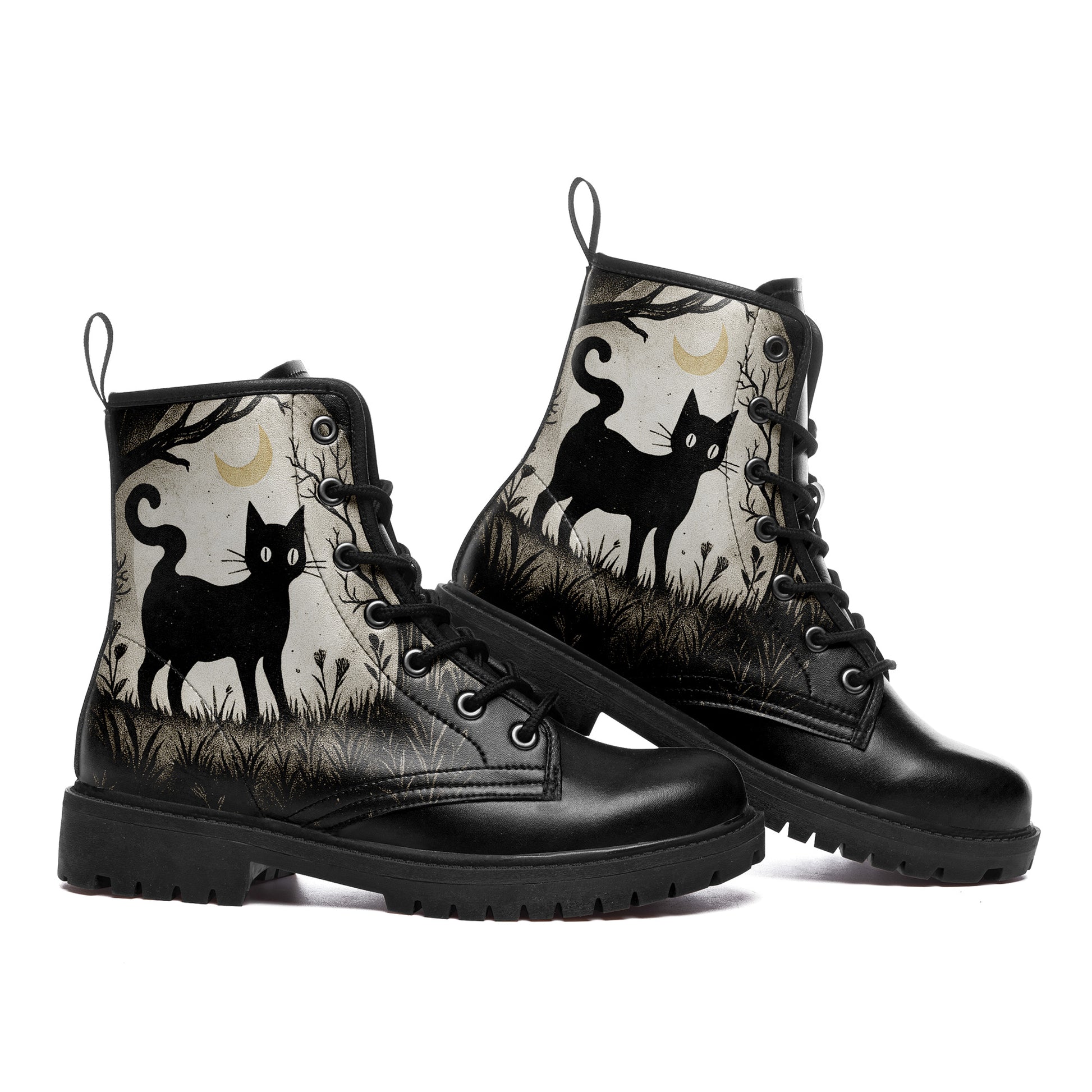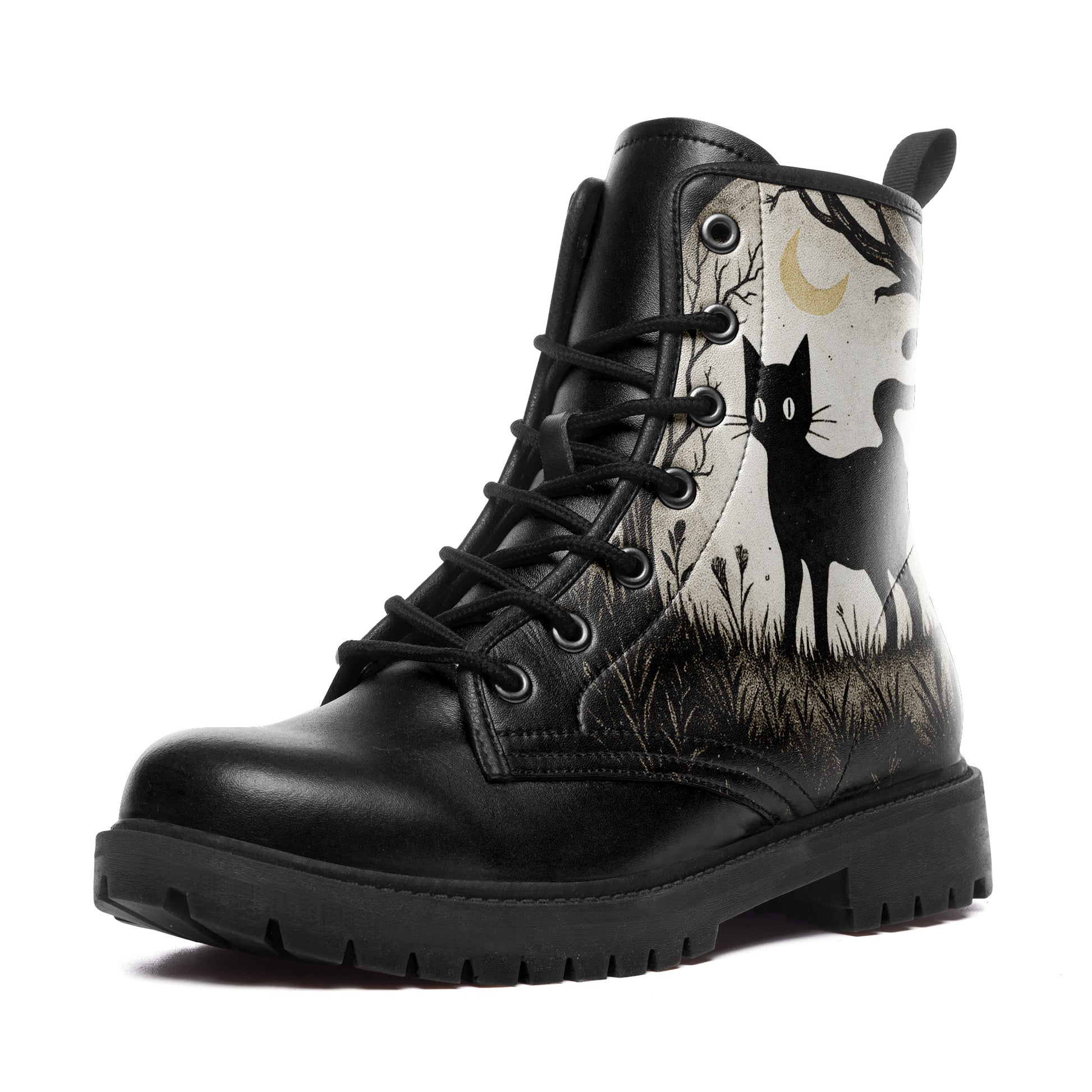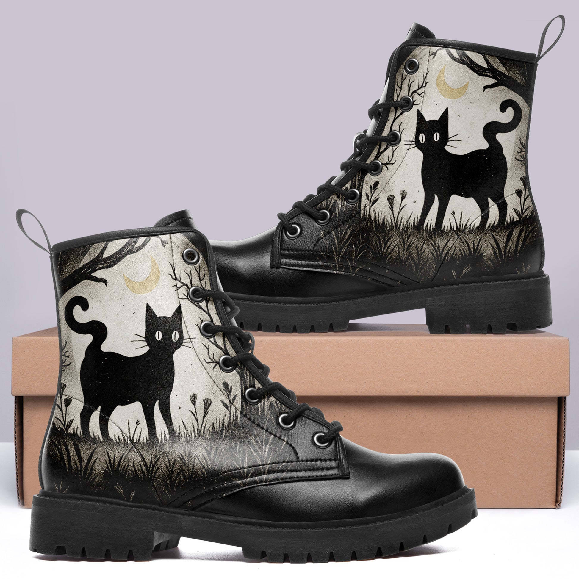 Once upon a time, under a sliver of a moon... These combat boots bring the magic of classic storytelling to life. Featuring a charming **silhouette illustration** of a curious black cat wandering through tall grass, the design feels like a lost page from a vintage fairytale.