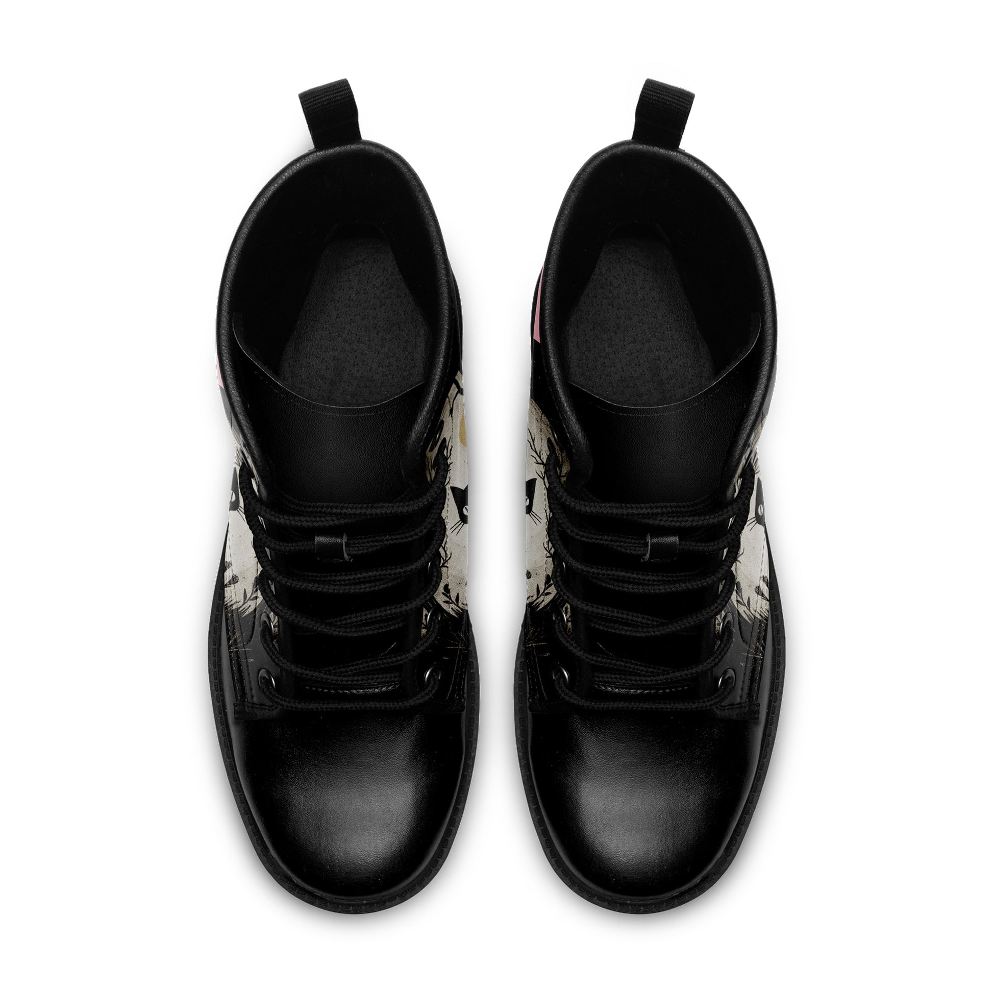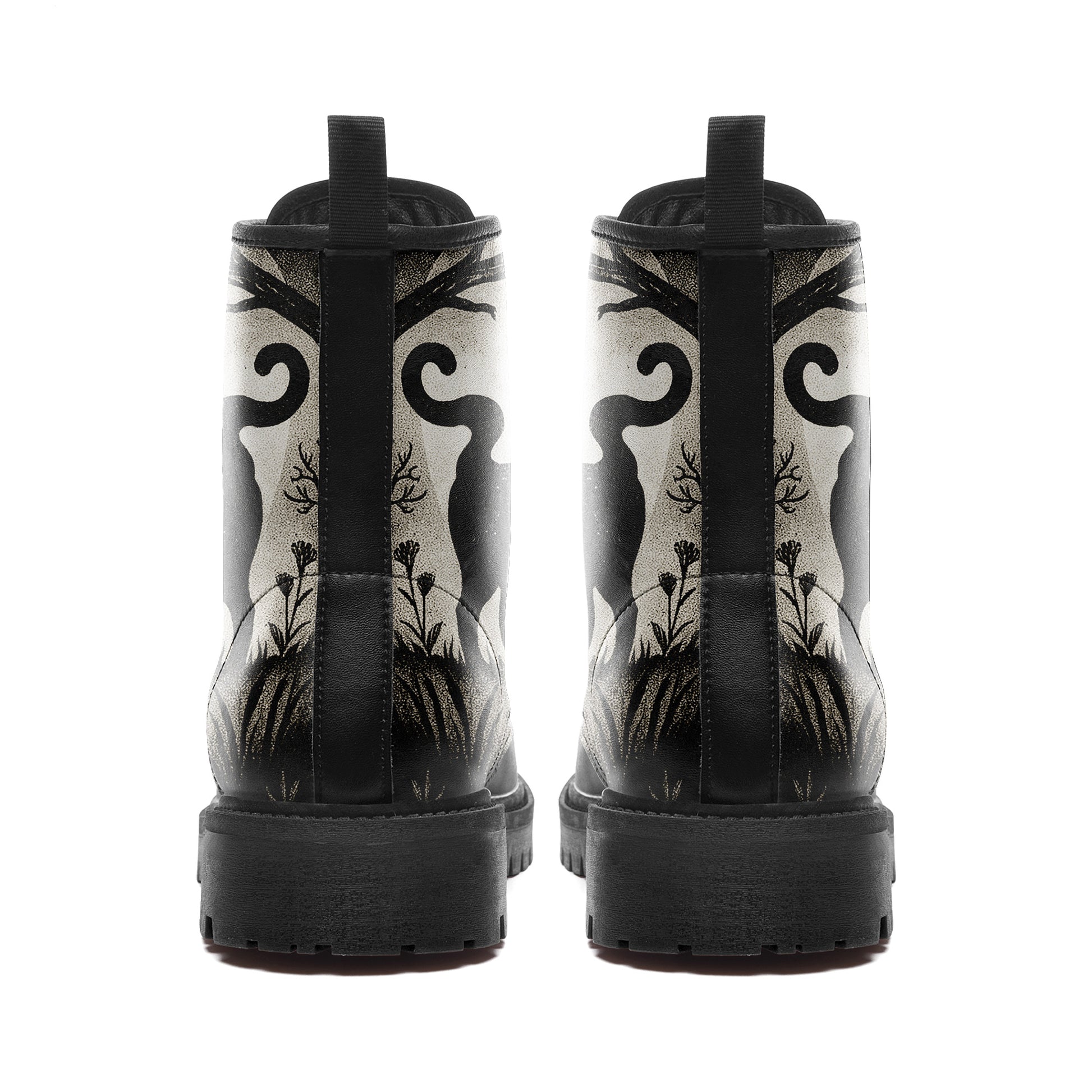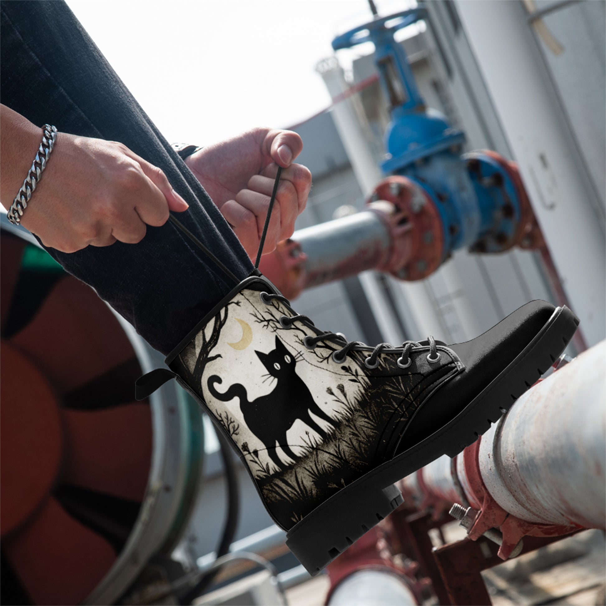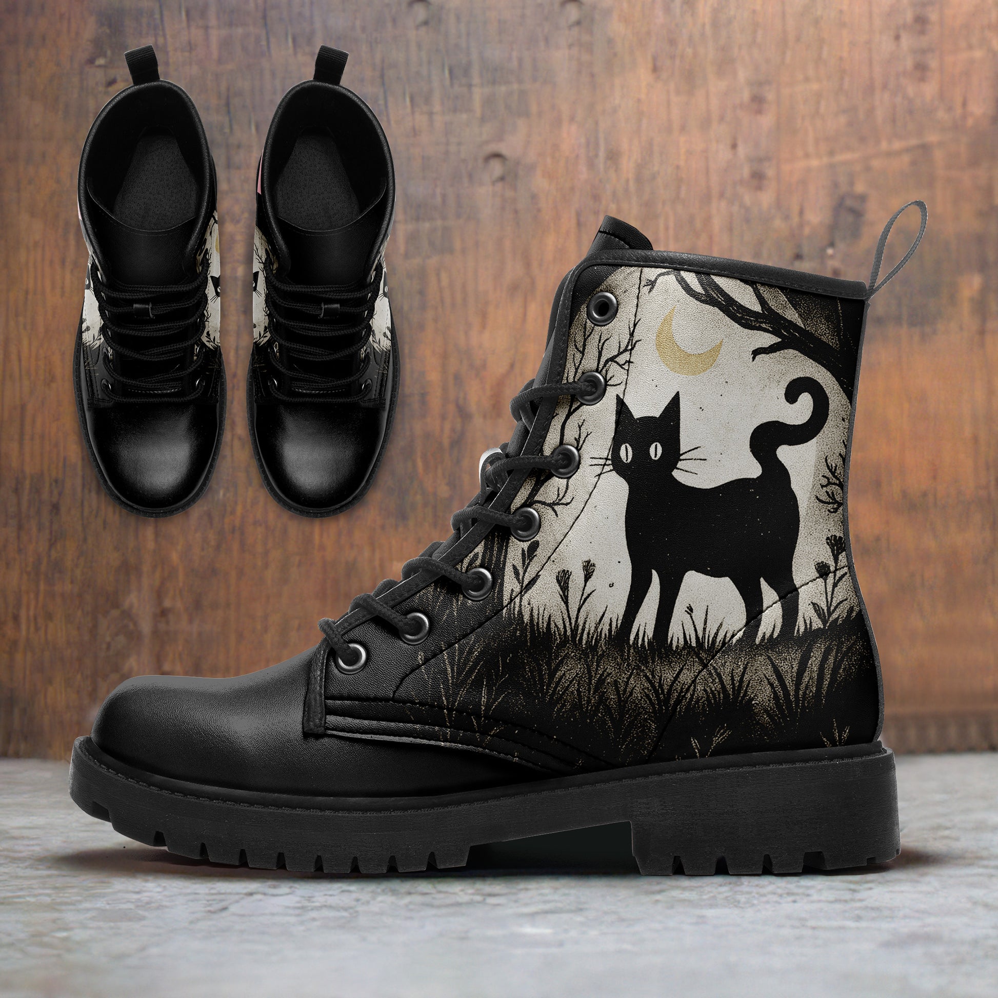 Once upon a time, under a sliver of a moon... These combat boots bring the magic of classic storytelling to life. Featuring a charming **silhouette illustration** of a curious black cat wandering through tall grass, the design feels like a lost page from a vintage fairytale.