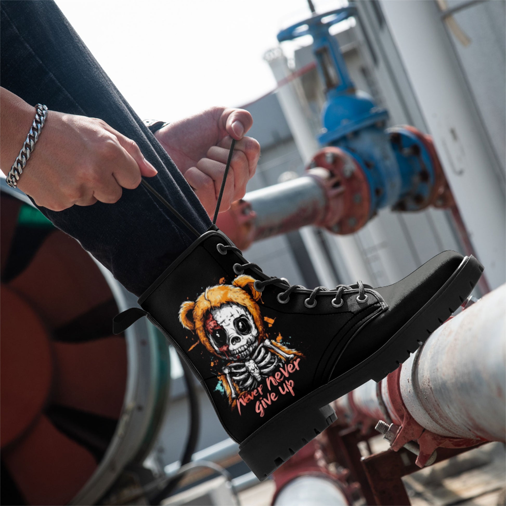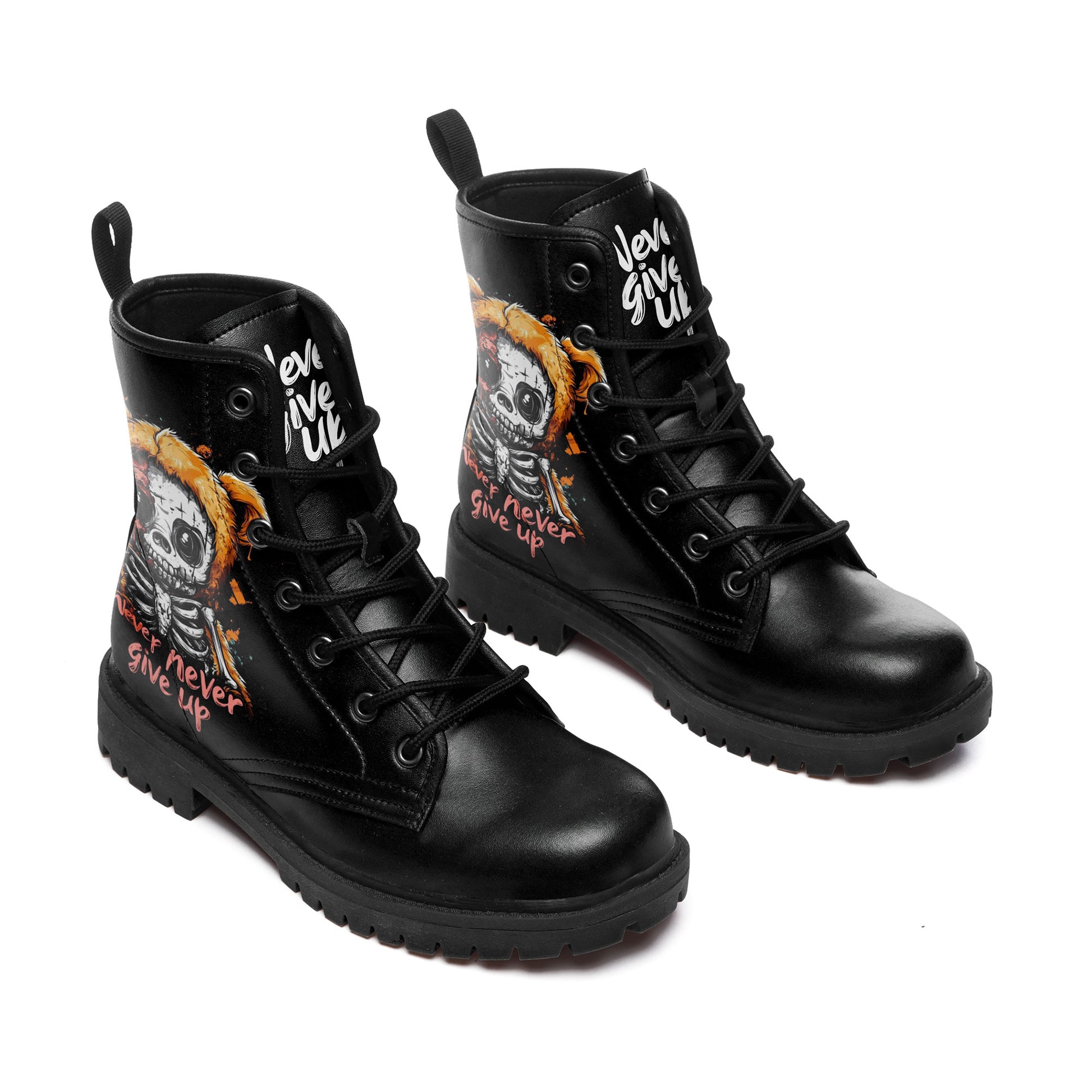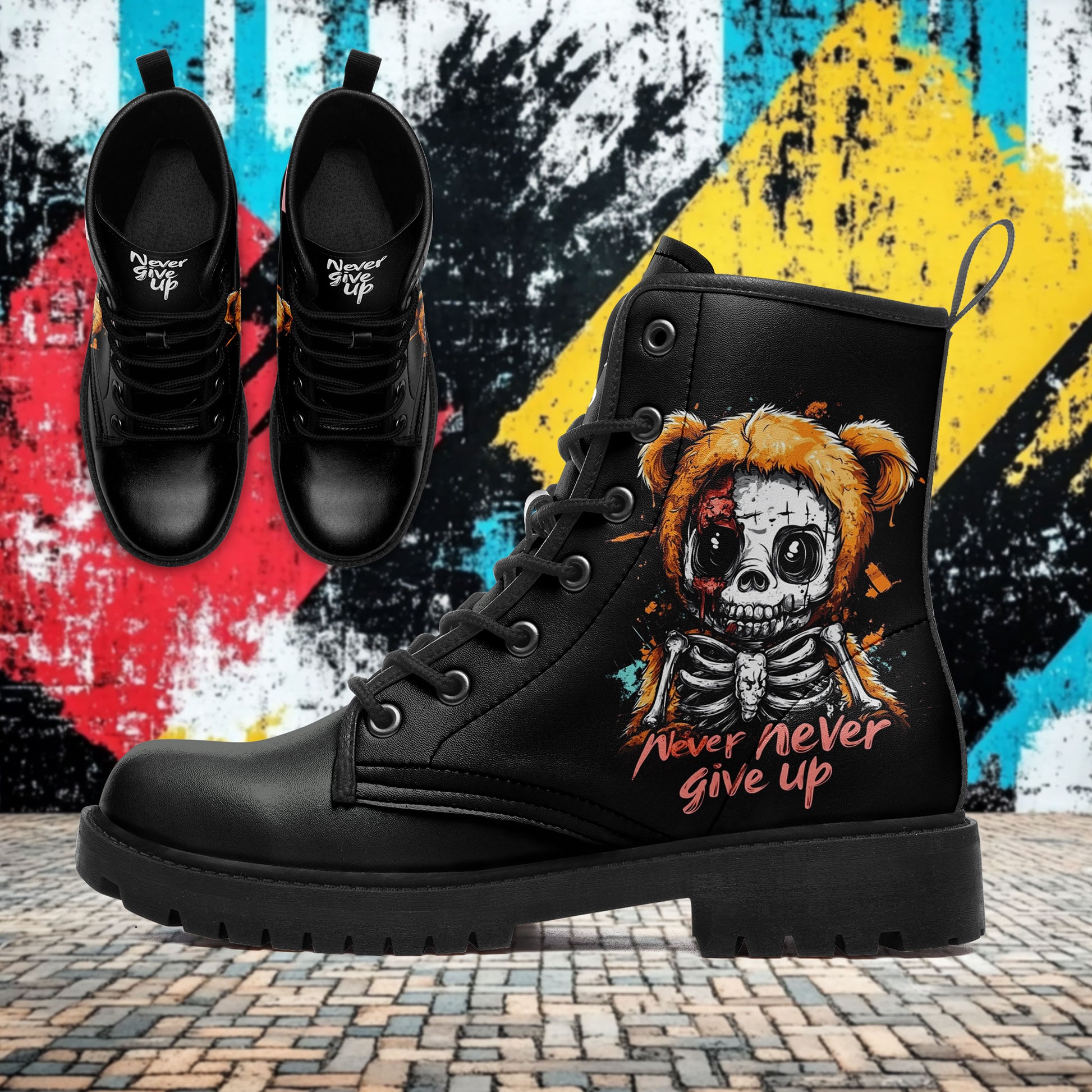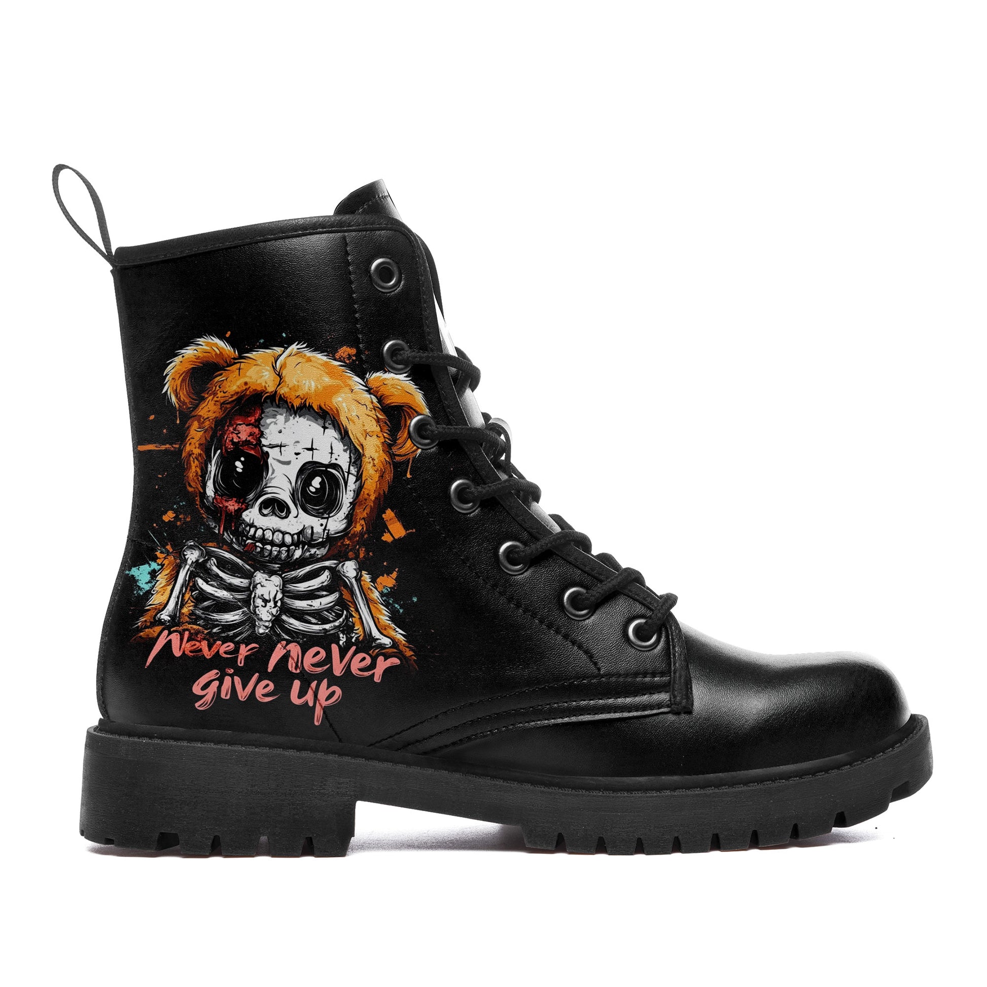 Skeleton in Teddy Bear Hood Combat Boots - Never Give Up Quote Shoes 058-6-25009075-4