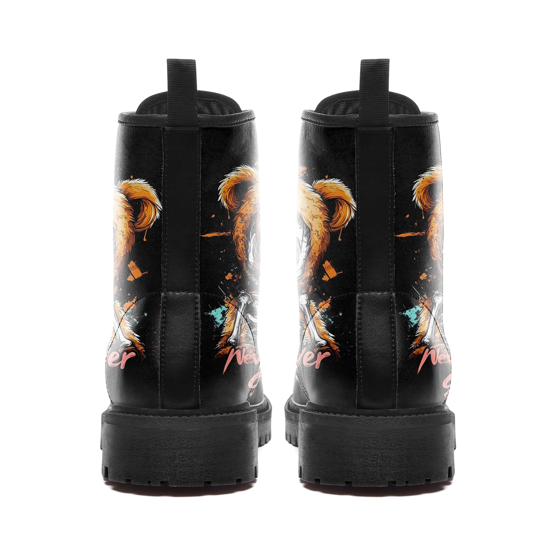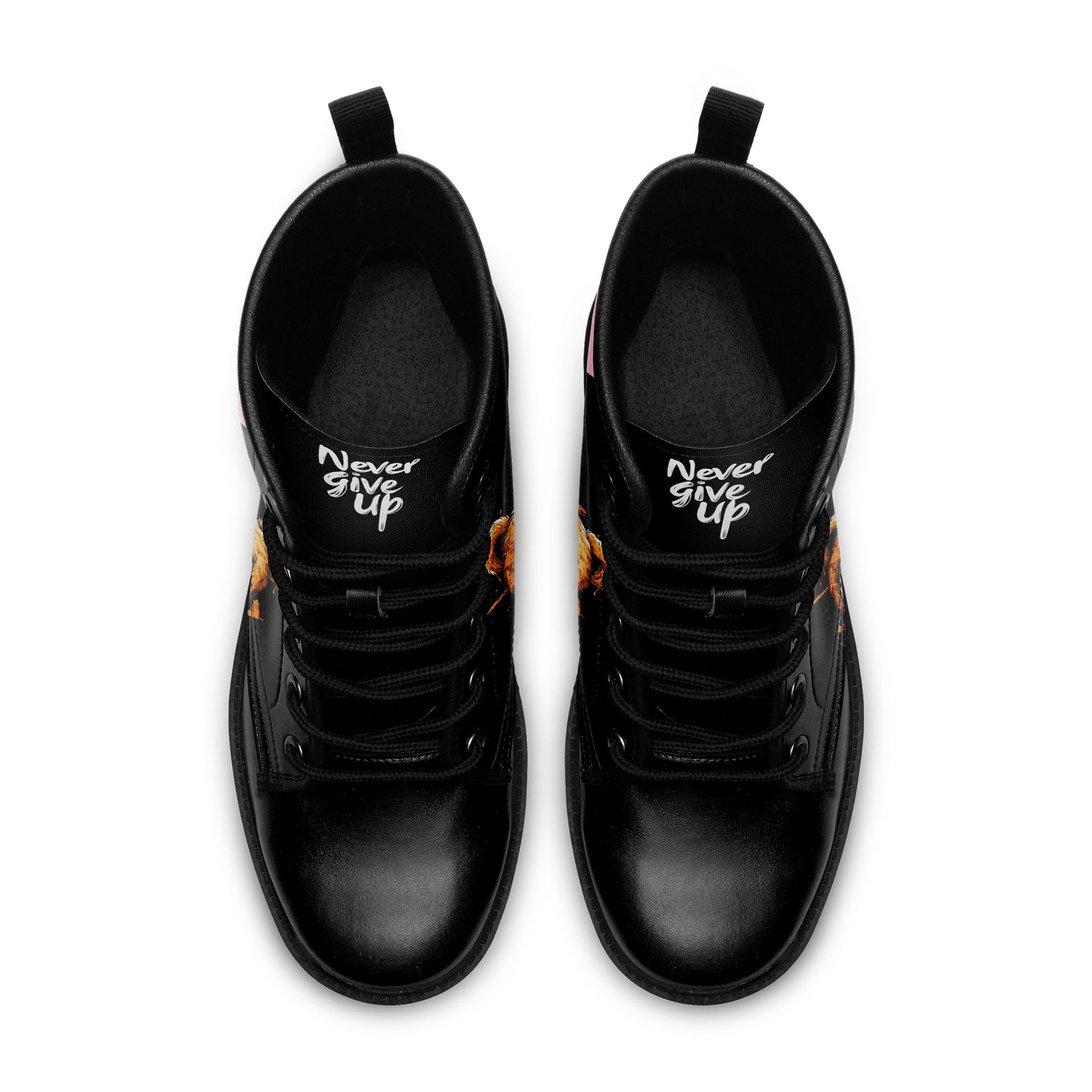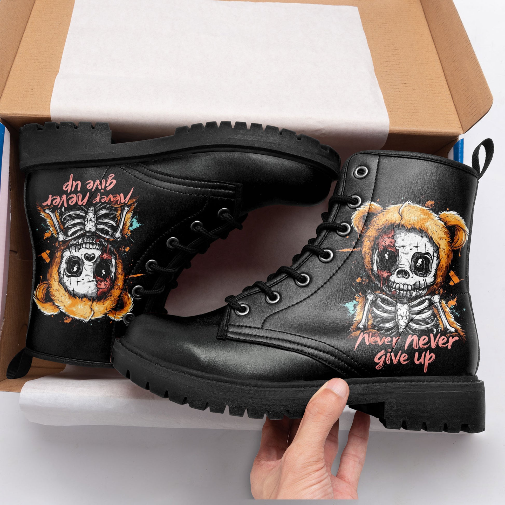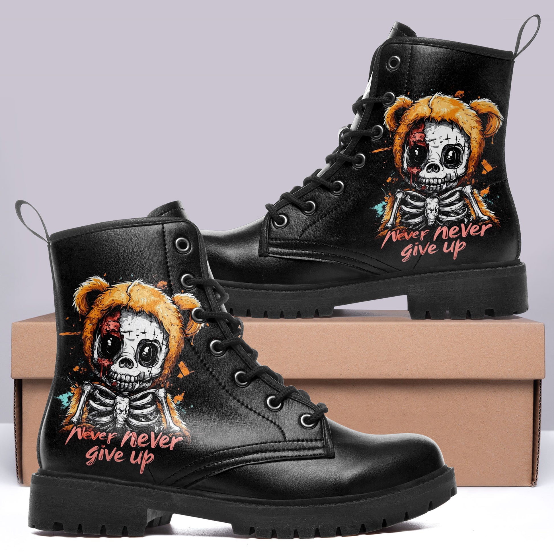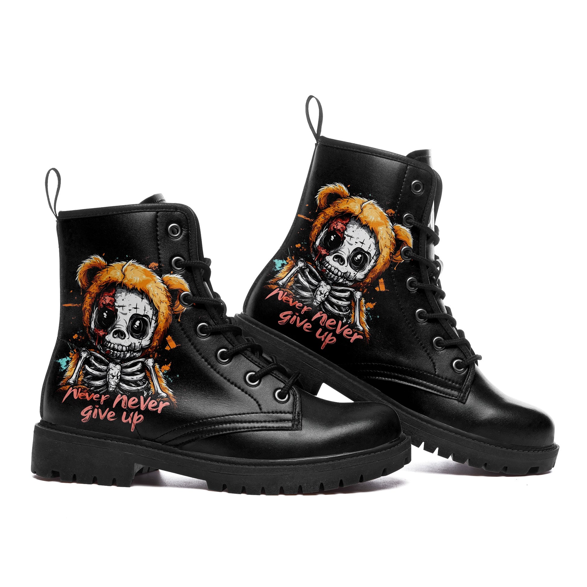 Skeleton in Teddy Bear Hood Combat Boots - Never Give Up Quote Shoes 058-6-25009075-4