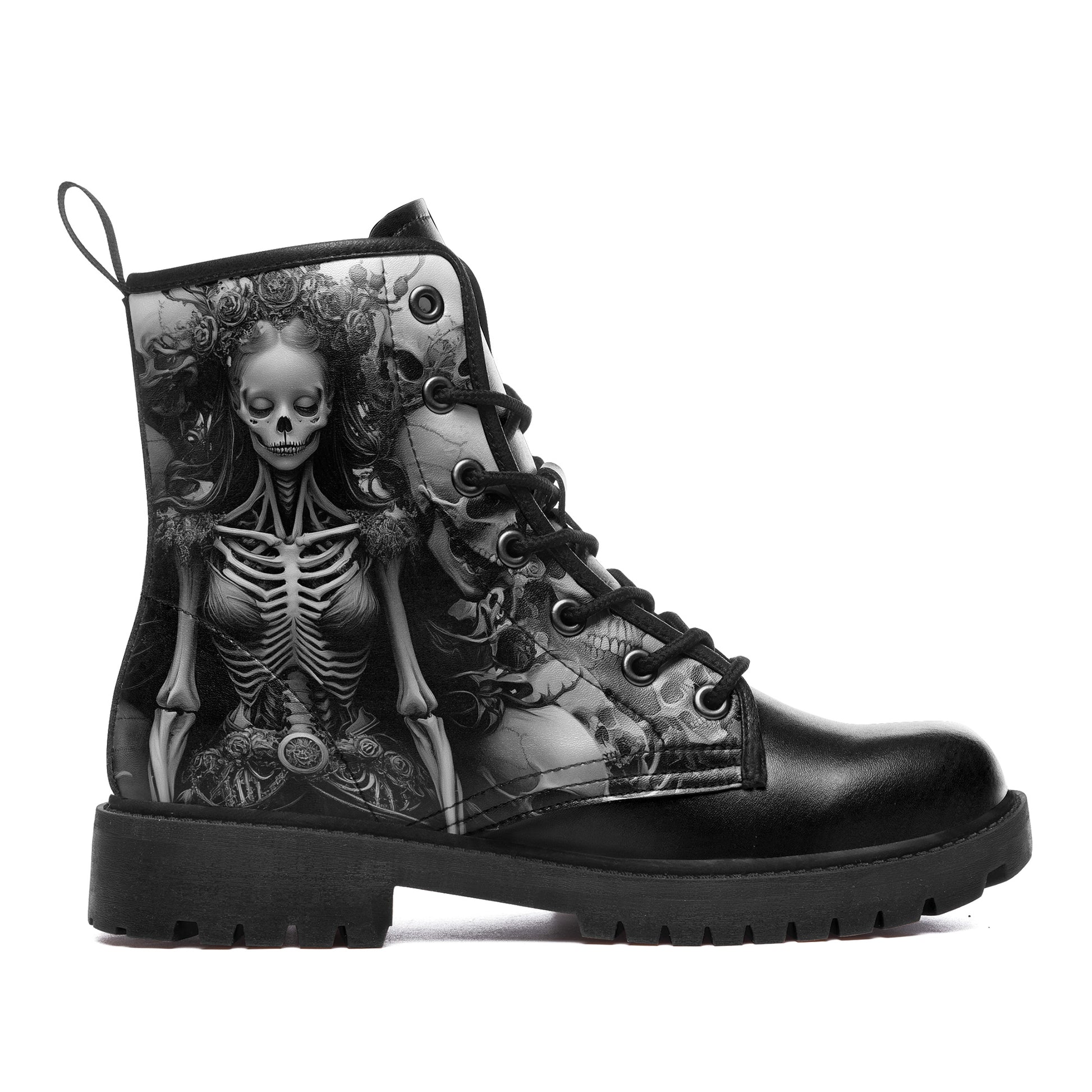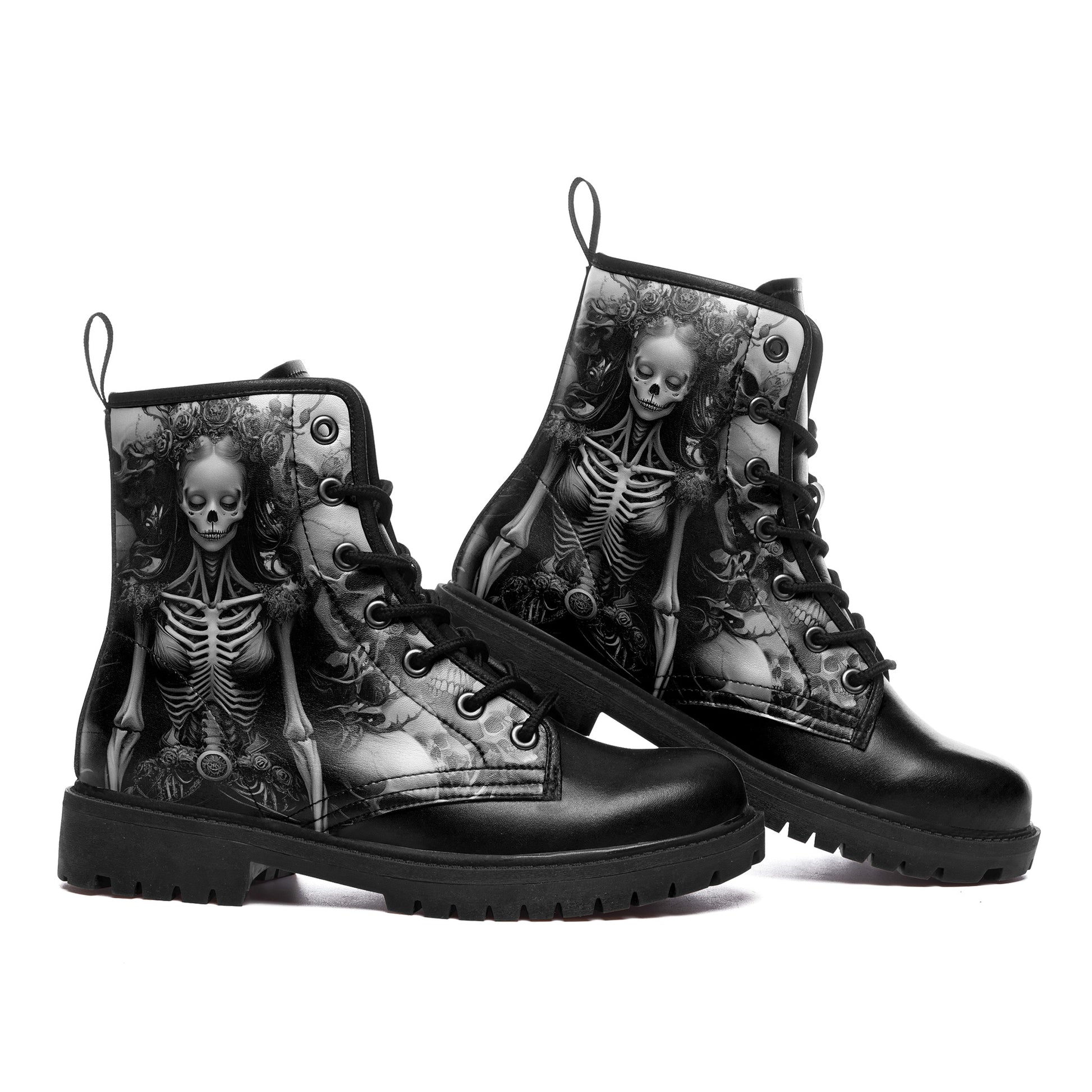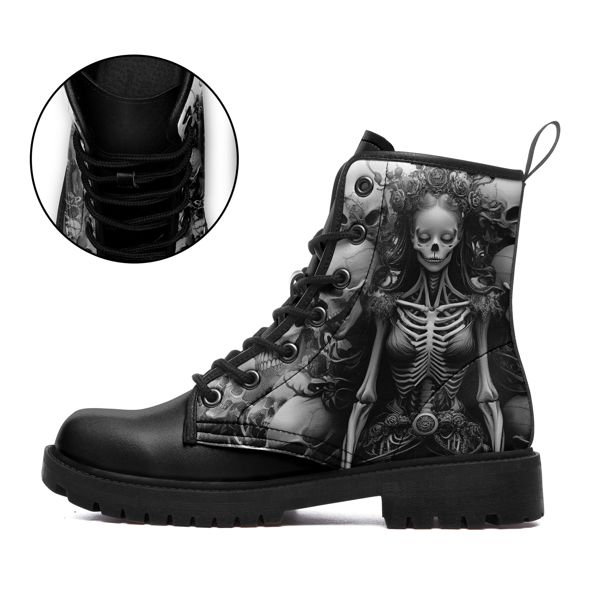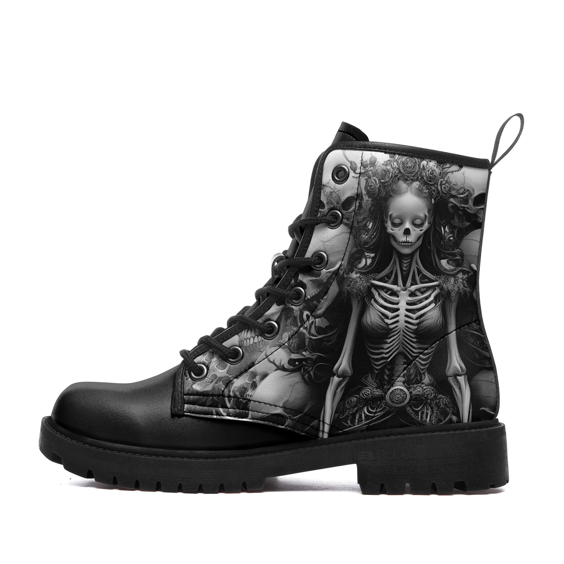 Skeleton Queen with Floral Crown Combat Boots - Monochrome Gothic Art Shoes BOOTS-240270014