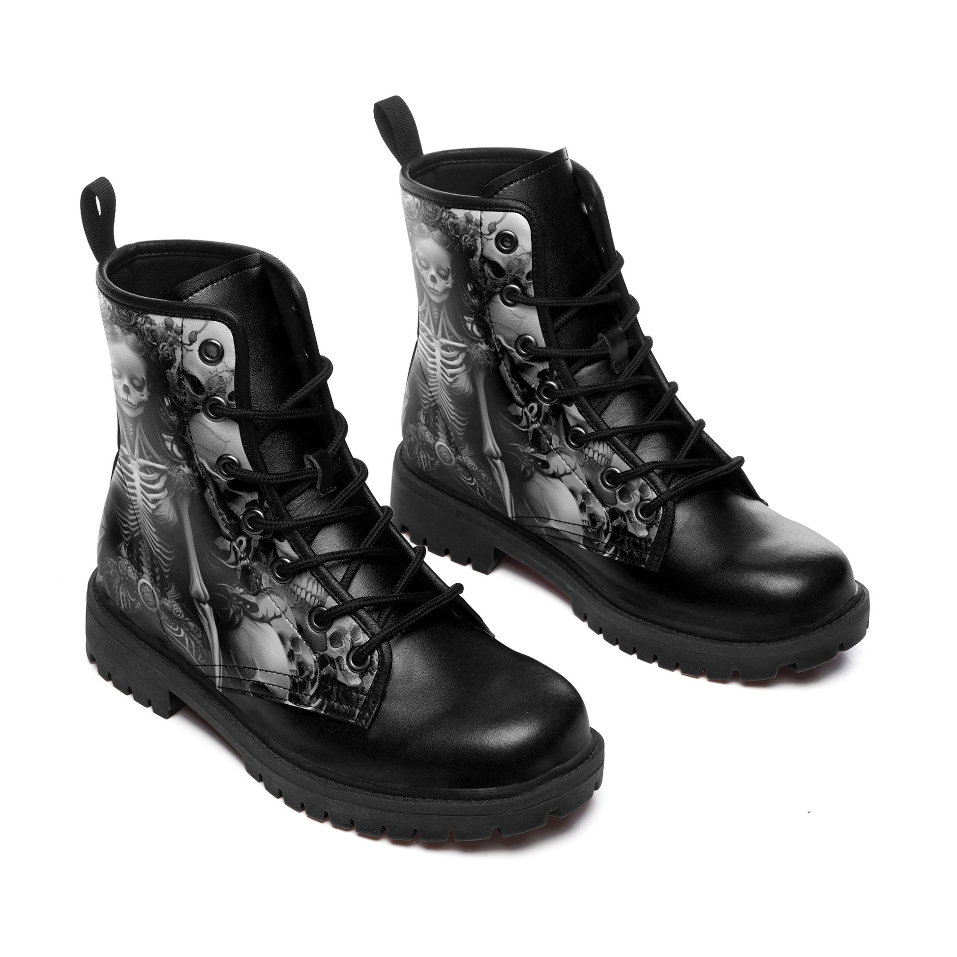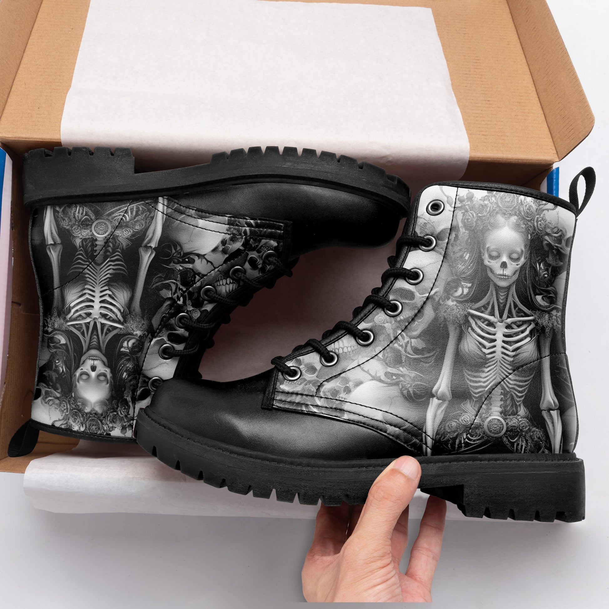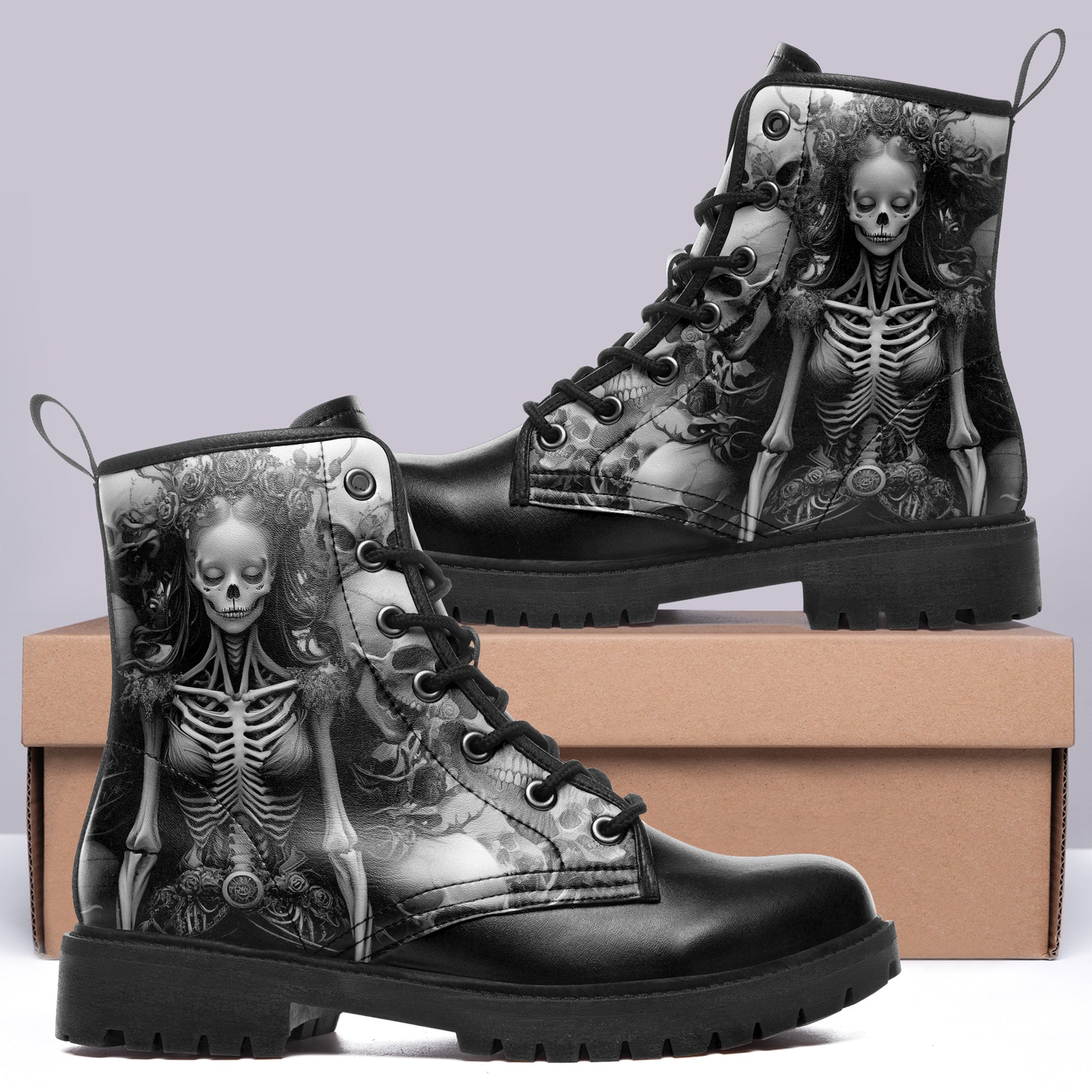 Skeleton Queen with Floral Crown Combat Boots - Monochrome Gothic Art Shoes BOOTS-240270014