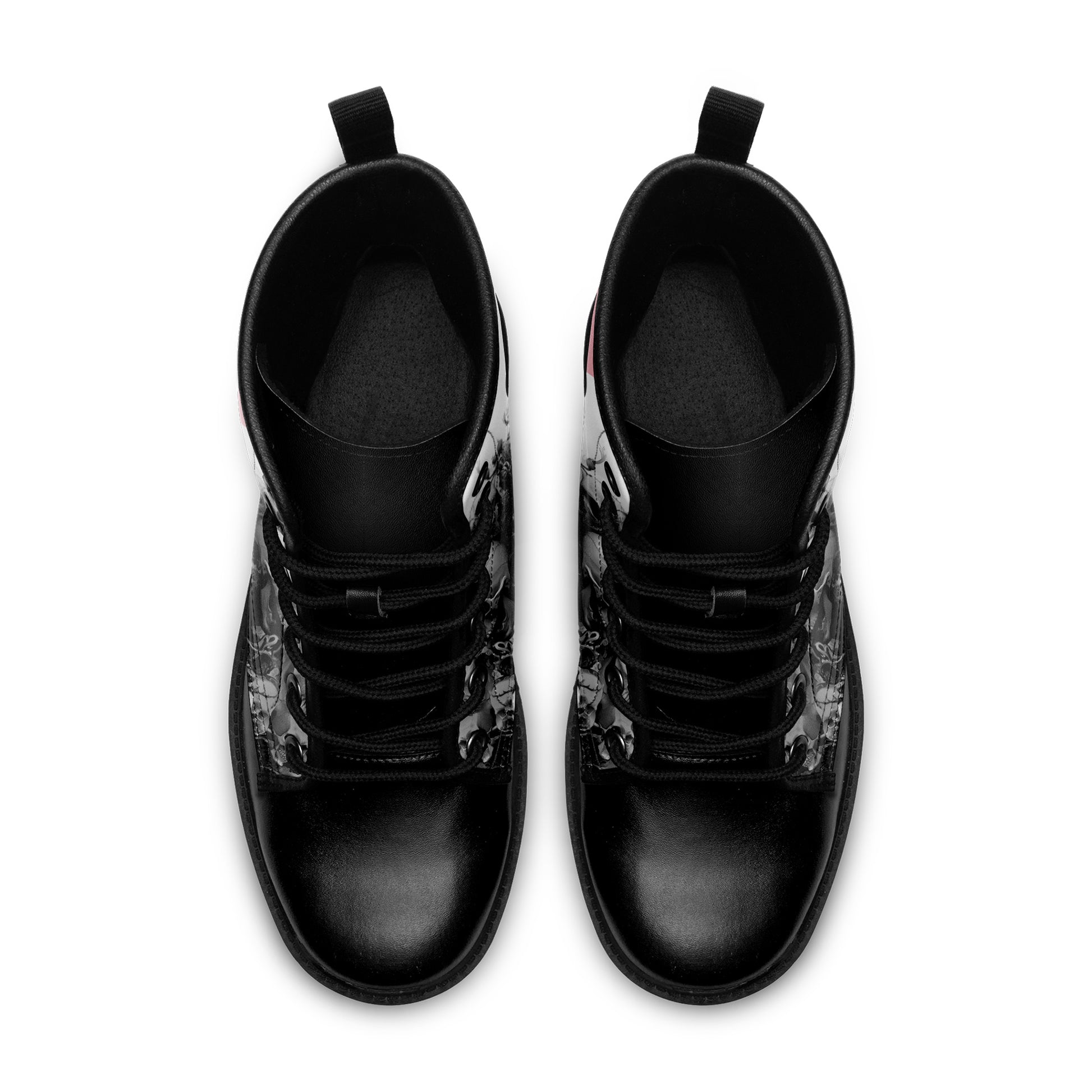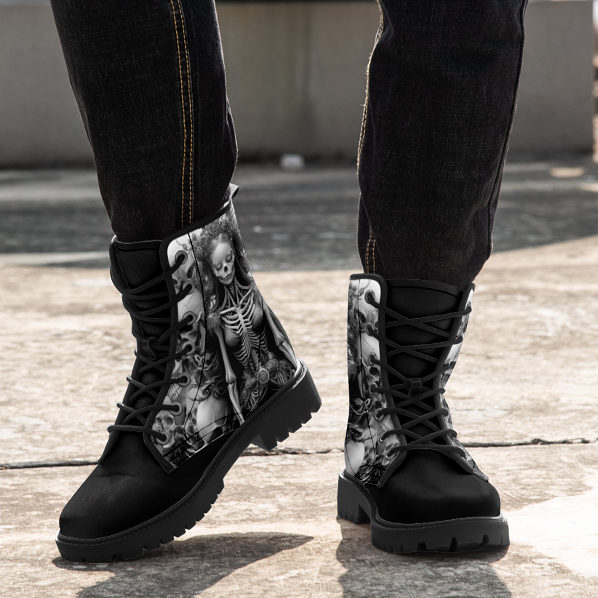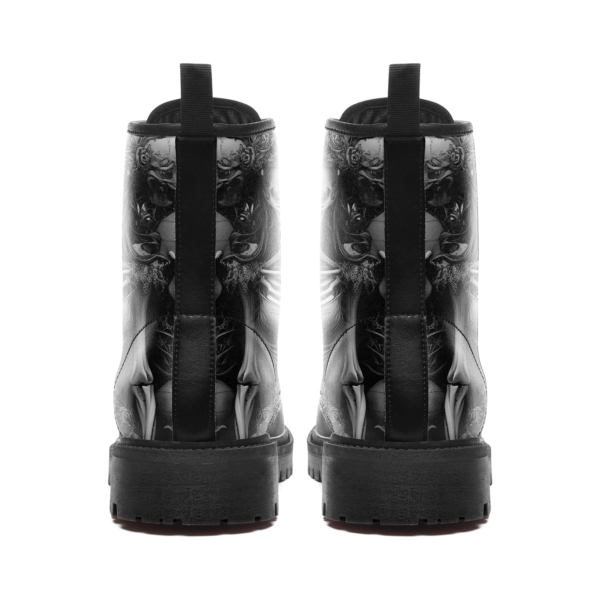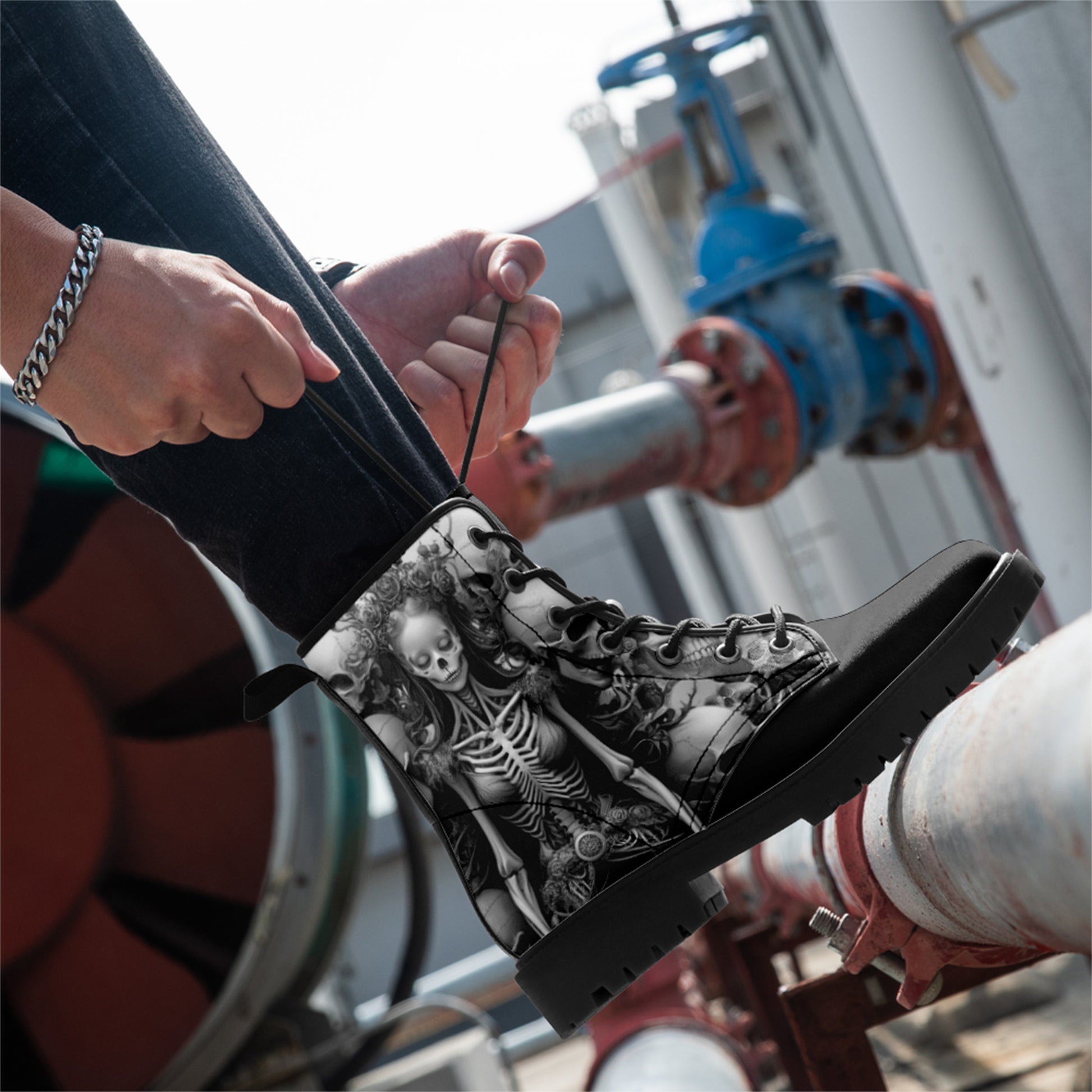 Skeleton Queen with Floral Crown Combat Boots - Monochrome Gothic Art Shoes BOOTS-240270014