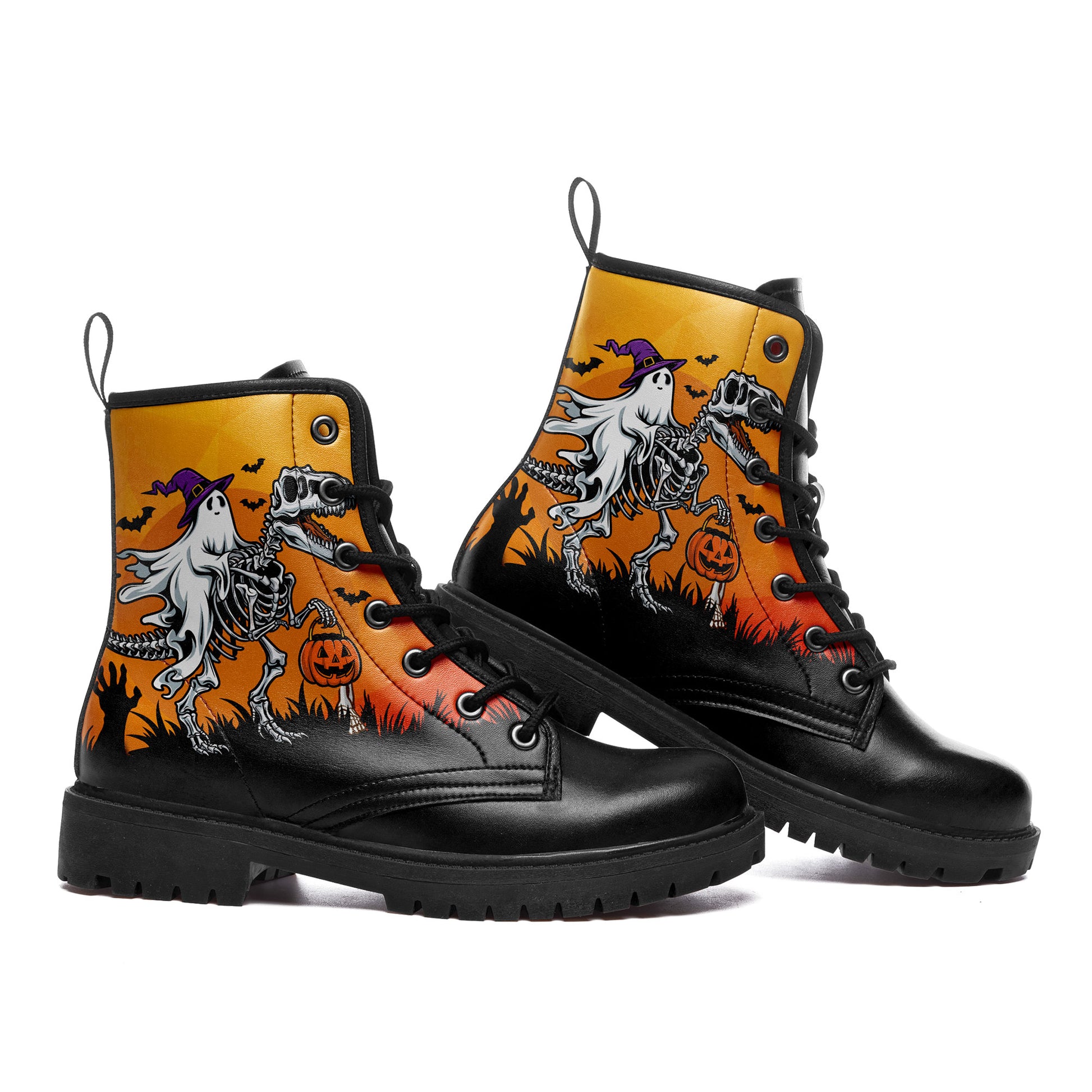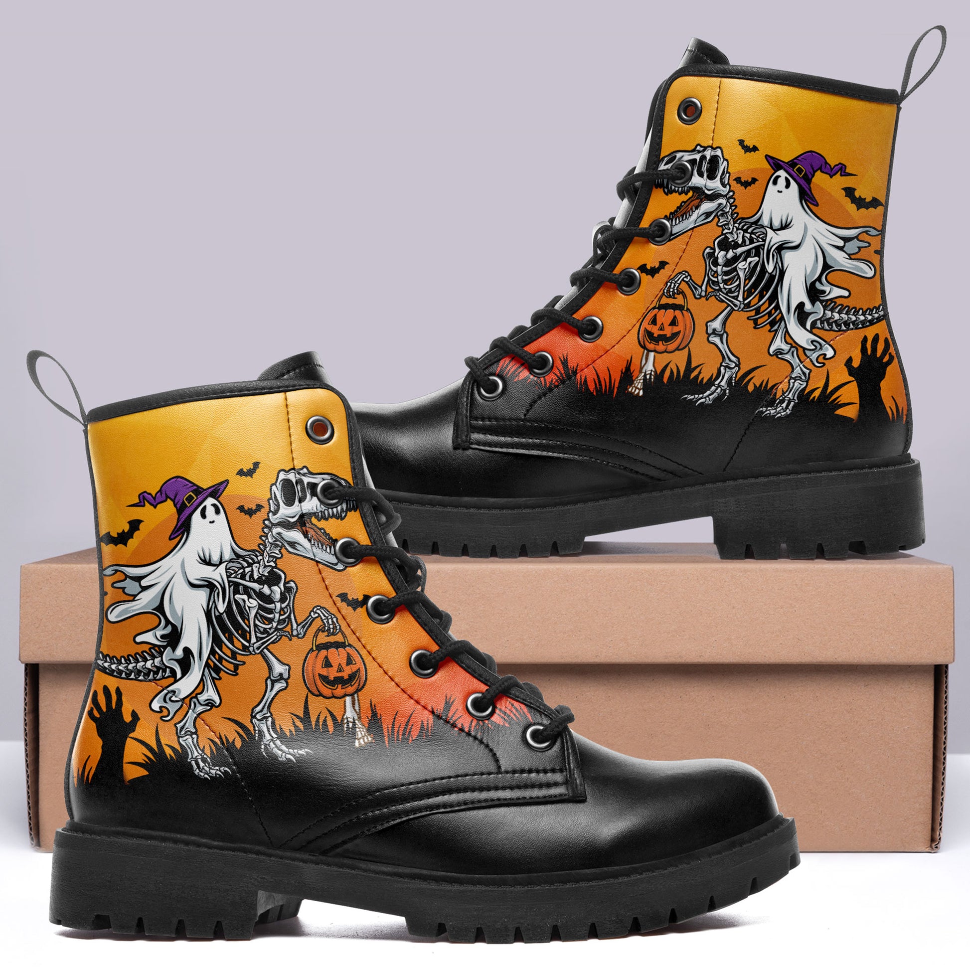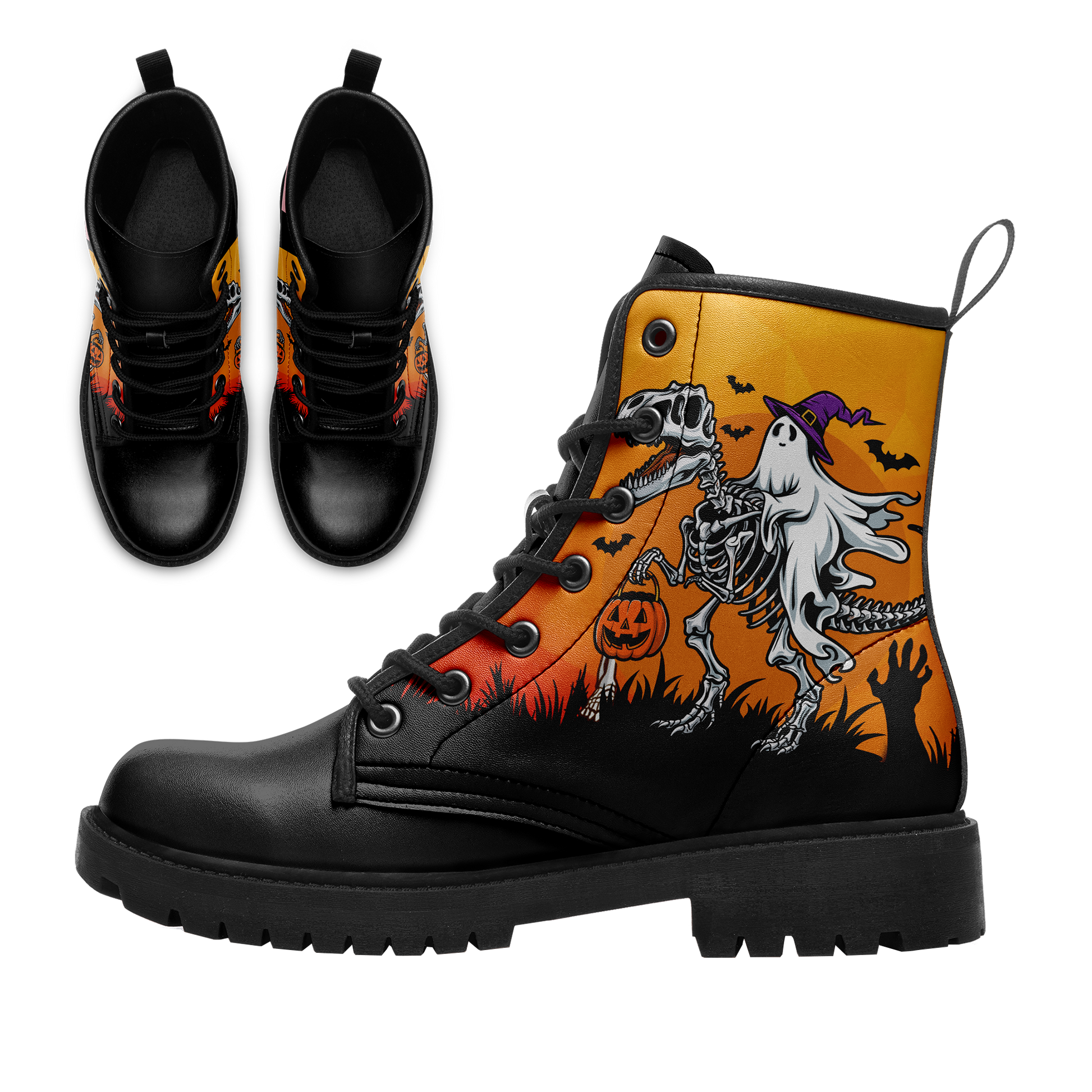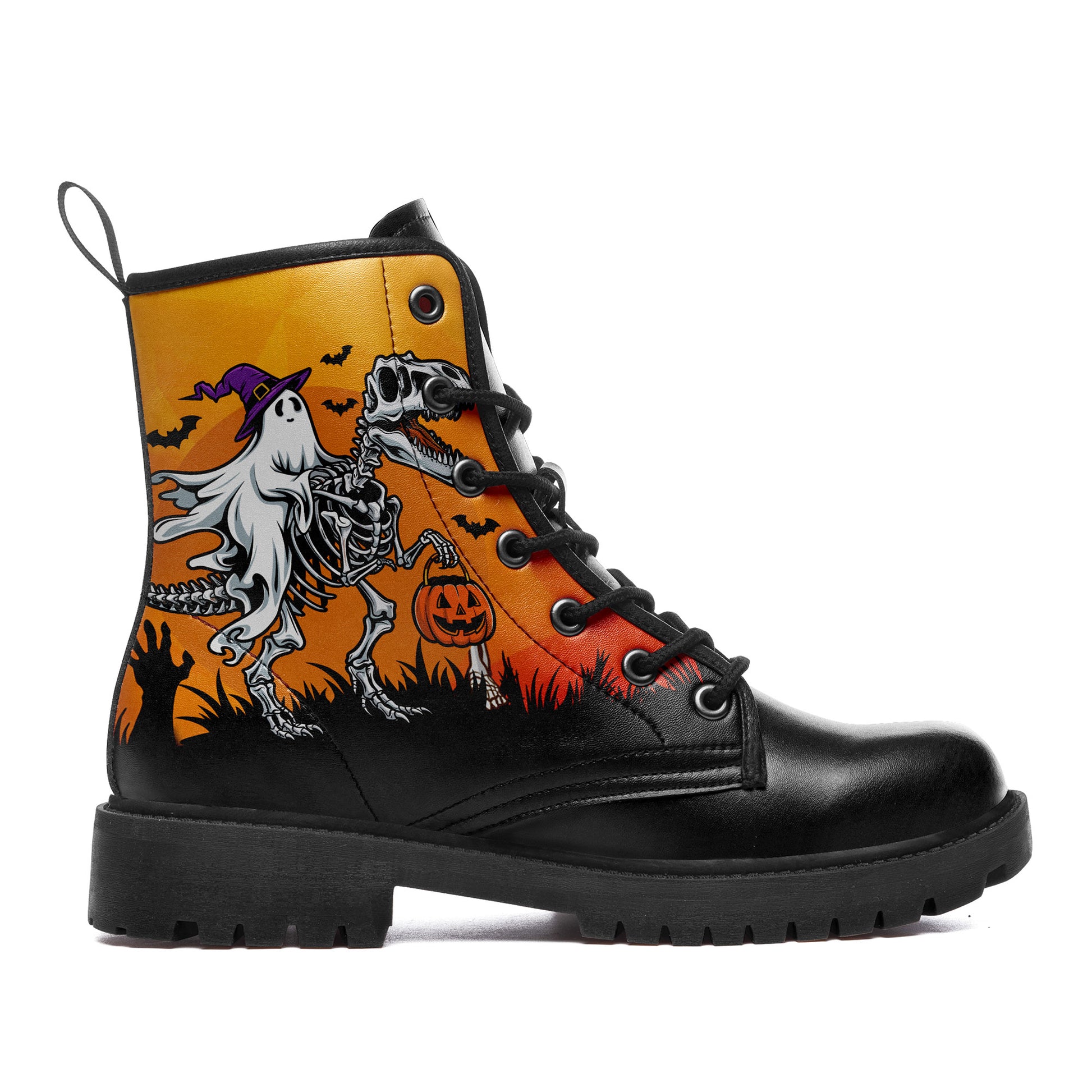 Get ready for a Halloween adventure 65 million years in the making! These **Skeleton T-Rex & Ghost Combat Boots** feature the most unlikely (and adorable) trick-or-treating duo you've ever seen.