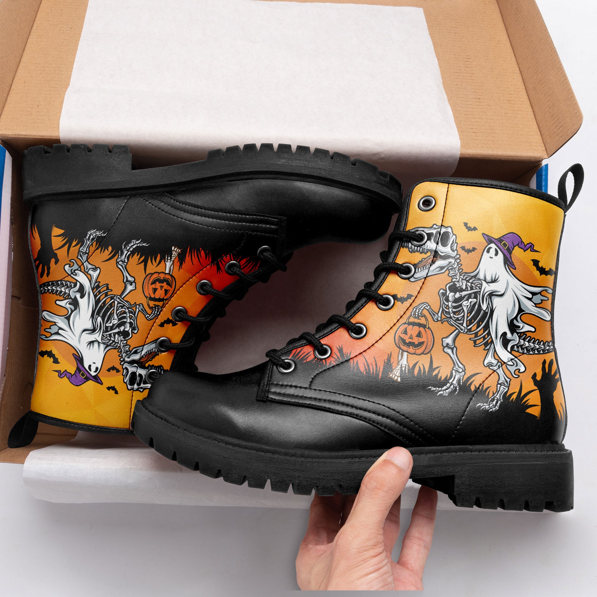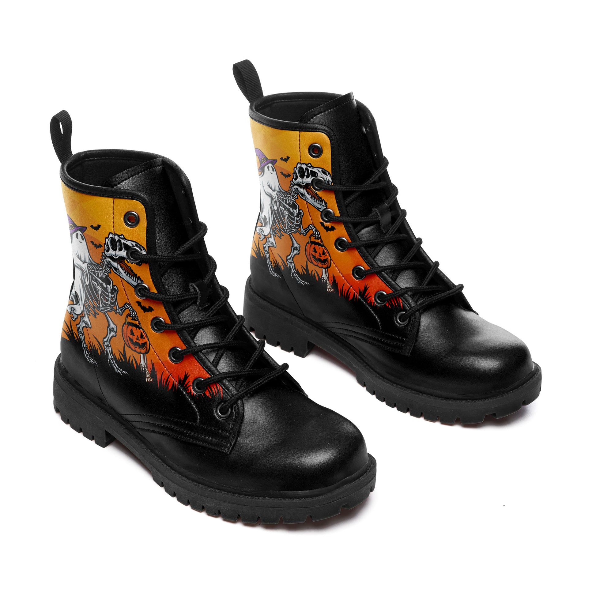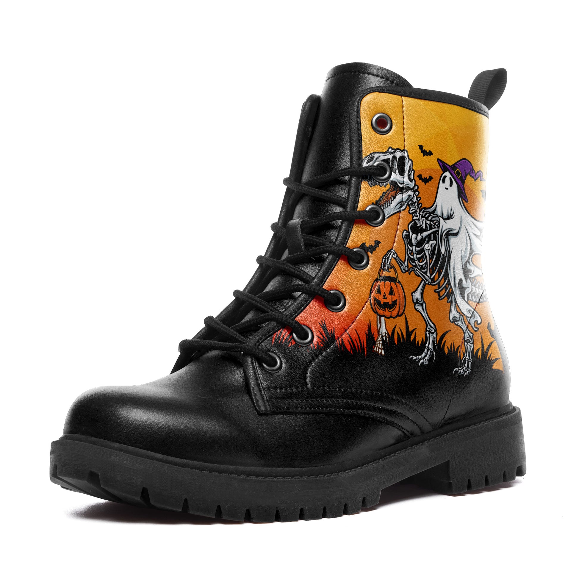 Get ready for a Halloween adventure 65 million years in the making! These **Skeleton T-Rex & Ghost Combat Boots** feature the most unlikely (and adorable) trick-or-treating duo you've ever seen.