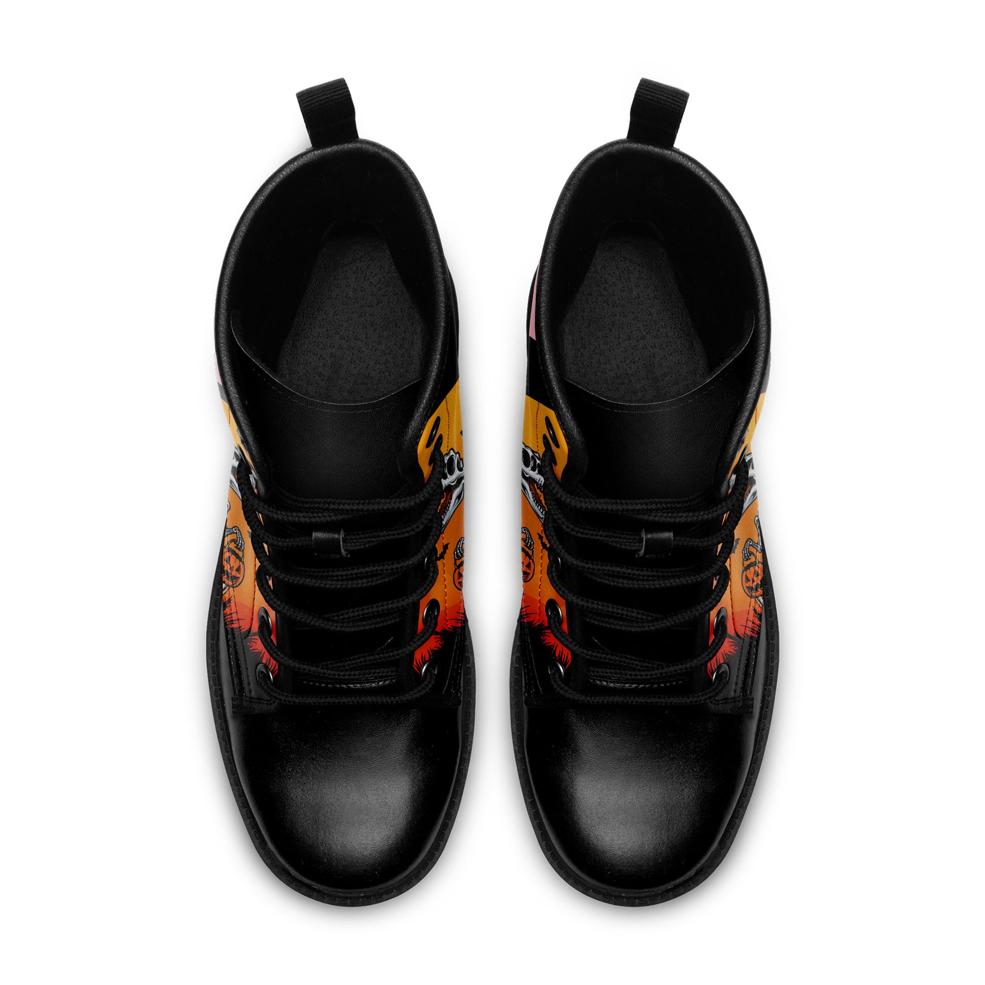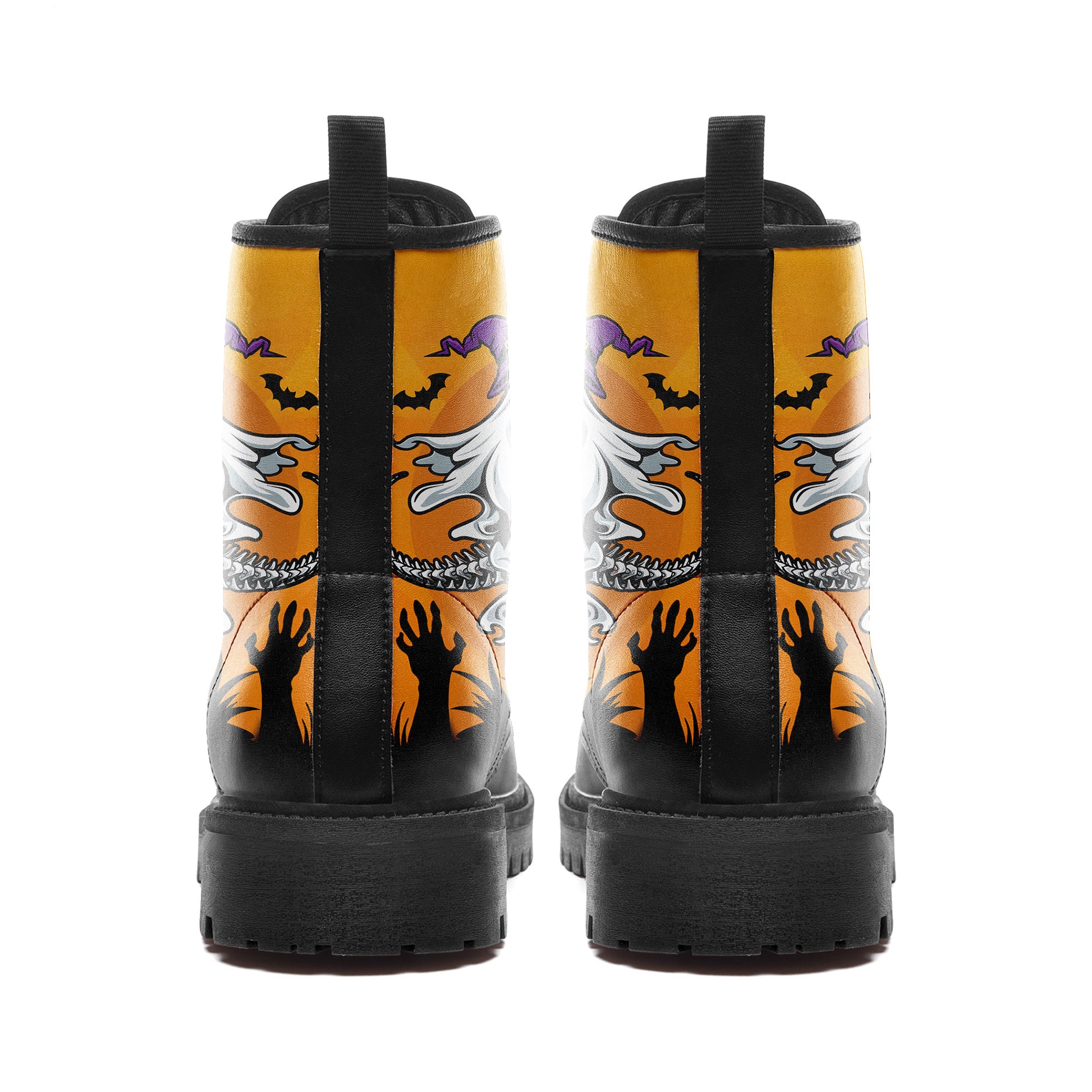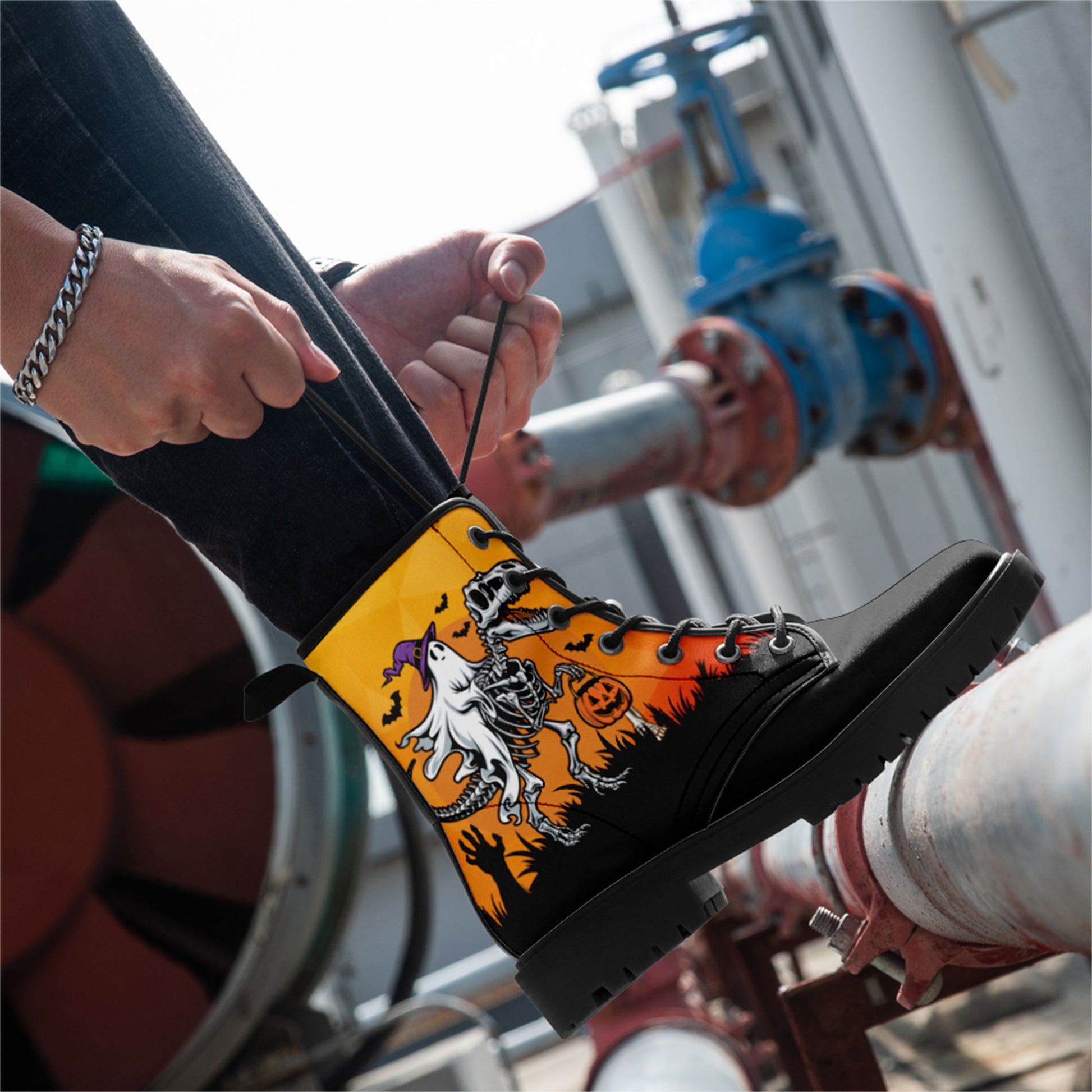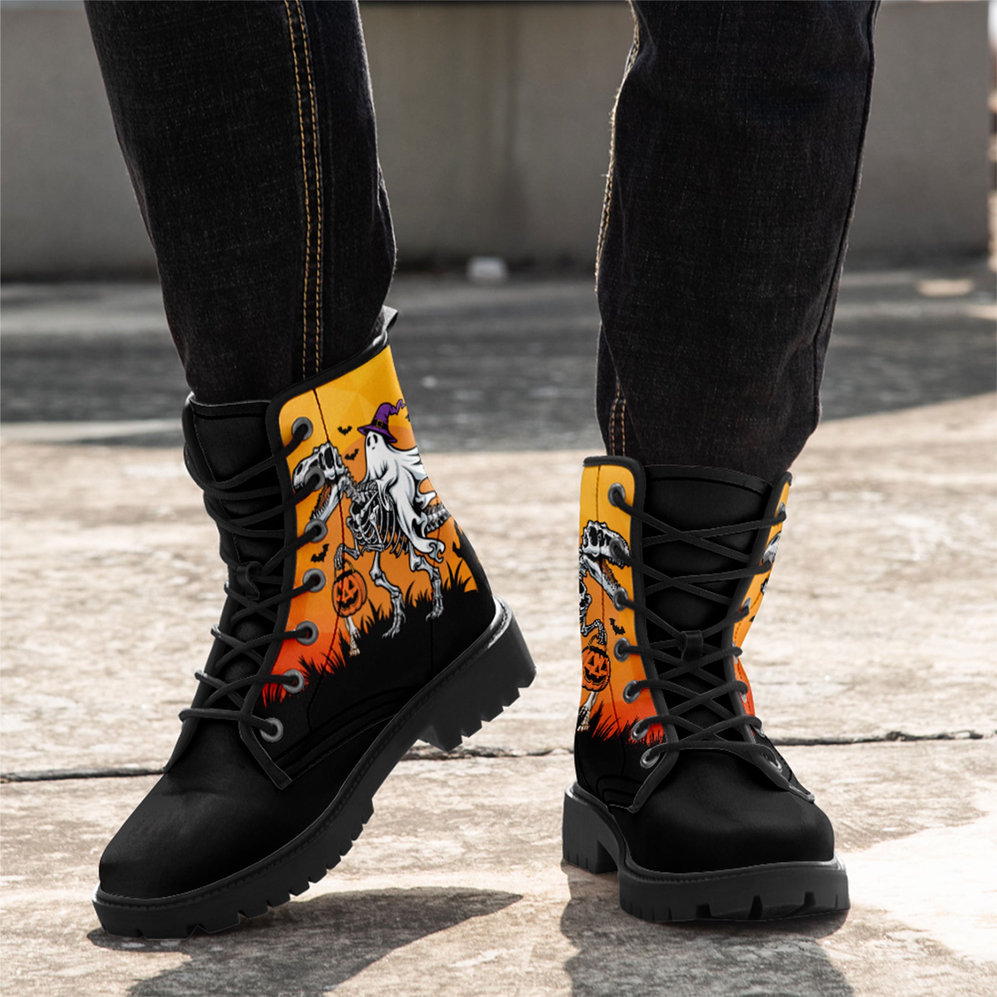 Get ready for a Halloween adventure 65 million years in the making! These **Skeleton T-Rex & Ghost Combat Boots** feature the most unlikely (and adorable) trick-or-treating duo you've ever seen.