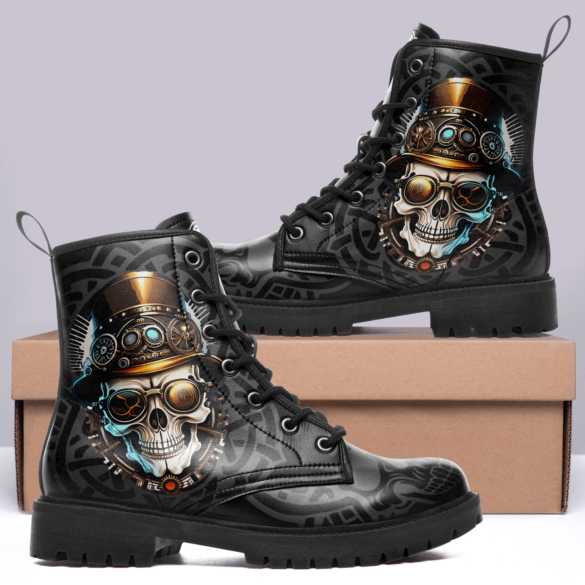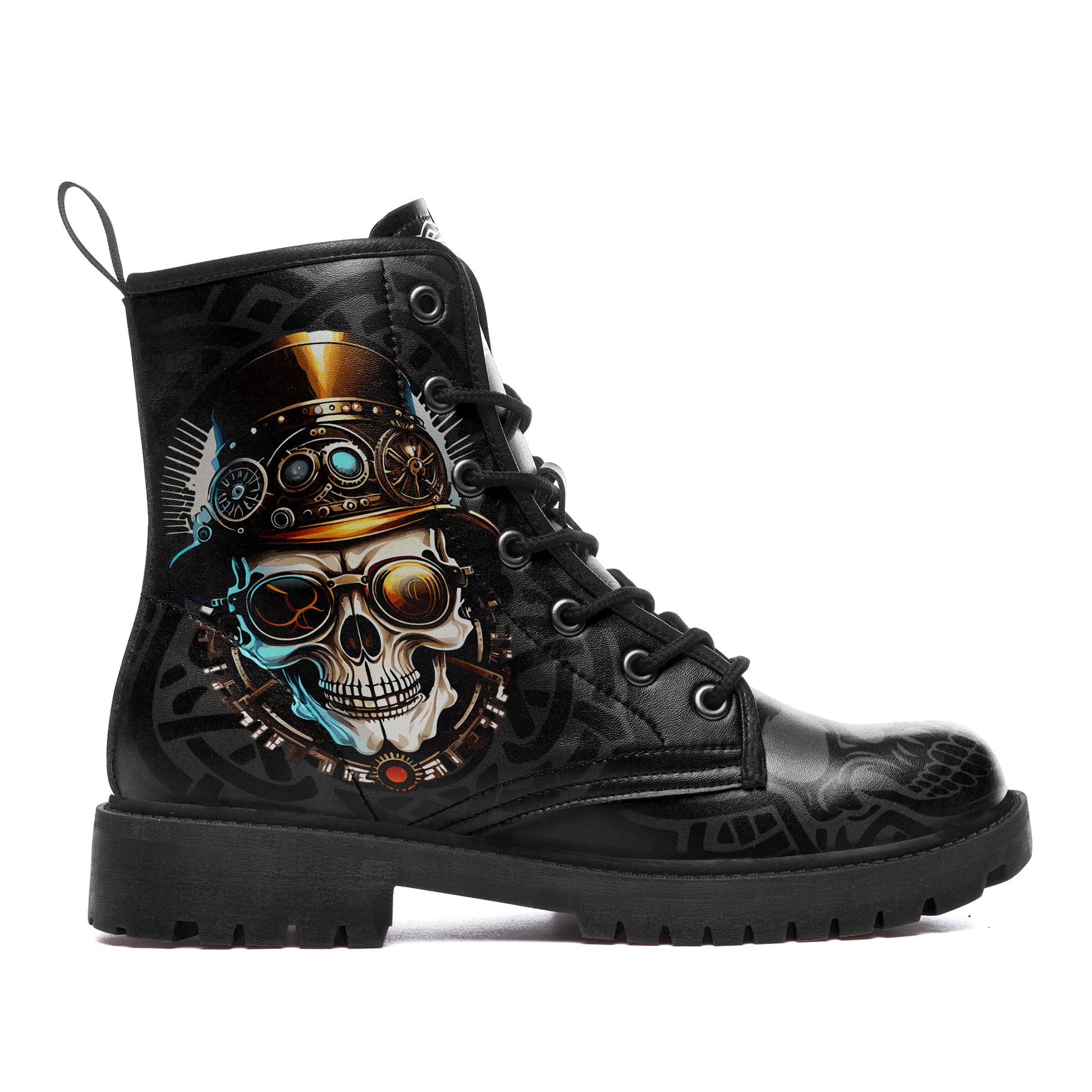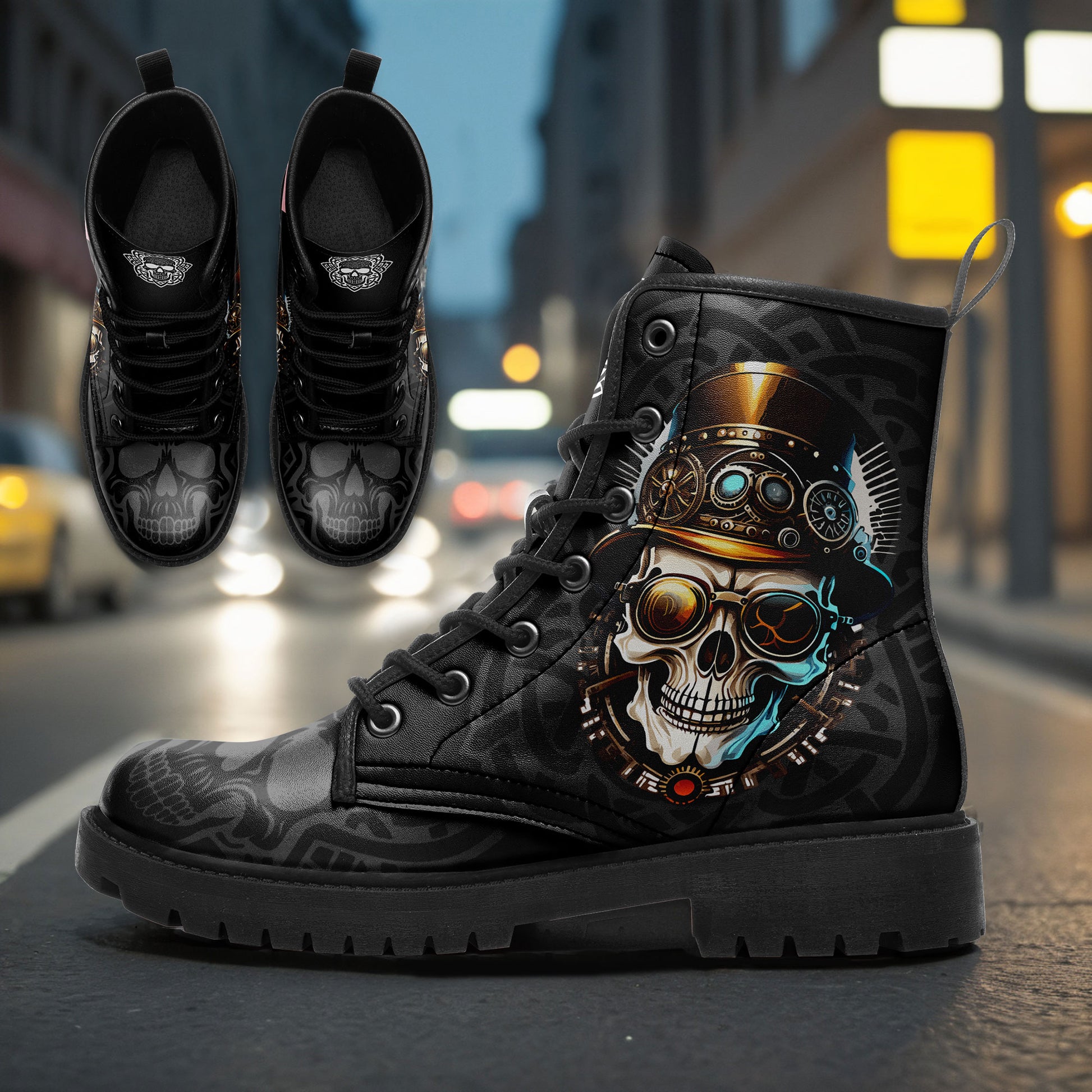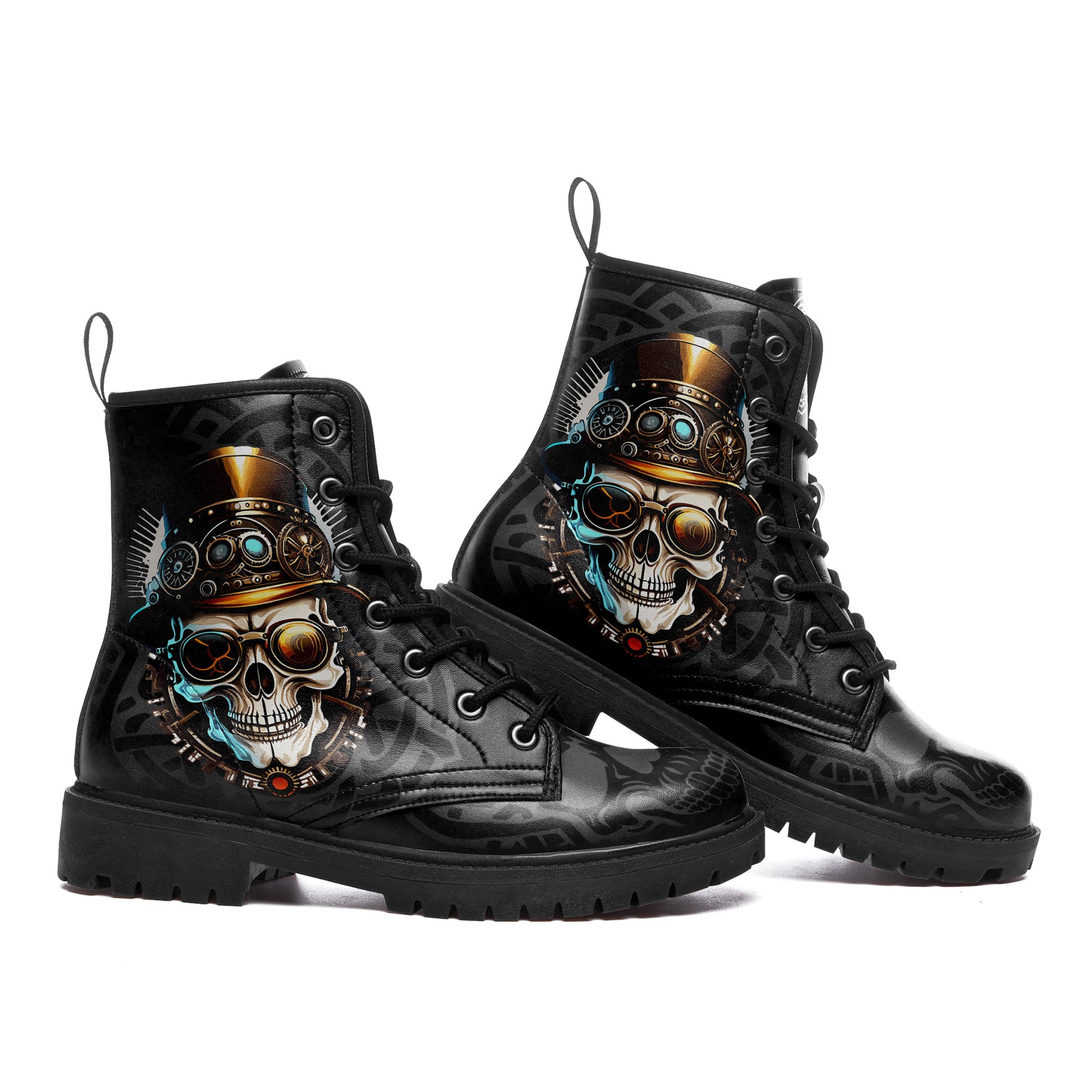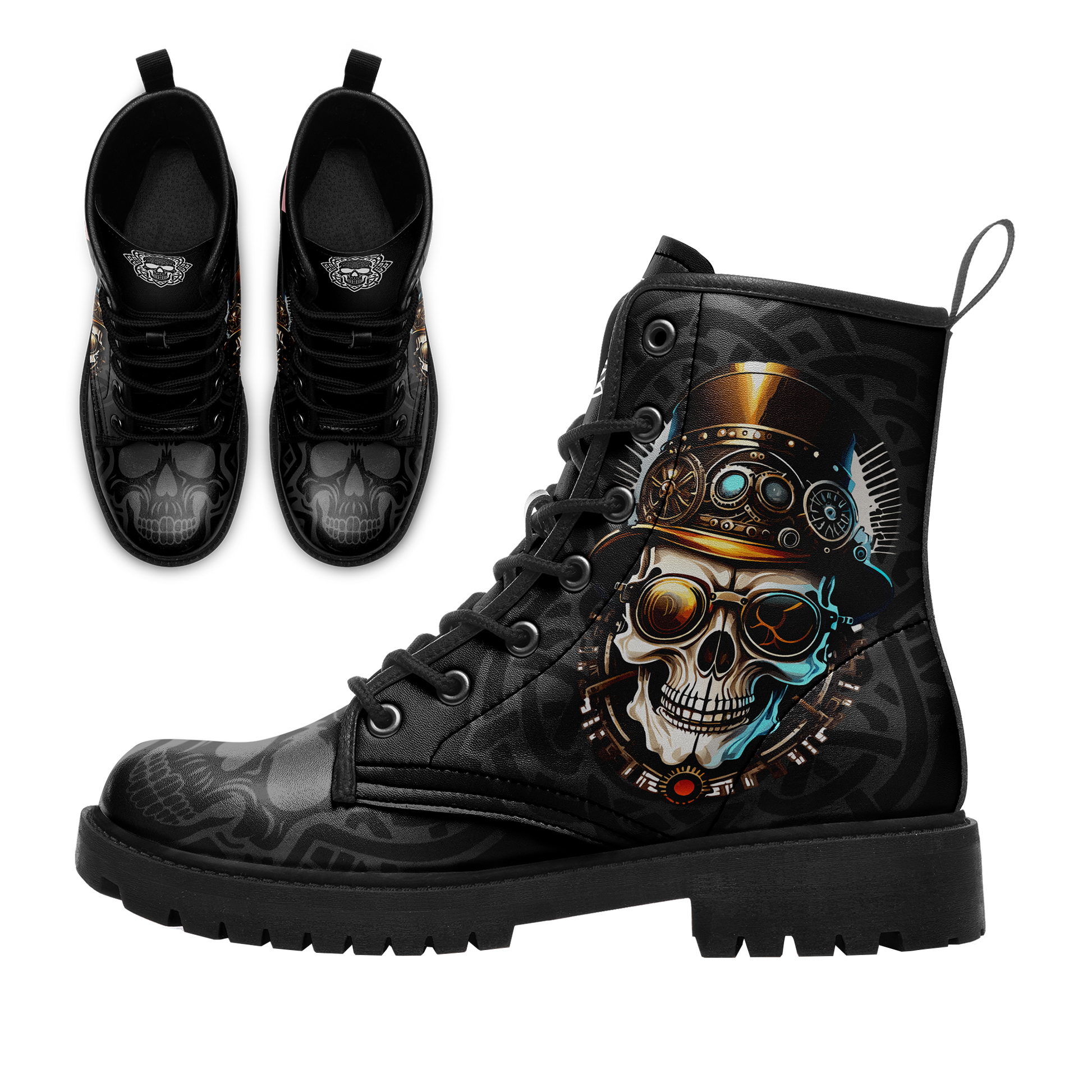 Enter a world of steam, brass, and revolution. These boots are a tribute to the retro-futuristic vision of the Victorian era. Featuring a grinning skull decked out in a **gentleman's top hat** and **brass aviator goggles**, this design captures the essence of industrial grit and elegance.