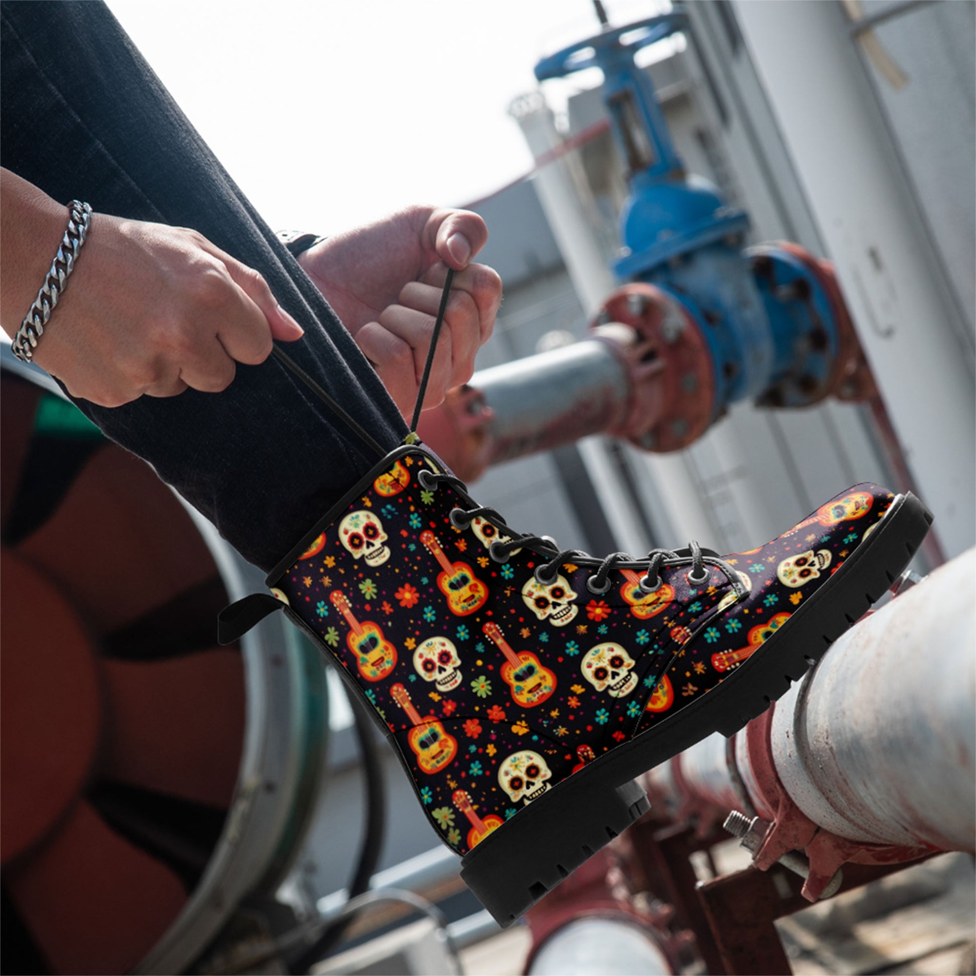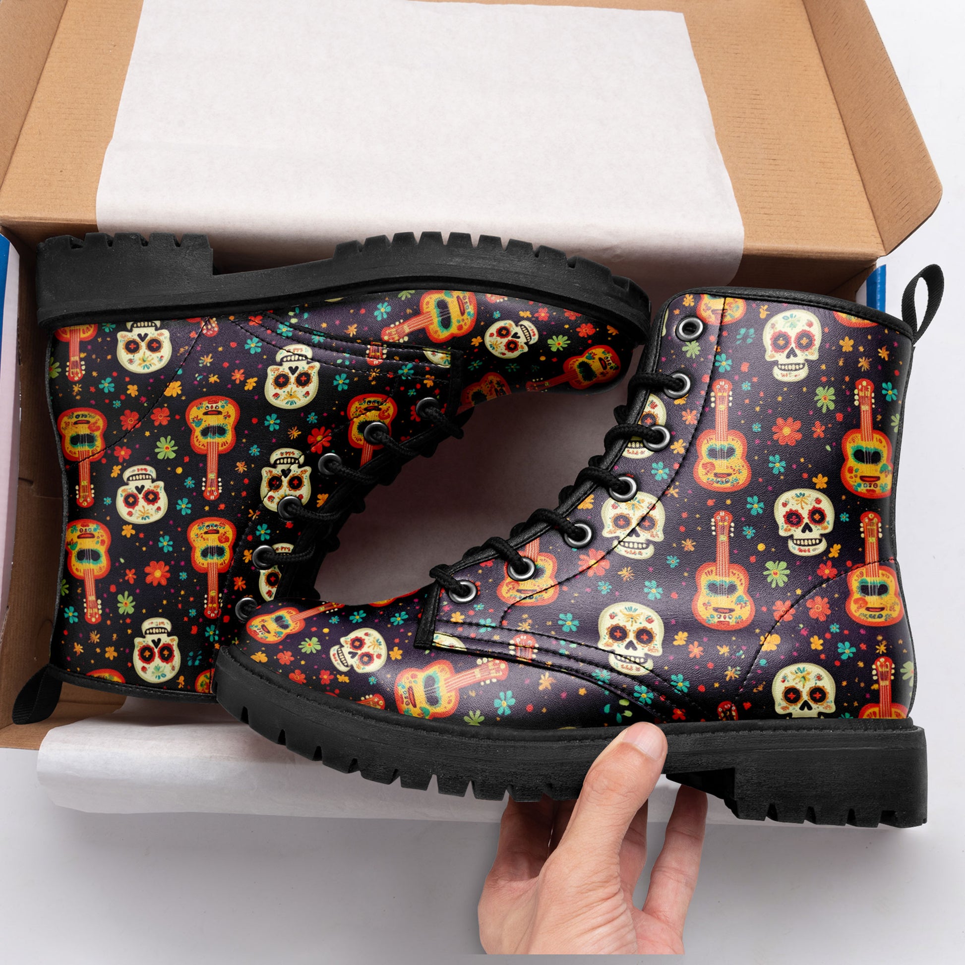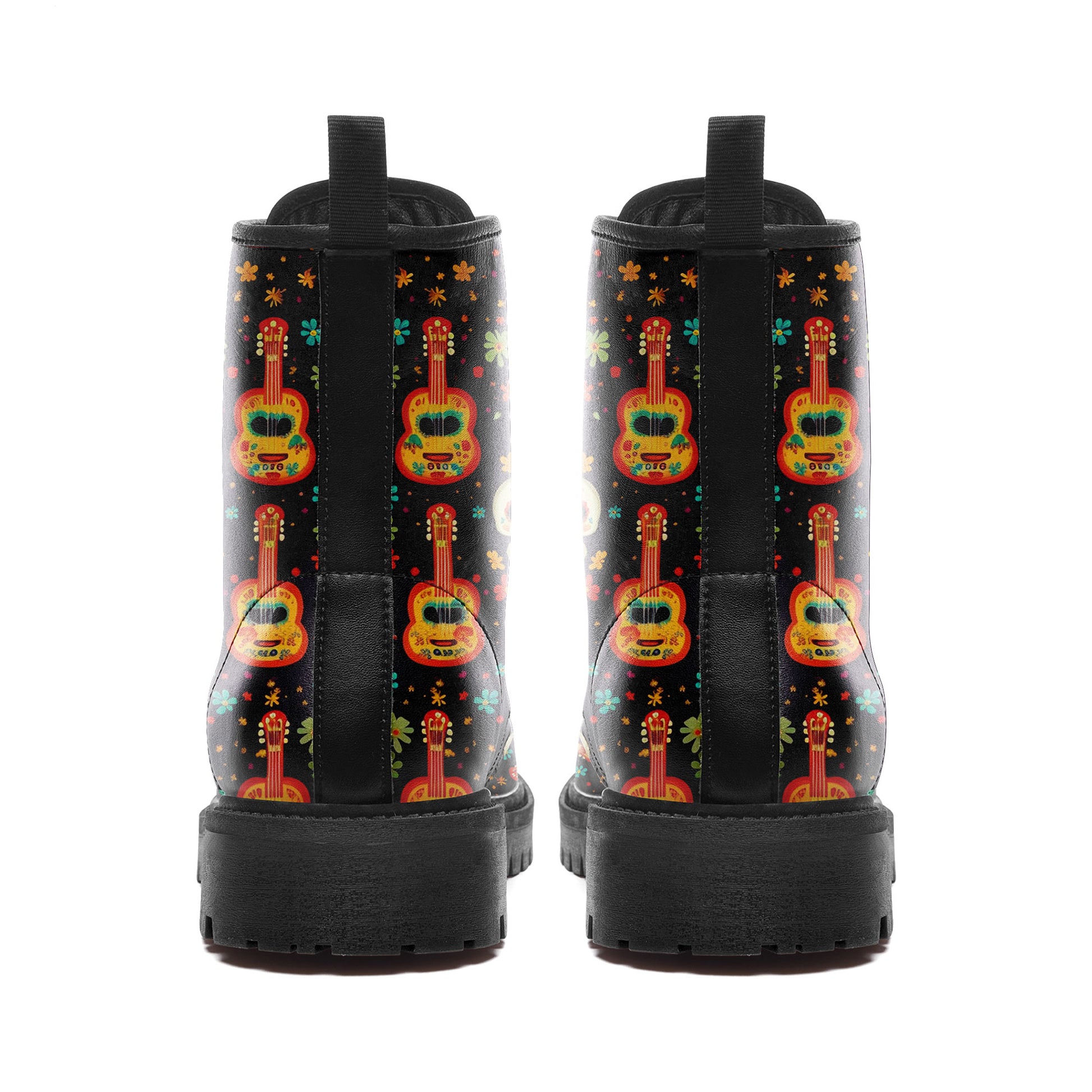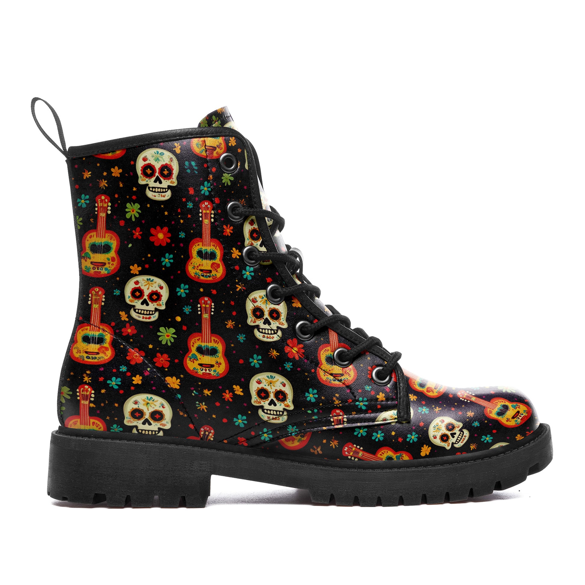 Feel the rhythm of the fiesta. These combat boots are a vibrant celebration of music, life, and tradition. The unique all-over print features **colorful acoustic guitars** dancing alongside intricate **sugar skulls**, set against a deep black background.