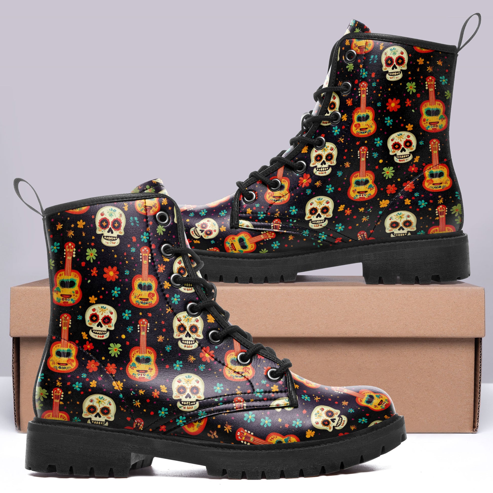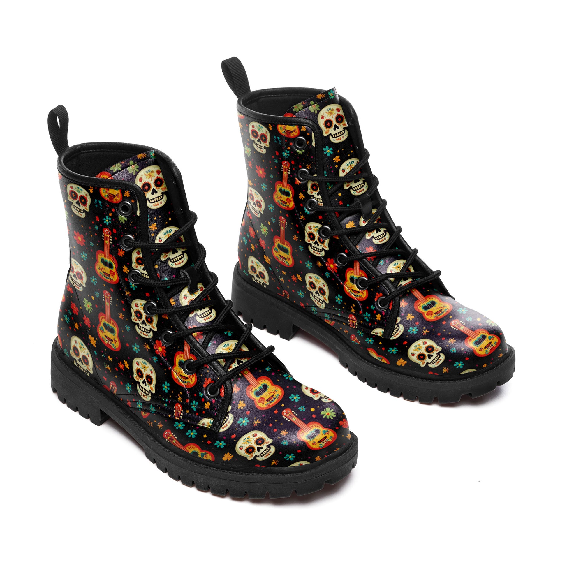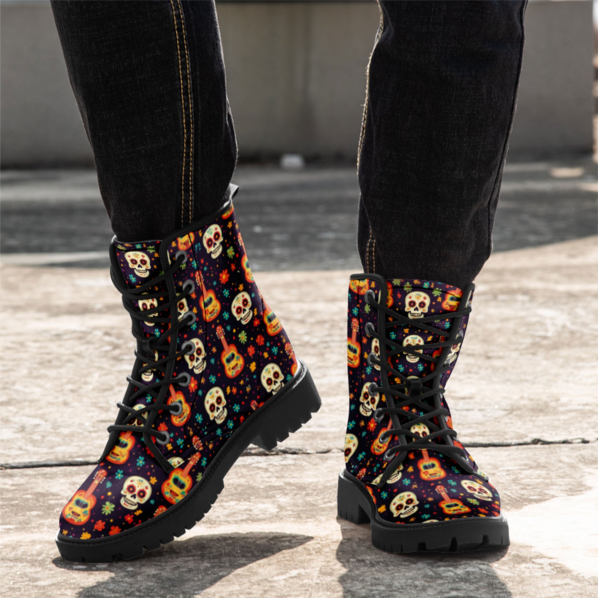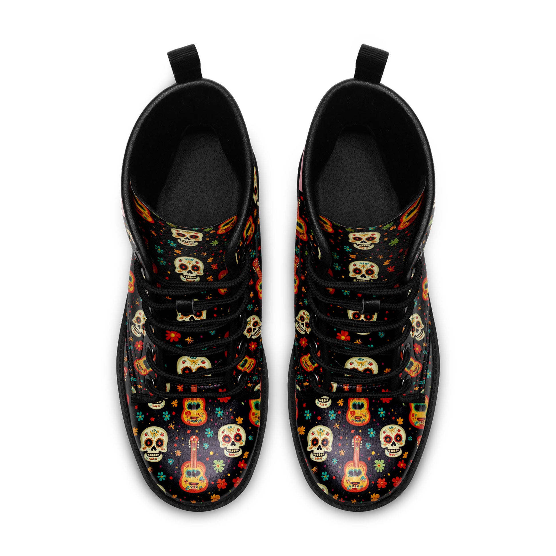 Feel the rhythm of the fiesta. These combat boots are a vibrant celebration of music, life, and tradition. The unique all-over print features **colorful acoustic guitars** dancing alongside intricate **sugar skulls**, set against a deep black background.