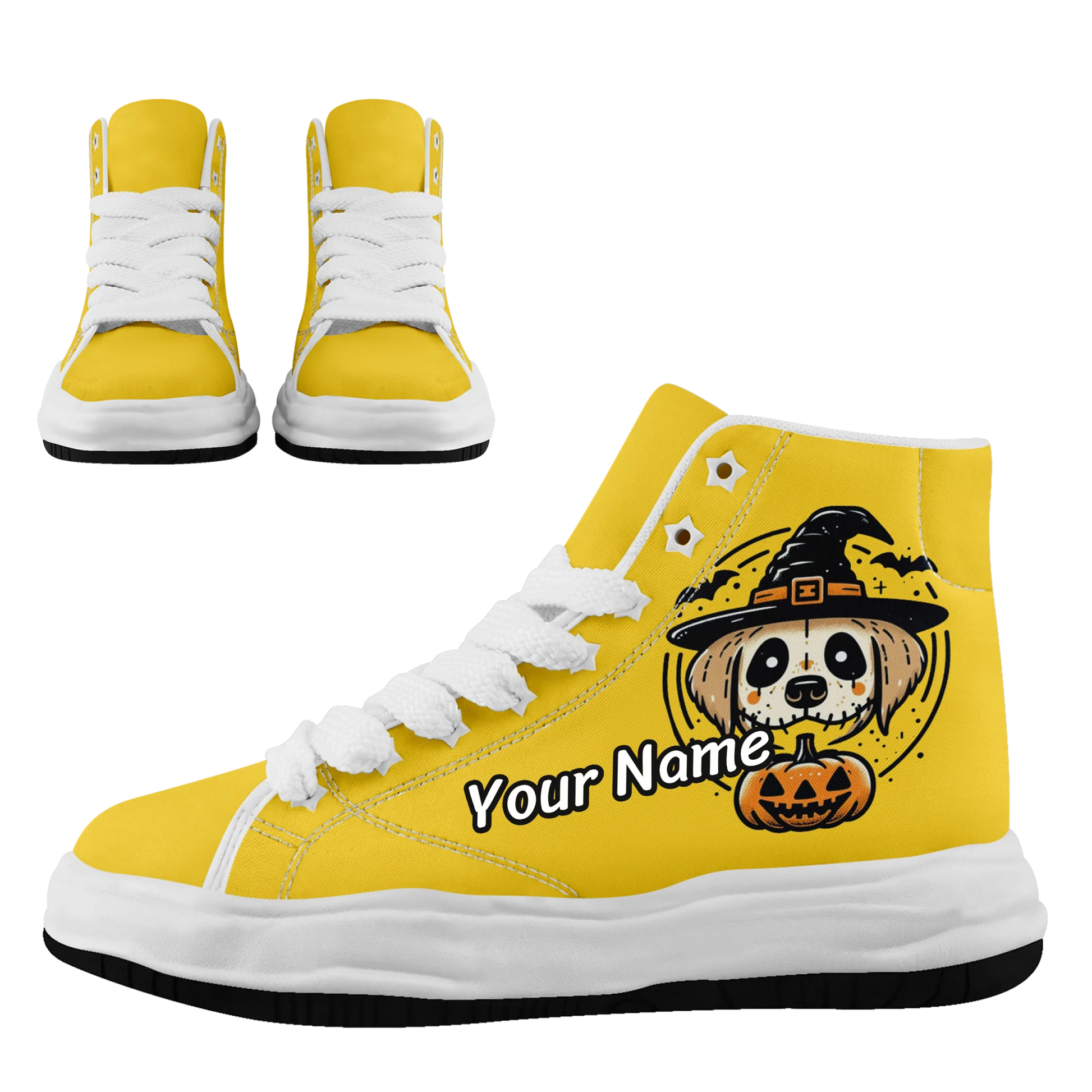 Get ready for the most adorable haunting ever! These cheerful yellow high-tops feature the cutest puppy witch, ready for a Halloween adventure with his little pumpkin pal. This "too cute to spook" design is sure to bring smiles wherever you go. With a comfy fit and a whole lot of charm, they're the perfect treat for dog lovers this spooky season!