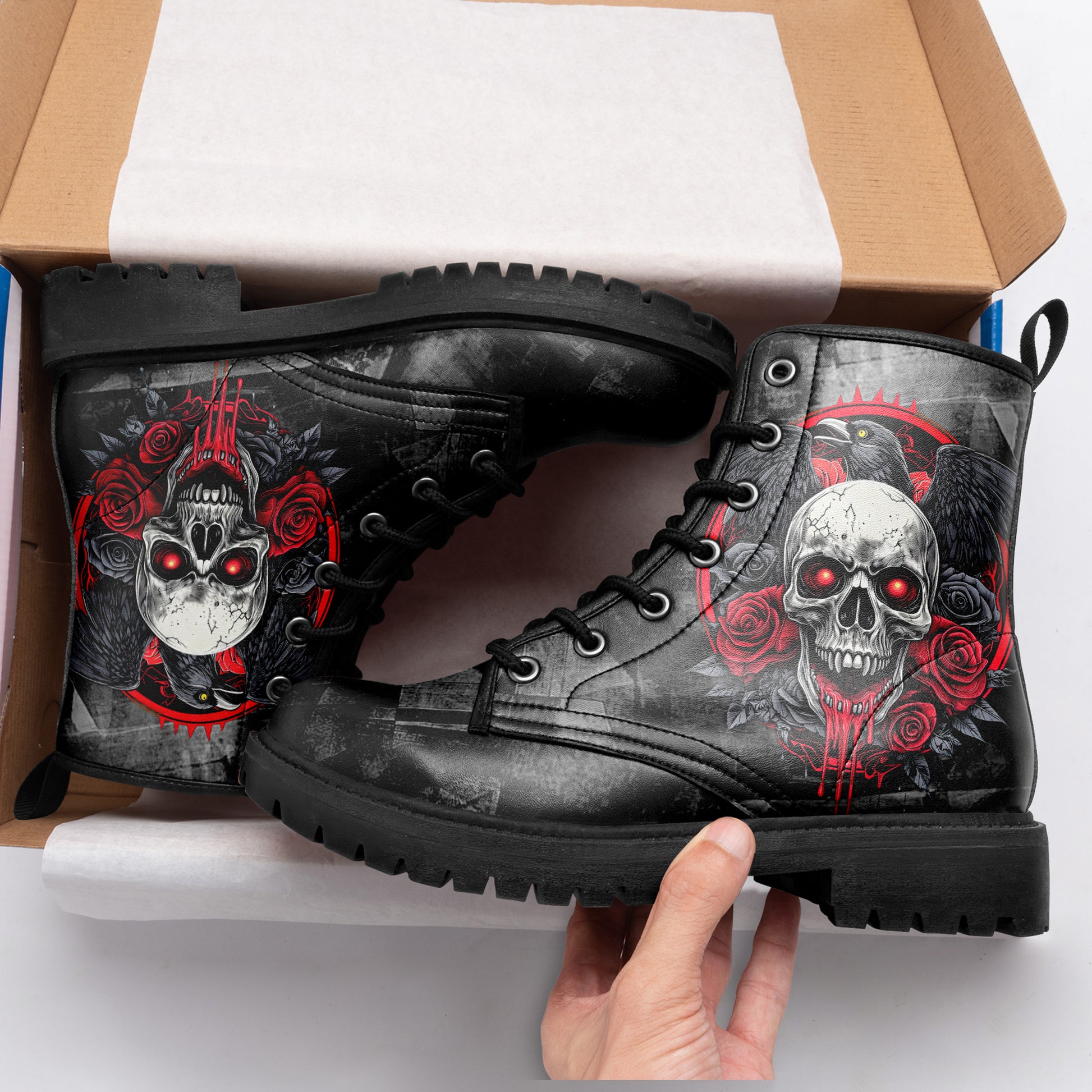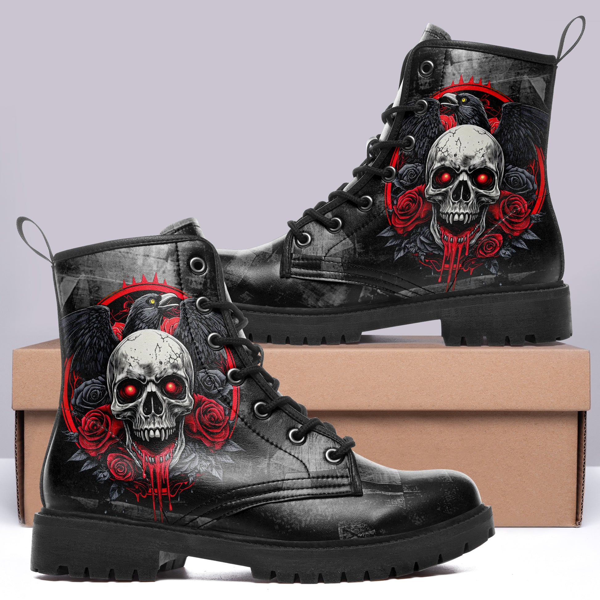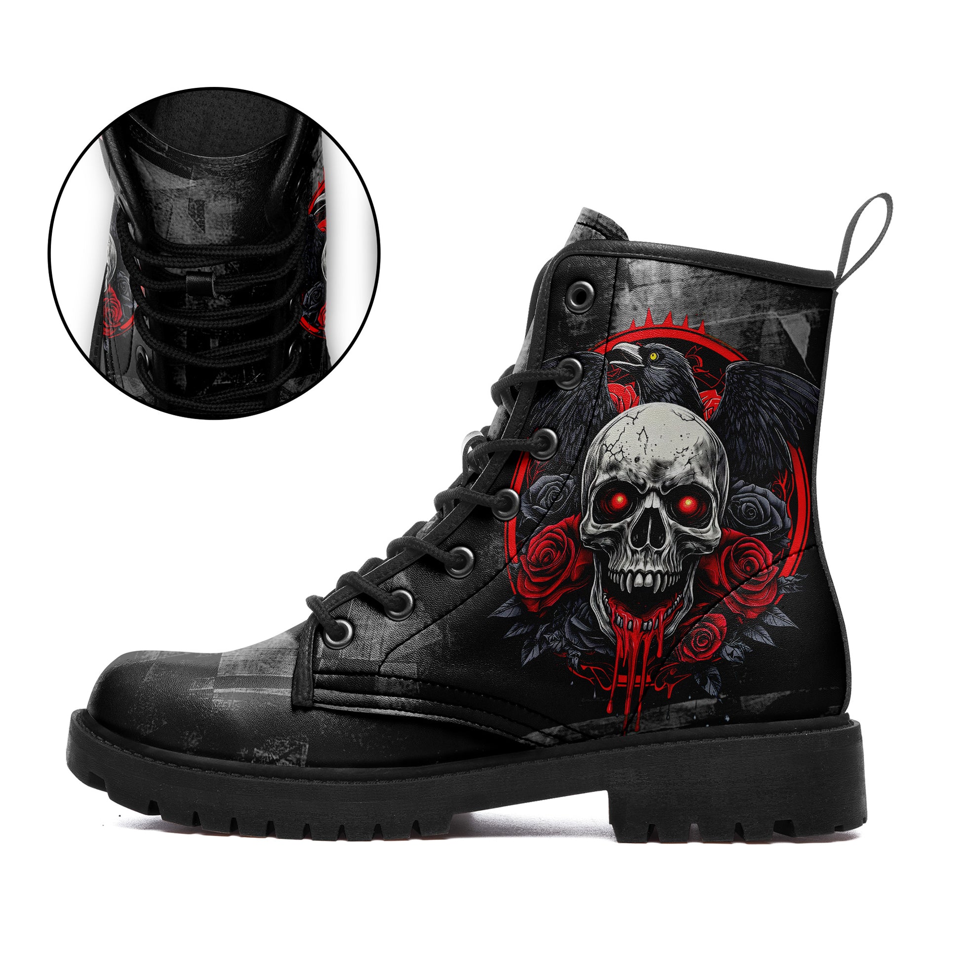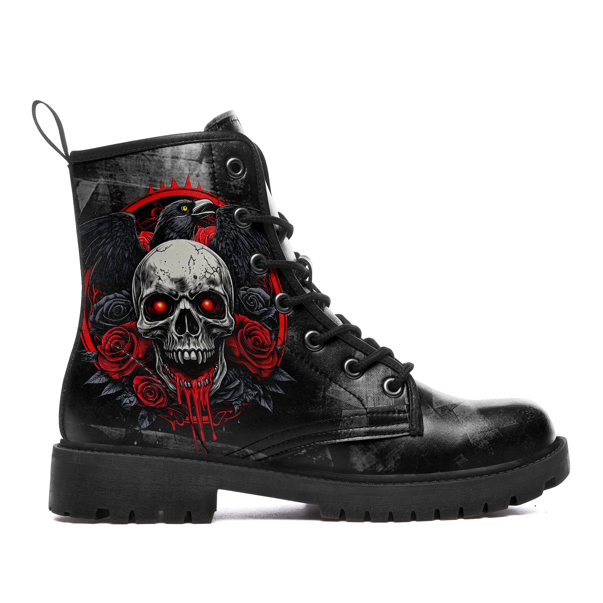 Order in chaos. Beauty in destruction. These combat boots are a visceral tribute to the **Trash Polka tattoo aesthetic**. A terrifying **skull with glowing red eyes** drips blood, while a **black raven** watches silently from above.