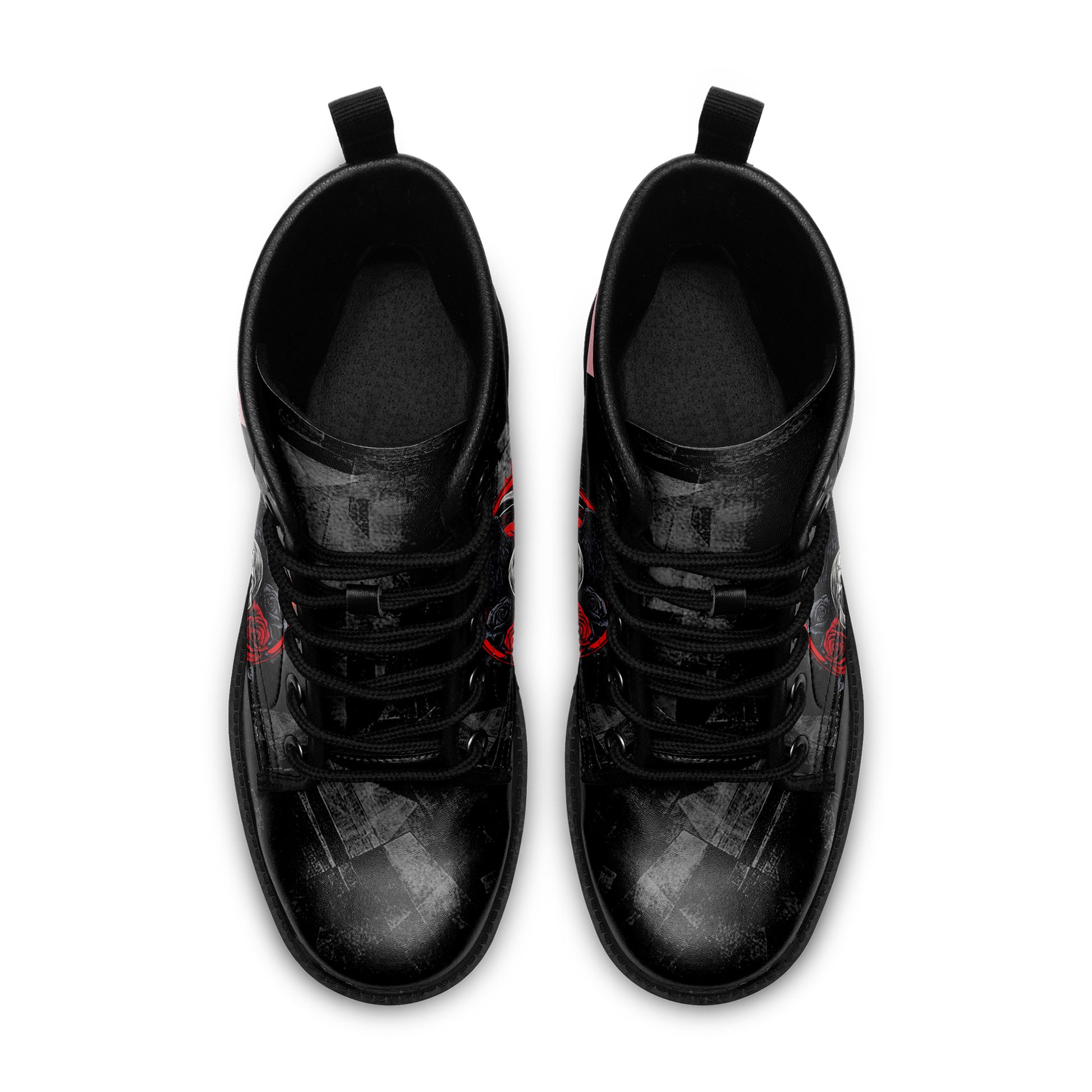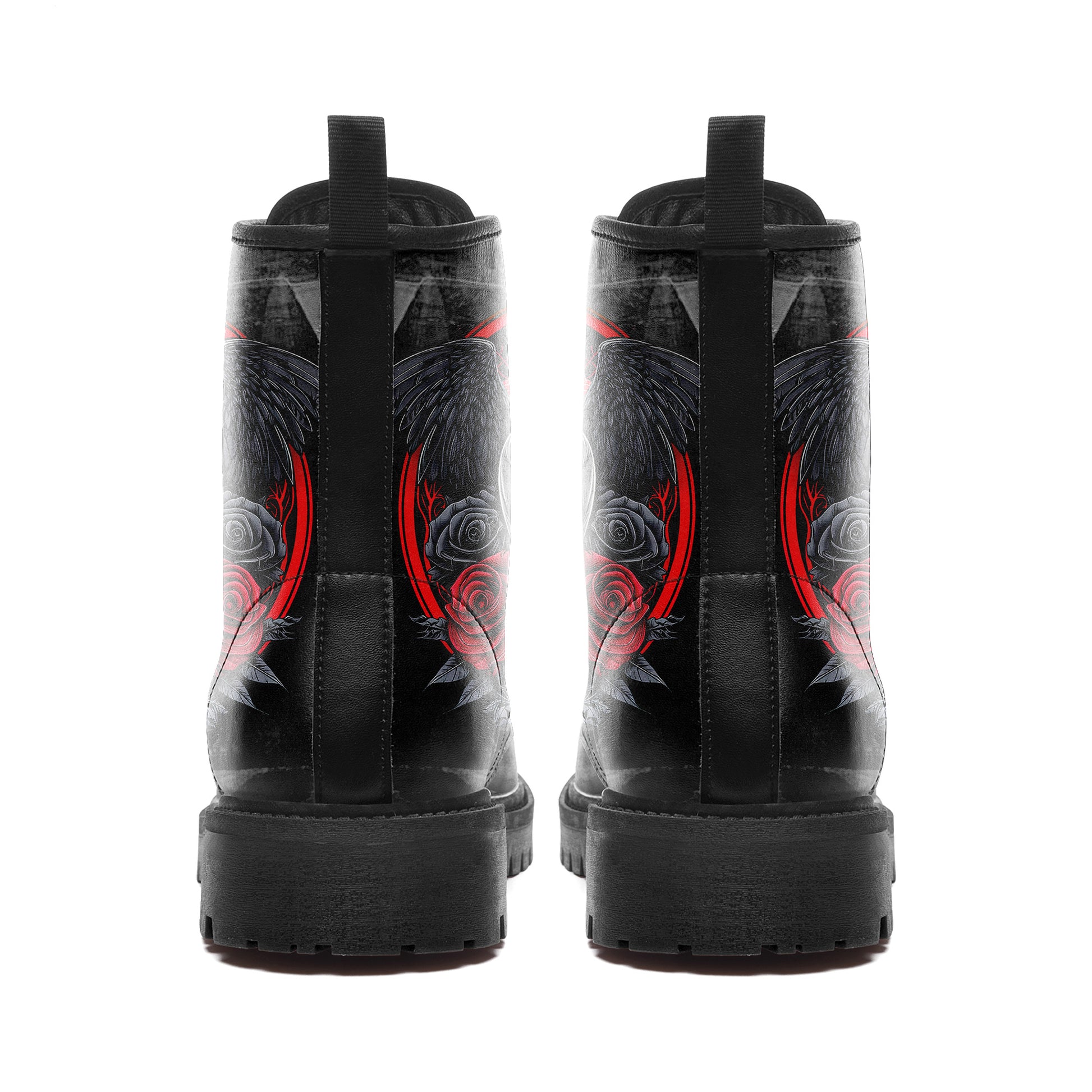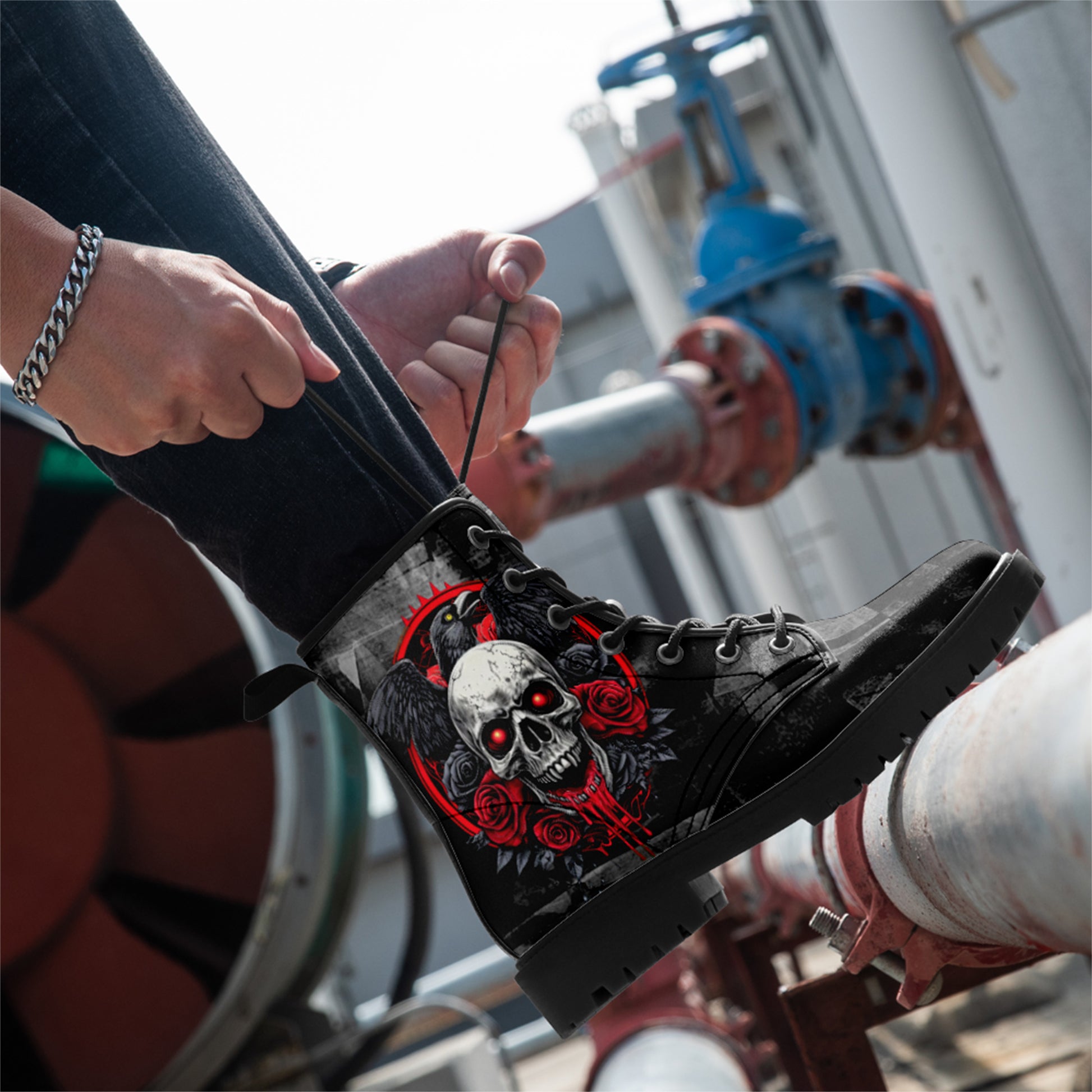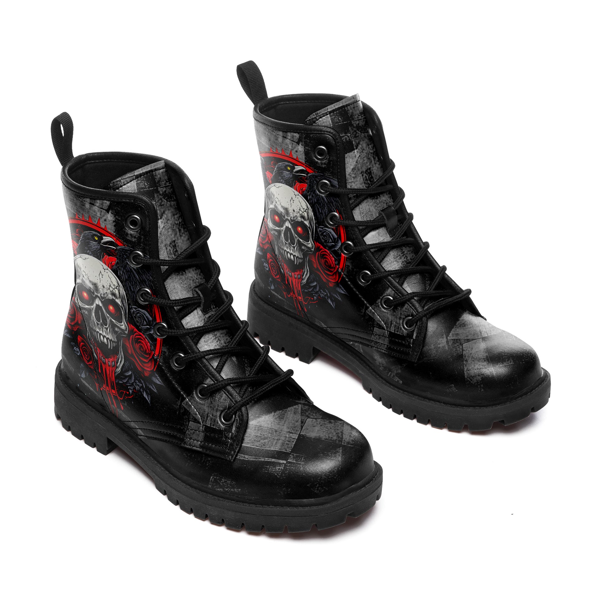 Order in chaos. Beauty in destruction. These combat boots are a visceral tribute to the **Trash Polka tattoo aesthetic**. A terrifying **skull with glowing red eyes** drips blood, while a **black raven** watches silently from above.