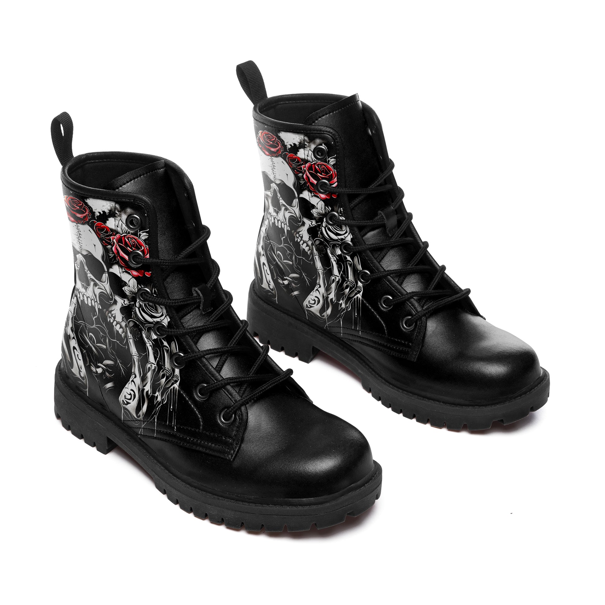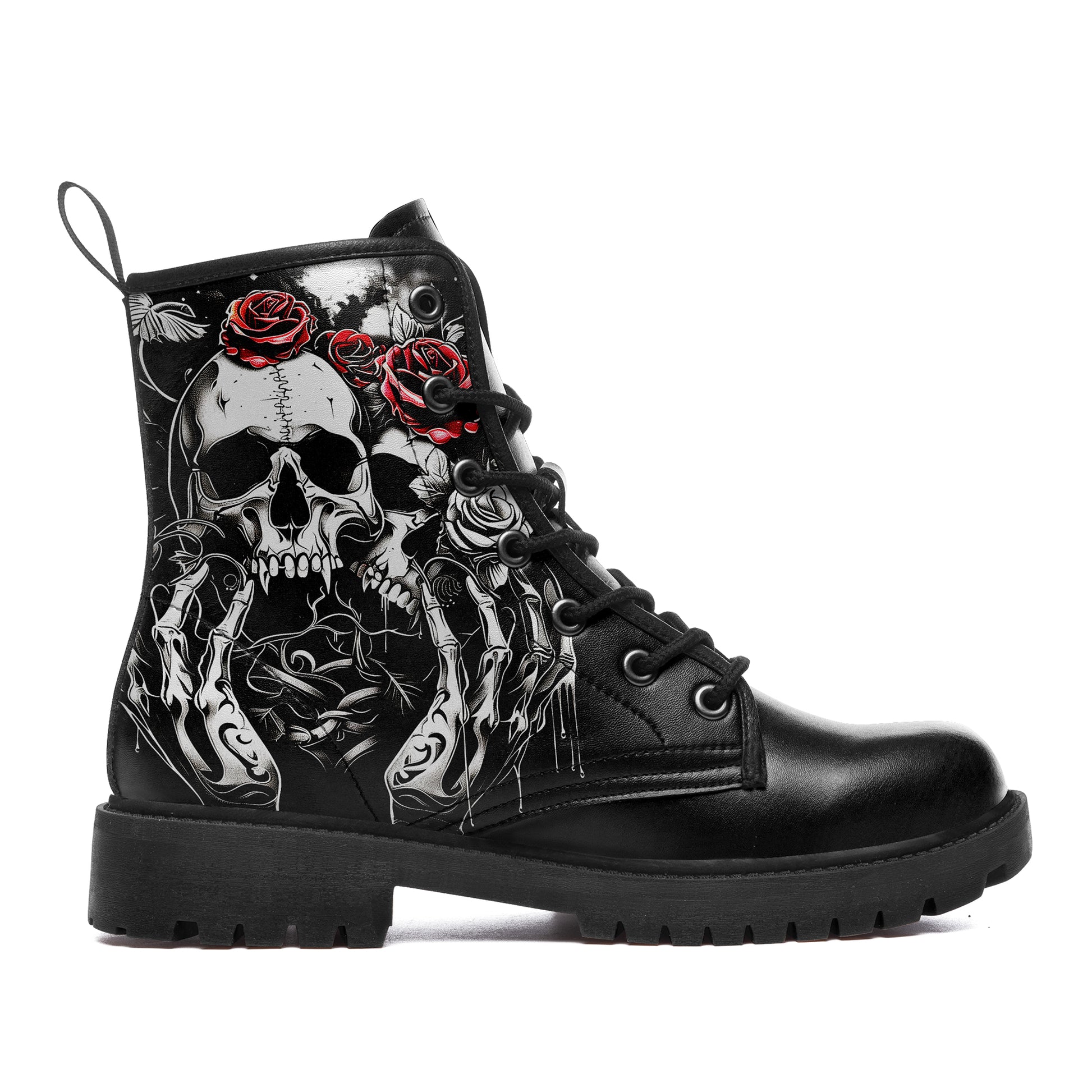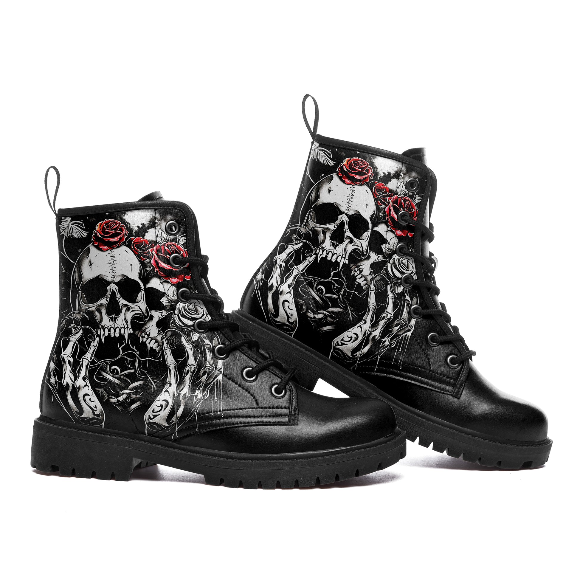 Double the darkness, double the style. These combat boots feature a masterful **tattoo-style illustration of two skulls**, resting side-by-side in eternal slumber. Framed by reaching **skeletal hands** and blooming **crimson roses**, this design is a complex and beautiful study of mortality and connection.