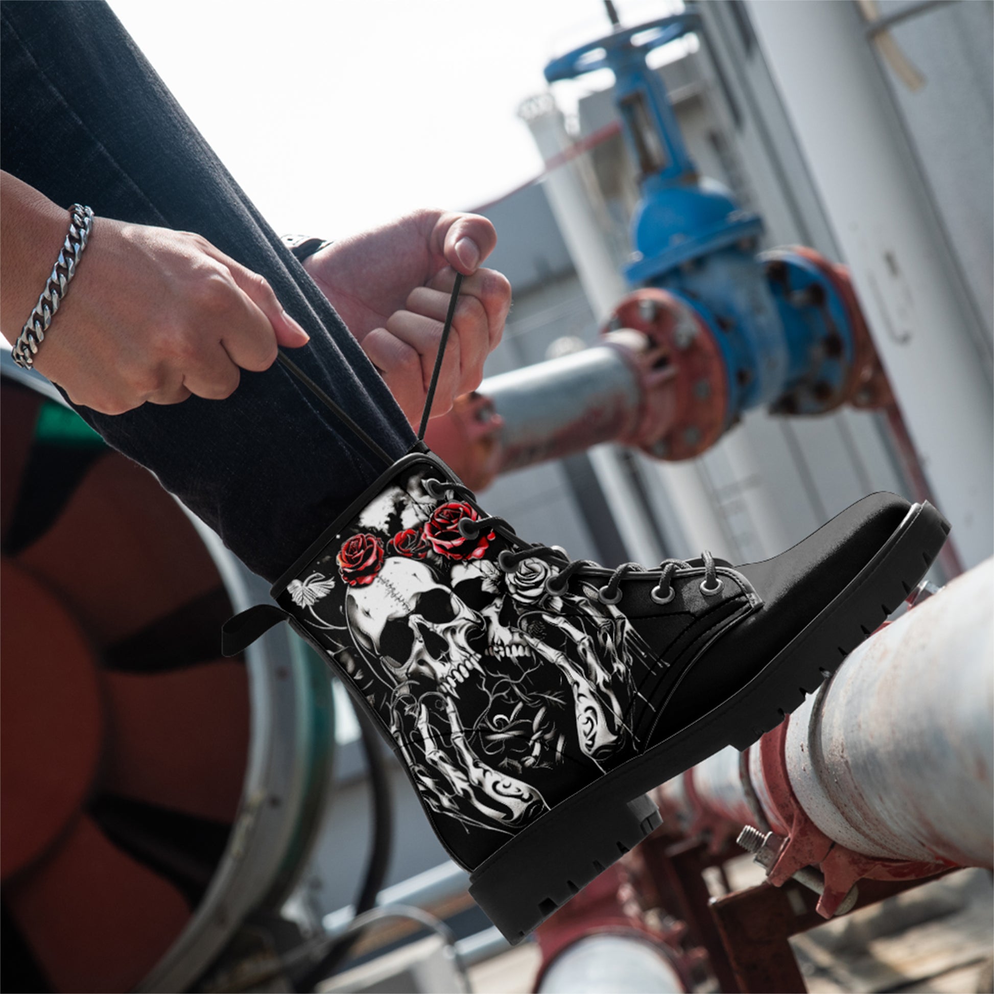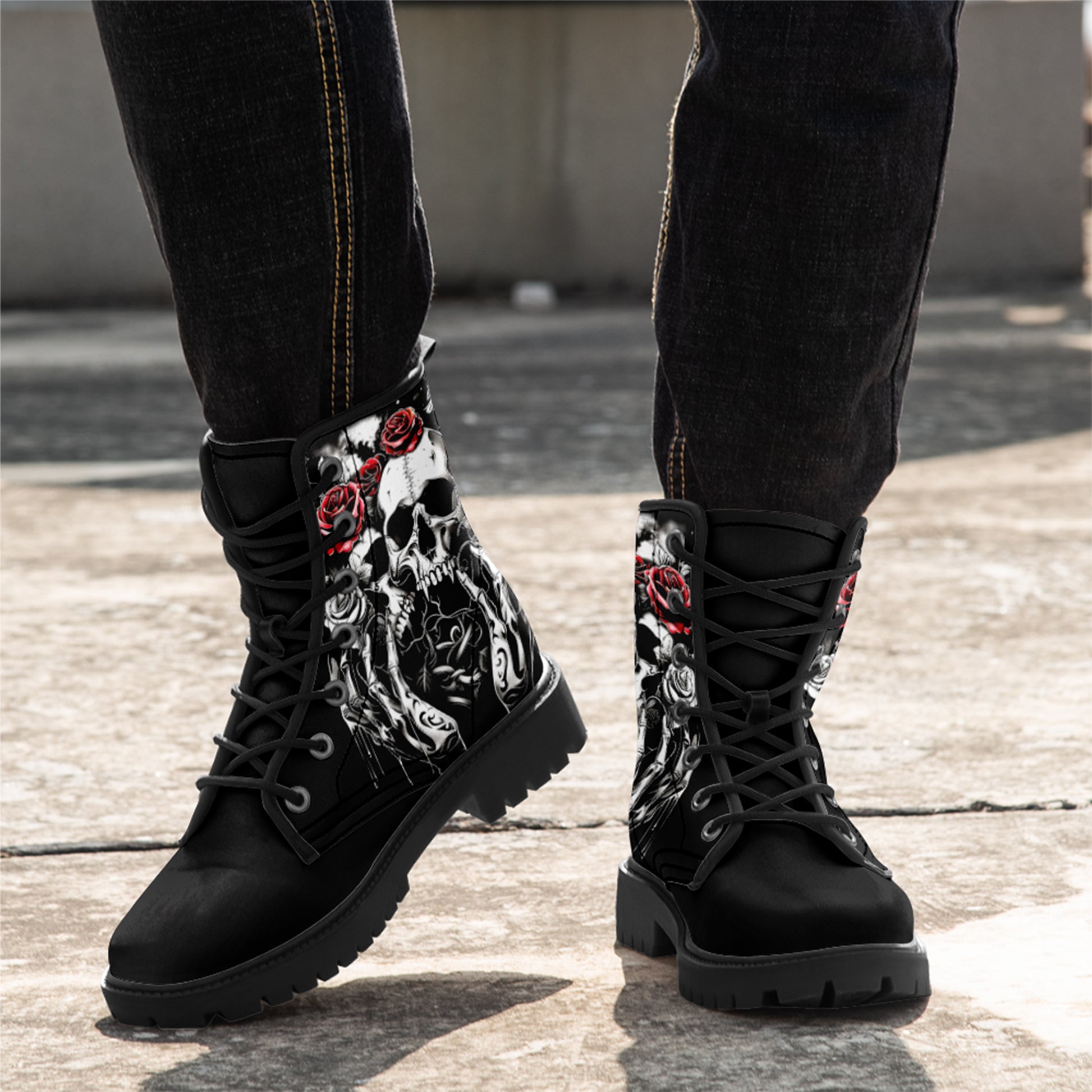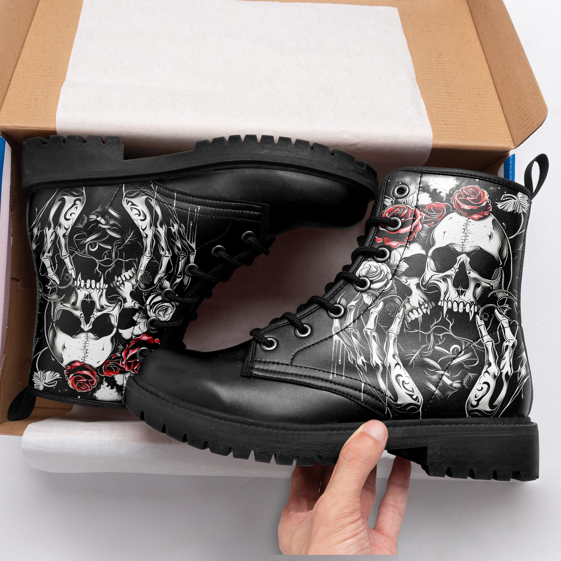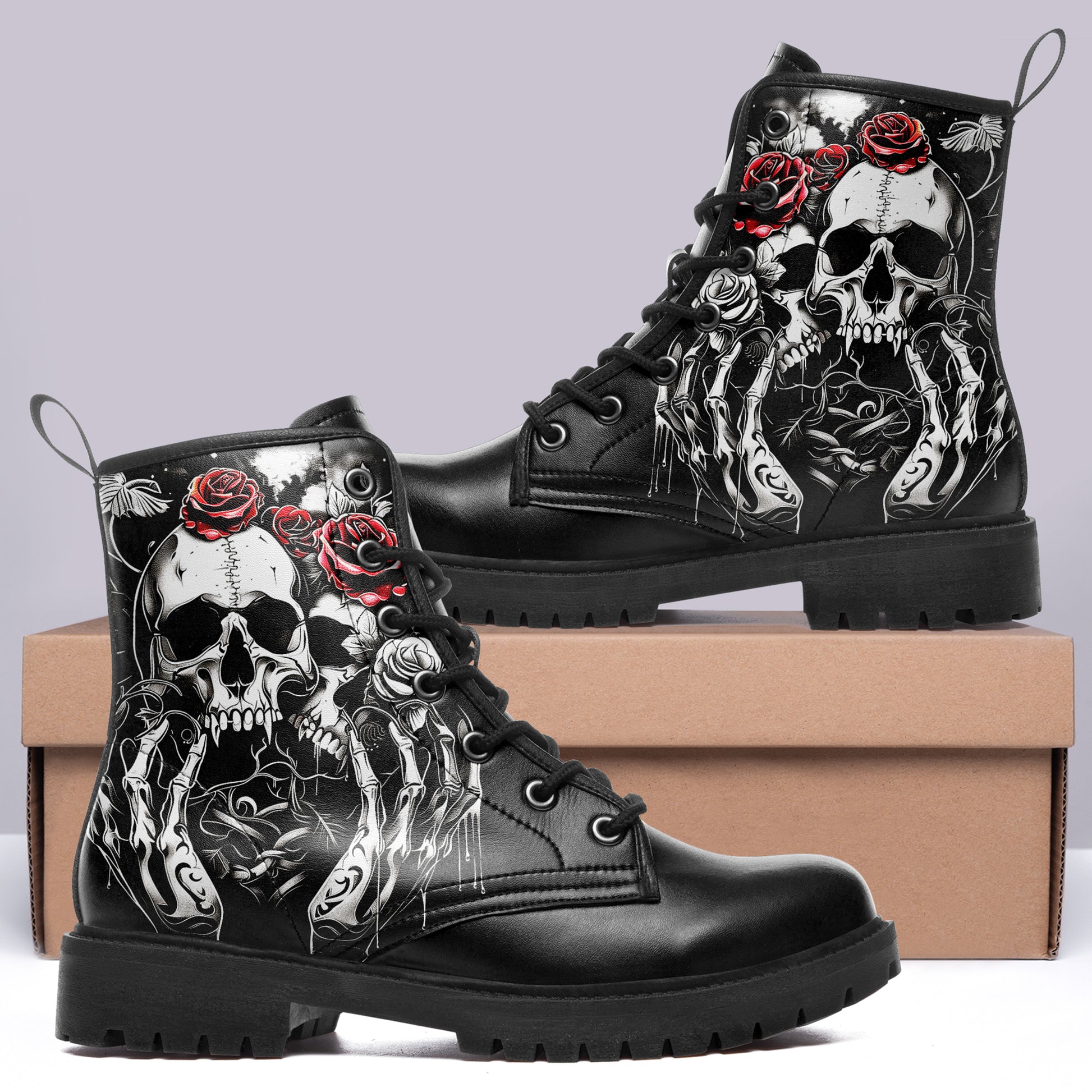 Double the darkness, double the style. These combat boots feature a masterful **tattoo-style illustration of two skulls**, resting side-by-side in eternal slumber. Framed by reaching **skeletal hands** and blooming **crimson roses**, this design is a complex and beautiful study of mortality and connection.