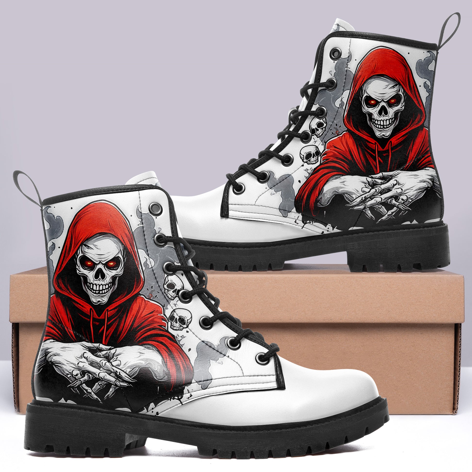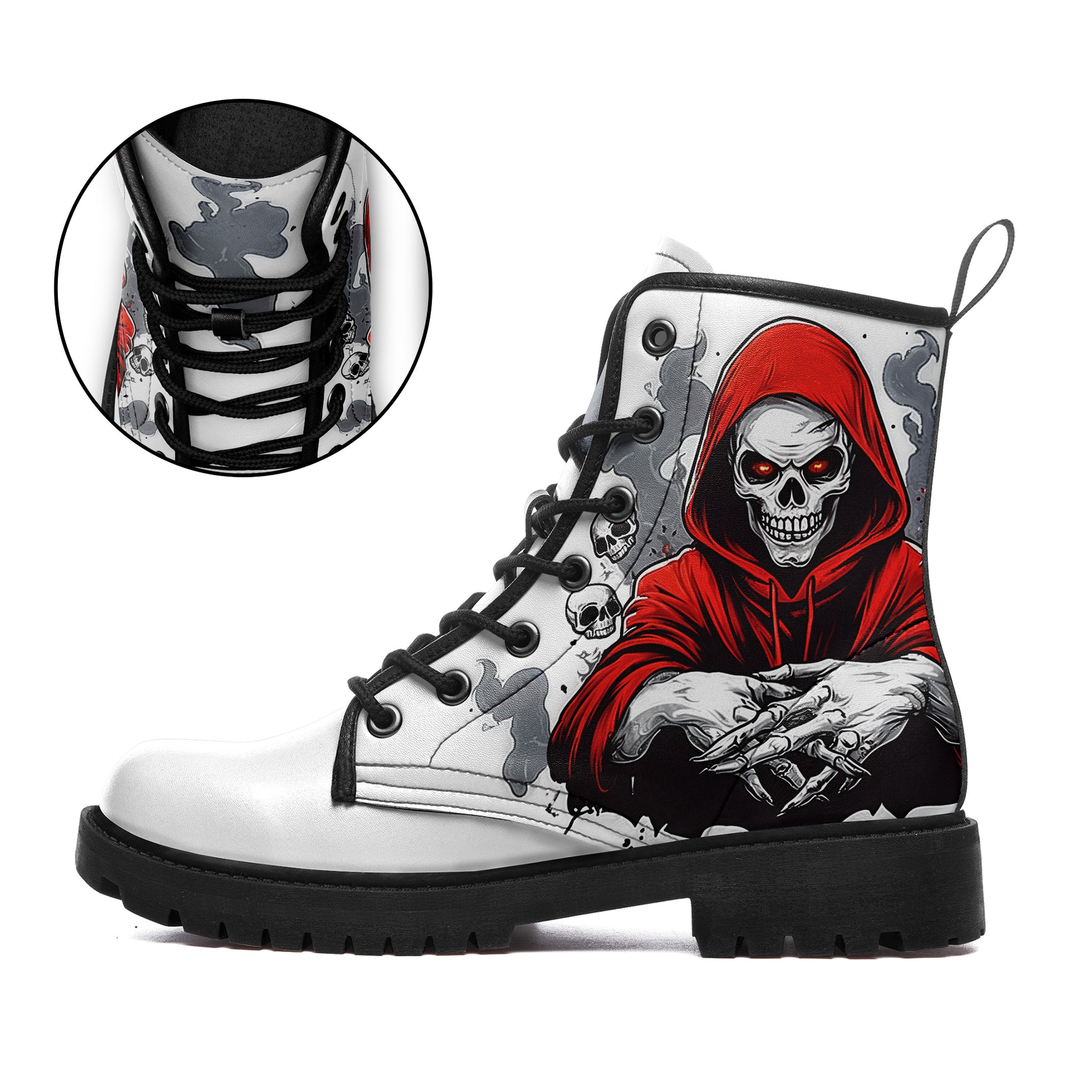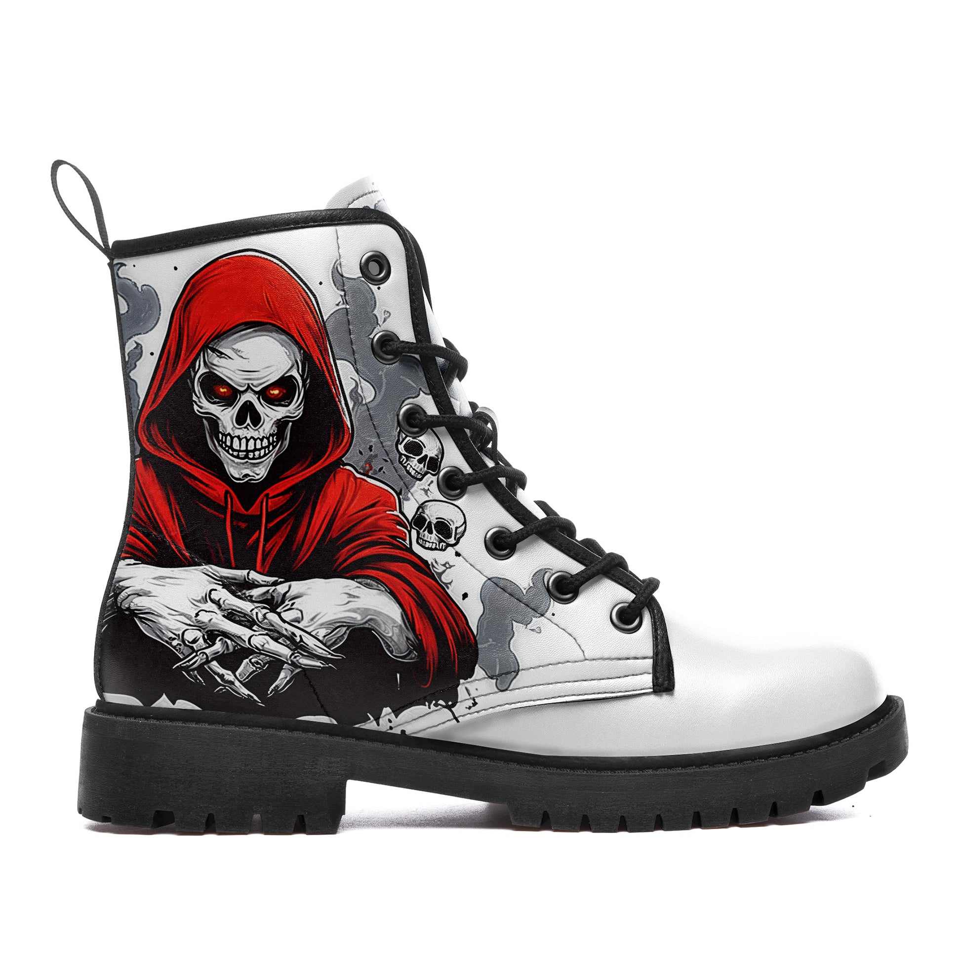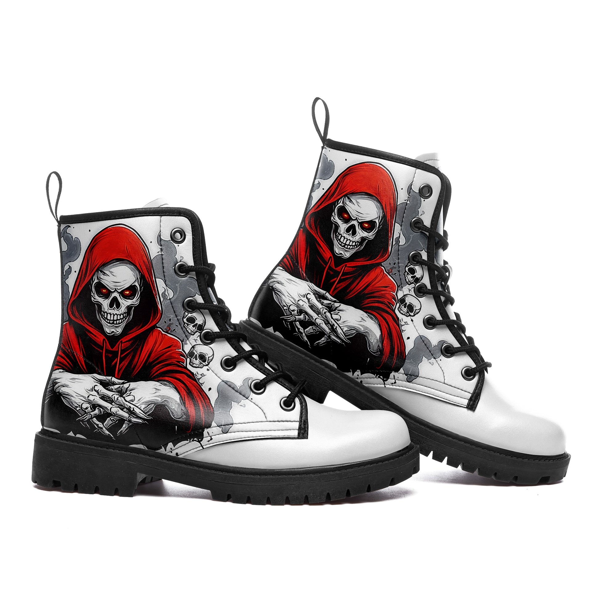 White Combat Boots with Red Hooded Skeleton - Urban Reaper Streetwear Shoes BOOTS-24027007